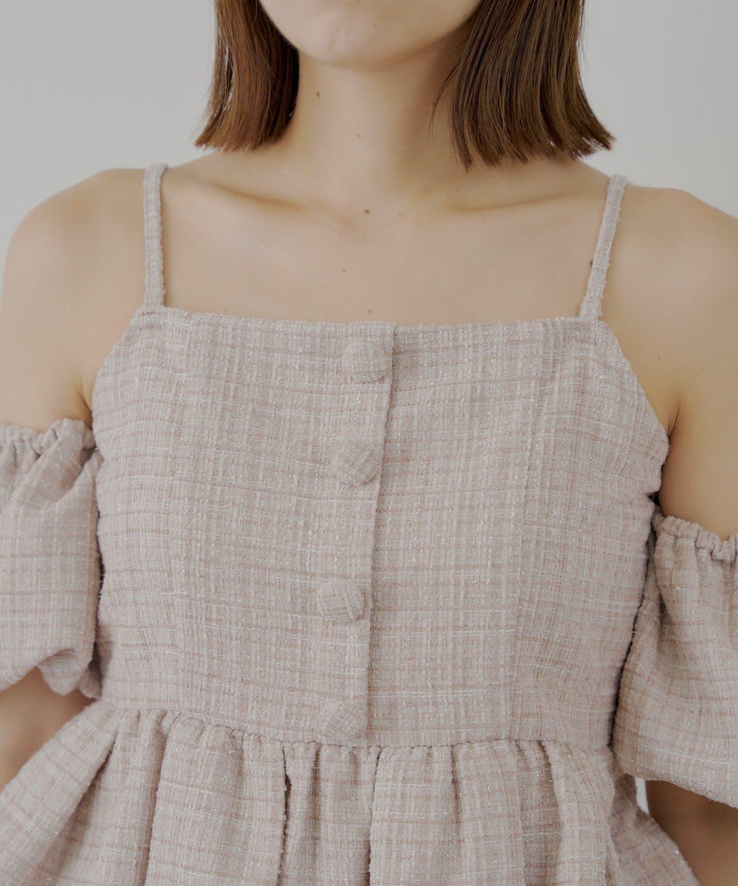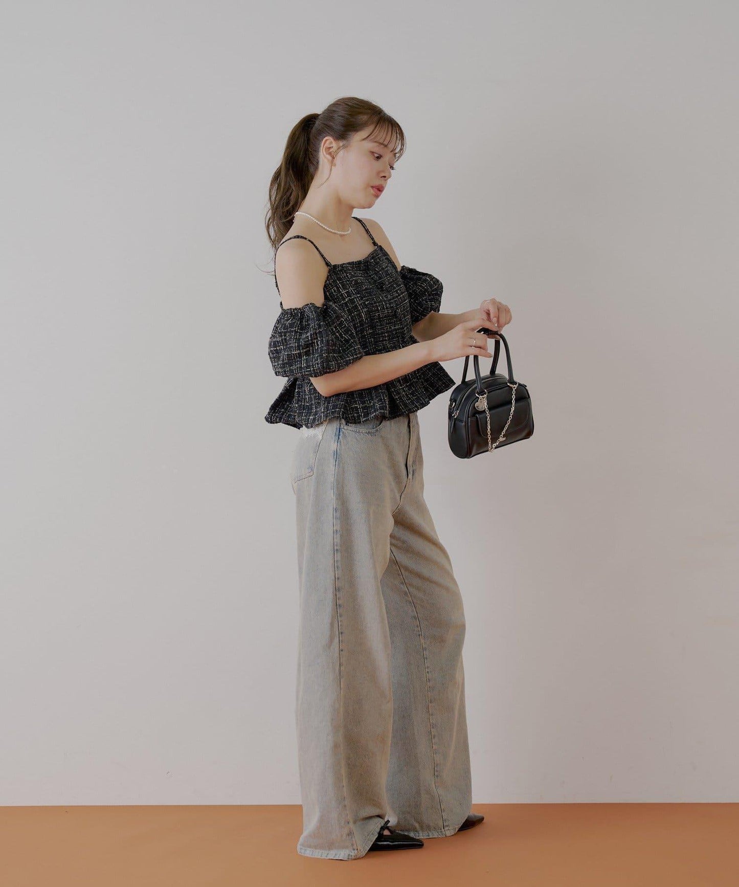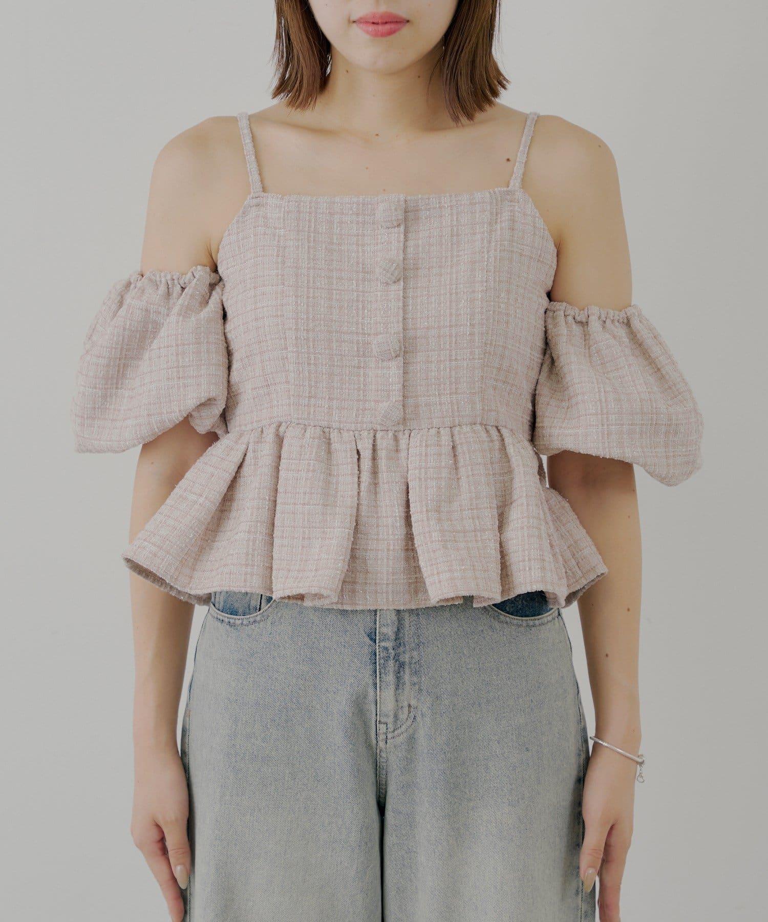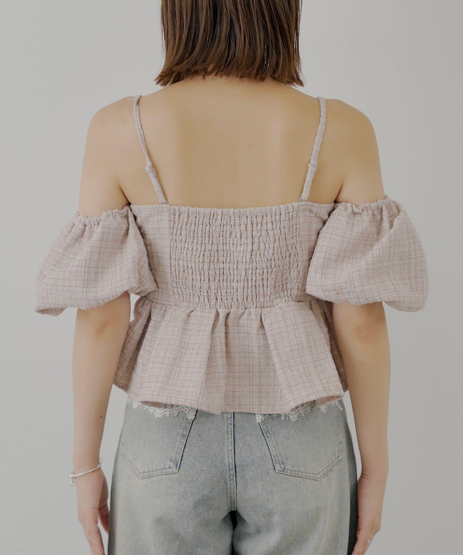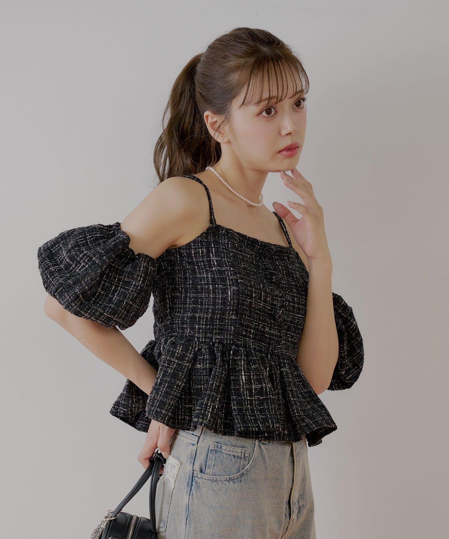 這款毛呢露肩上衣採用雙向設計,可作為露肩上衣穿著。