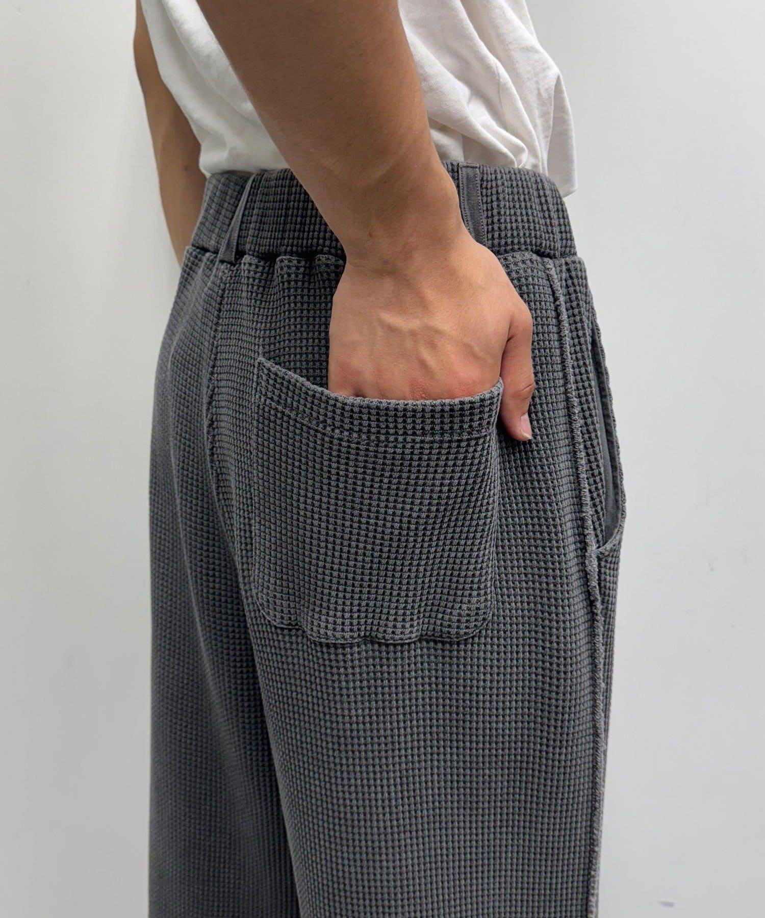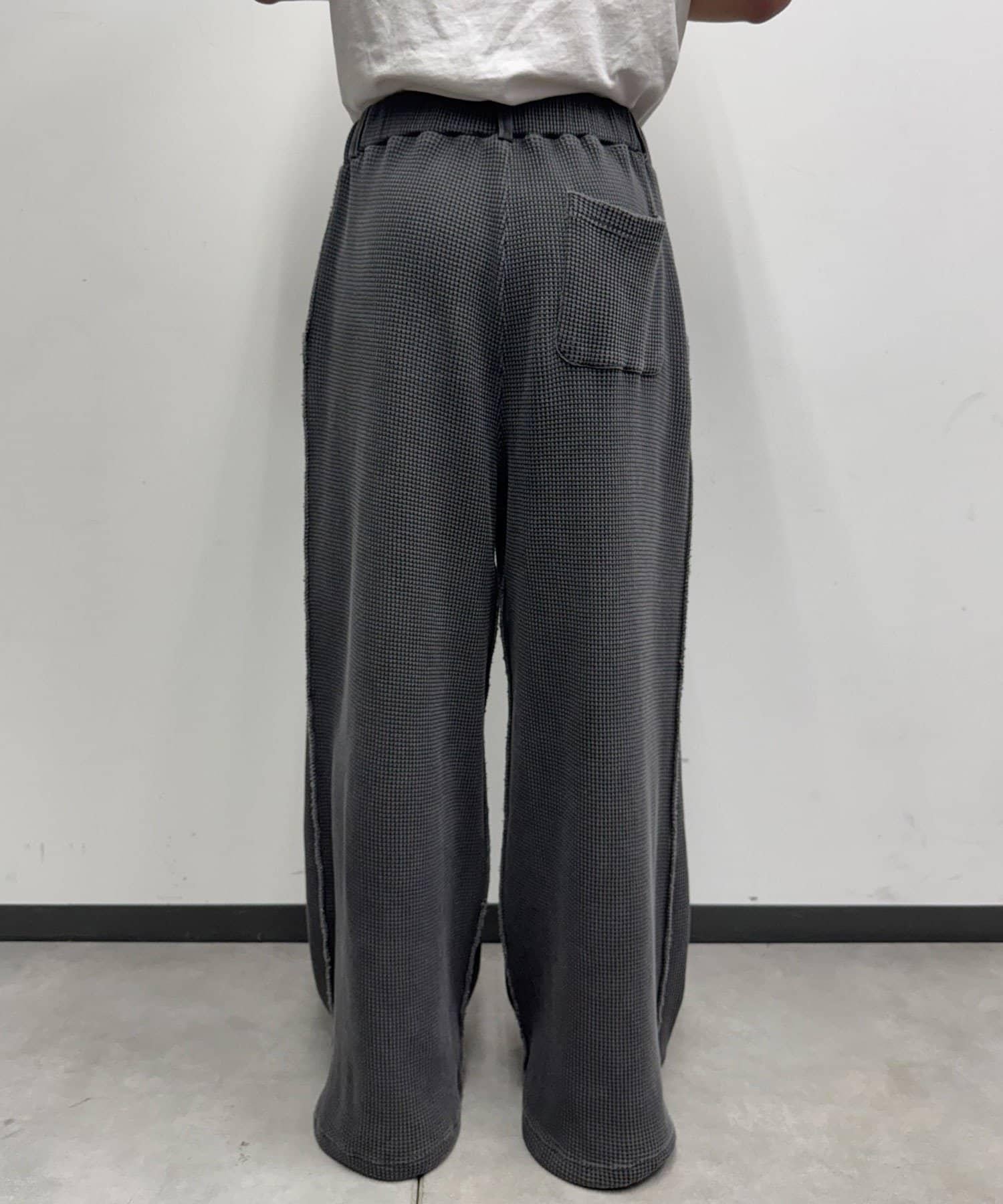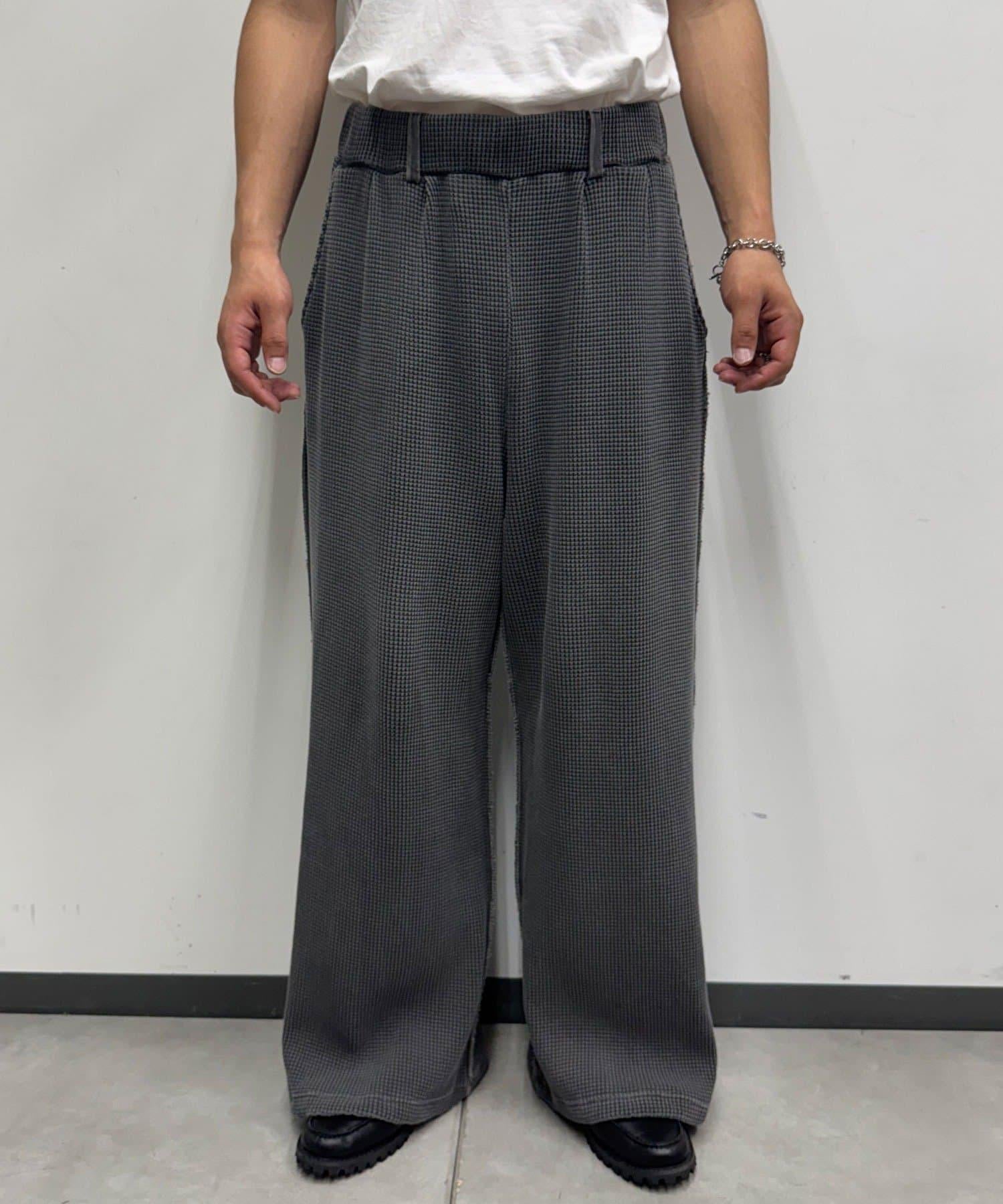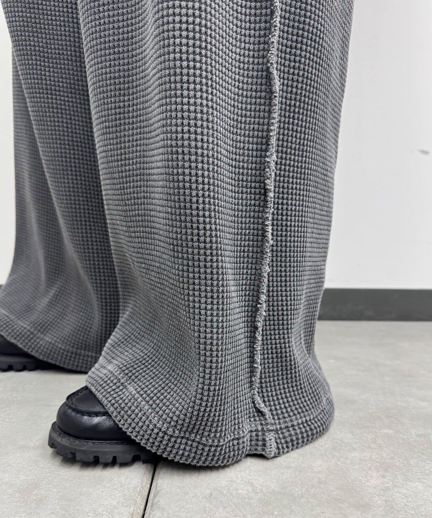華夫格面料寬長褲,採用復古風格的顏料飾面。