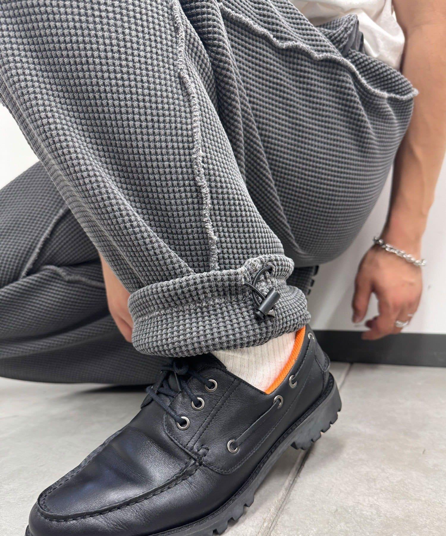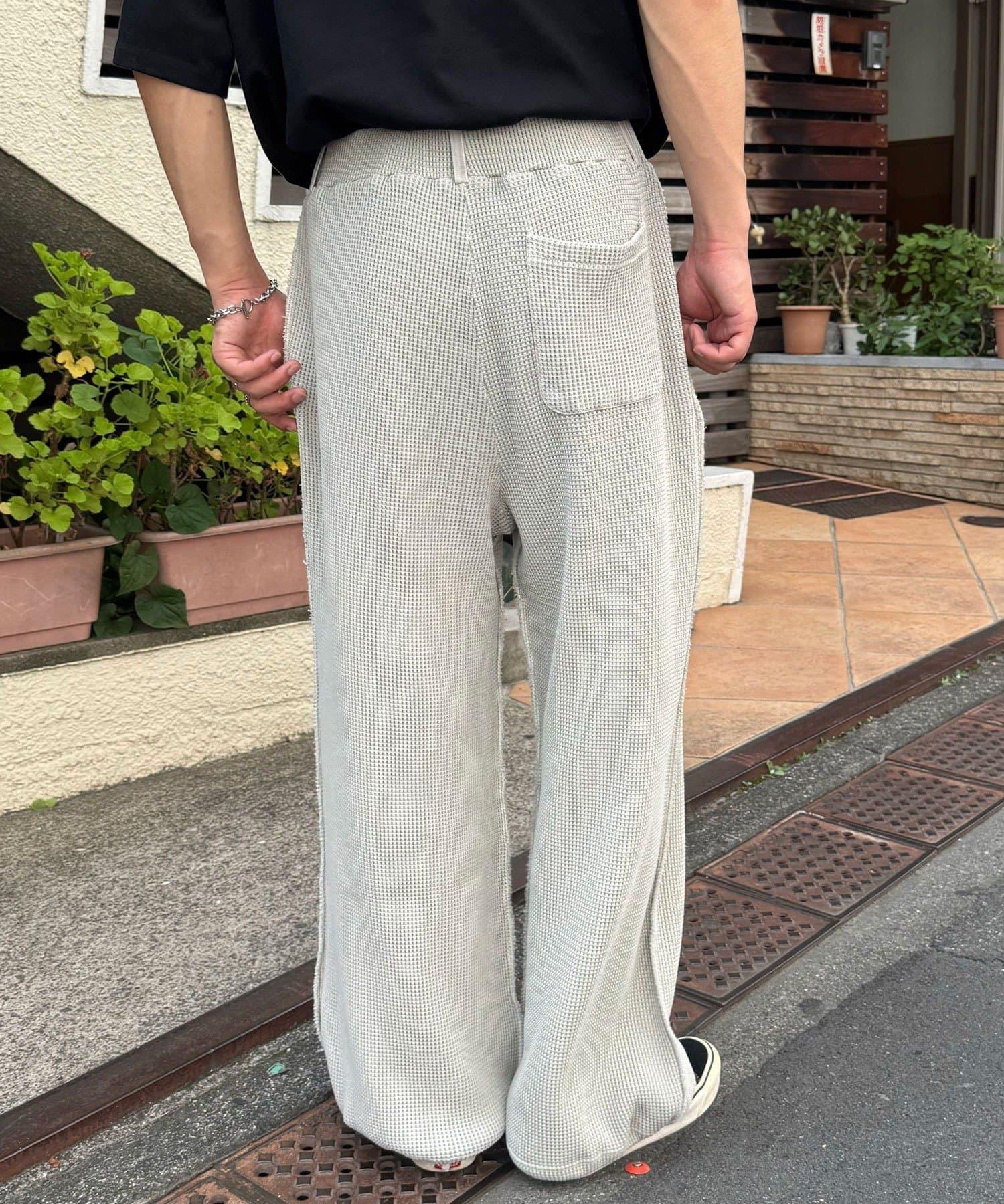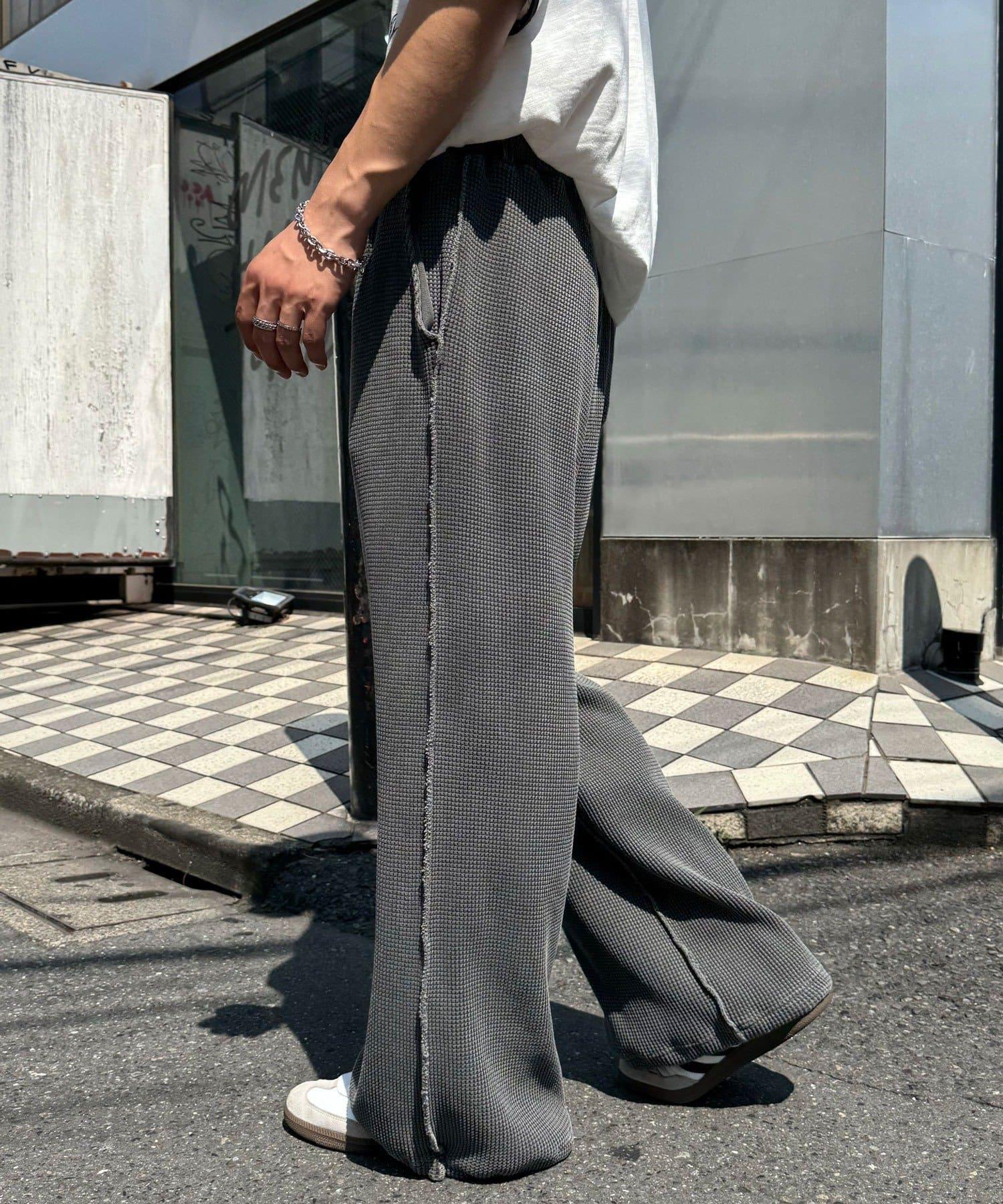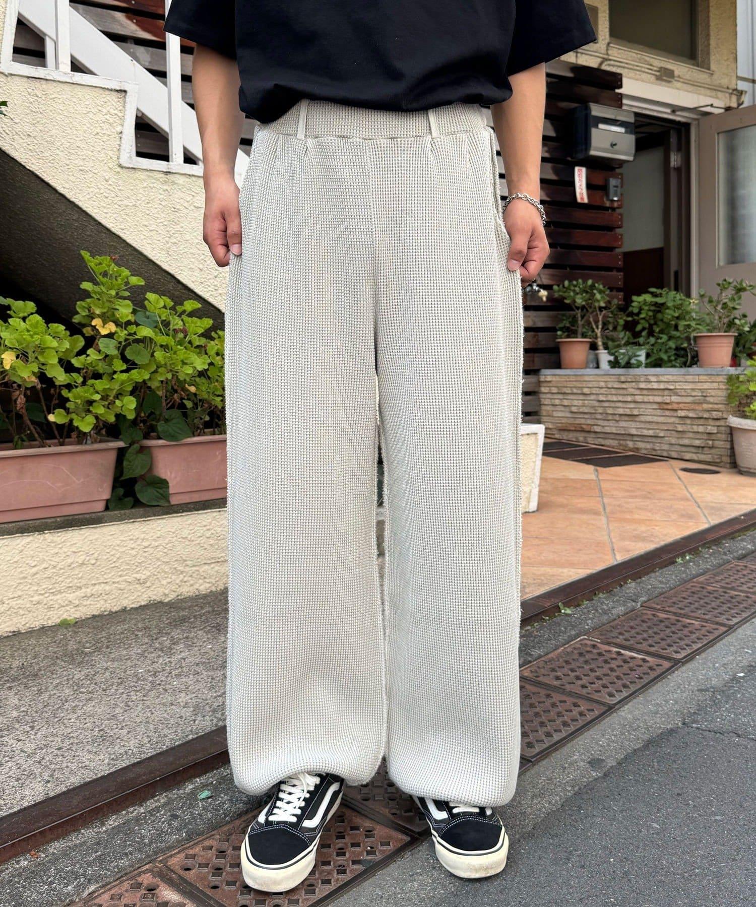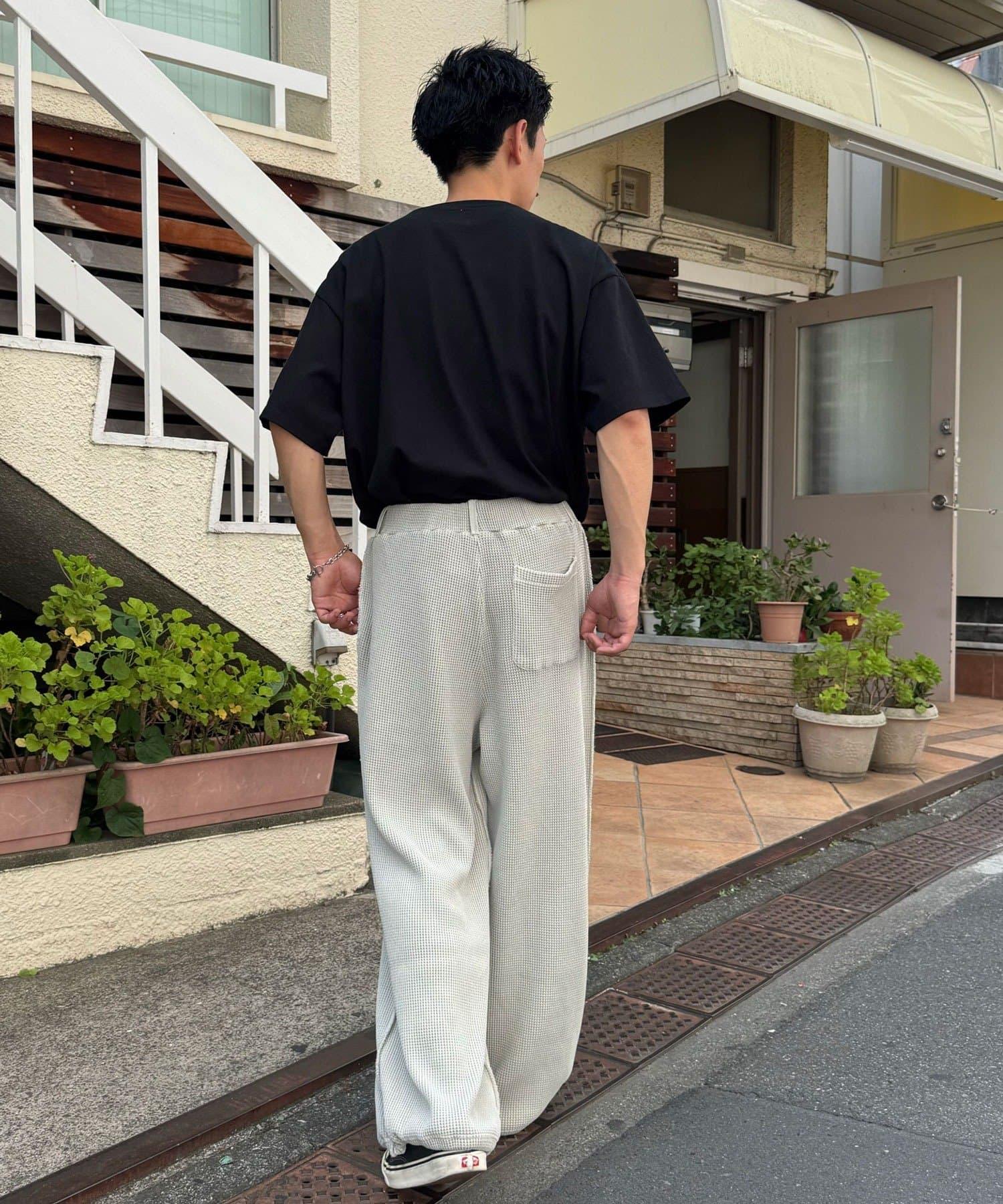 華夫格面料寬長褲,採用復古風格的顏料飾面。