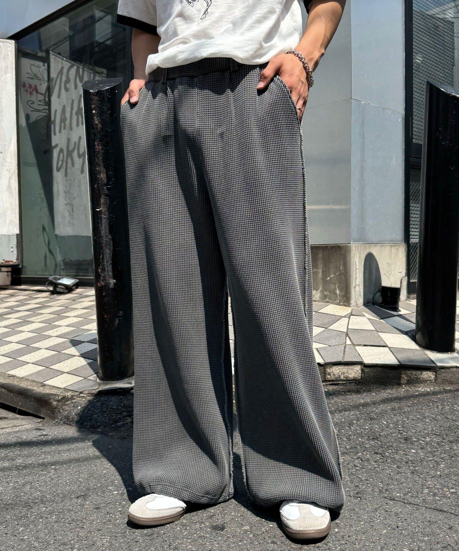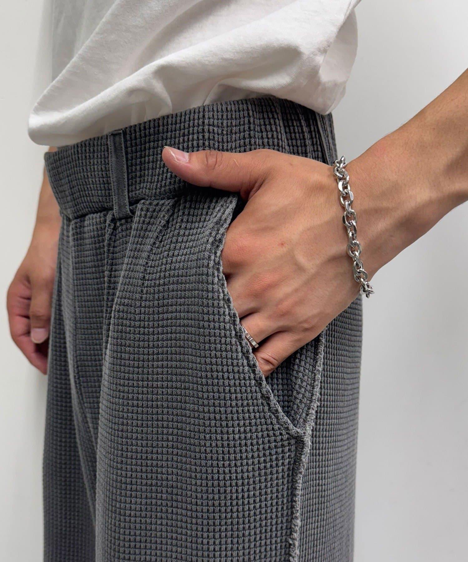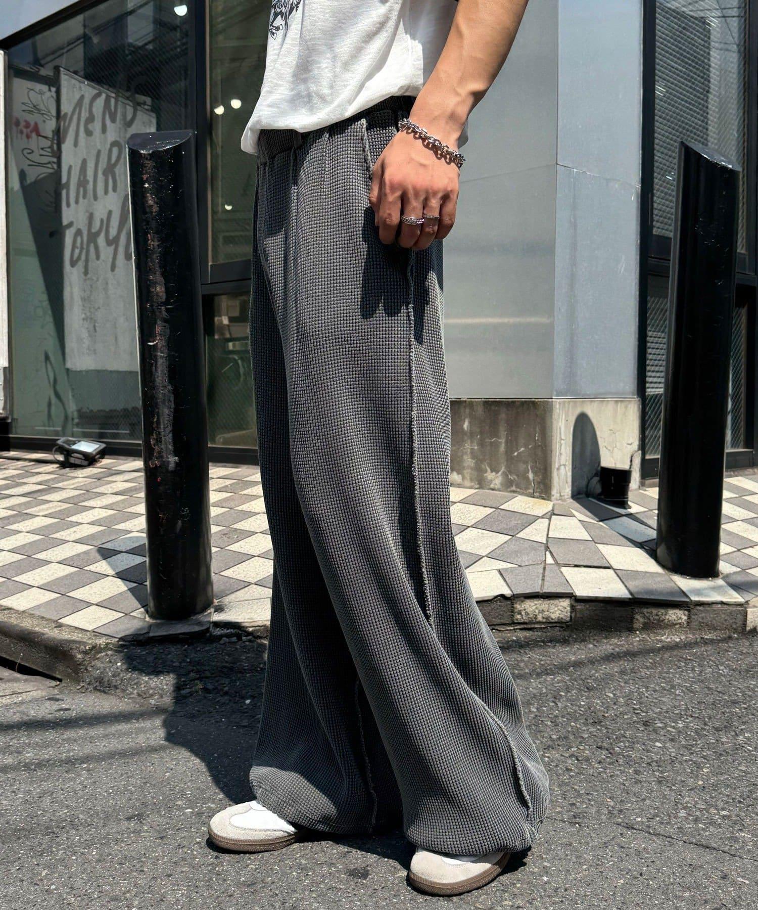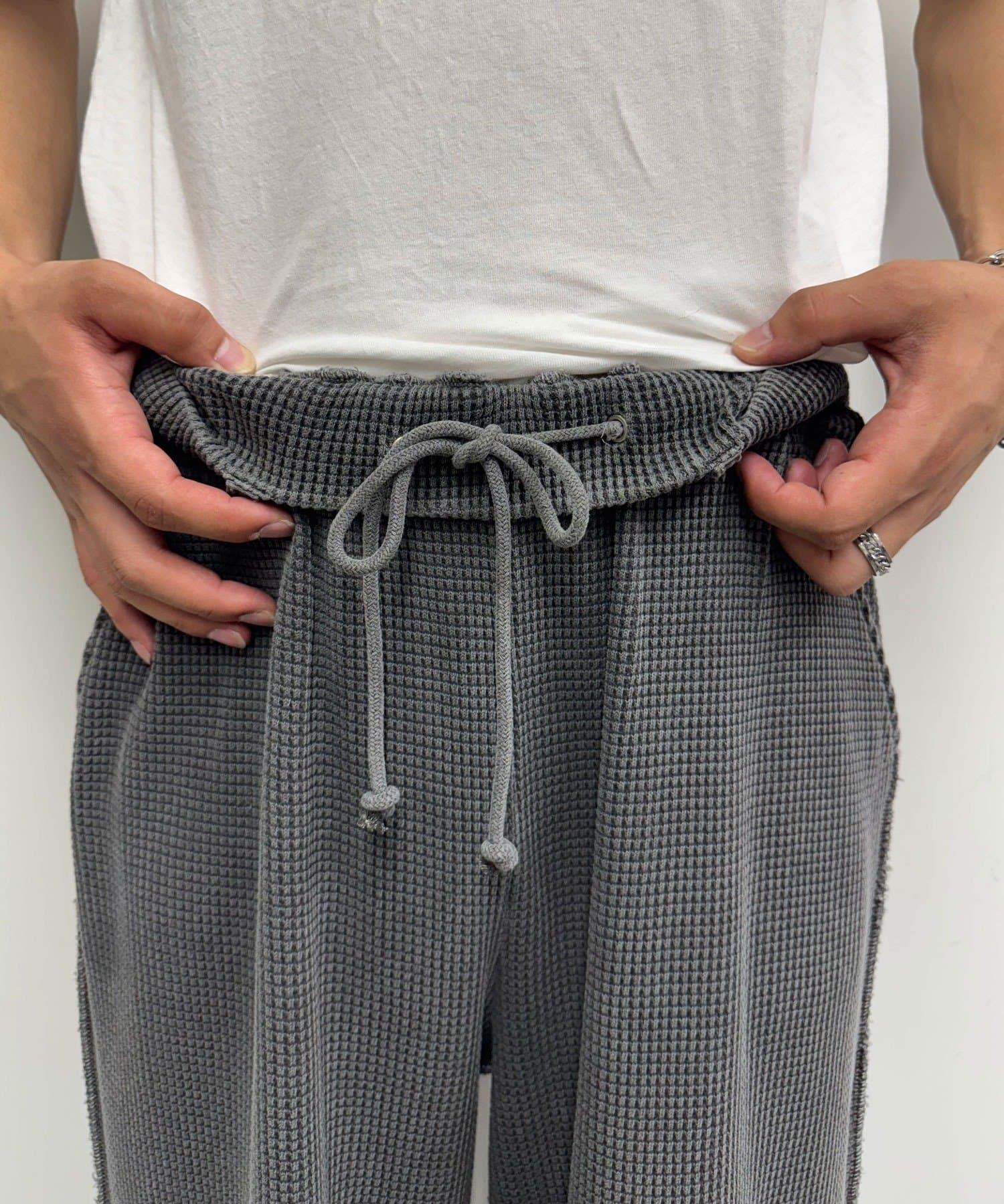 華夫格面料寬長褲,採用復古風格的顏料飾面。