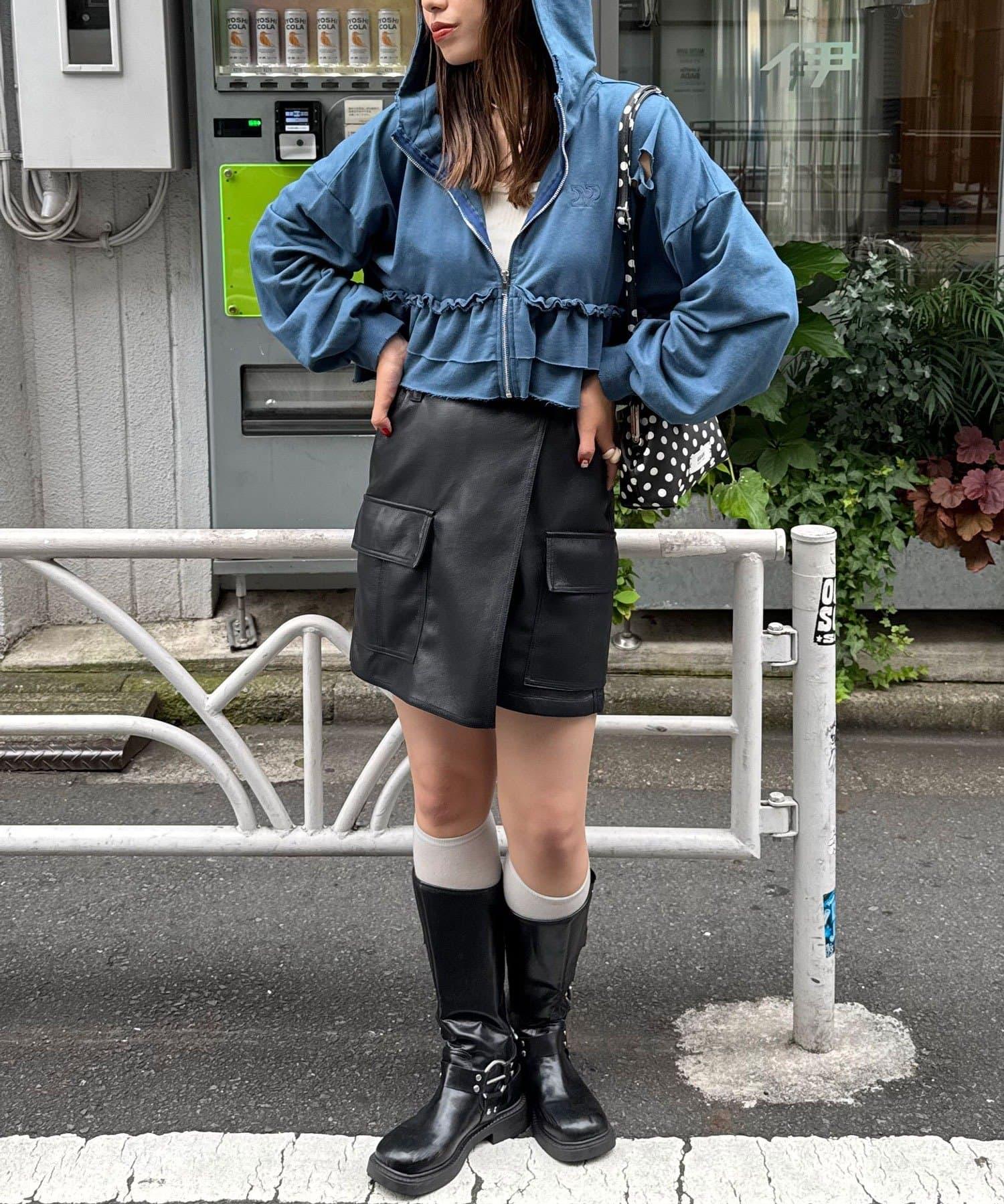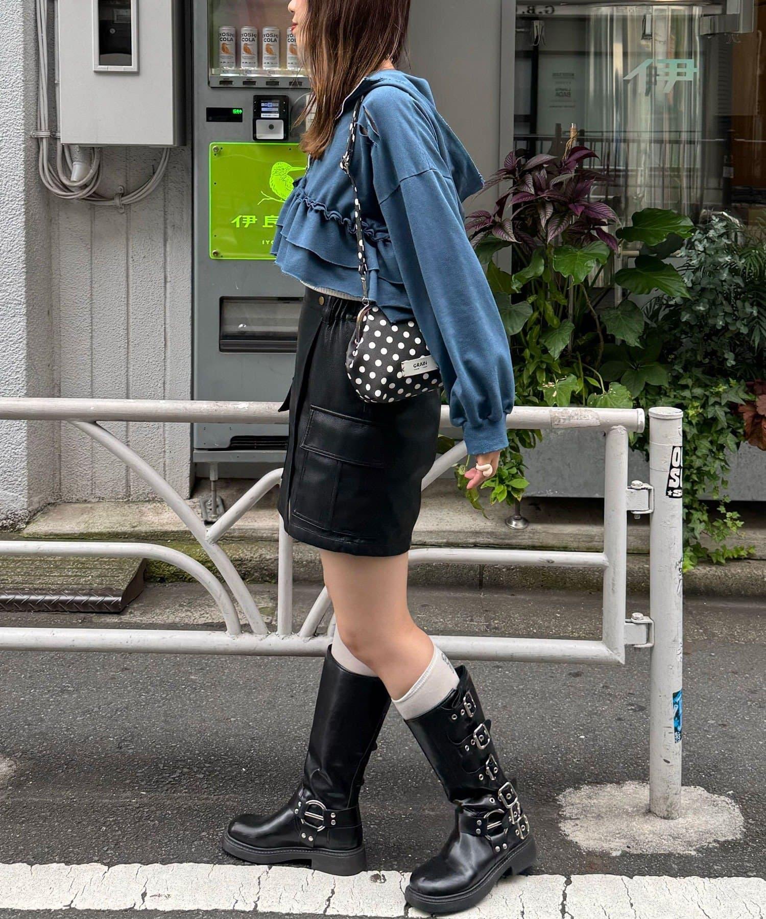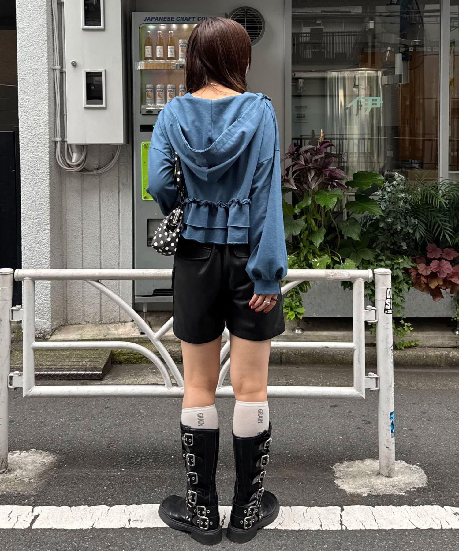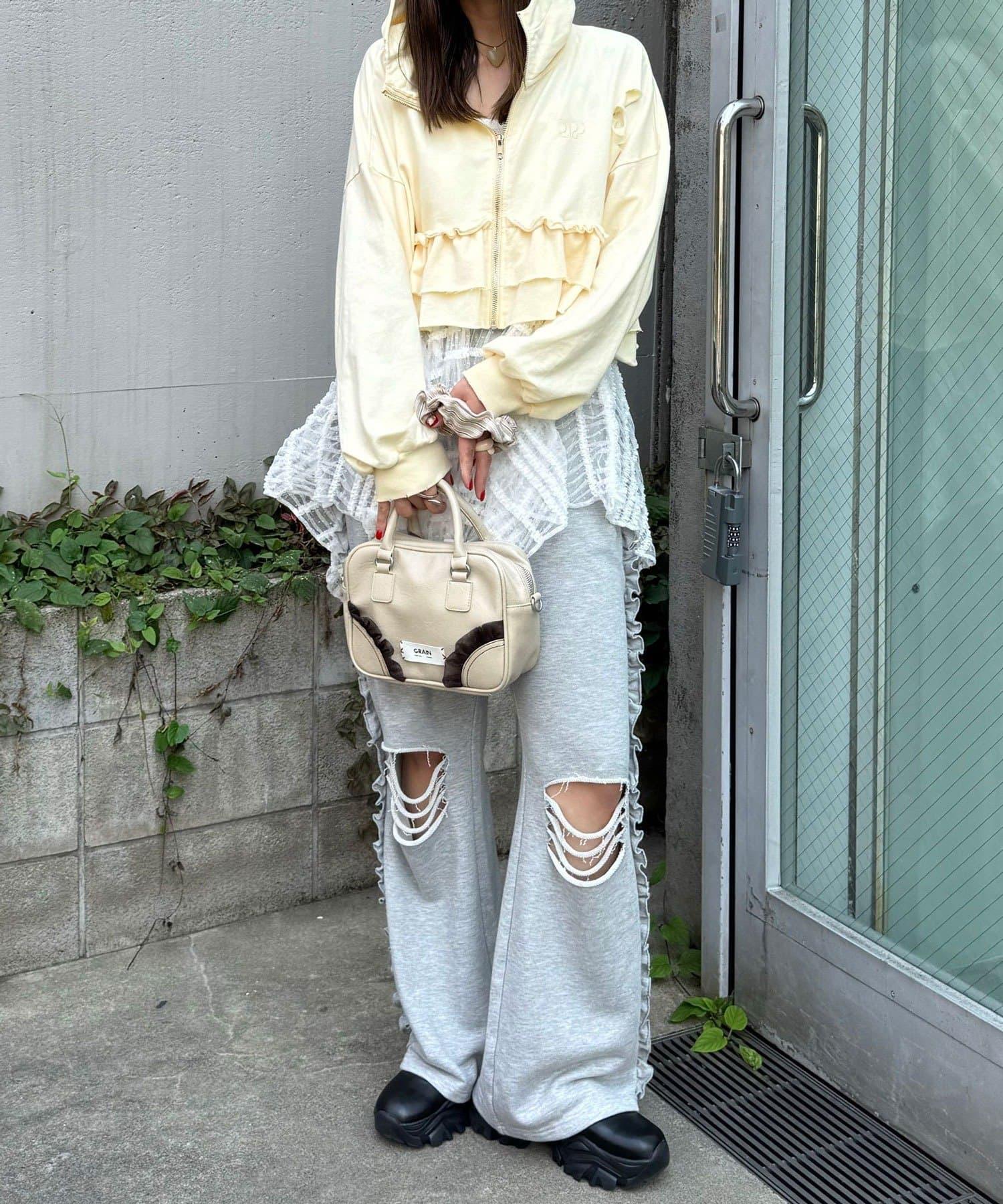 壓扁的肩部和鏤空細節營造出粗獷寬鬆的感覺,而下襬的荷葉邊則增添了可愛的氣息。