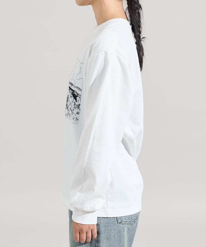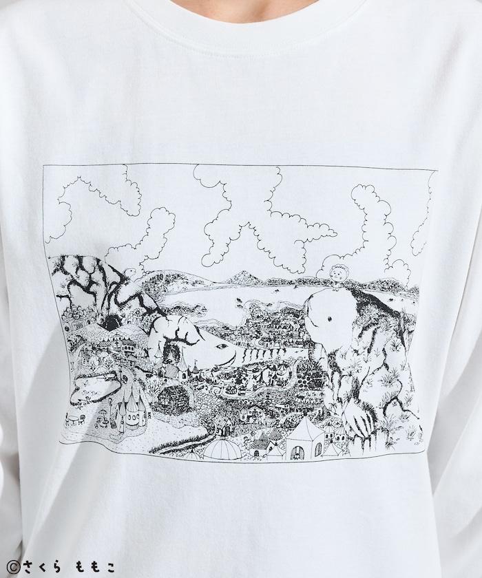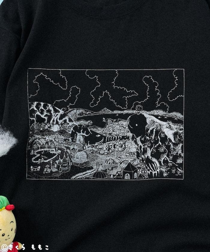 印有令人印象深刻的 KOJIKOJI 圖案的 T 恤衫,KOJIKOJI 從密封的山丘上眺望童話世界。