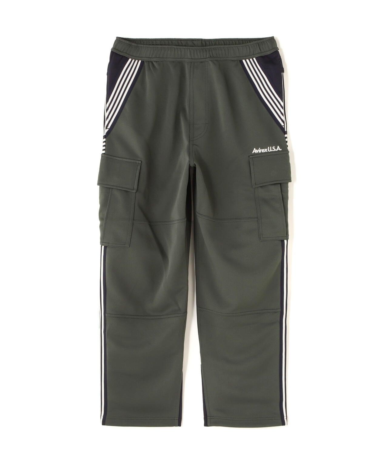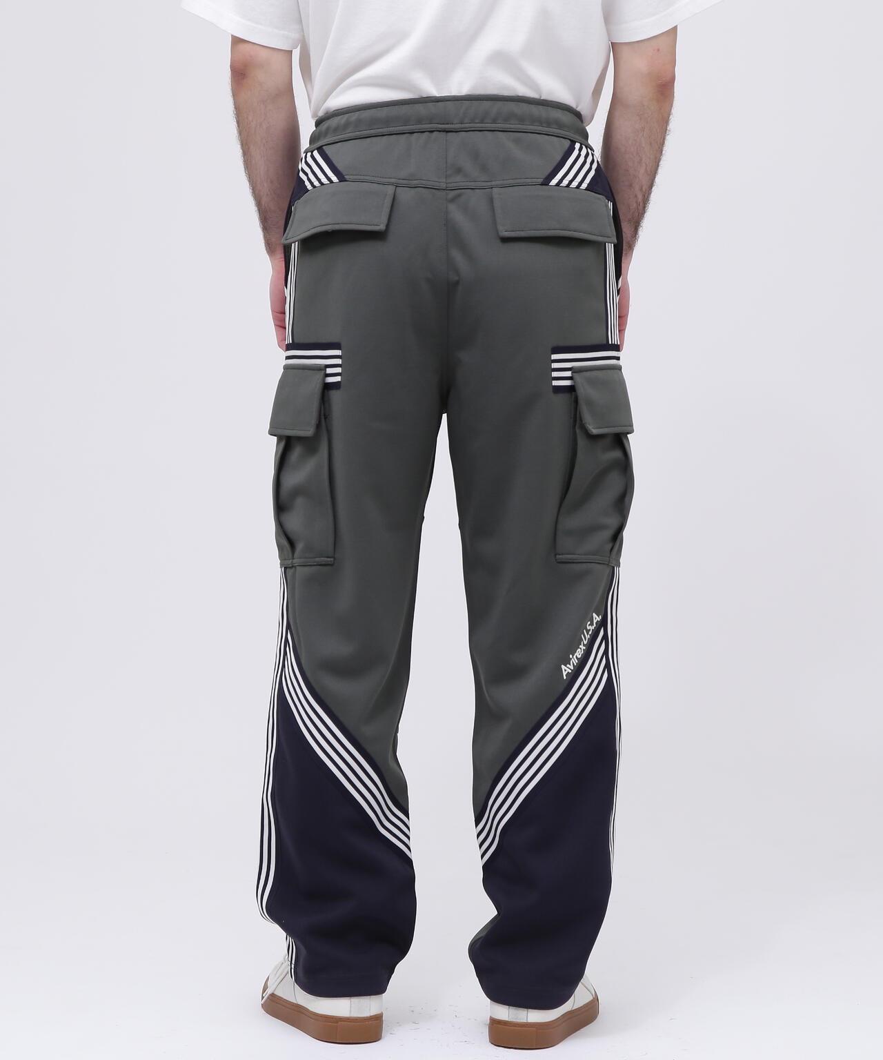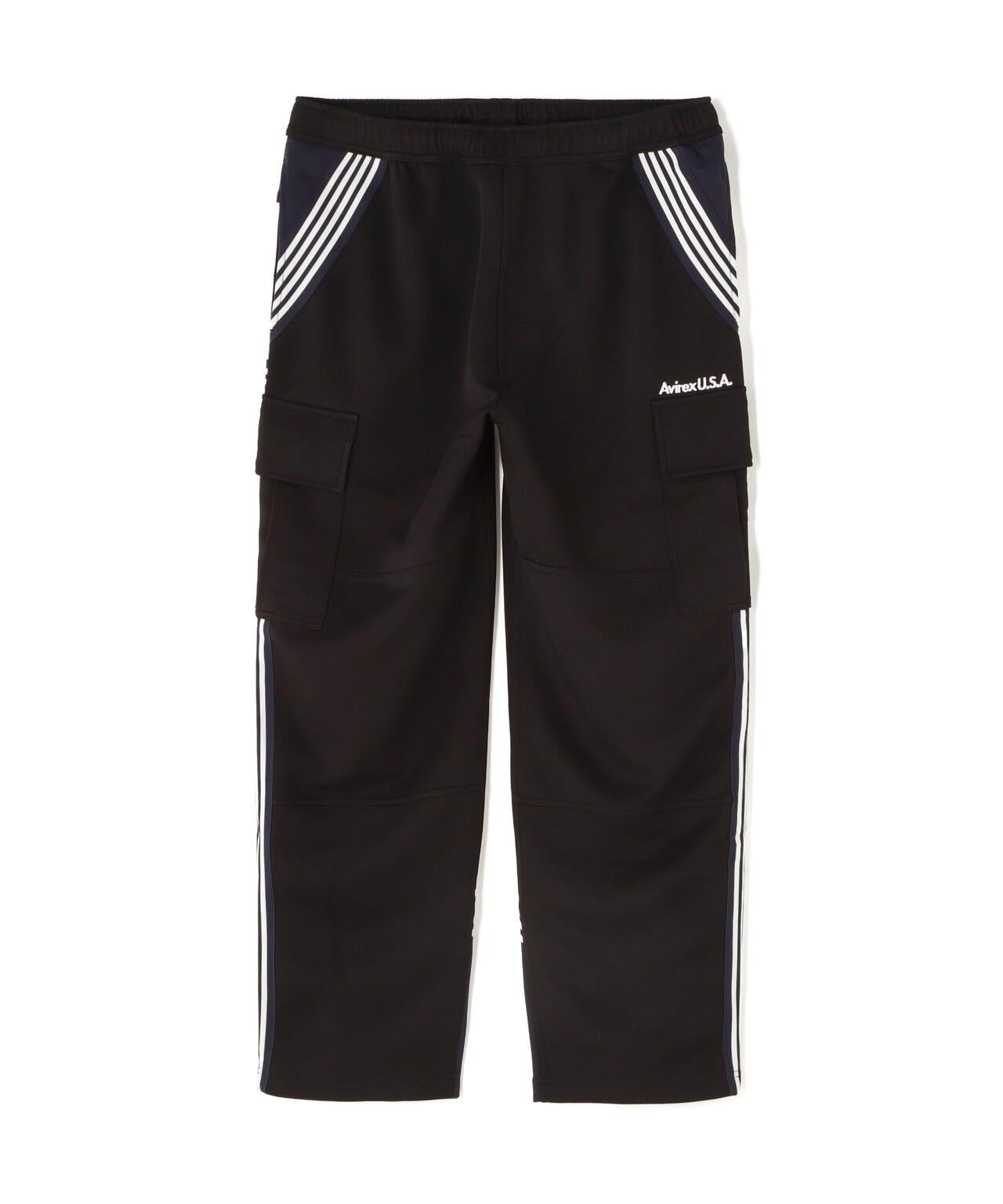 AVIREX官方旗艦店] 產品名稱:《CROSSOVER》TRACK CARGO PANTS<產品詳情> - AVIREX 2024秋冬 "CROSSOVER系列 "TRACK長褲 - 雙色針織面料 - 線帶結合簡便的揹帶褲,點刺繡品牌標識,基本剪裁,不會過於厚重。