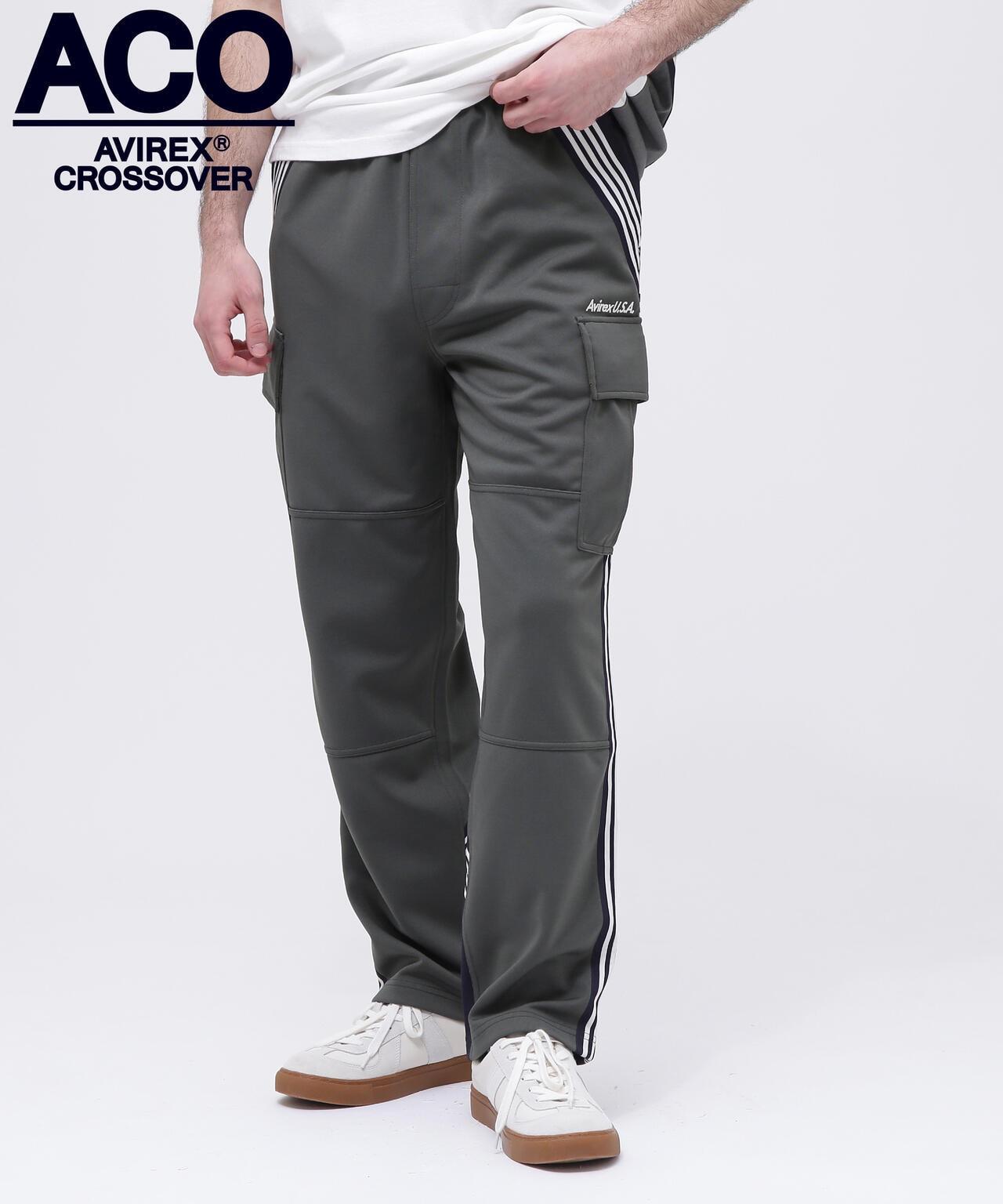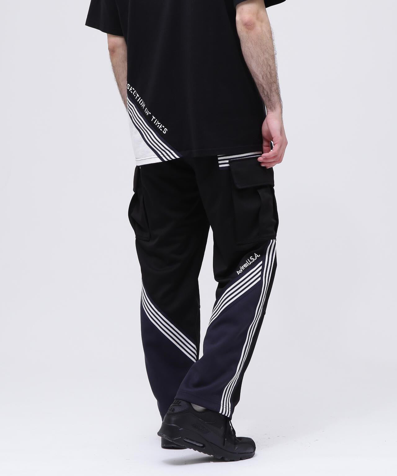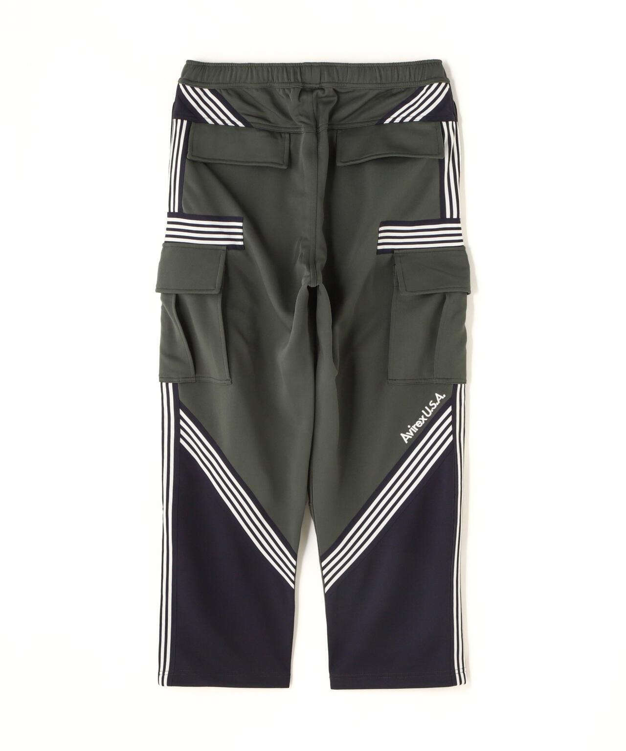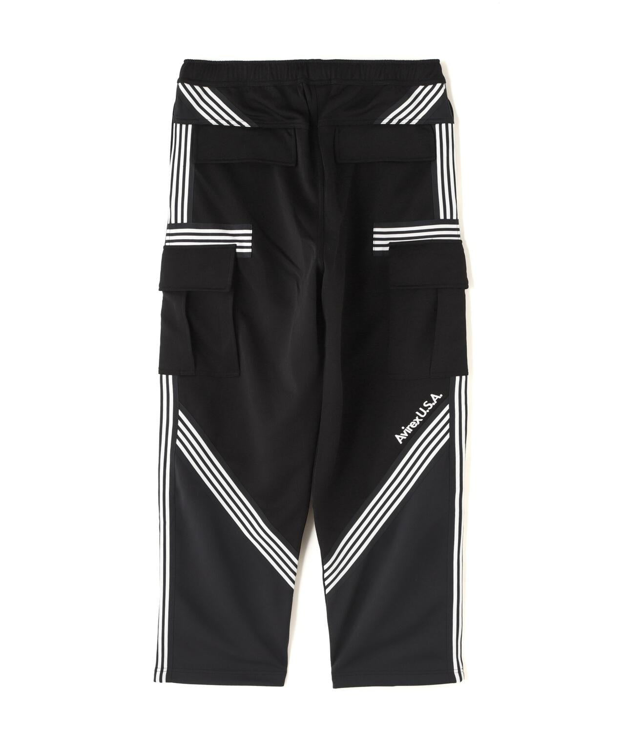 AVIREX官方旗艦店] 產品名稱:《CROSSOVER》TRACK CARGO PANTS<產品詳情> - AVIREX 2024秋冬 "CROSSOVER系列 "TRACK長褲 - 雙色針織面料 - 線帶結合簡便的揹帶褲,點刺繡品牌標識,基本剪裁,不會過於厚重。