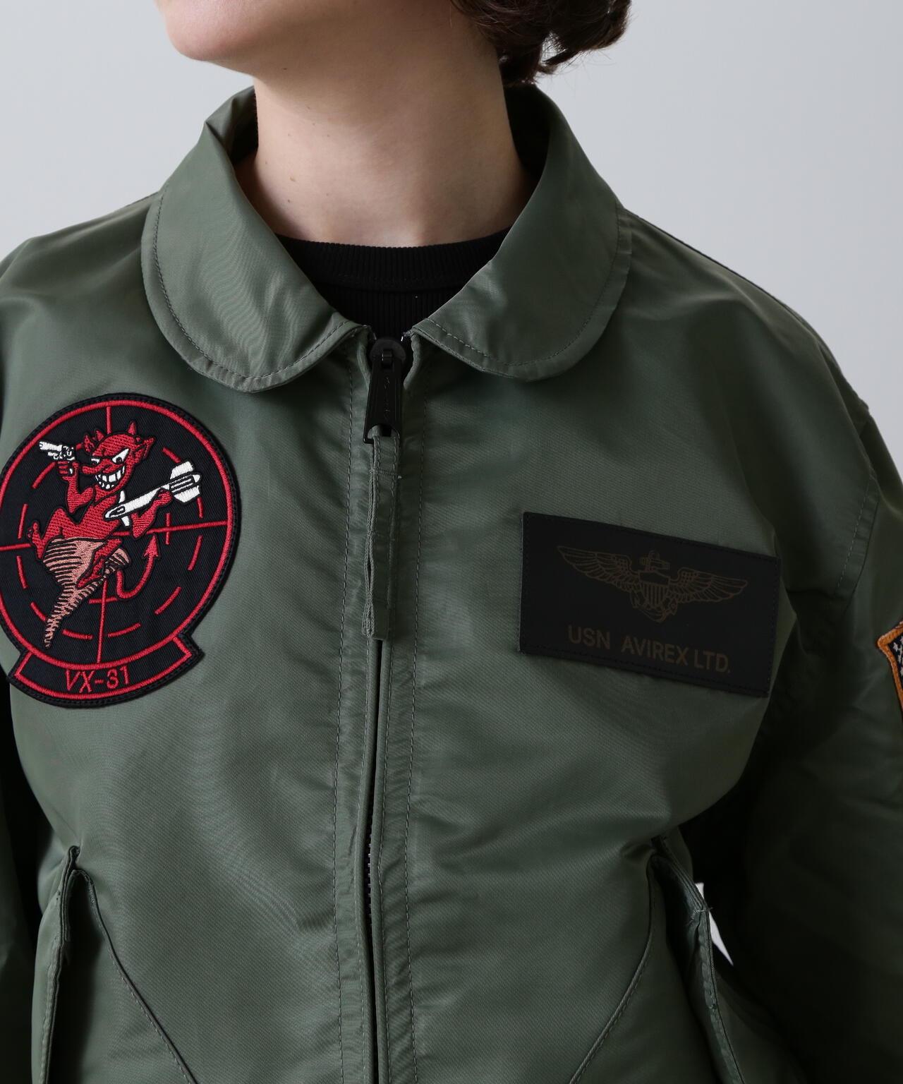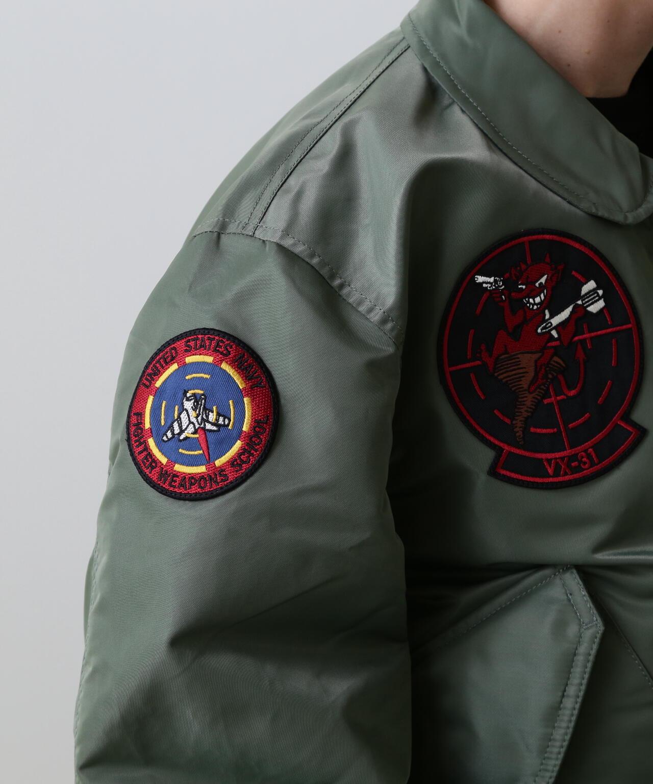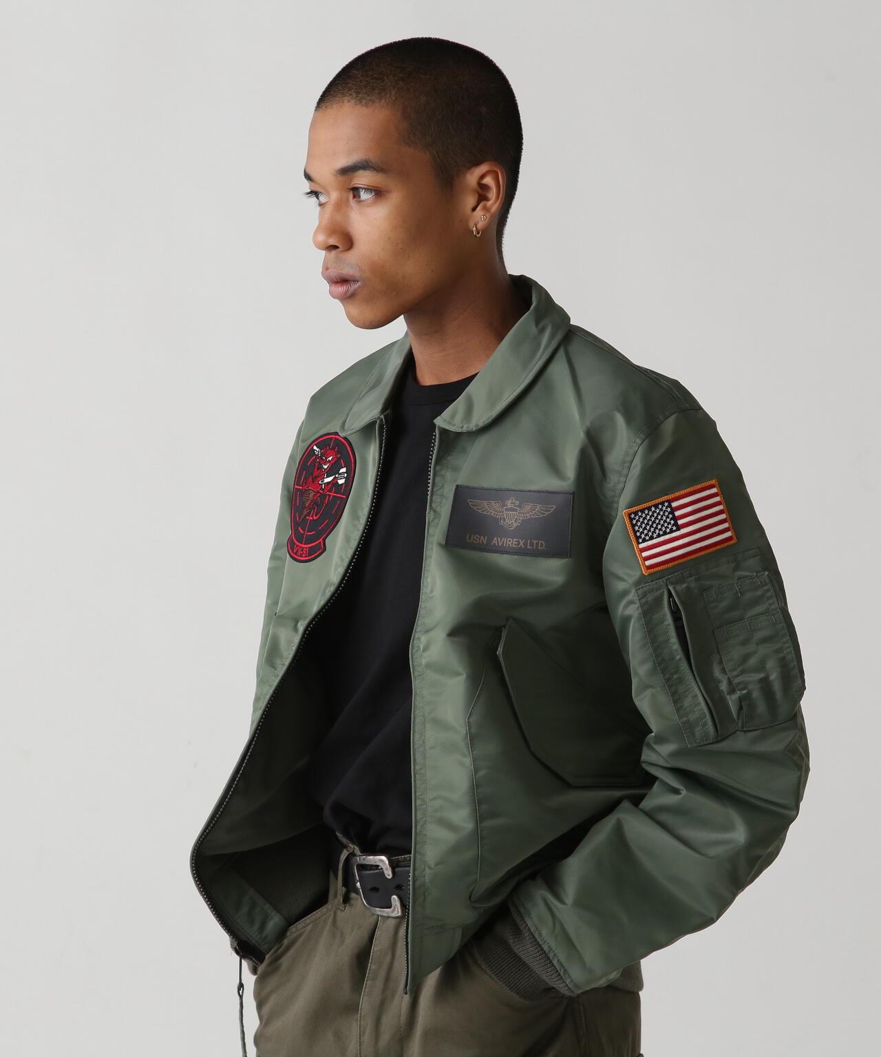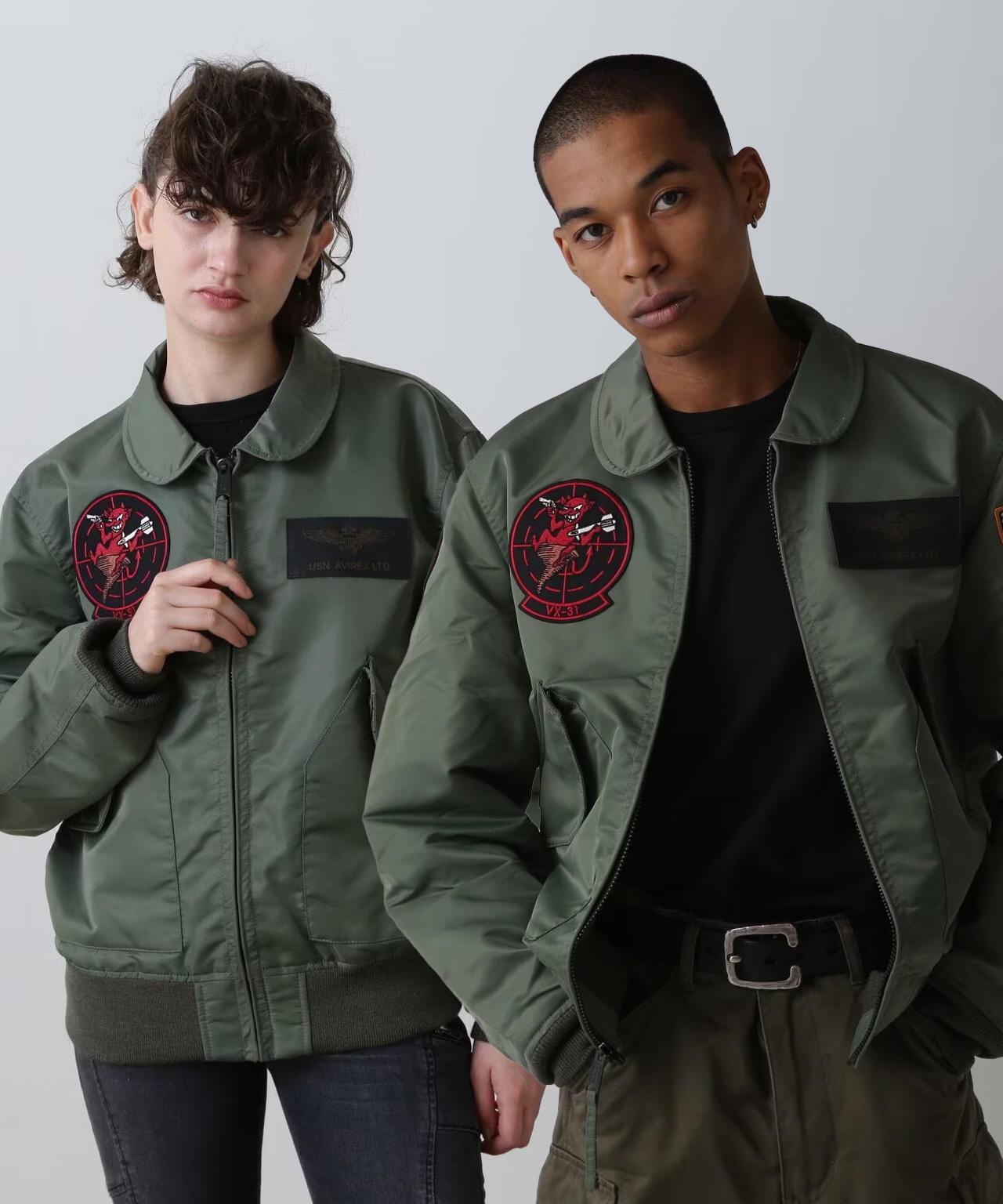 右袖上的補丁設計標誌著穿著者已從 "TOP GUN "畢業,左胸前的補丁設計是美國海軍的翼標和 AVIREX 徽標。左胸前的機翼標誌和 AVIREX 徽標的原始補丁設計,基本尺寸。