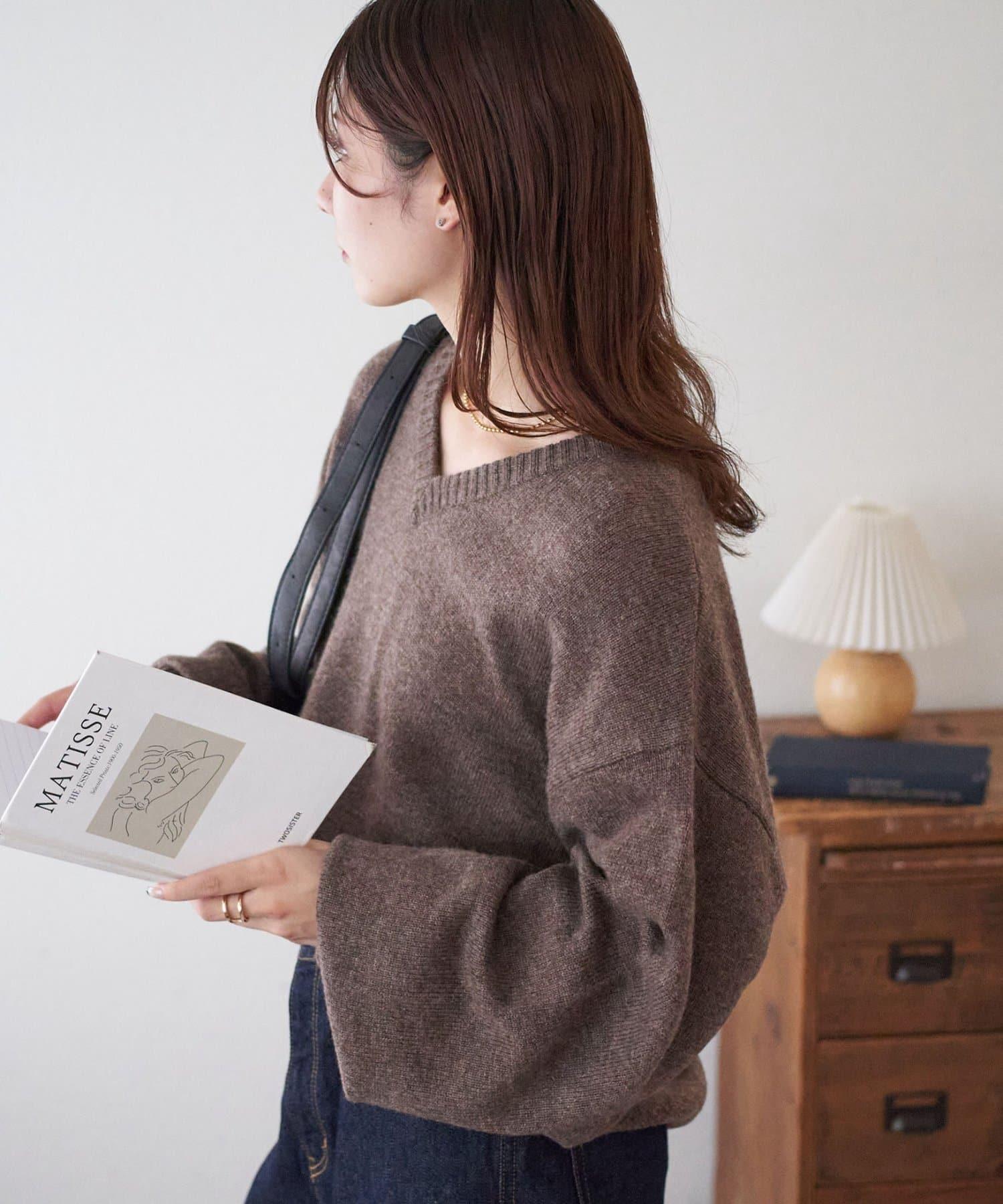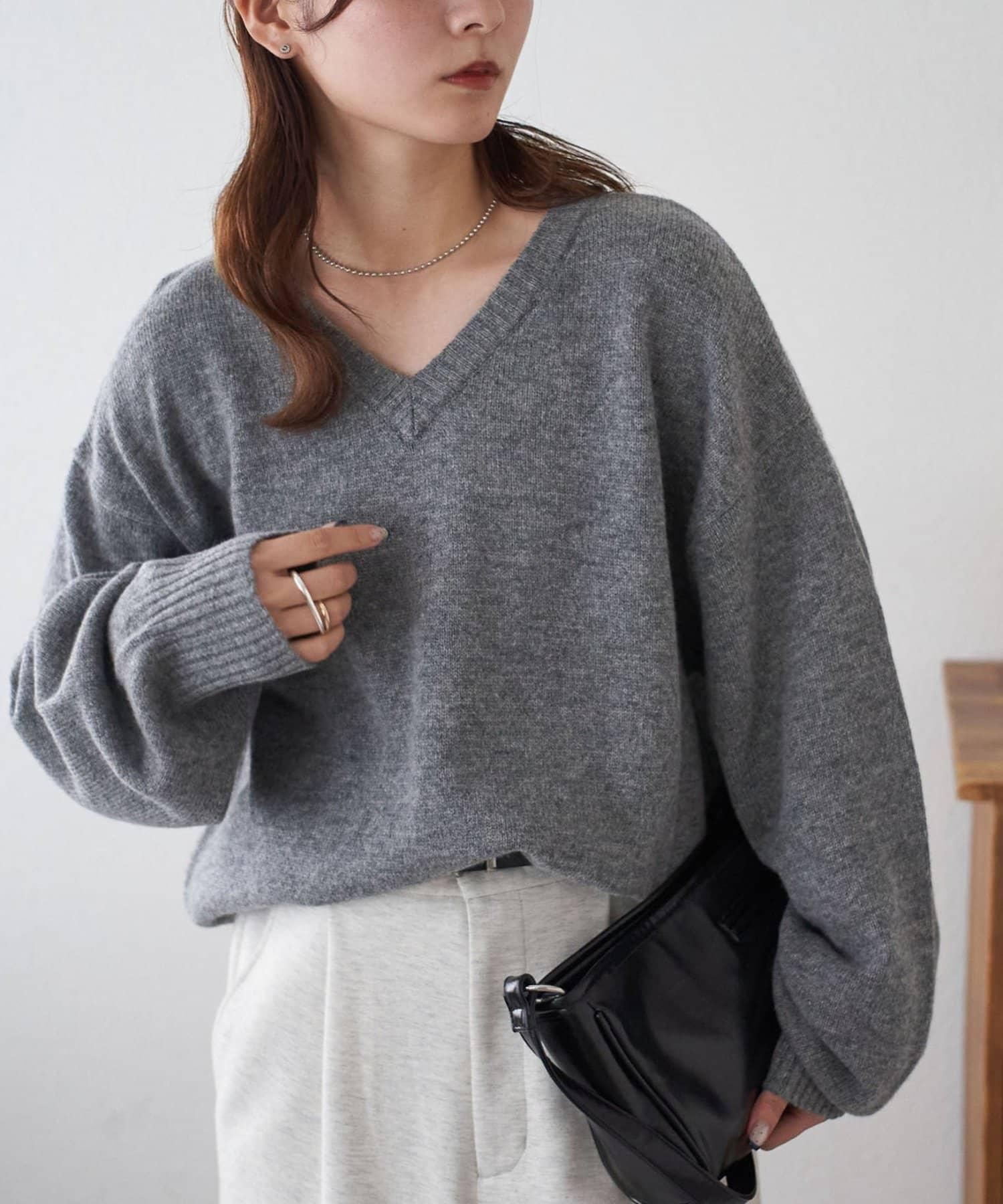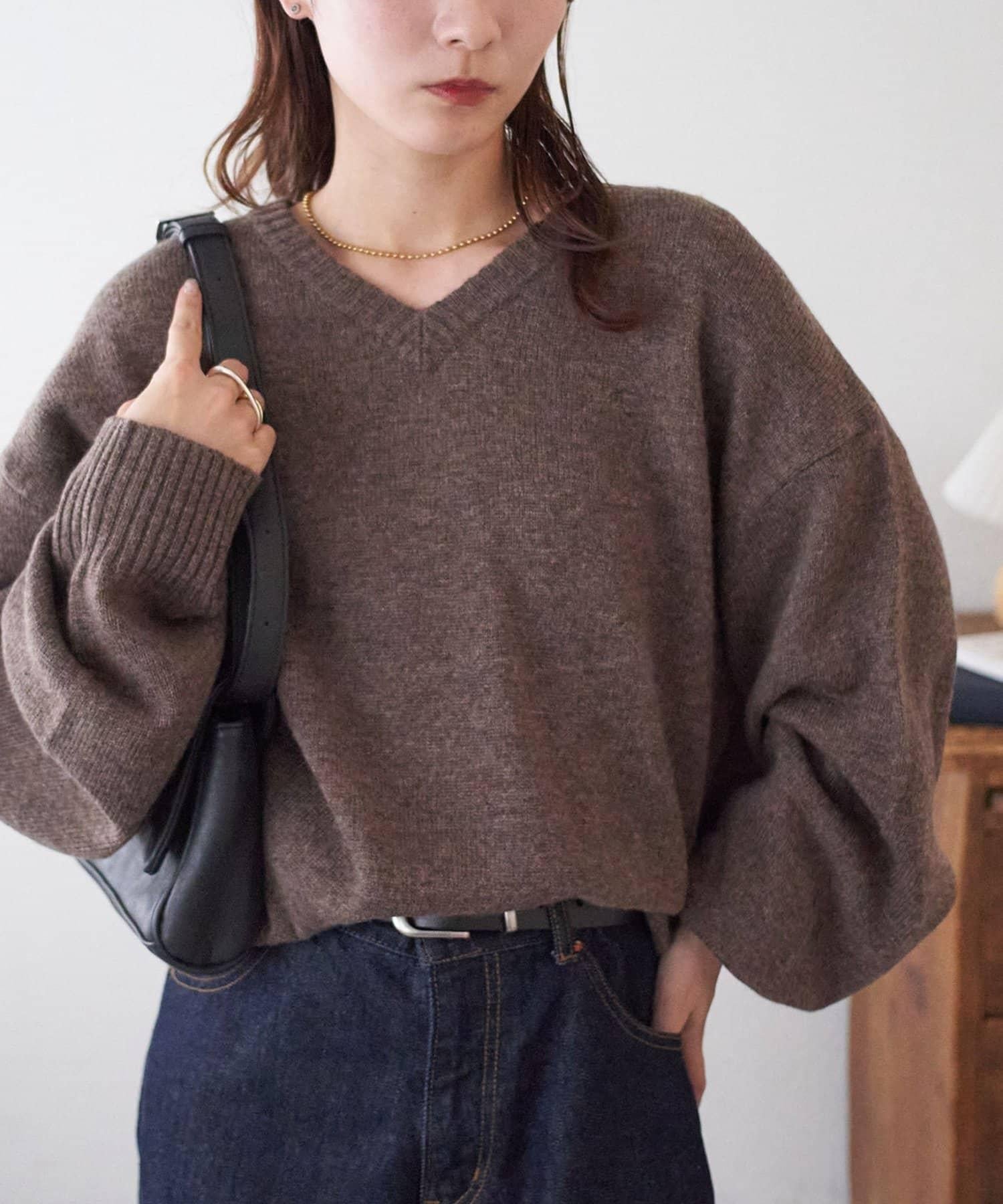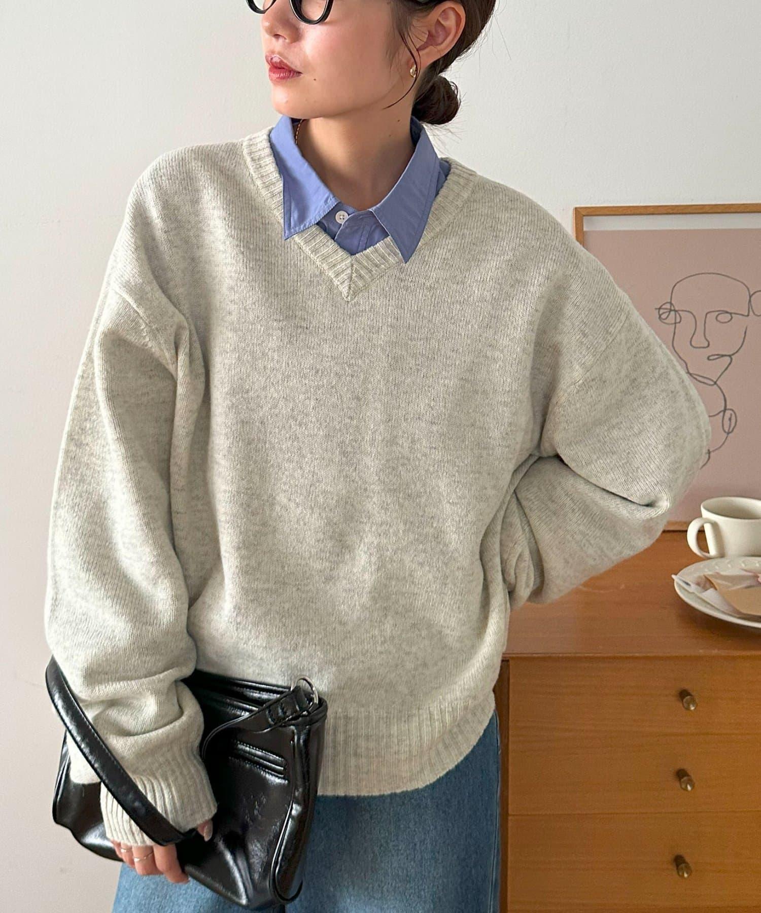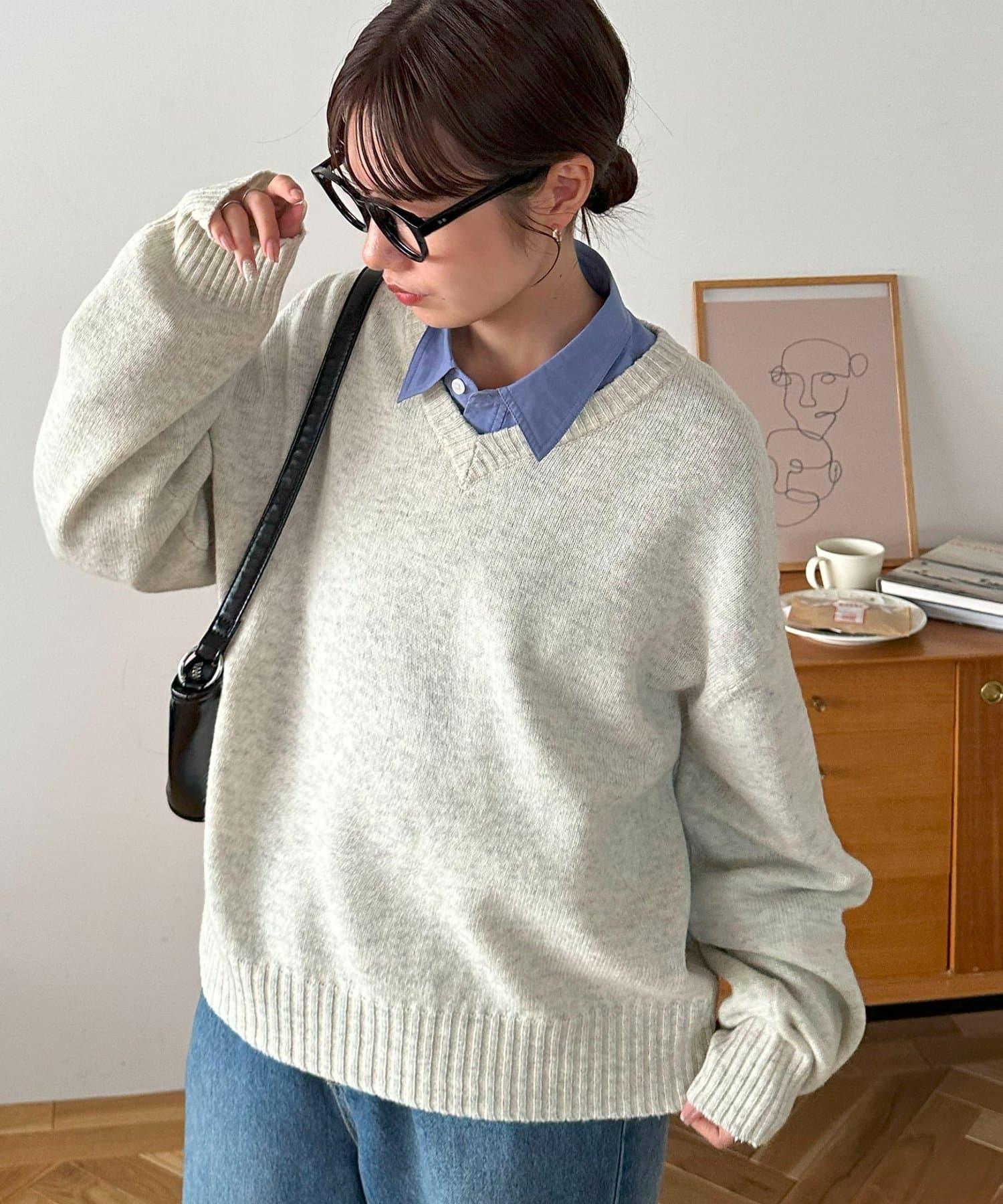 美利奴羊毛 V 領針織衫,精緻簡約。領口處的 V 形線條使臉部看起來乾淨利落,而基本款的外觀則給人優雅成熟的印象。寬鬆的剪裁略顯寬鬆,不會過於突顯身體線條。袖口和下襬採用羅紋設計,自然貼身,同時增加了整體輪廓的立體感。