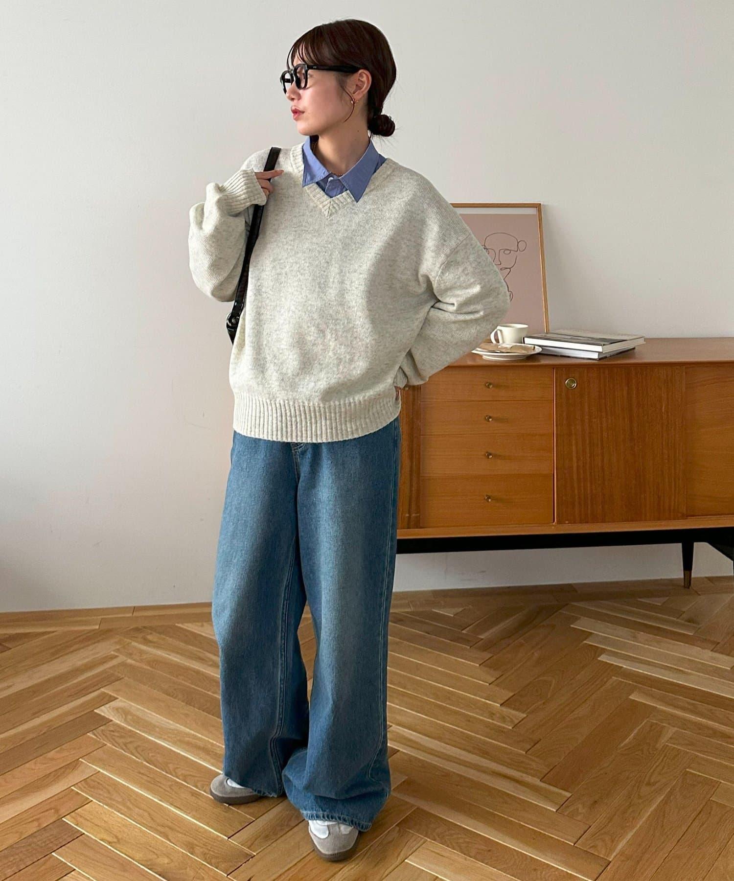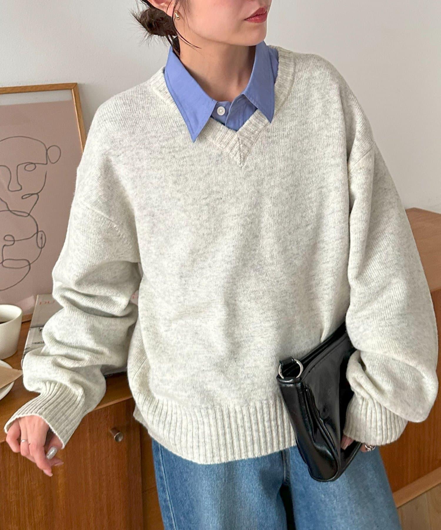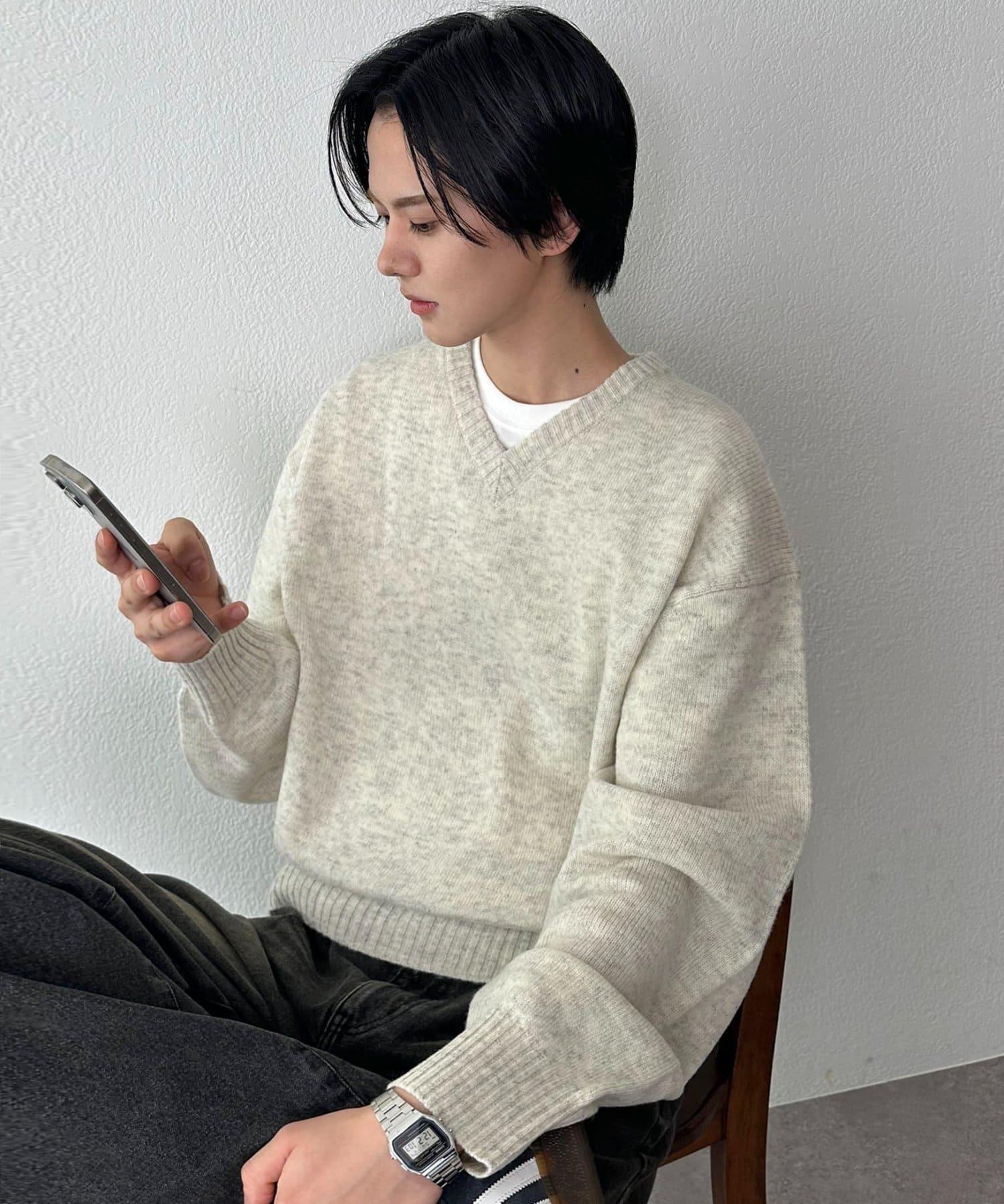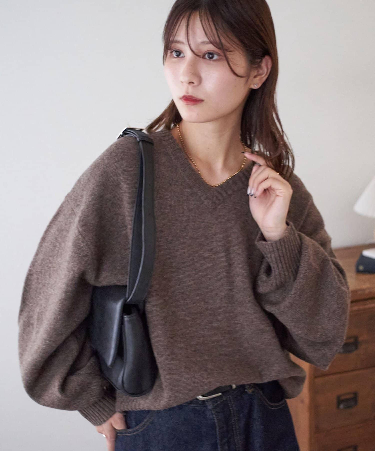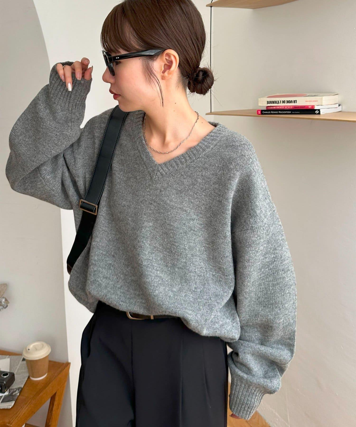 美利奴羊毛 V 領針織衫,精緻簡約。領口處的 V 形線條使臉部看起來乾淨利落,而基本款的外觀則給人優雅成熟的印象。寬鬆的剪裁略顯寬鬆,不會過於突顯身體線條。袖口和下襬採用羅紋設計,自然貼身,同時增加了整體輪廓的立體感。