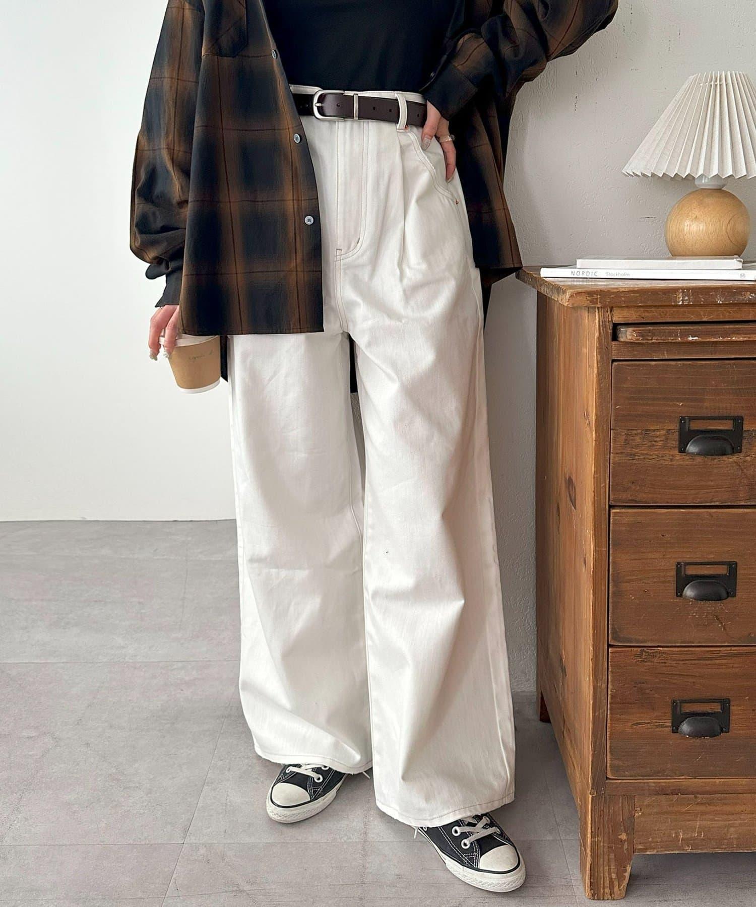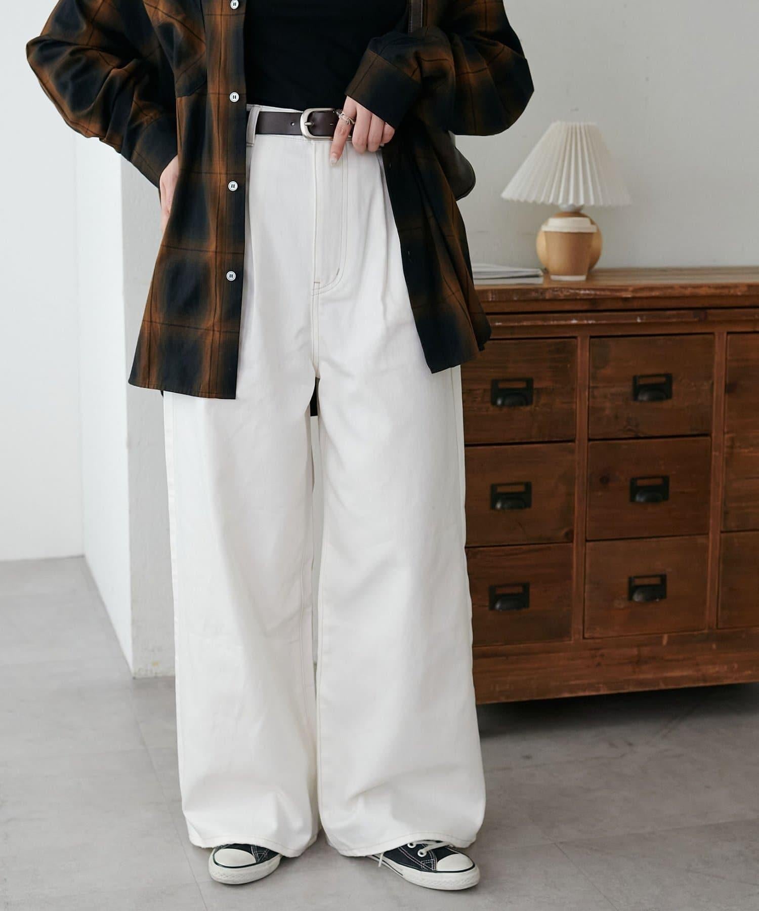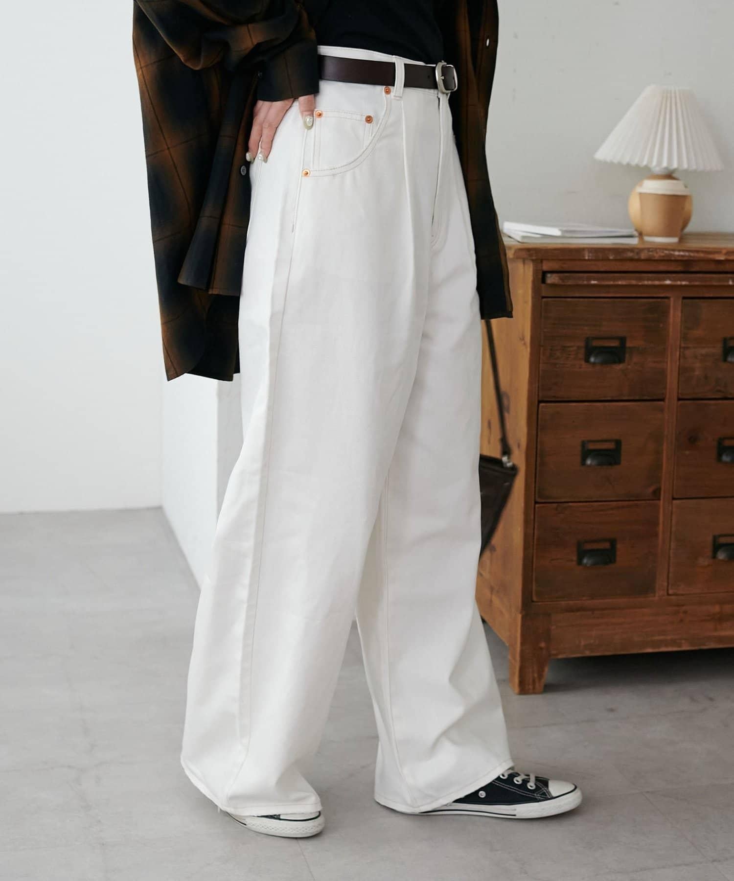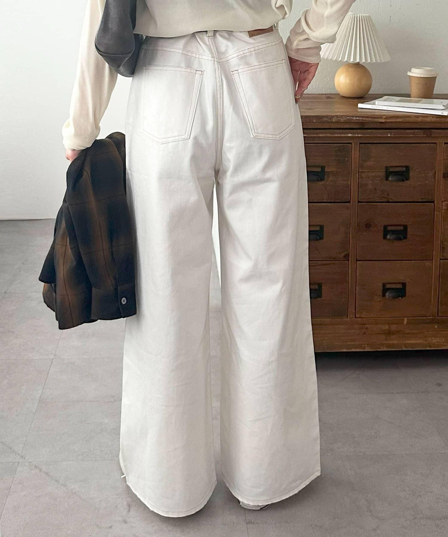 白色牛仔長褲,寬直筒剪裁。