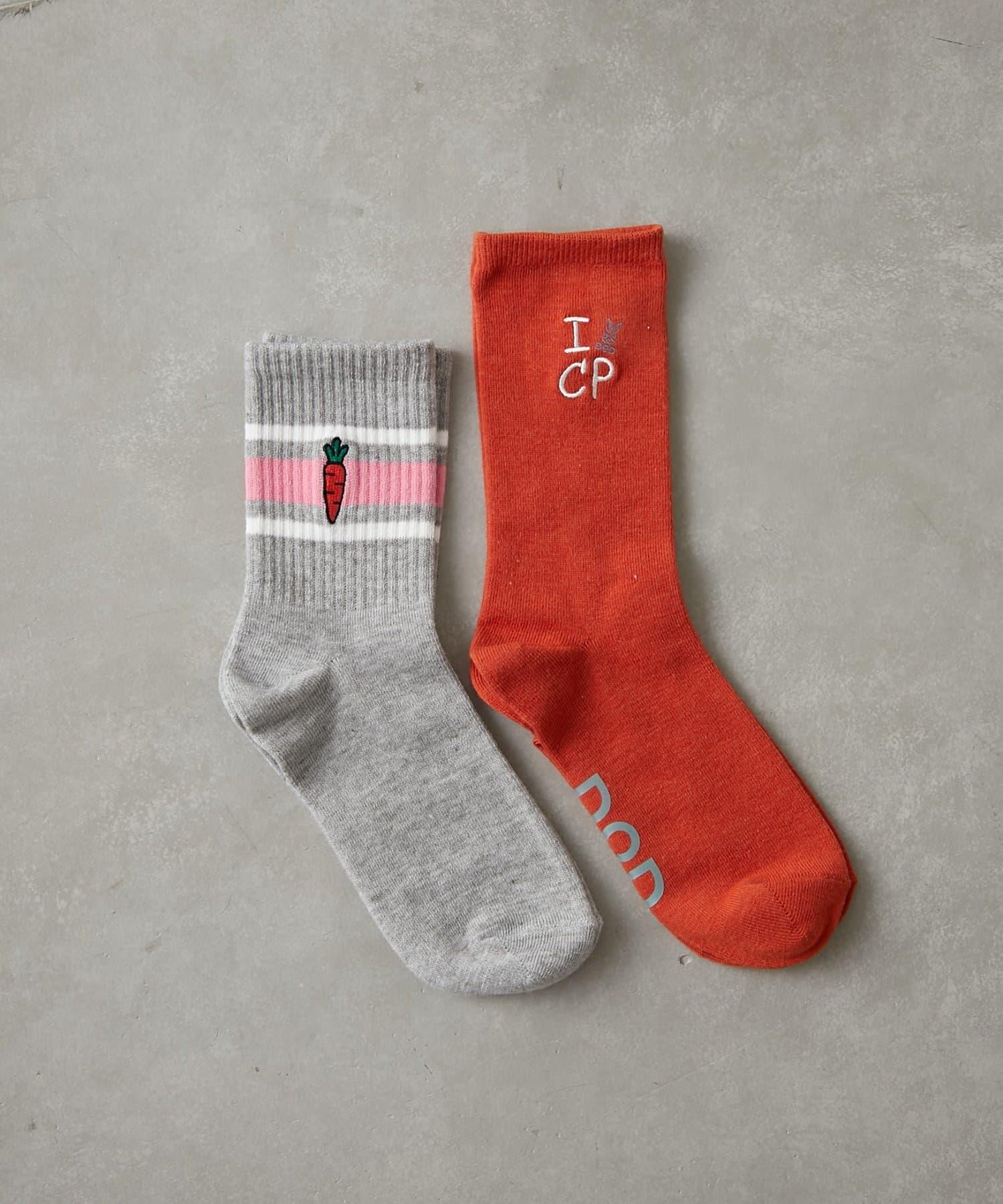 線襪上繡有胡蘿蔔和兔子圖案,給人一種微妙的趣味感。