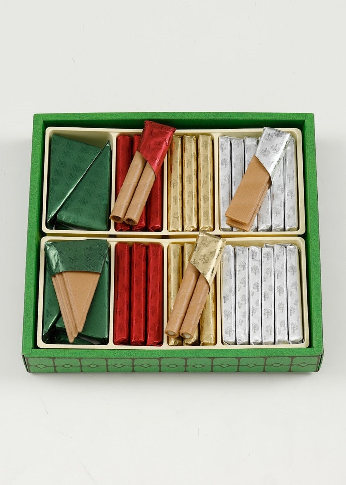 內容或固體含量及總量 圓形(3個三角形x 8包,2個條狀x 12包,2個牛奶巧克力x 6包,2個白巧克力x 6包),盒子尺寸:250 x 260 x 38毫米,重量:530克