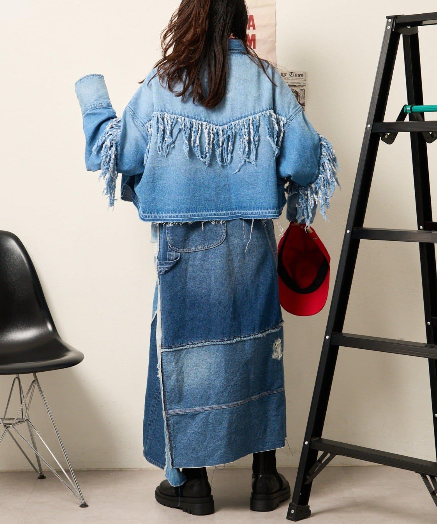 不同牛仔布料拼接而成的拼接設計令人眼前一亮。
