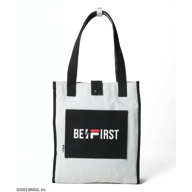 手提包,尺寸為寬 32x 高 38x 深 10 厘米。前袋繡有 FILAxBE:FIRST 合作徽標和 FILA 字樣。包的主開口、前後提手均可使用掛鉤固定。背面內側有一個開放式口袋和一個塑料瓶環形支架。