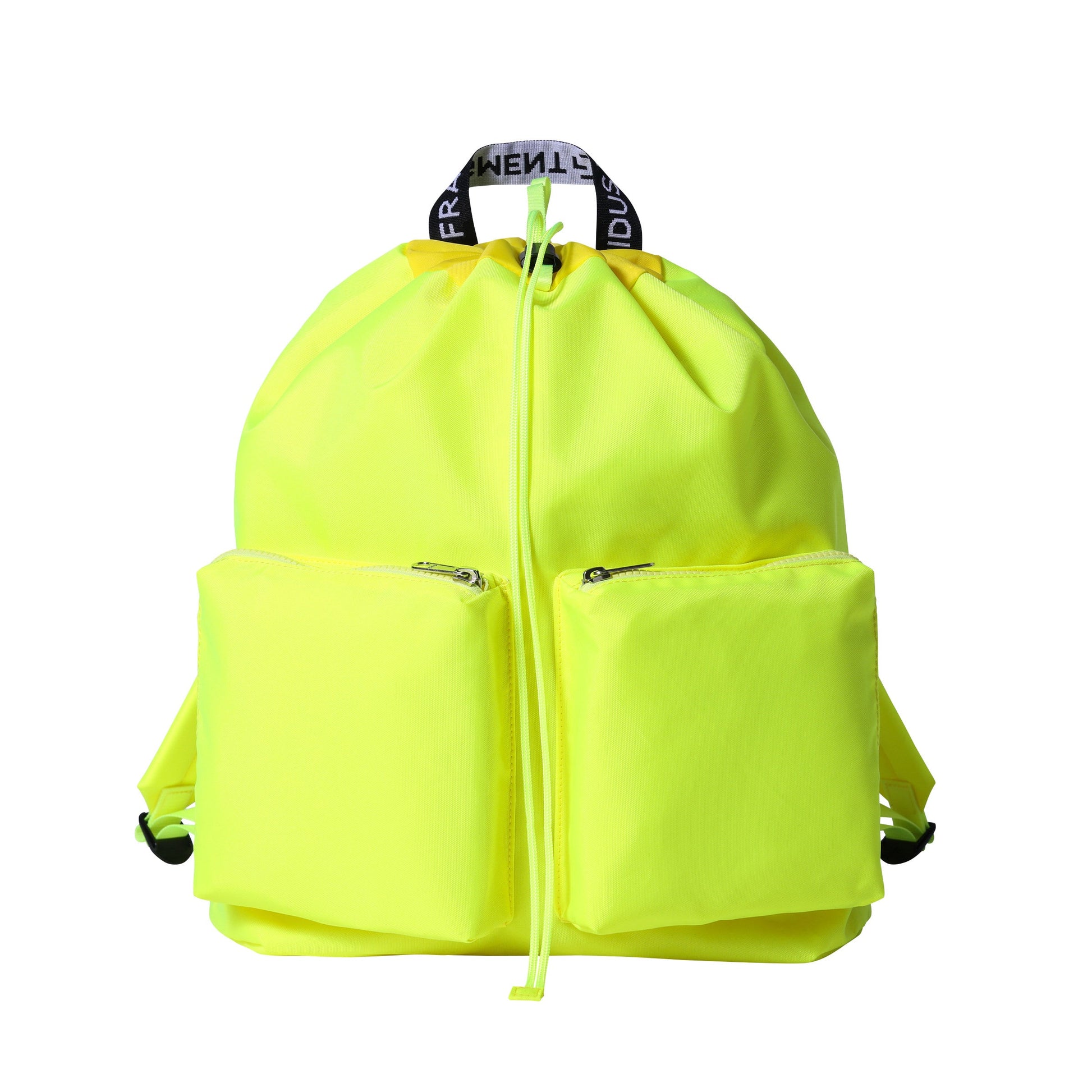 揹包四面都有方形口袋。主隔層可從頂部的聚攏開合和後部的拉鍊開合處進入,內袋可容納相當於 16 英寸 MacBook Pro 的大小。背面的抓環和膠帶是與 fragment design 合作的象徵,兩個品牌的徽標都編織在面料上。
