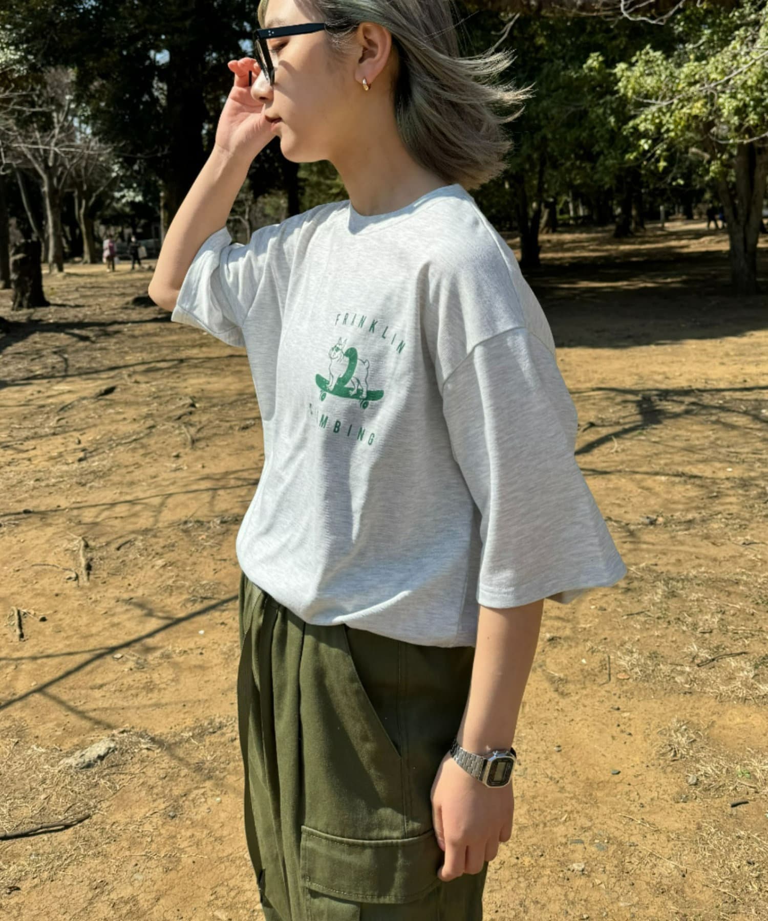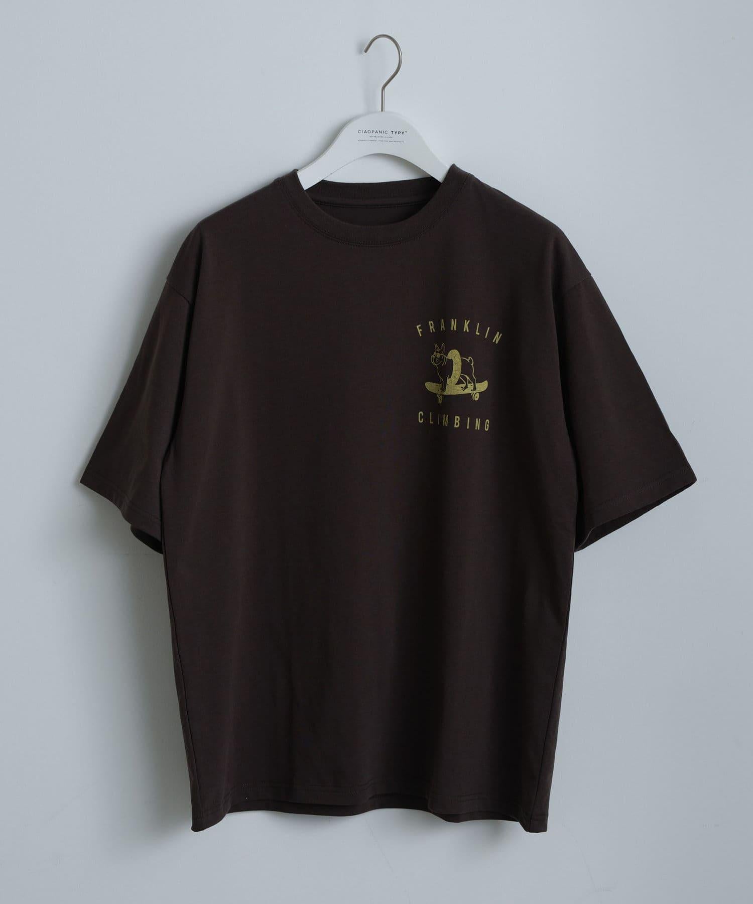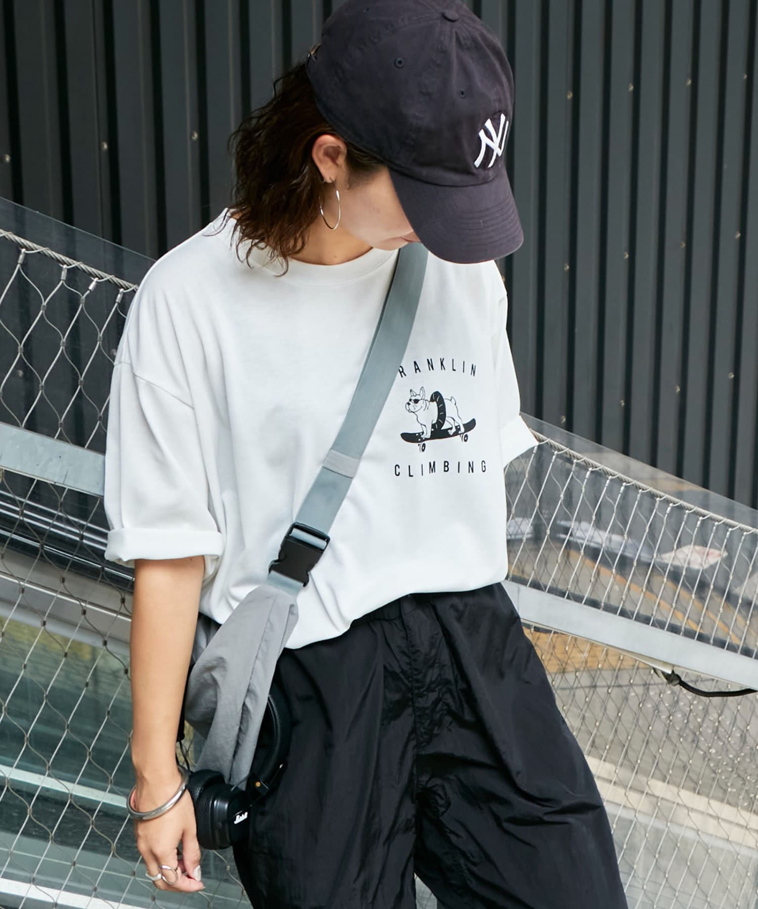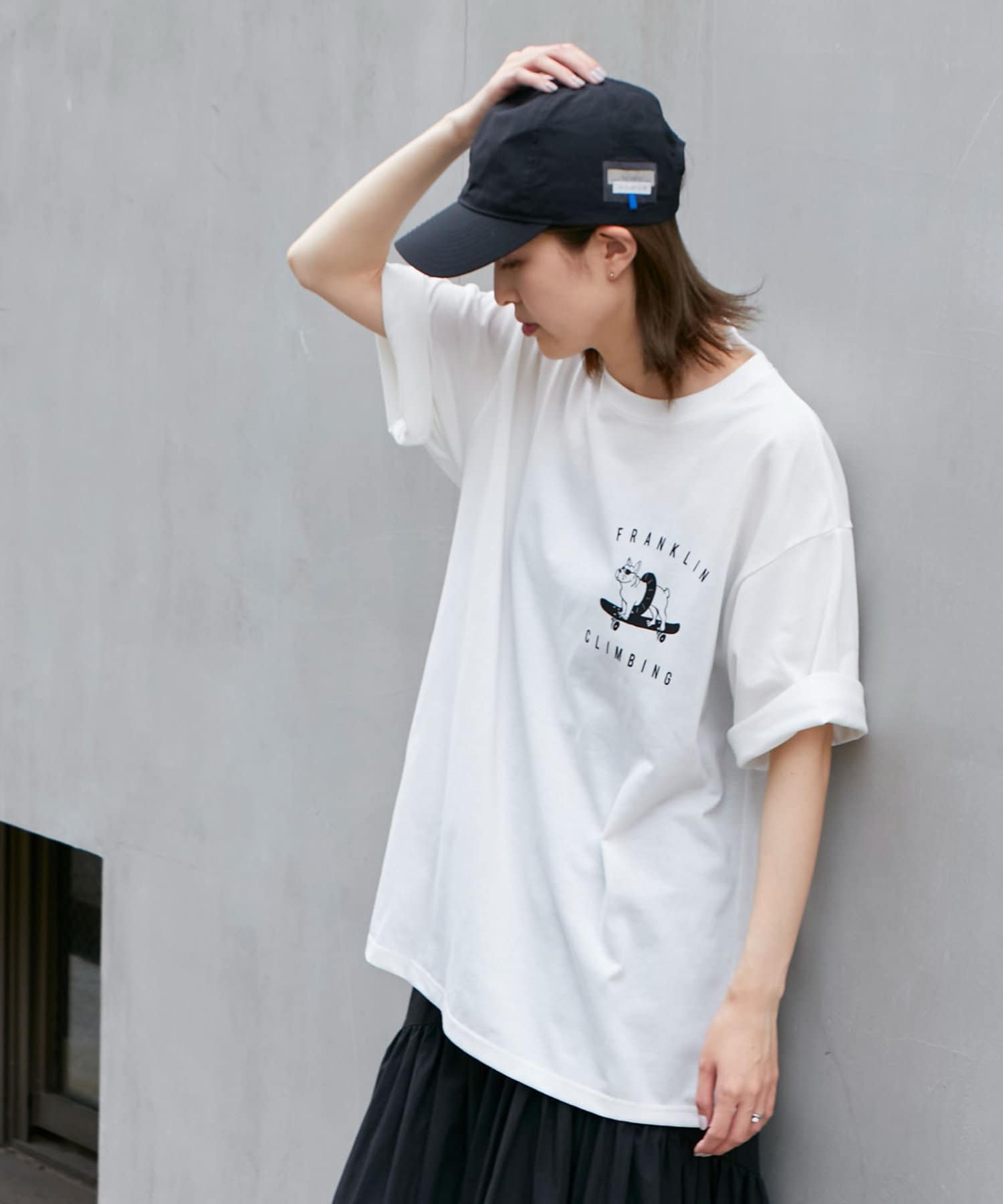 這是一款帶有衝浪味道的單點 T,設計有讓愛狗人士愛不釋手的[法國鬥牛犬側向飄動的滑板圖案]。