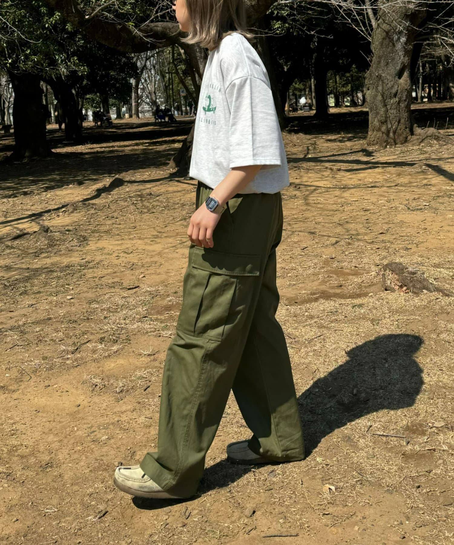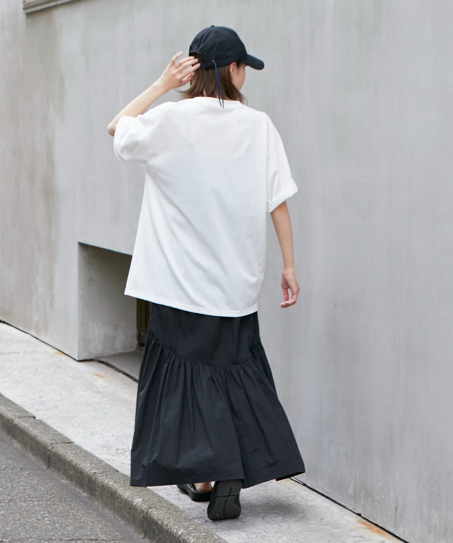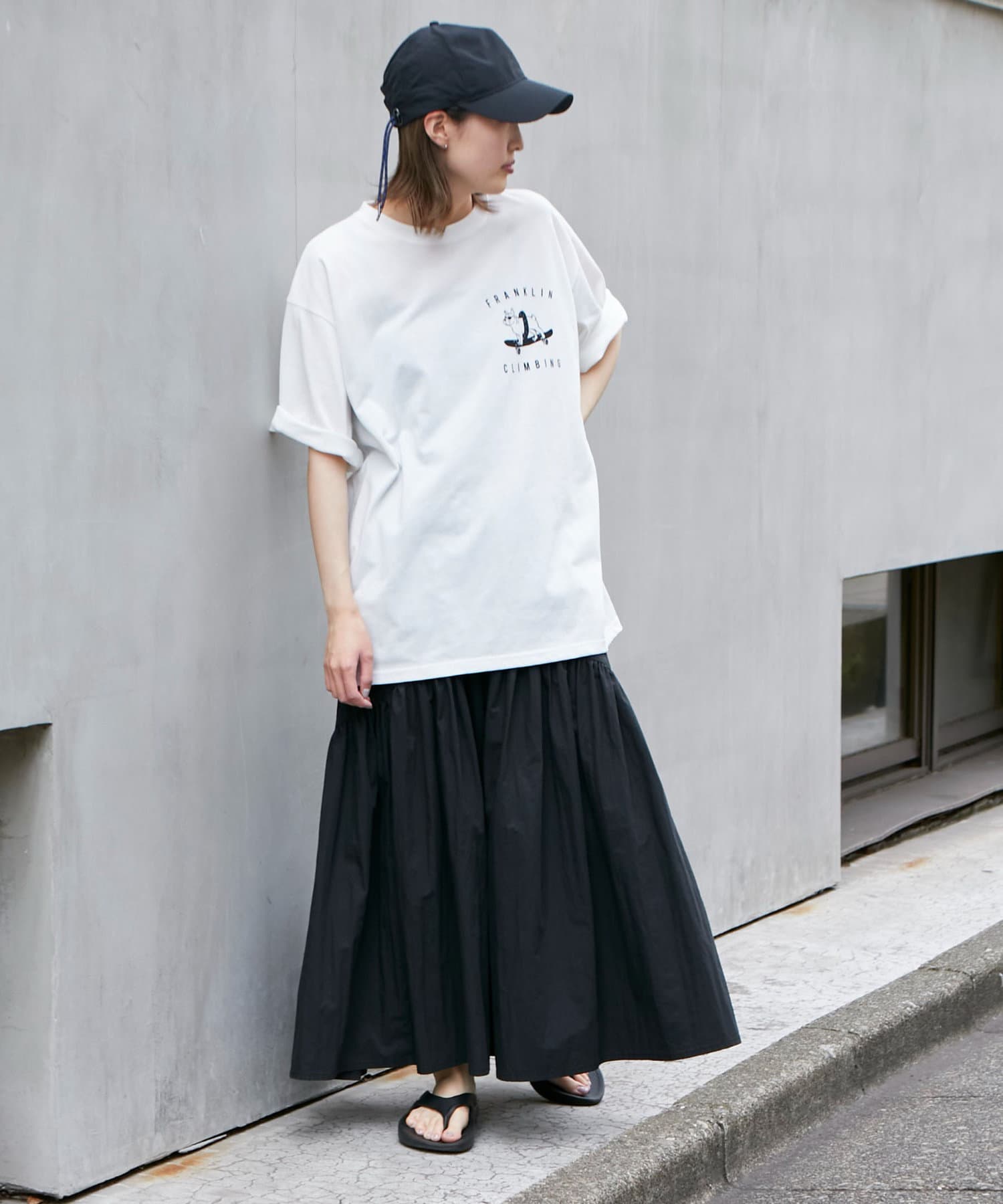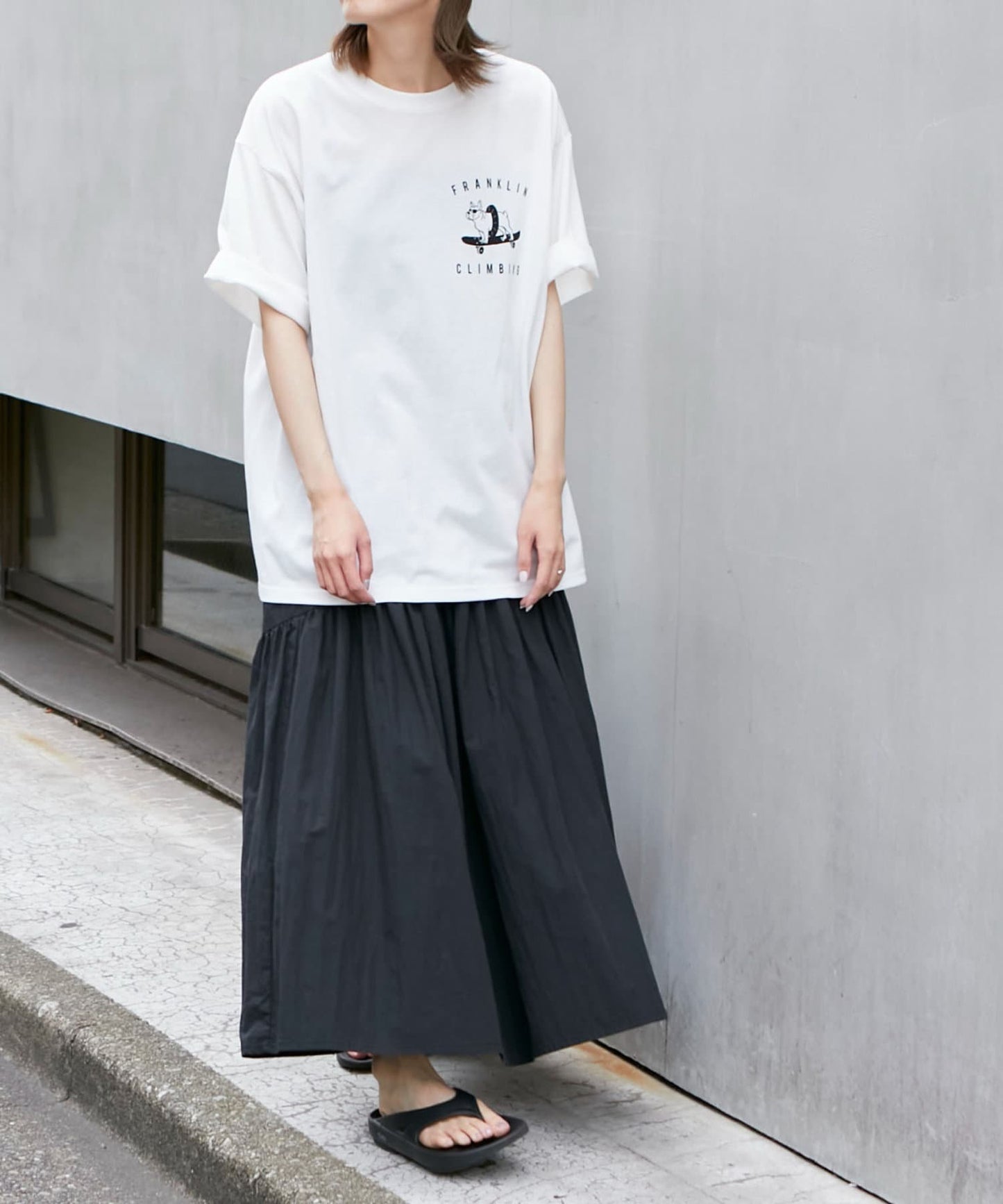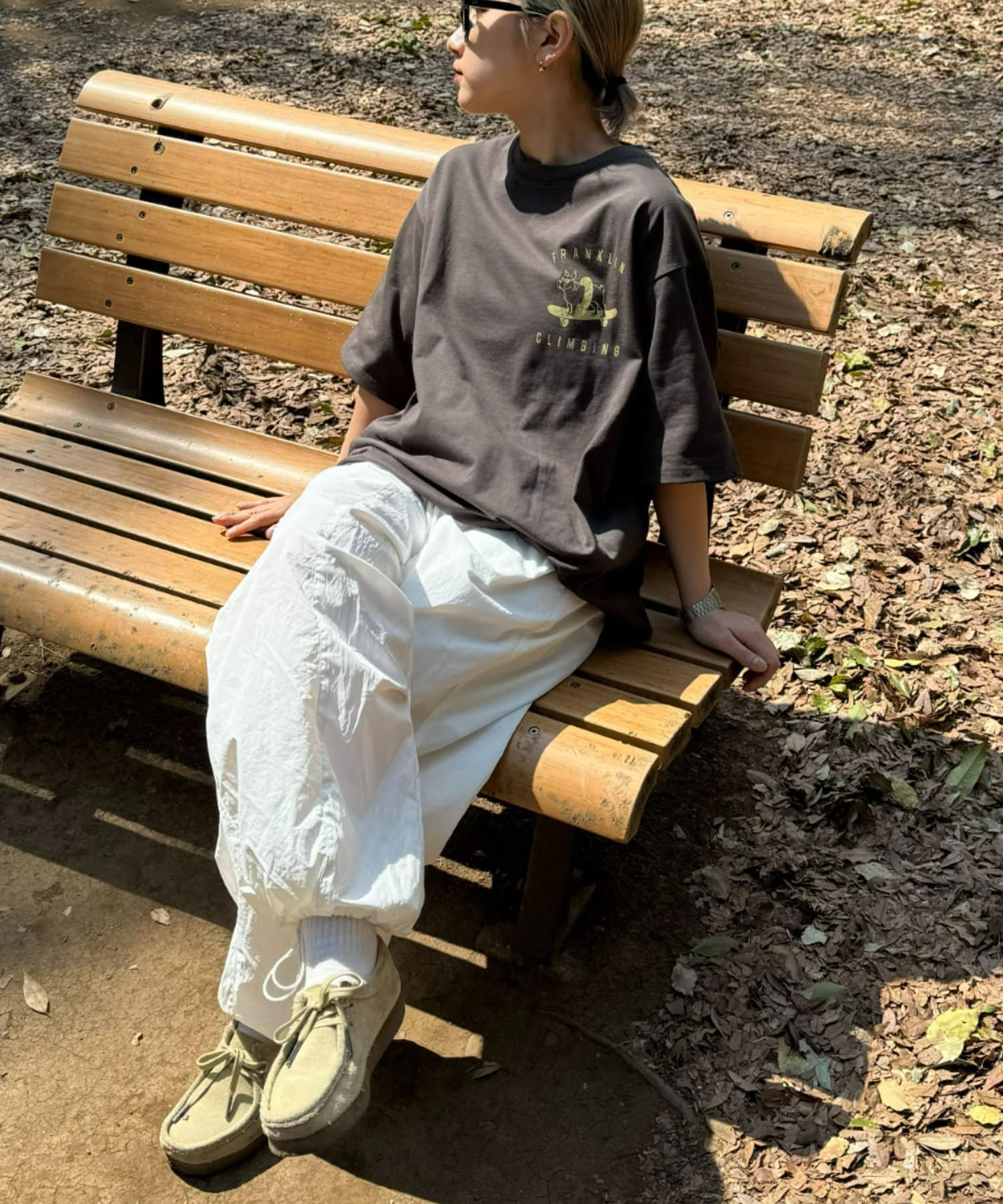 這是一款帶有衝浪味道的單點 T,設計有讓愛狗人士愛不釋手的[法國鬥牛犬側向飄動的滑板圖案]。