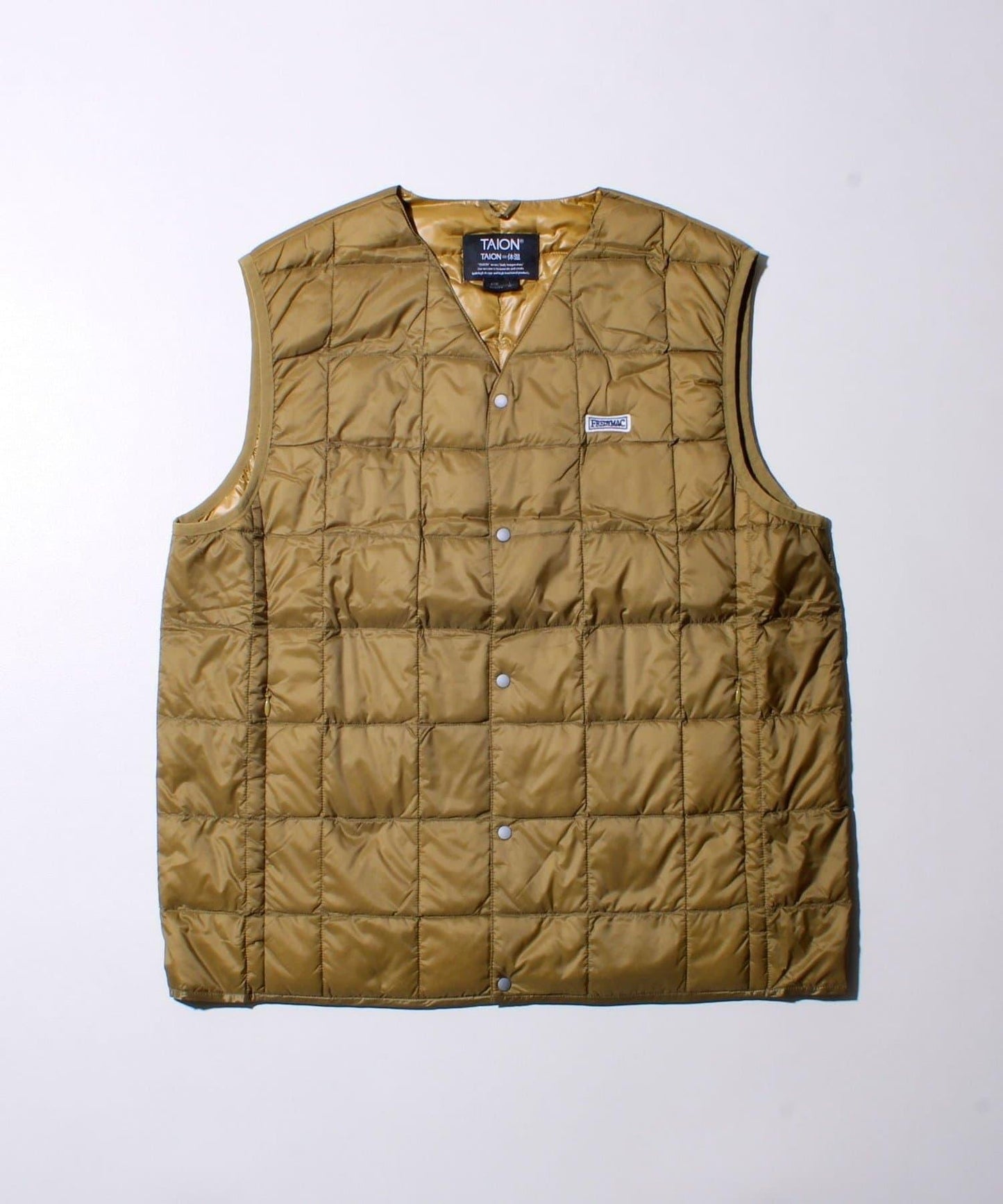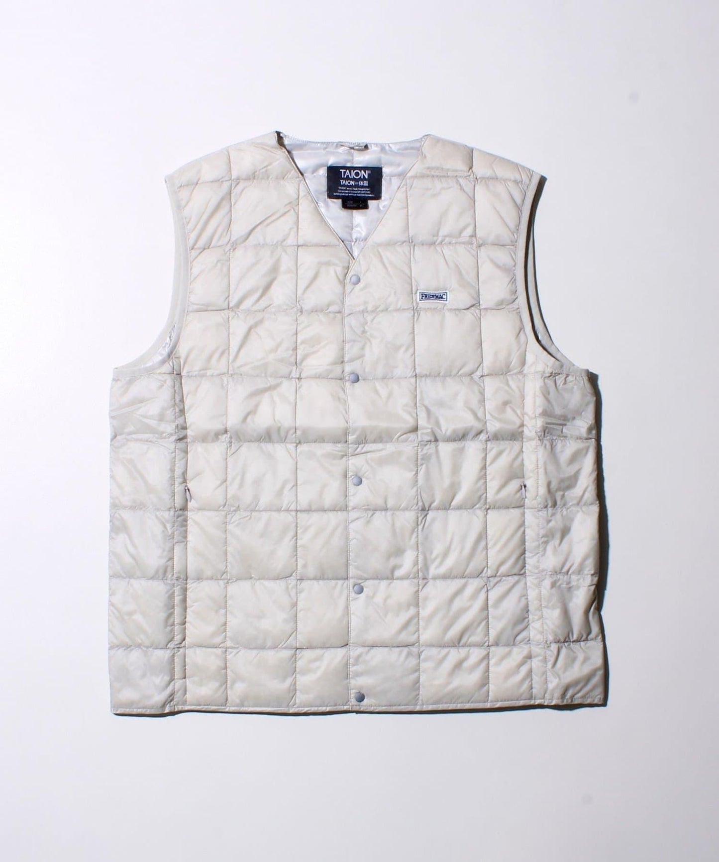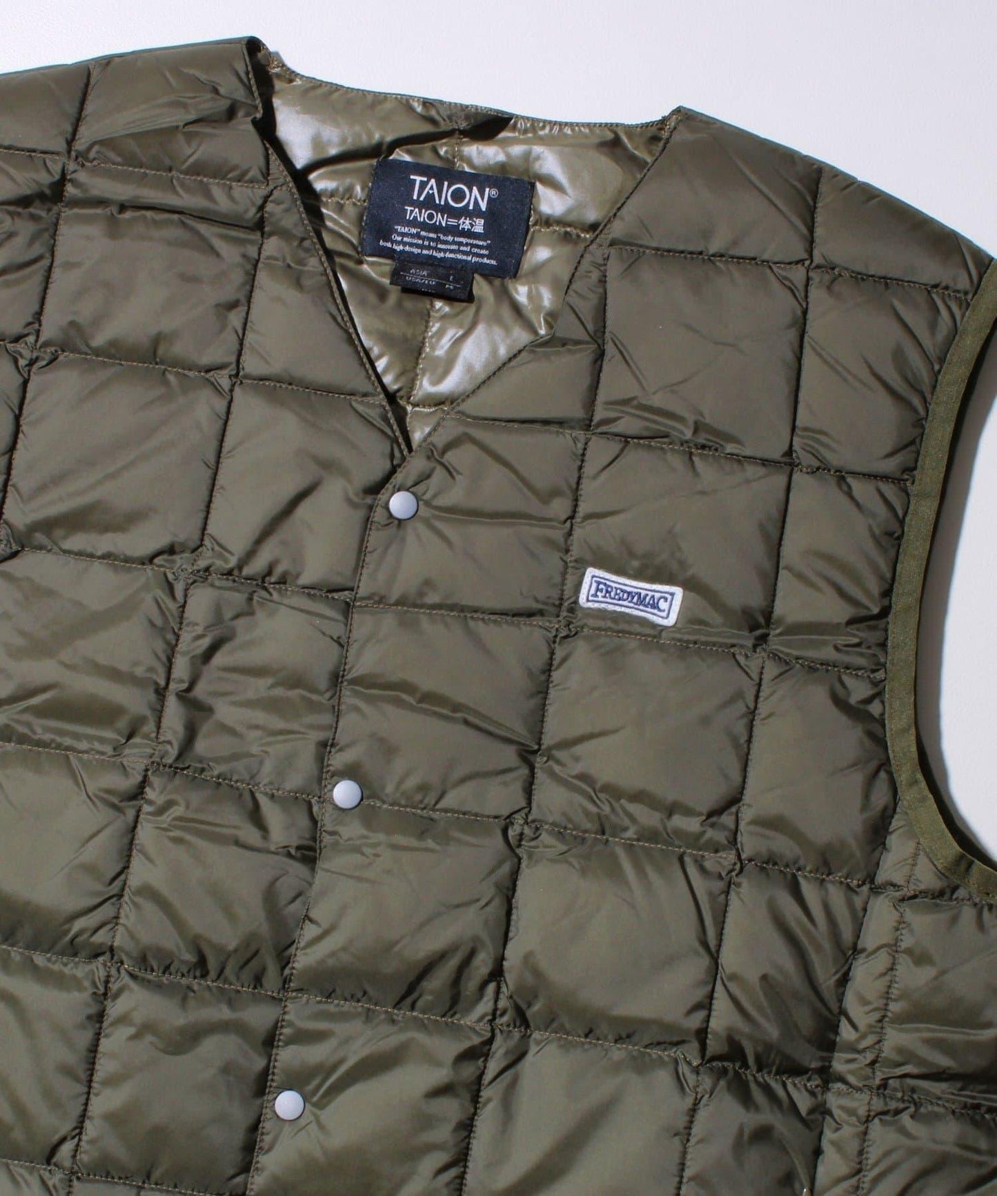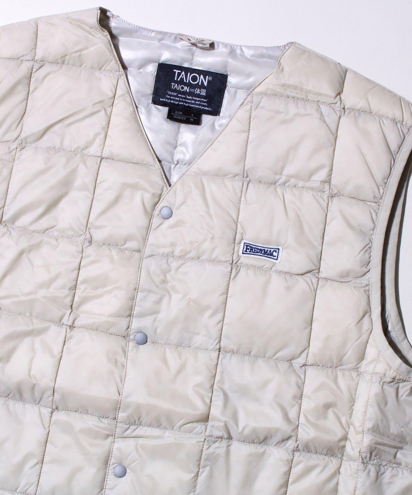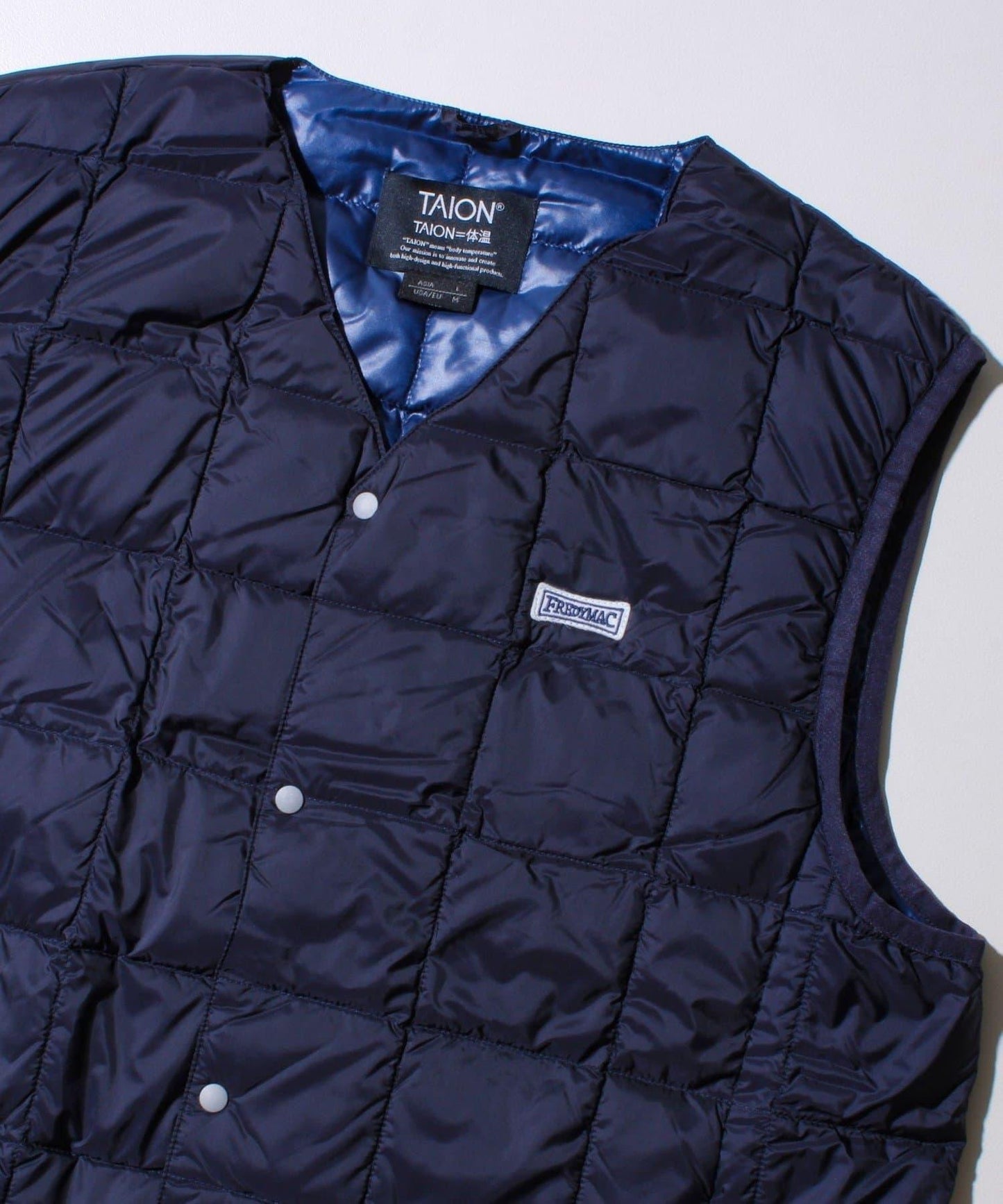 在 TAION 👍暢銷的 V 領紐扣內搭馬甲(TAION-001)上印有 FREDYMAC 徽標徽章的特別定製款,該款馬甲自品牌創立以來一直廣受歡迎,不分性別和年齡。