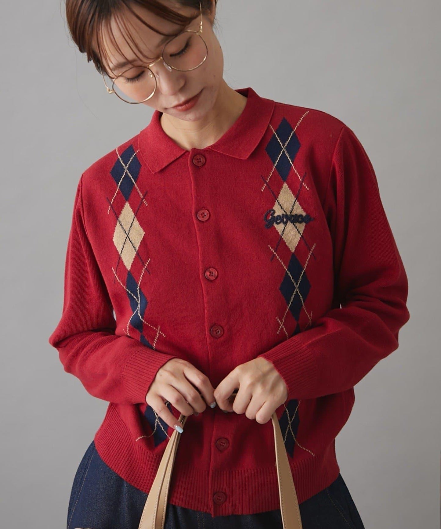 這款針織開衫以醒目的鮮紅色為基調,配以菱格紋圖案。