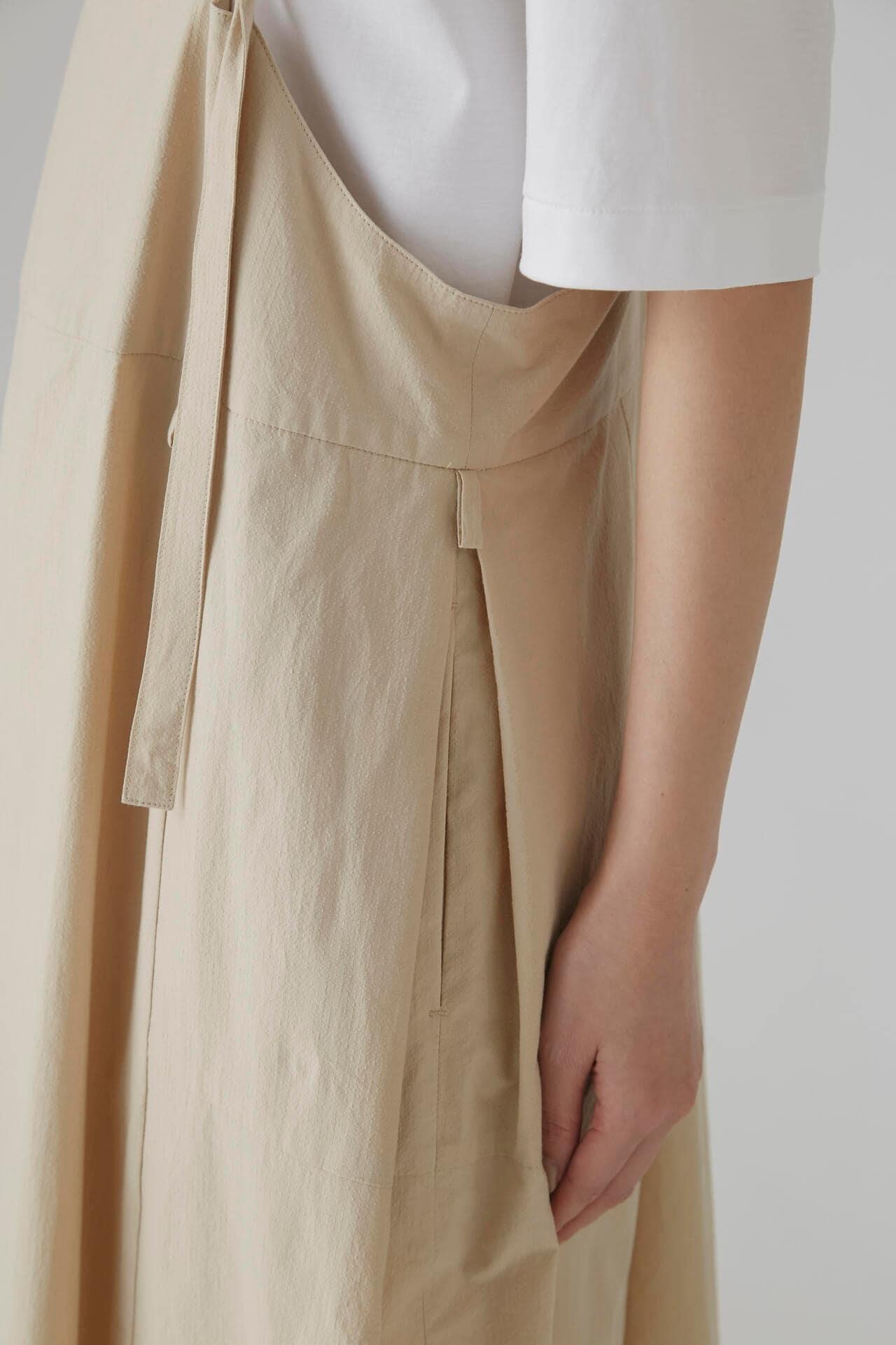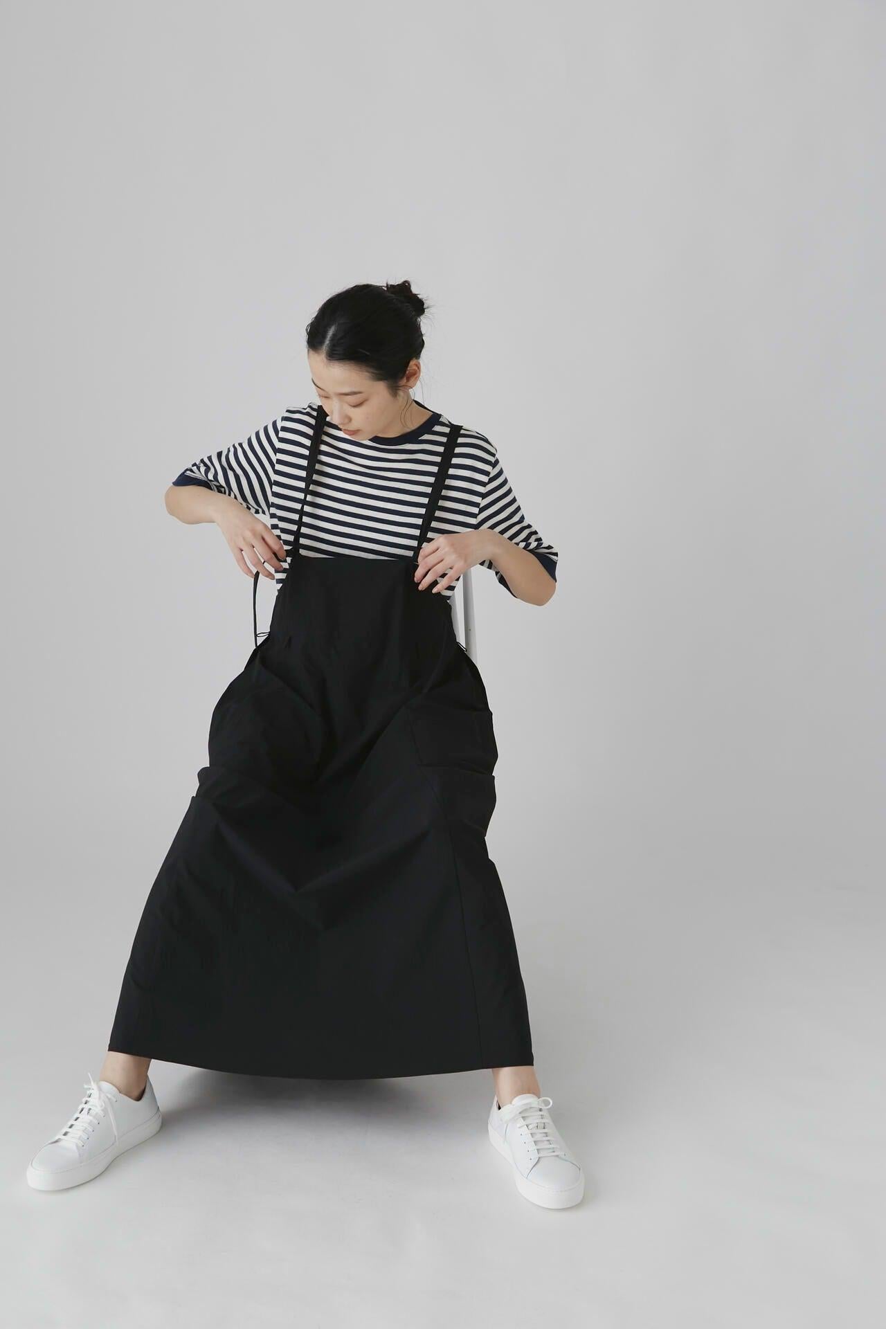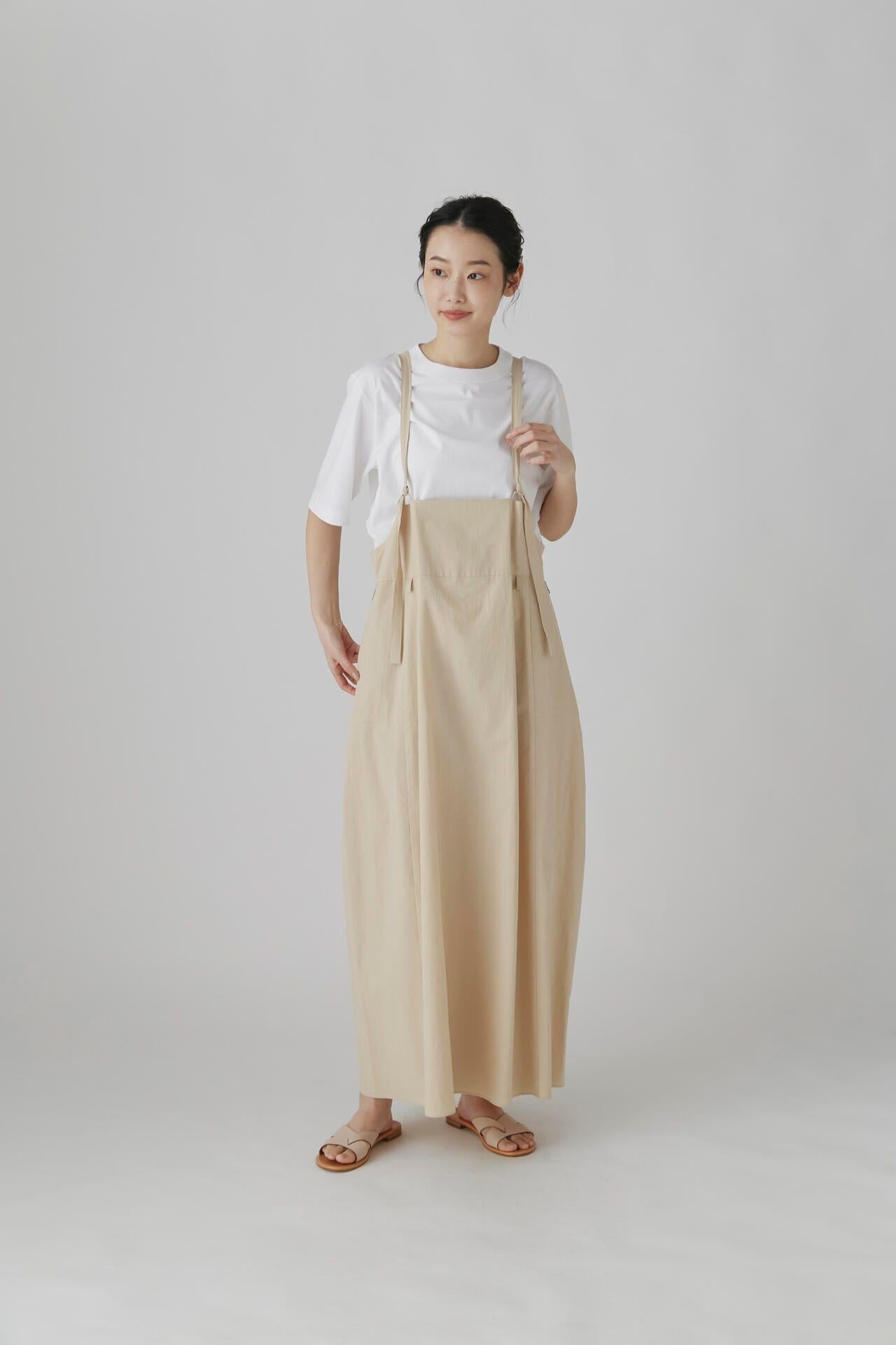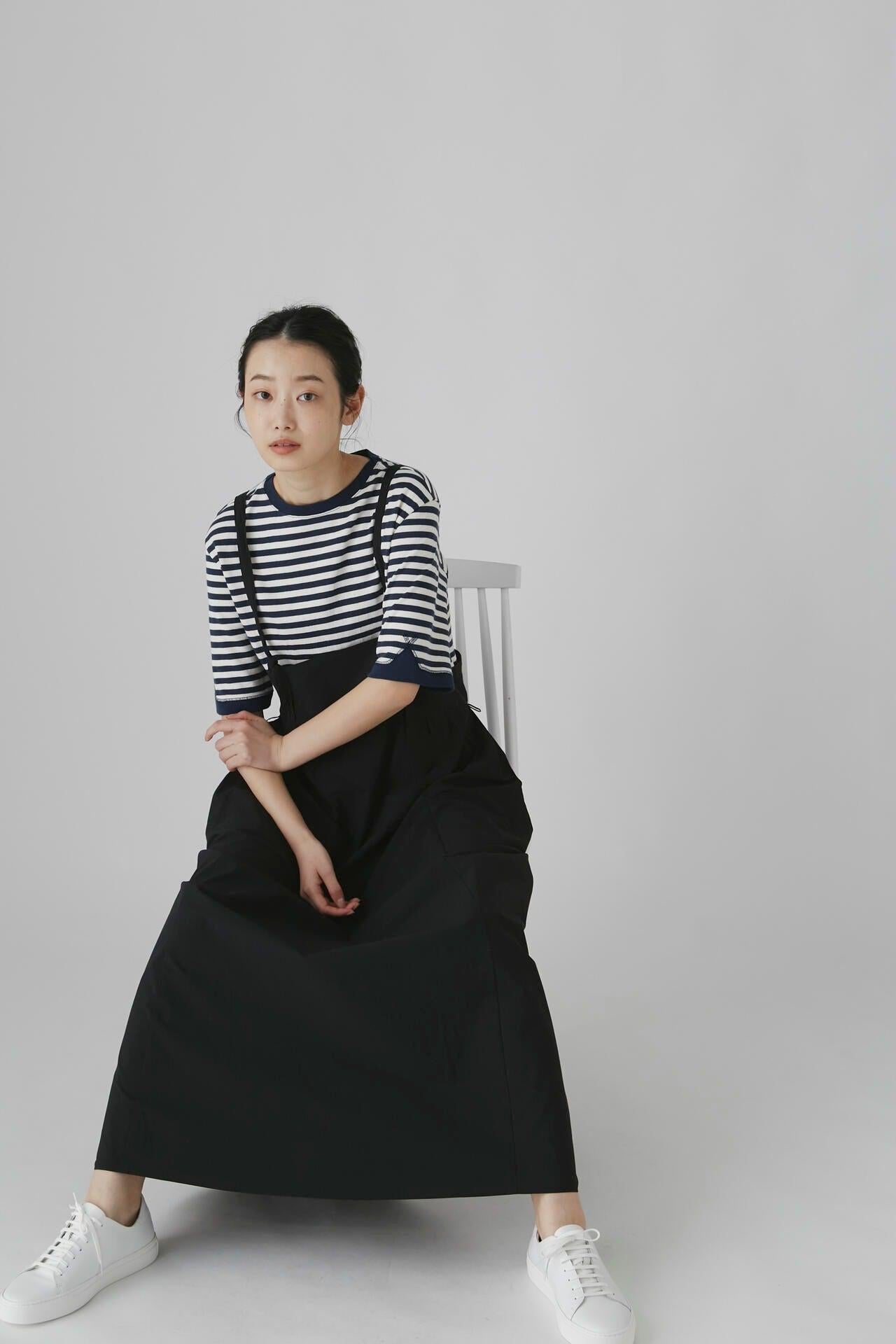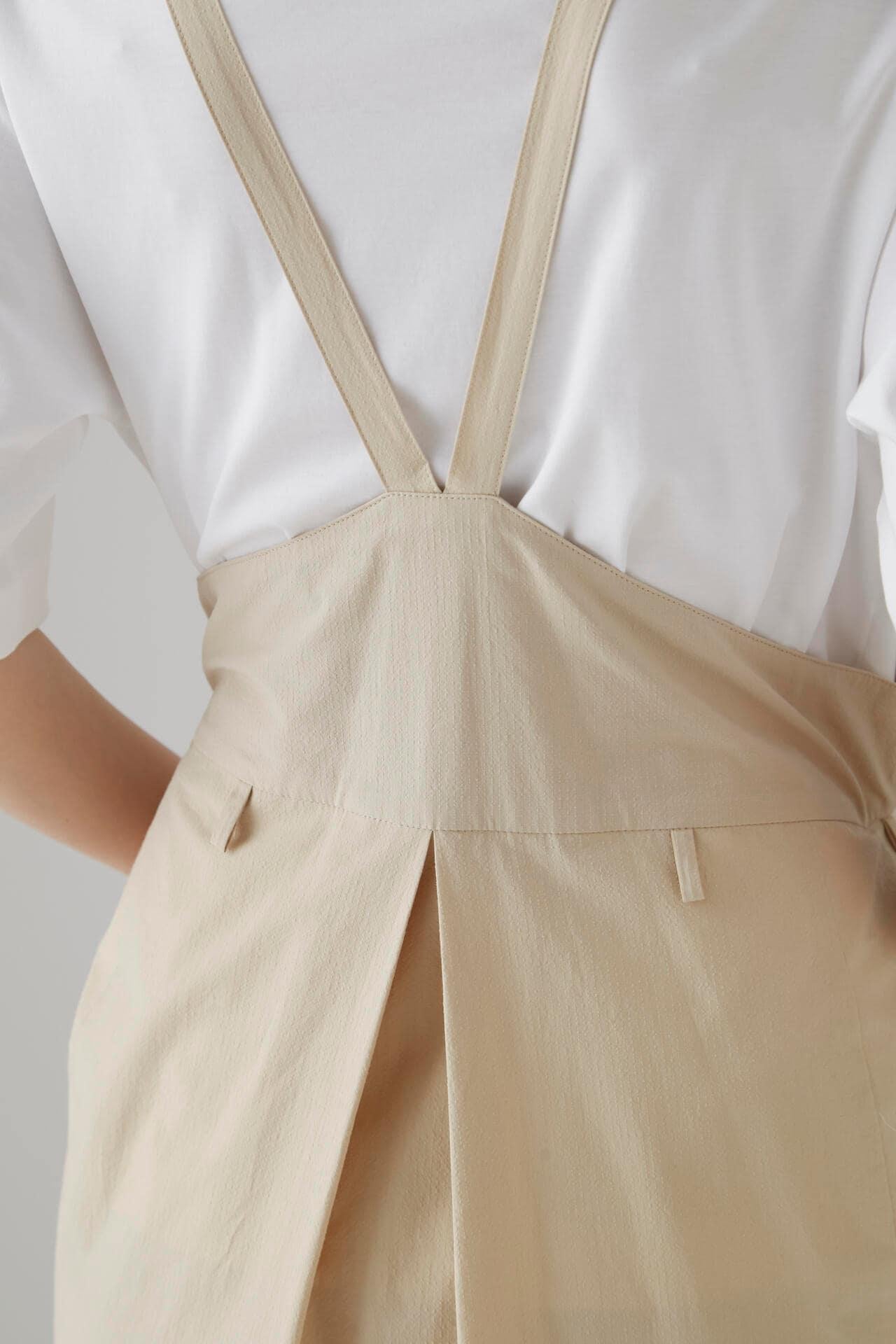 帶肩帶的半身裙,雙向設計,別有一番風味 [設計特色] 裙襬寬大的跳線裙,肩帶與裙襬相連。褶襉的細節設計使其更顯成熟,長度可根據腰帶的系法進行調整。肩帶可以從後面穿過腰帶環系在前面,而裙子則可以通過折回胸衣部分變成長裙。秋冬季還可搭配針織衫。它是一款可長期穿著的單品,不受季節限制。面料是由超長有機棉製成的表面凹凸不平的撕裂面料。推薦座標] 暖季可搭配鏤空上衣,冷季可搭配針織衫。