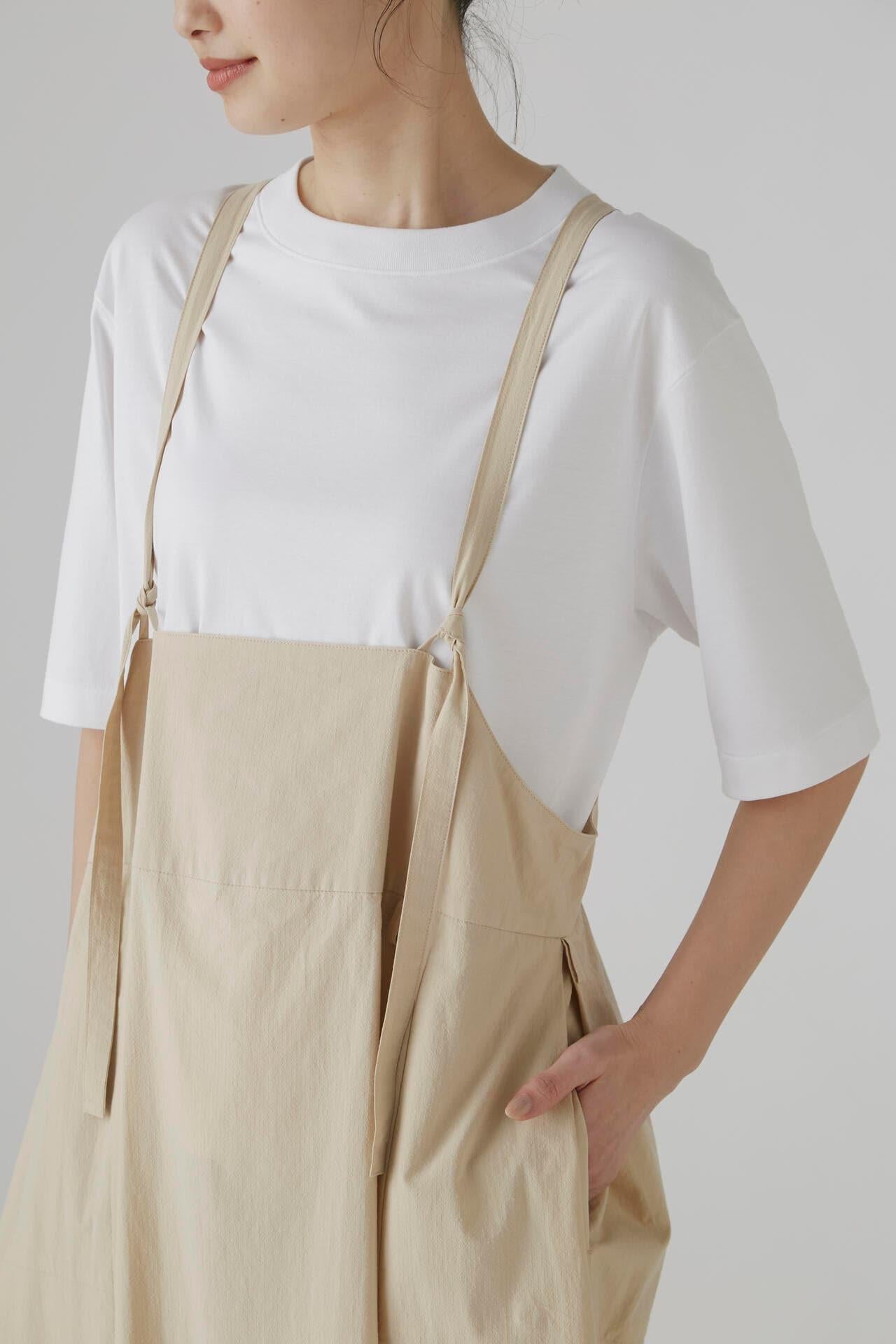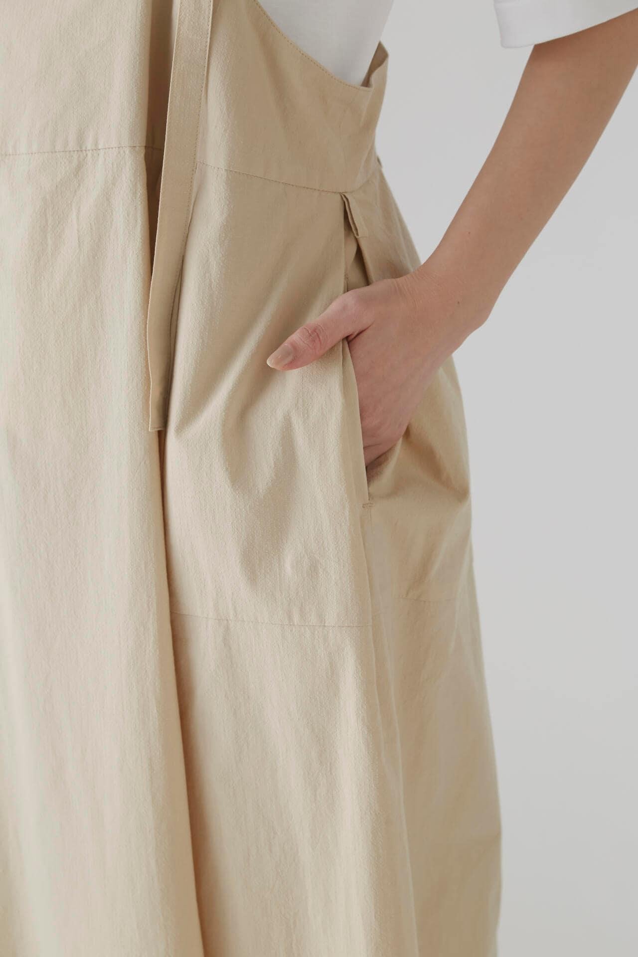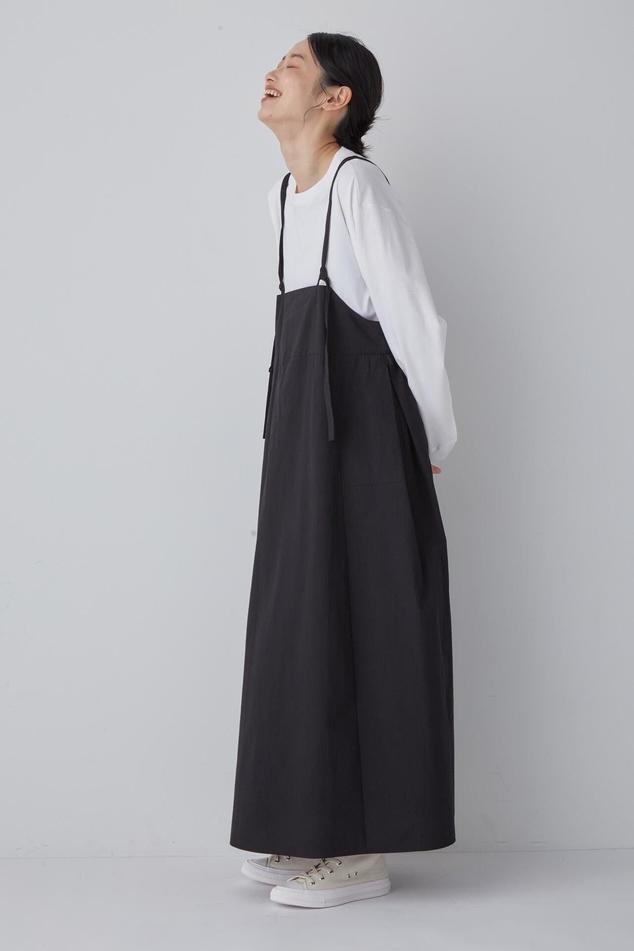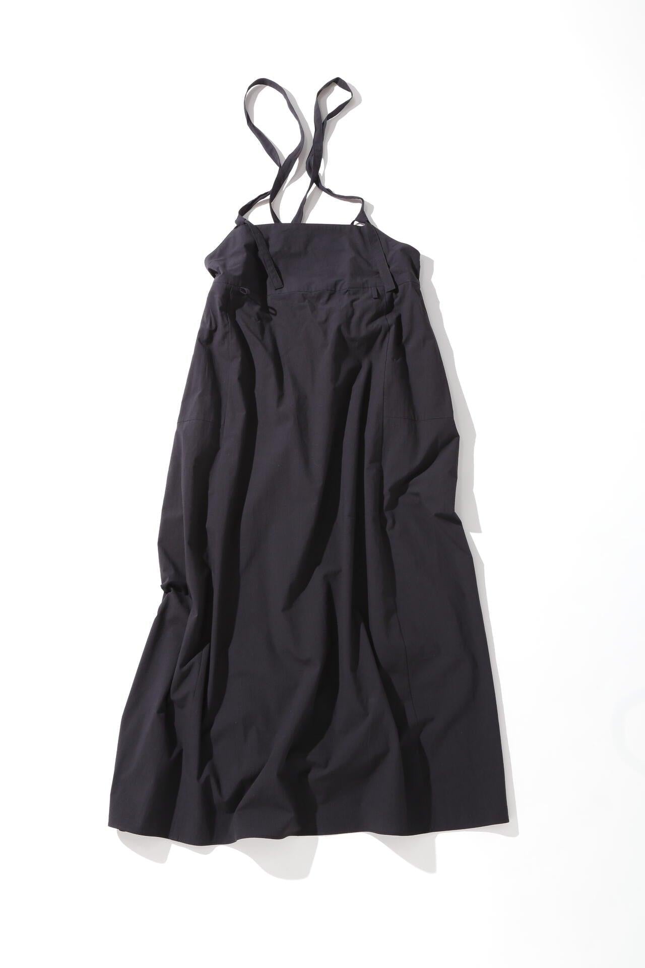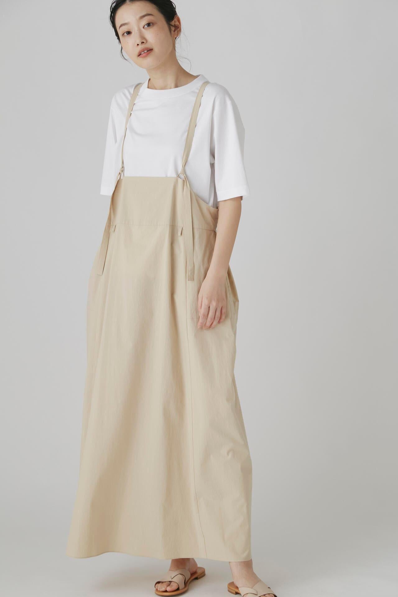 帶肩帶的半身裙,雙向設計,別有一番風味 [設計特色] 裙襬寬大的跳線裙,肩帶與裙襬相連。褶襉的細節設計使其更顯成熟,長度可根據腰帶的系法進行調整。肩帶可以從後面穿過腰帶環系在前面,而裙子則可以通過折回胸衣部分變成長裙。秋冬季還可搭配針織衫。它是一款可長期穿著的單品,不受季節限制。面料是由超長有機棉製成的表面凹凸不平的撕裂面料。推薦座標] 暖季可搭配鏤空上衣,冷季可搭配針織衫。