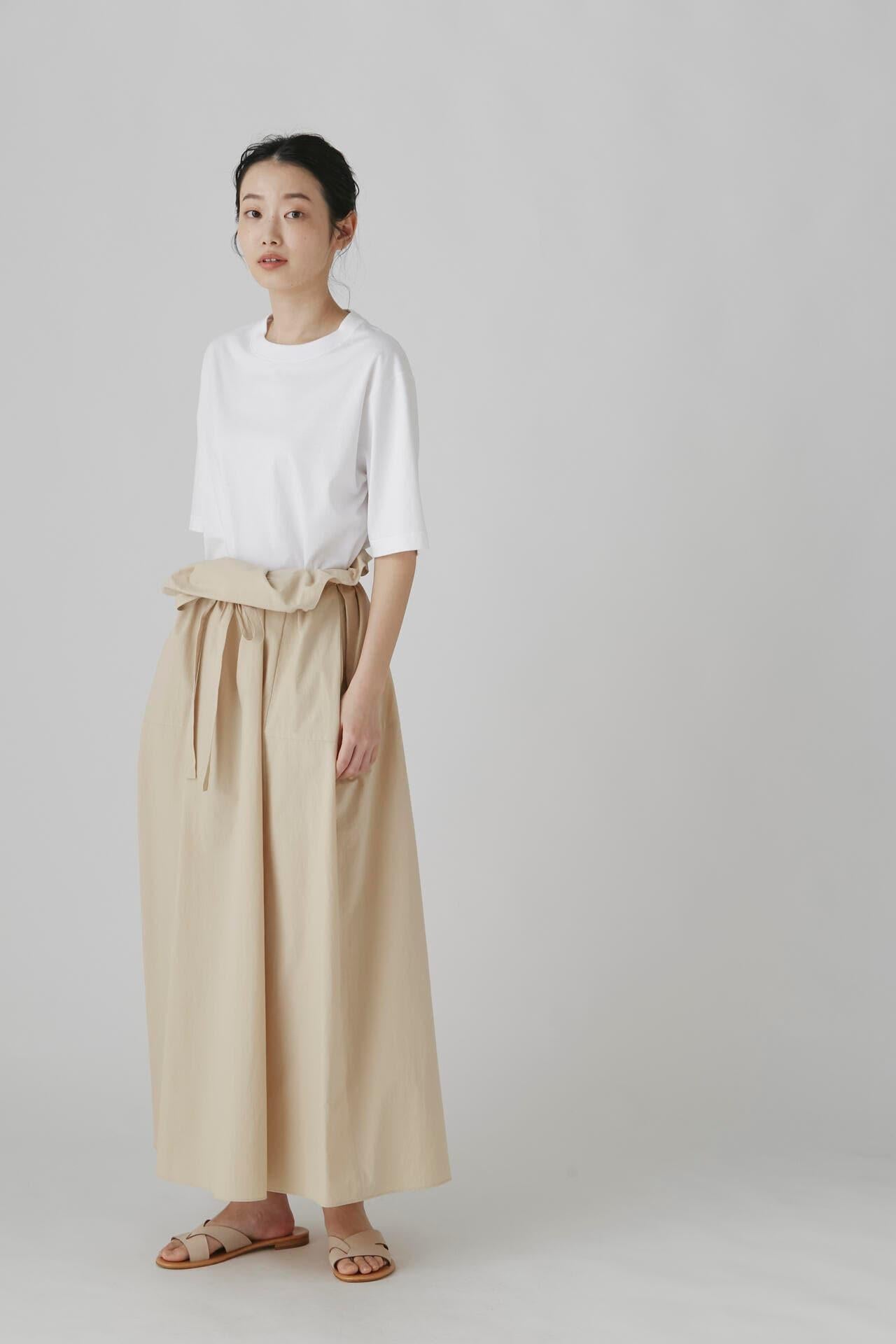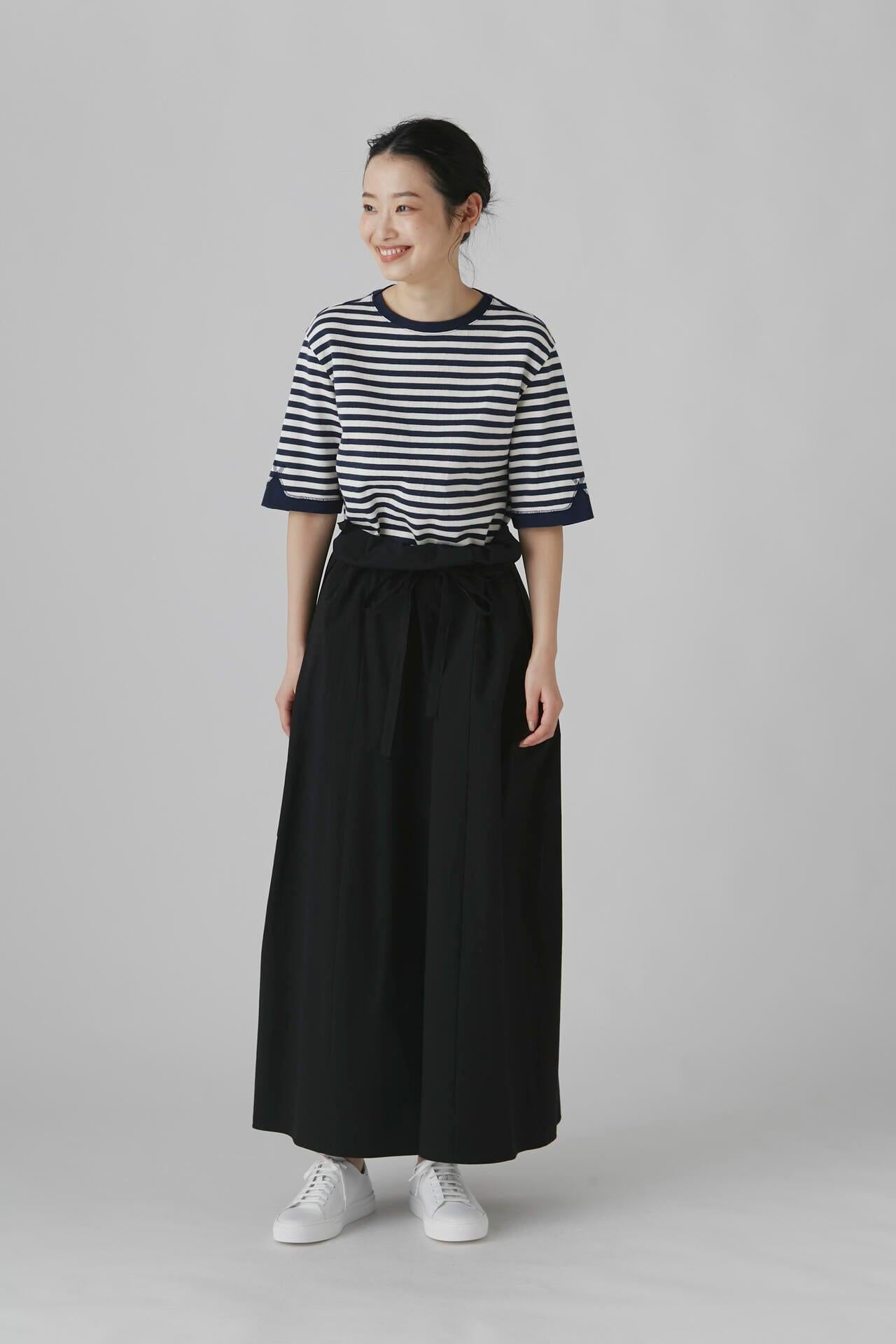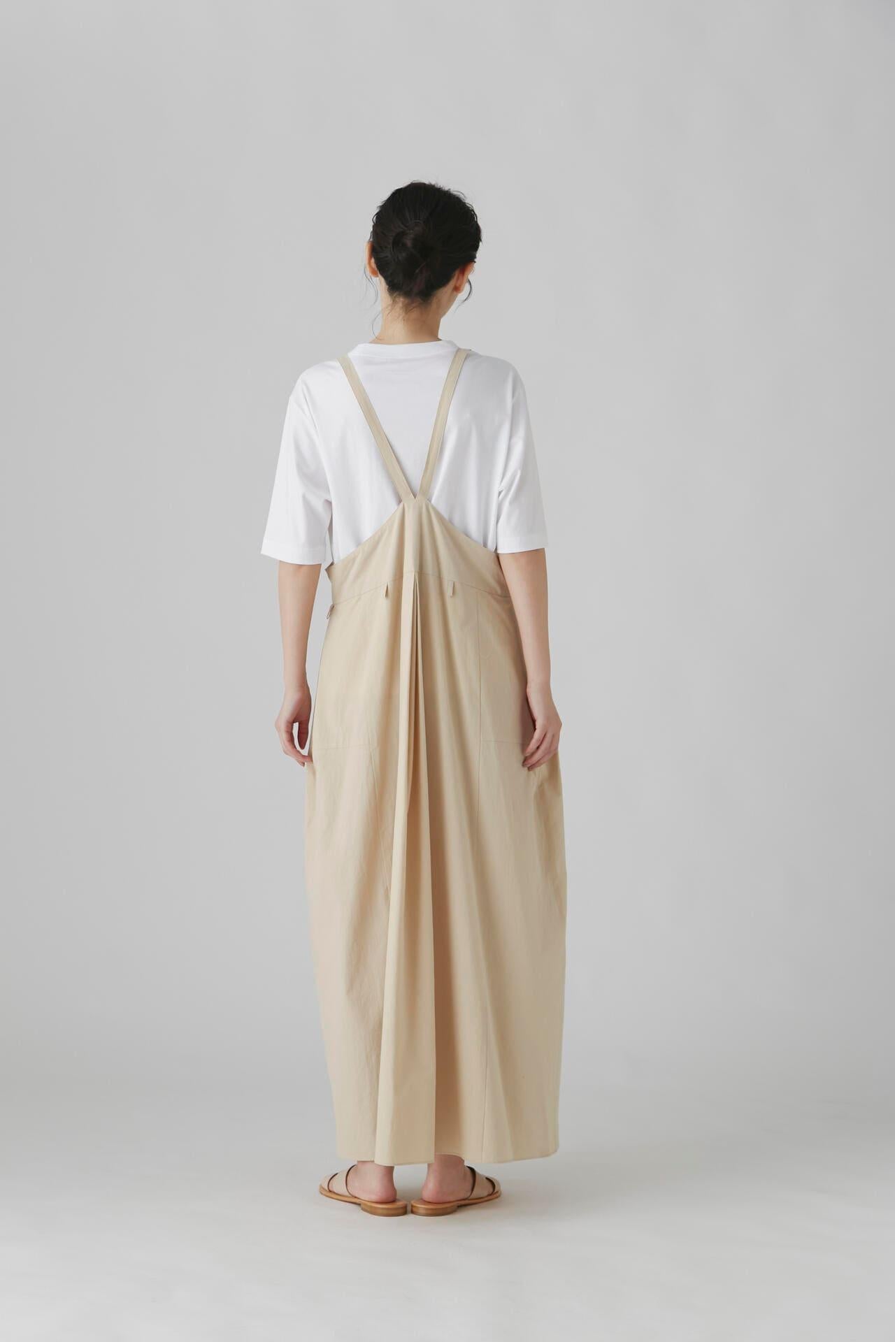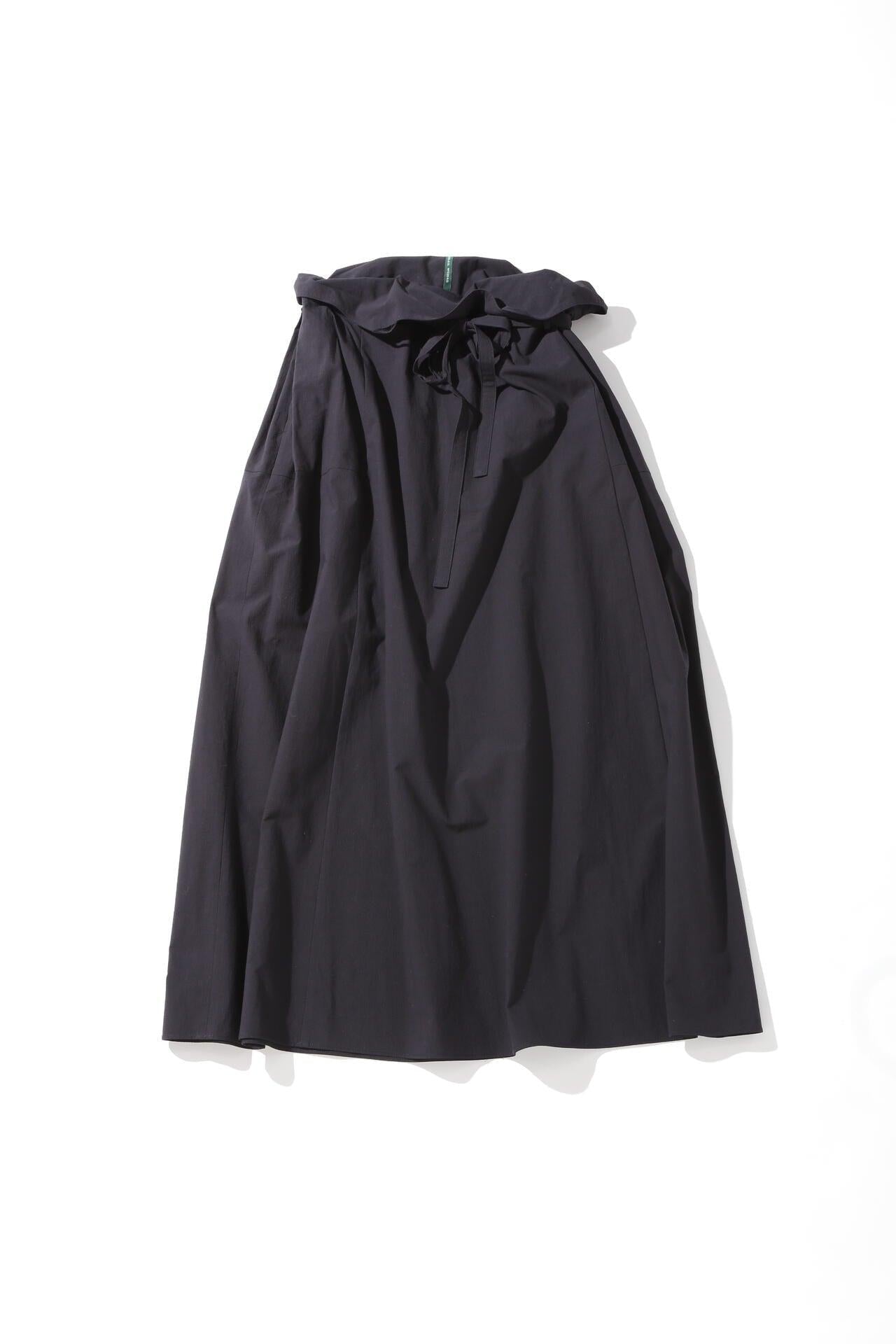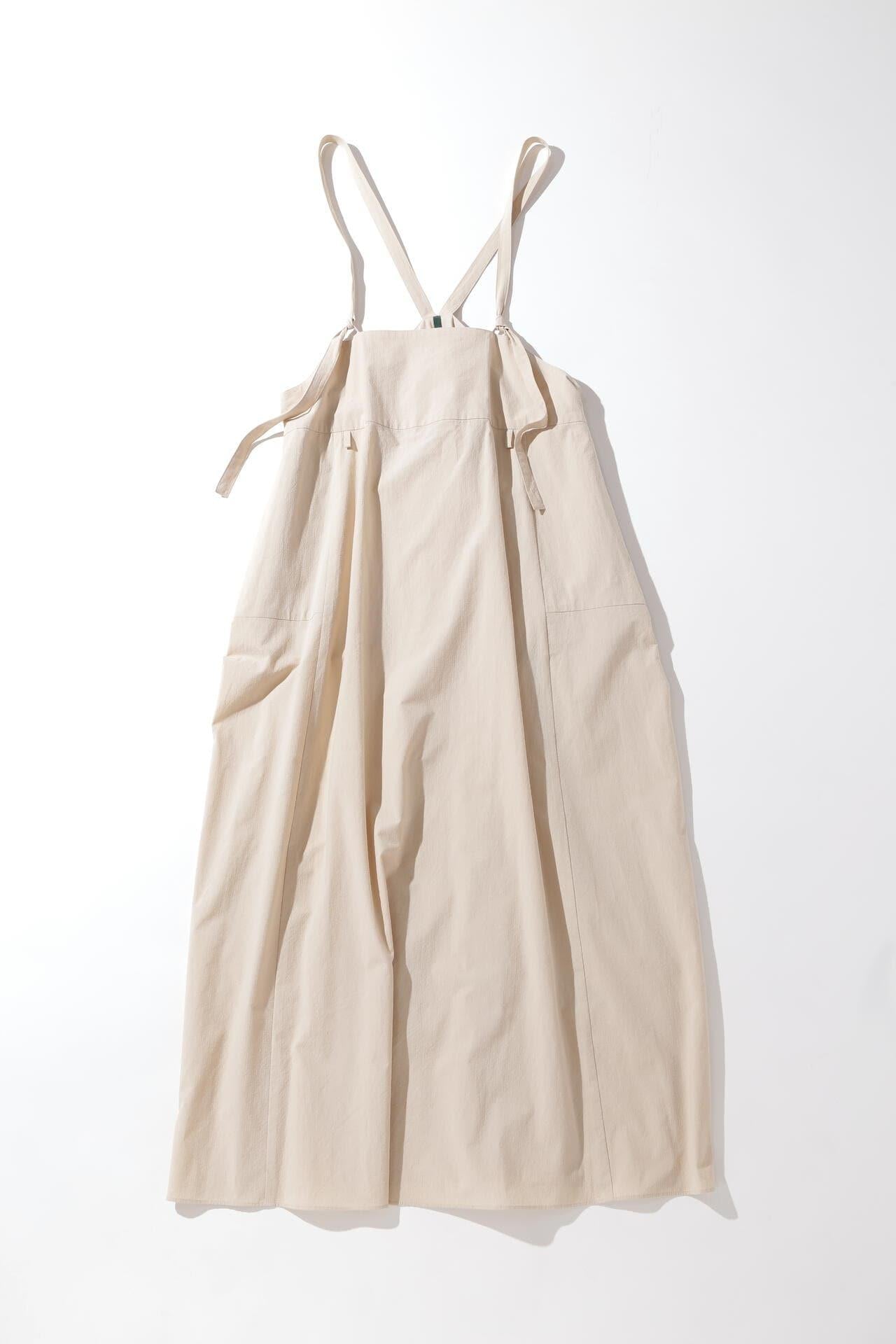 帶肩帶的半身裙,雙向設計,別有一番風味 [設計特色] 裙襬寬大的跳線裙,肩帶與裙襬相連。褶襉的細節設計使其更顯成熟,長度可根據腰帶的系法進行調整。肩帶可以從後面穿過腰帶環系在前面,而裙子則可以通過折回胸衣部分變成長裙。秋冬季還可搭配針織衫。它是一款可長期穿著的單品,不受季節限制。面料是由超長有機棉製成的表面凹凸不平的撕裂面料。推薦座標] 暖季可搭配鏤空上衣,冷季可搭配針織衫。
