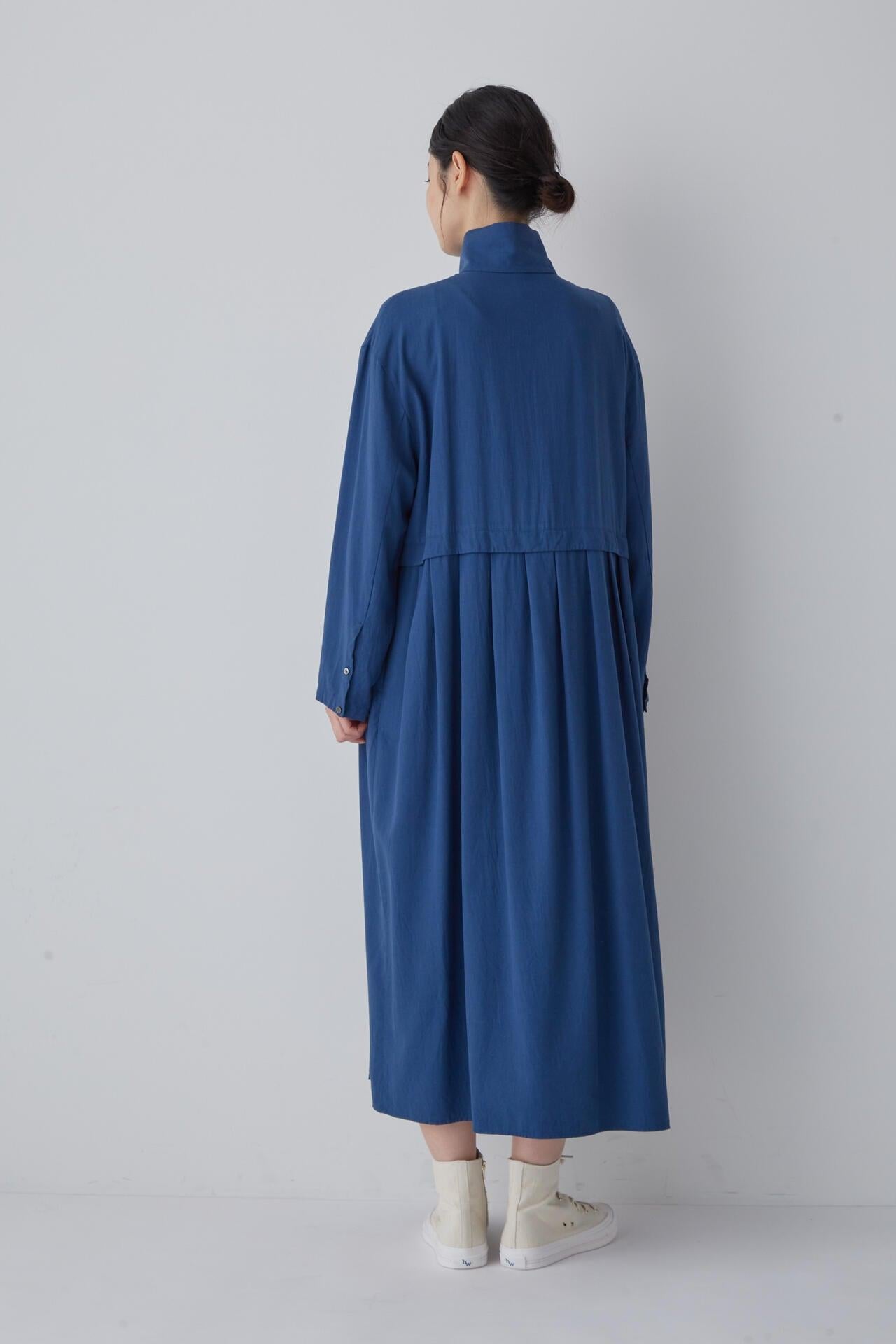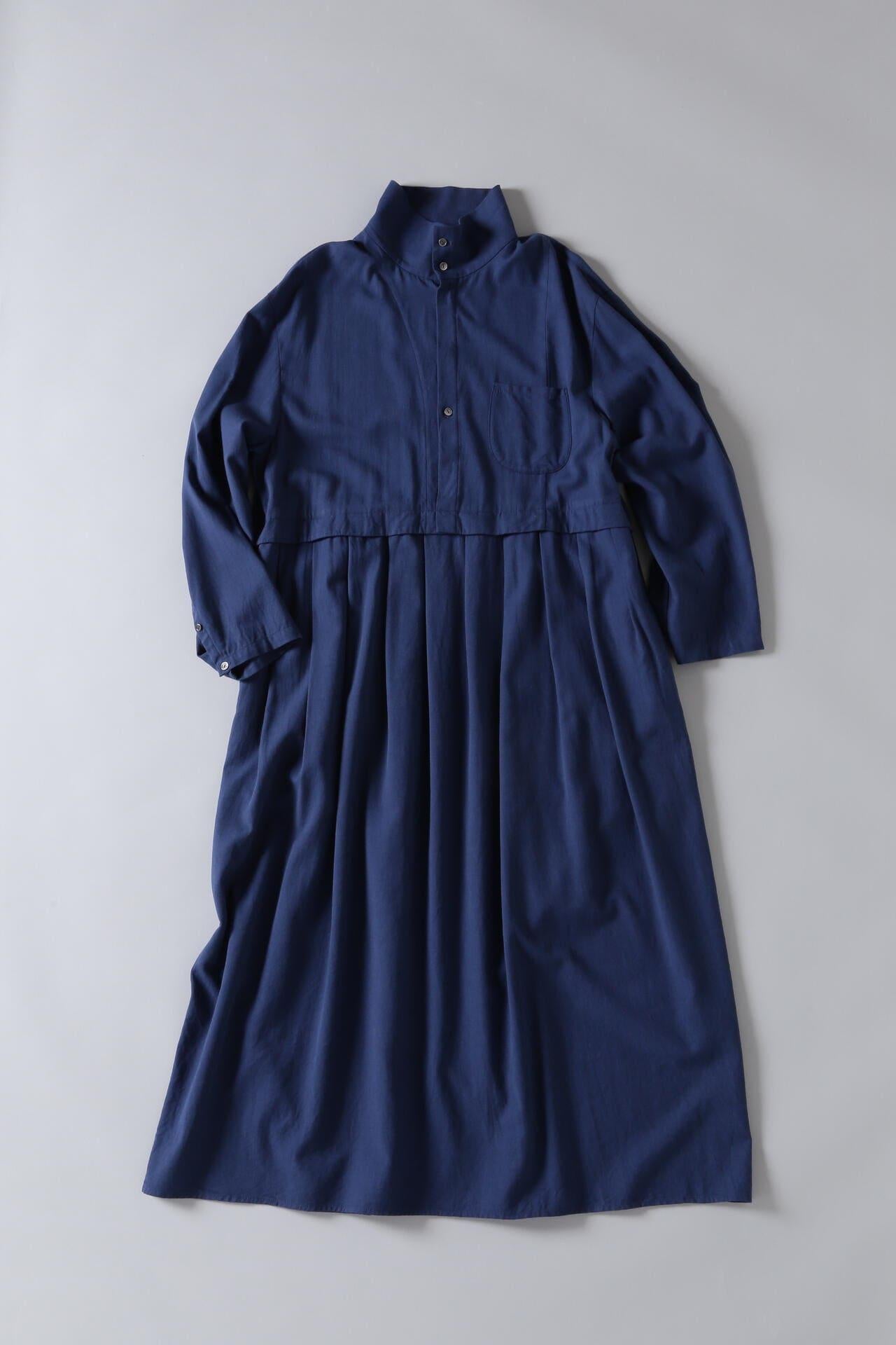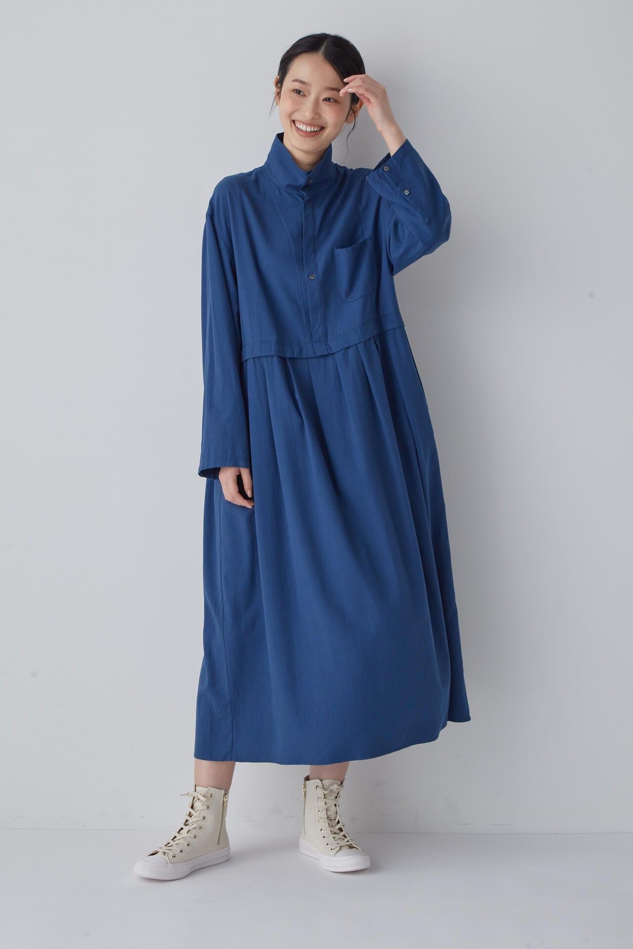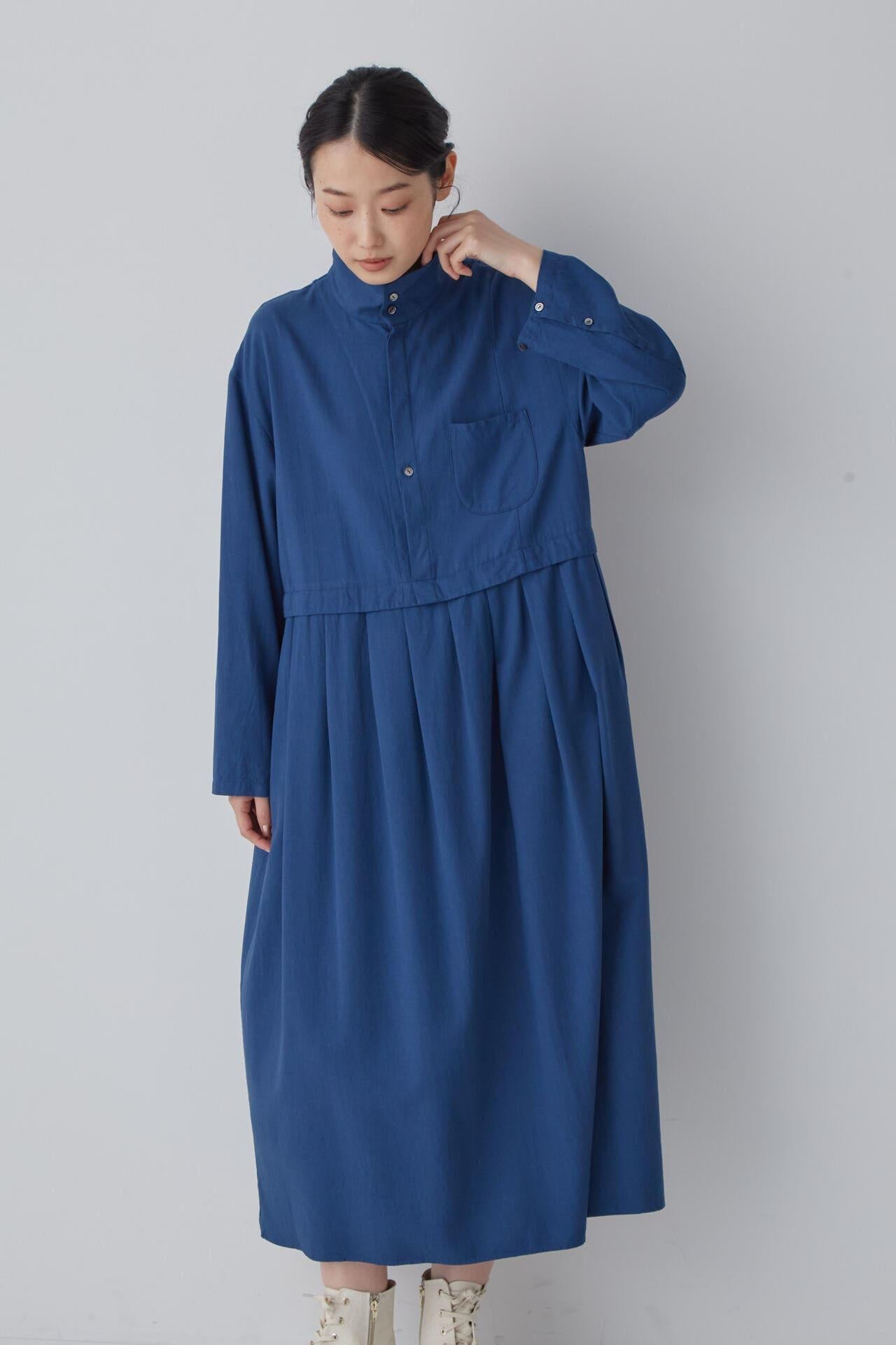 長款換裝連衣裙,通過領口的擺放變換表情 [設計要點] 高領是這款連衣裙的主要特點。您可以打開衣領的一粒紐扣,摺疊領尖,或者打開兩粒紐扣,像衣領一樣露出來,享受表情變化的樂趣。腰部可以調整到更高的位置,以提升您的氣質。柔軟的斜紋面料由有機棉和人造絲製成,染色時使用一份洋甘菊染成黃色,一份原木植物染料染成藏青色。推薦搭配】可單獨穿著,也可搭配長褲和馬甲。