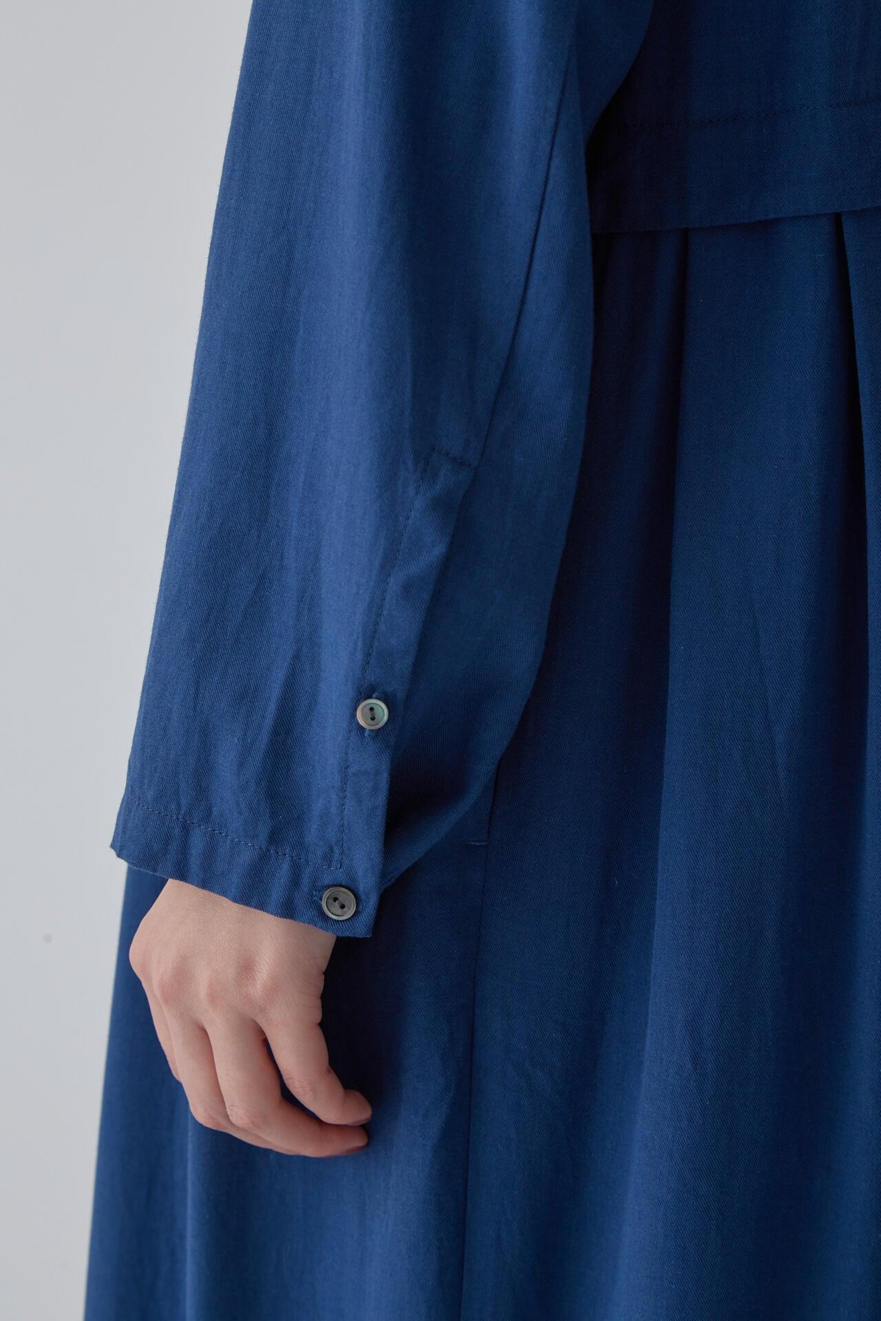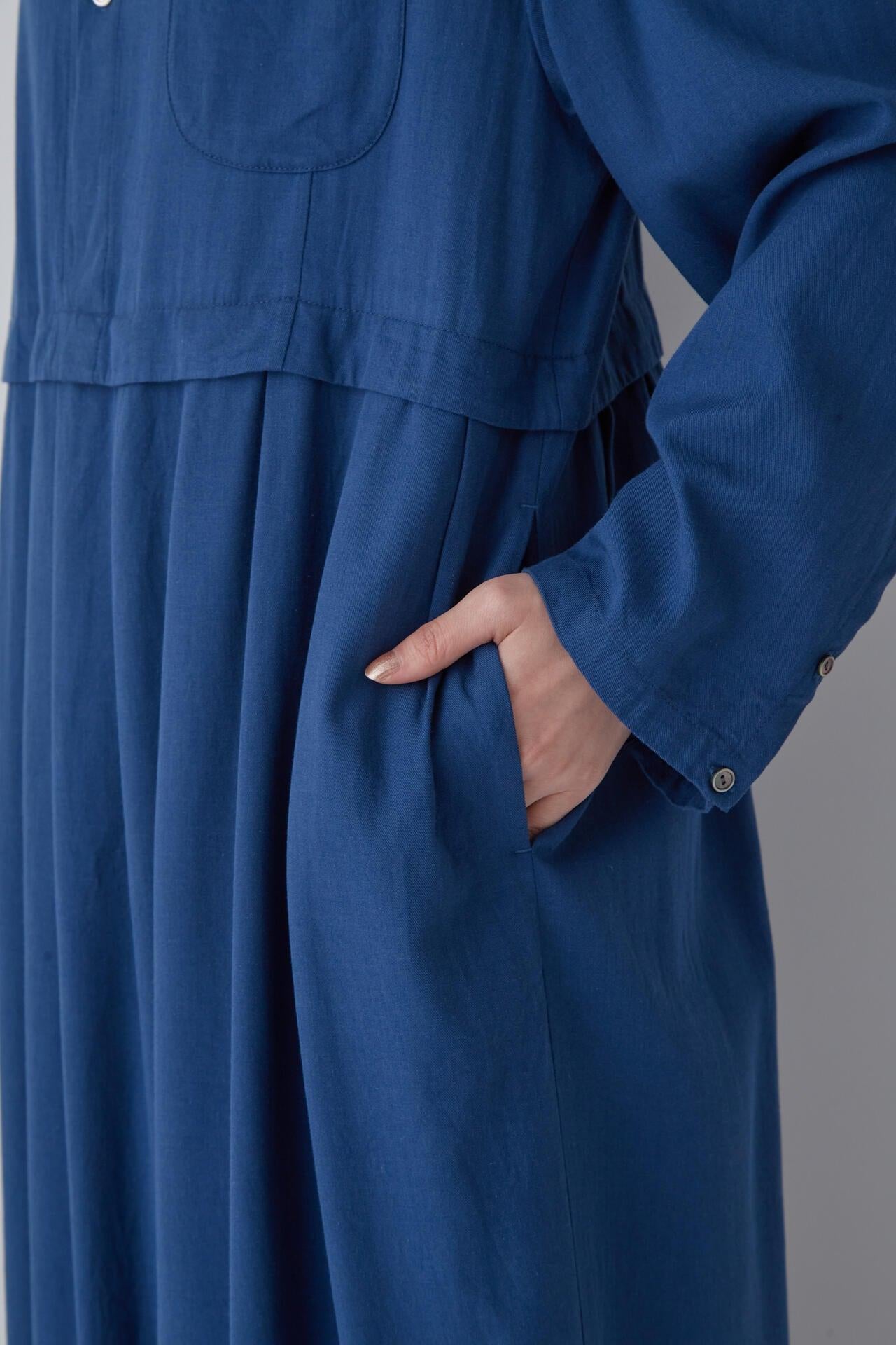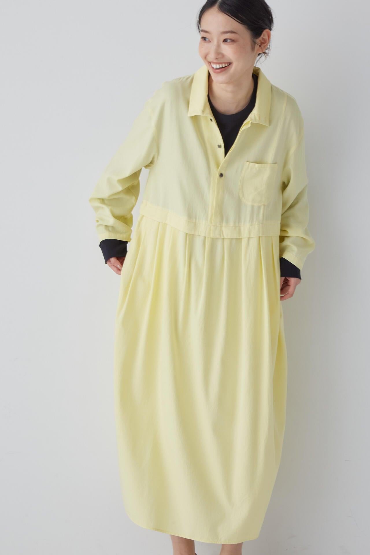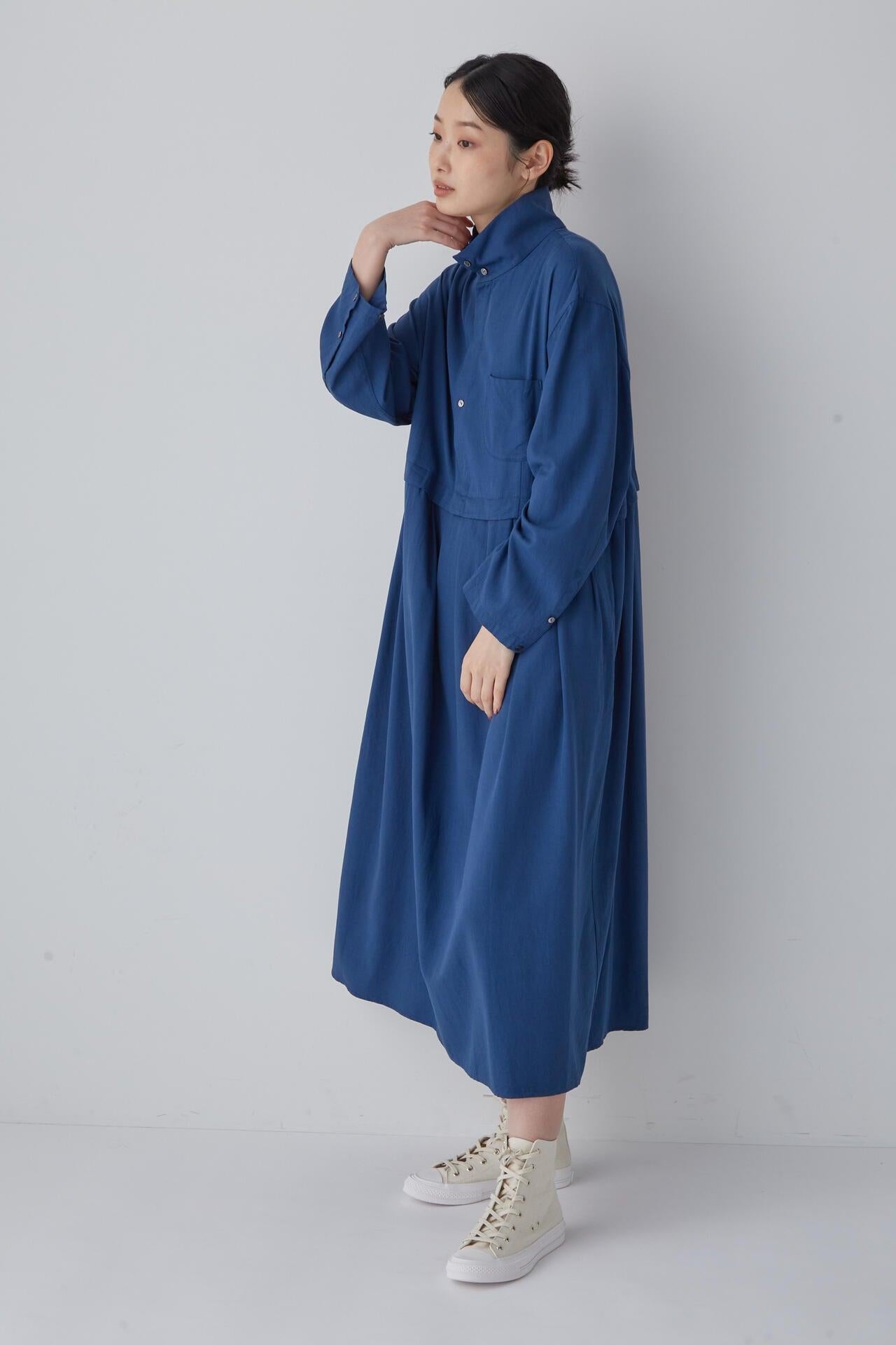 長款換裝連衣裙,通過領口的擺放變換表情 [設計要點] 高領是這款連衣裙的主要特點。您可以打開衣領的一粒紐扣,摺疊領尖,或者打開兩粒紐扣,像衣領一樣露出來,享受表情變化的樂趣。腰部可以調整到更高的位置,以提升您的氣質。柔軟的斜紋面料由有機棉和人造絲製成,染色時使用一份洋甘菊染成黃色,一份原木植物染料染成藏青色。推薦搭配】可單獨穿著,也可搭配長褲和馬甲。