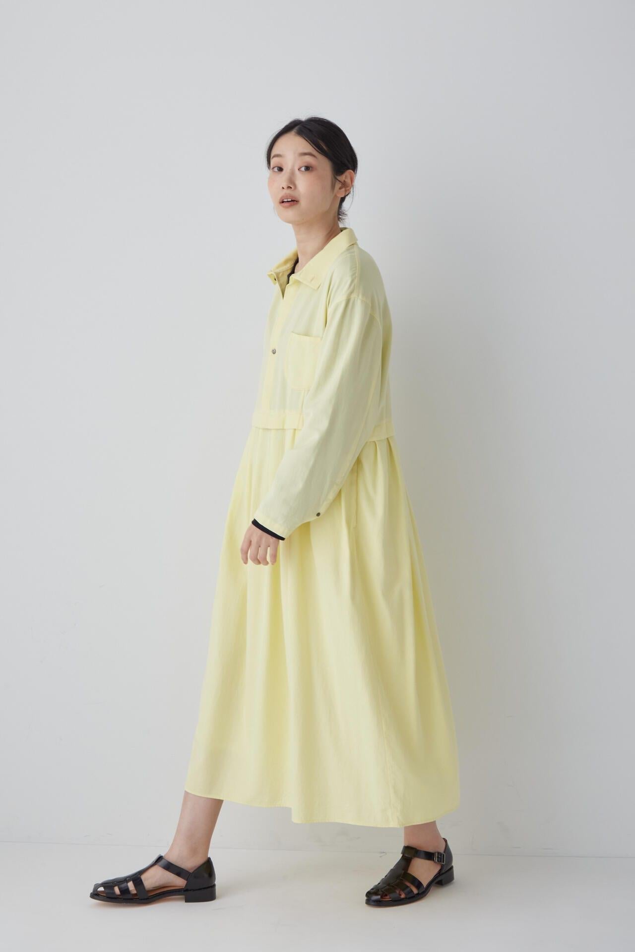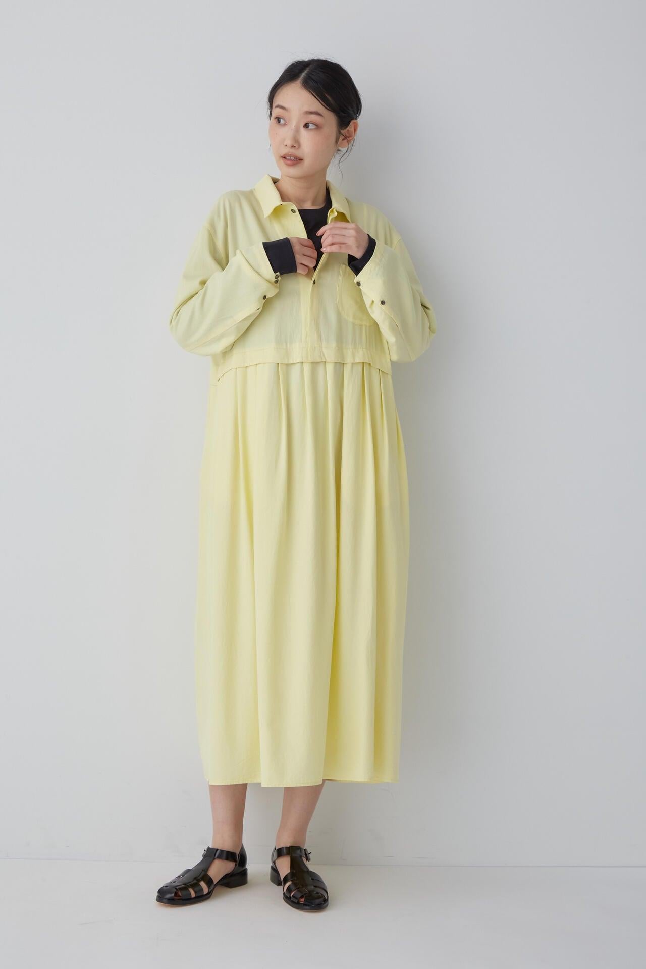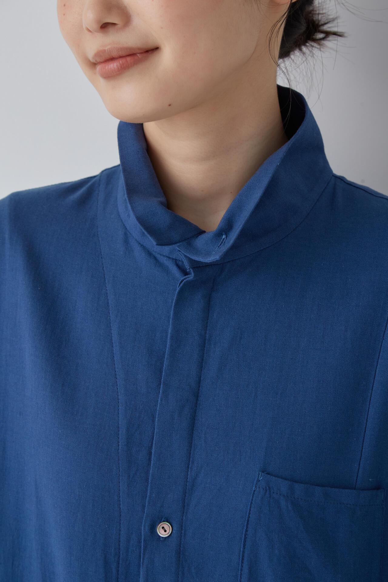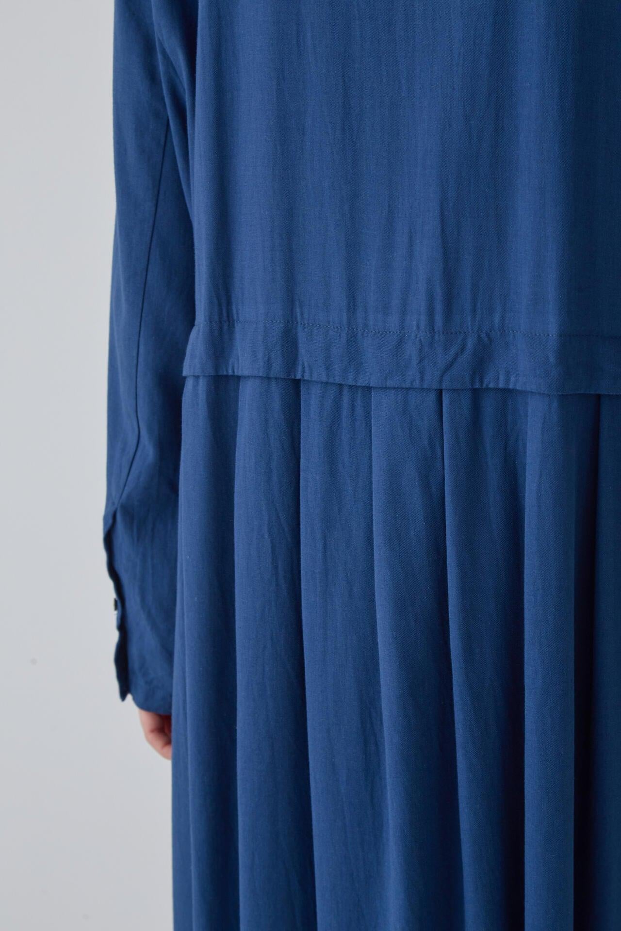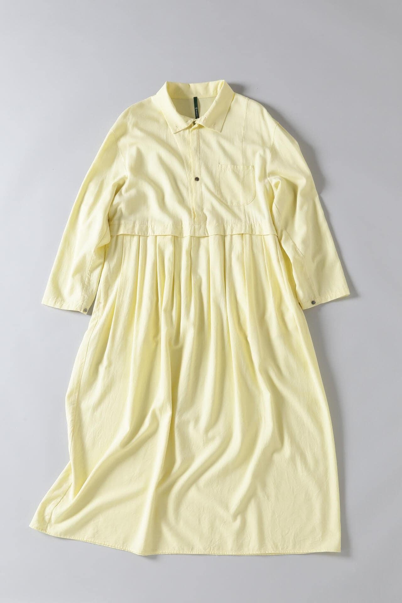 長款換裝連衣裙,通過領口的擺放變換表情 [設計要點] 高領是這款連衣裙的主要特點。您可以打開衣領的一粒紐扣,摺疊領尖,或者打開兩粒紐扣,像衣領一樣露出來,享受表情變化的樂趣。腰部可以調整到更高的位置,以提升您的氣質。柔軟的斜紋面料由有機棉和人造絲製成,染色時使用一份洋甘菊染成黃色,一份原木植物染料染成藏青色。推薦搭配】可單獨穿著,也可搭配長褲和馬甲。