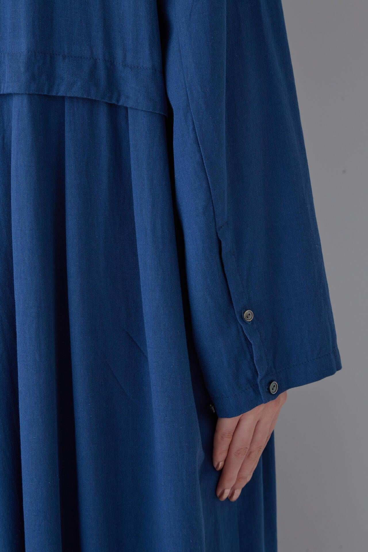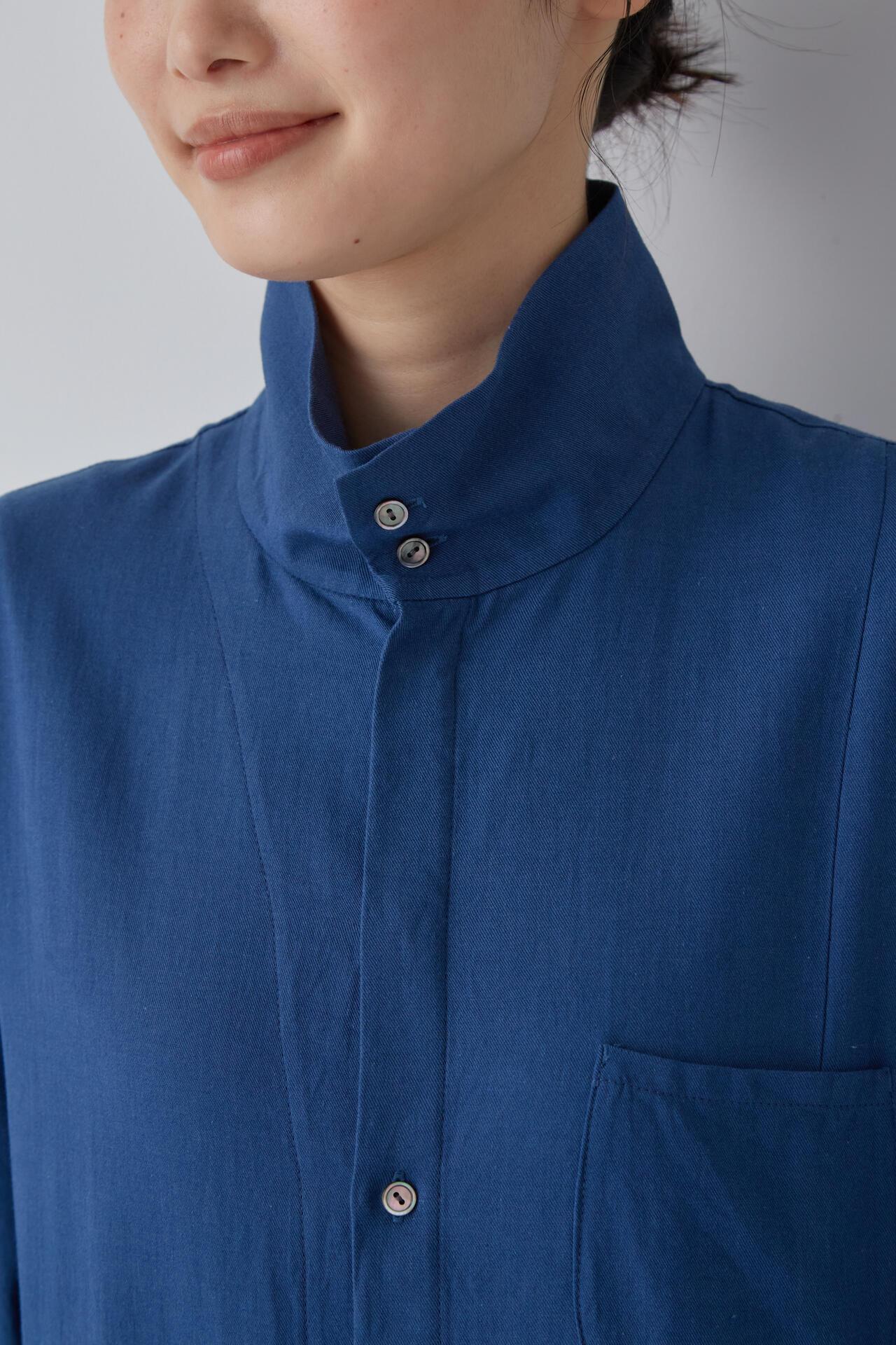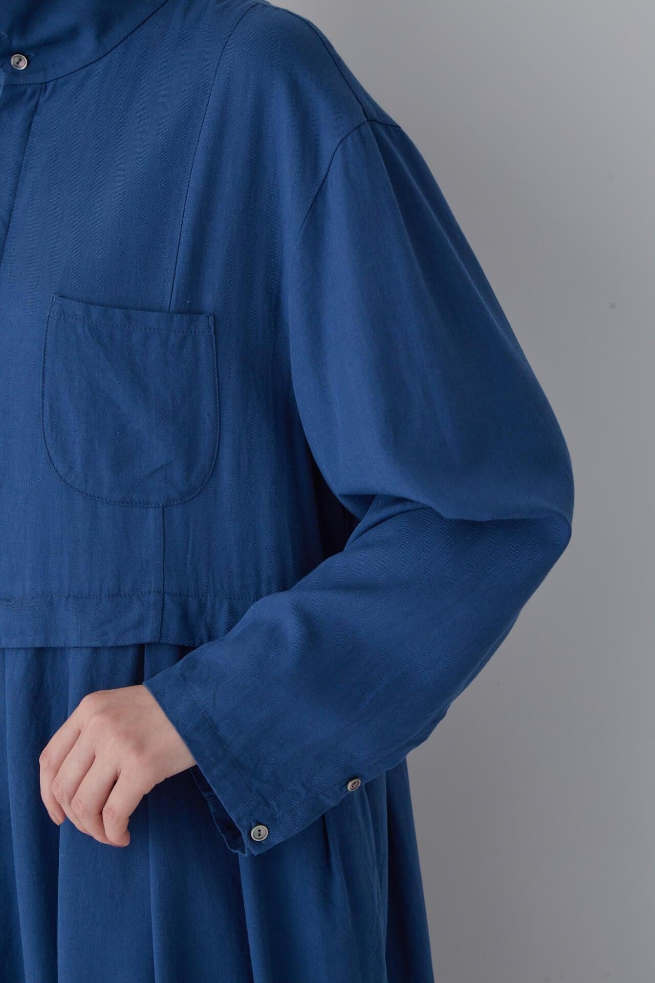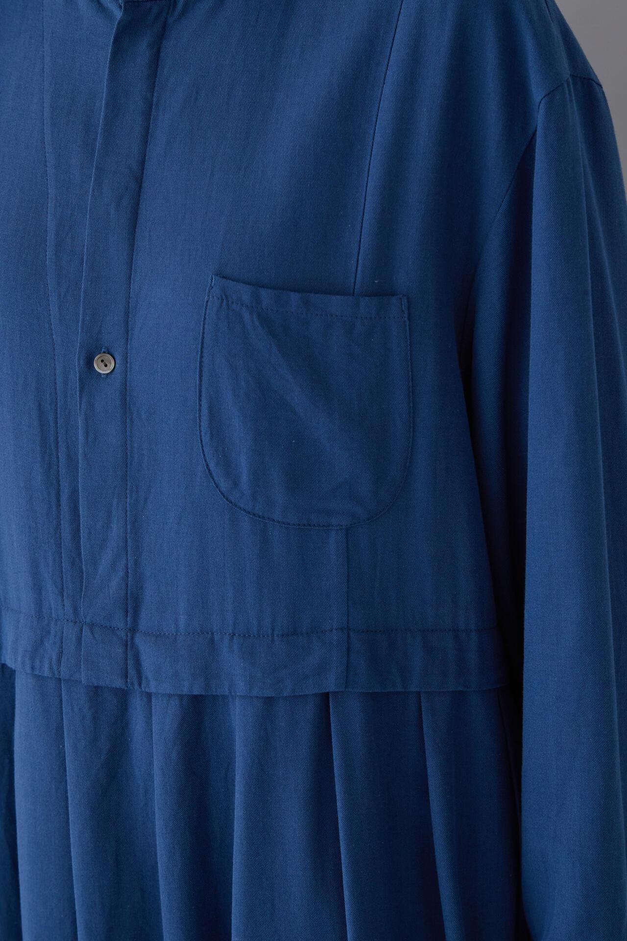 長款換裝連衣裙,通過領口的擺放變換表情 [設計要點] 高領是這款連衣裙的主要特點。您可以打開衣領的一粒紐扣,摺疊領尖,或者打開兩粒紐扣,像衣領一樣露出來,享受表情變化的樂趣。腰部可以調整到更高的位置,以提升您的氣質。柔軟的斜紋面料由有機棉和人造絲製成,染色時使用一份洋甘菊染成黃色,一份原木植物染料染成藏青色。推薦搭配】可單獨穿著,也可搭配長褲和馬甲。