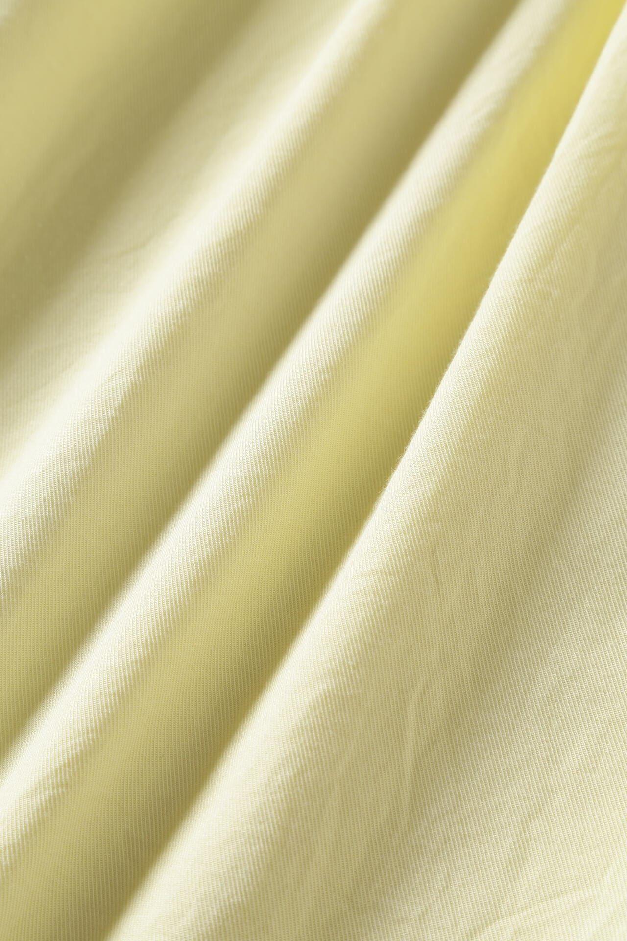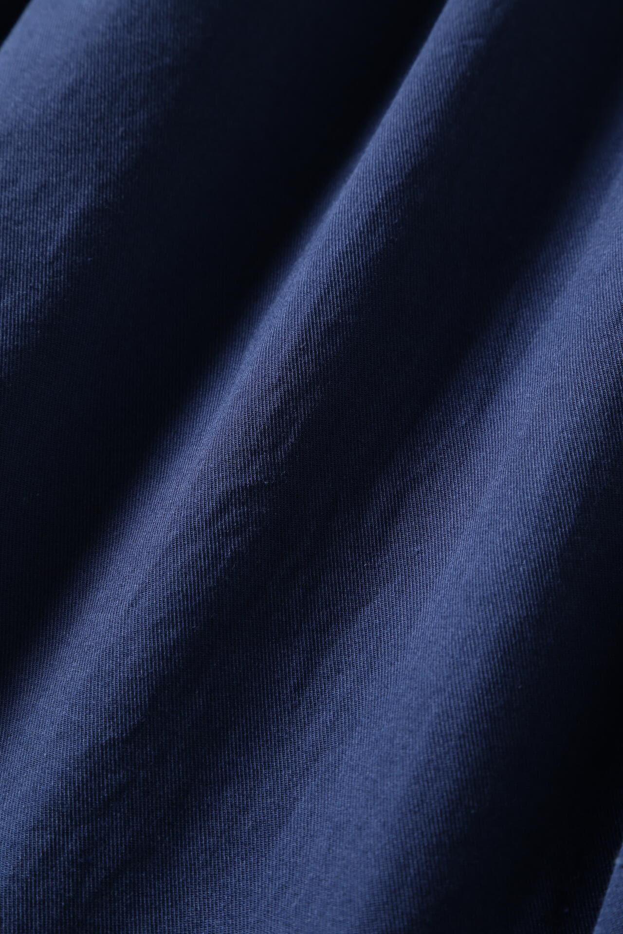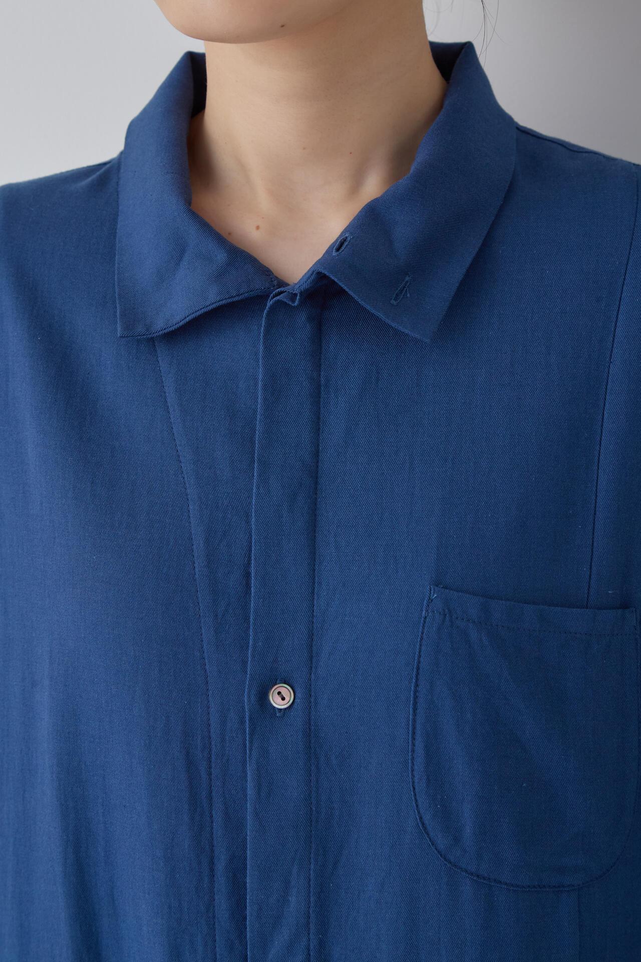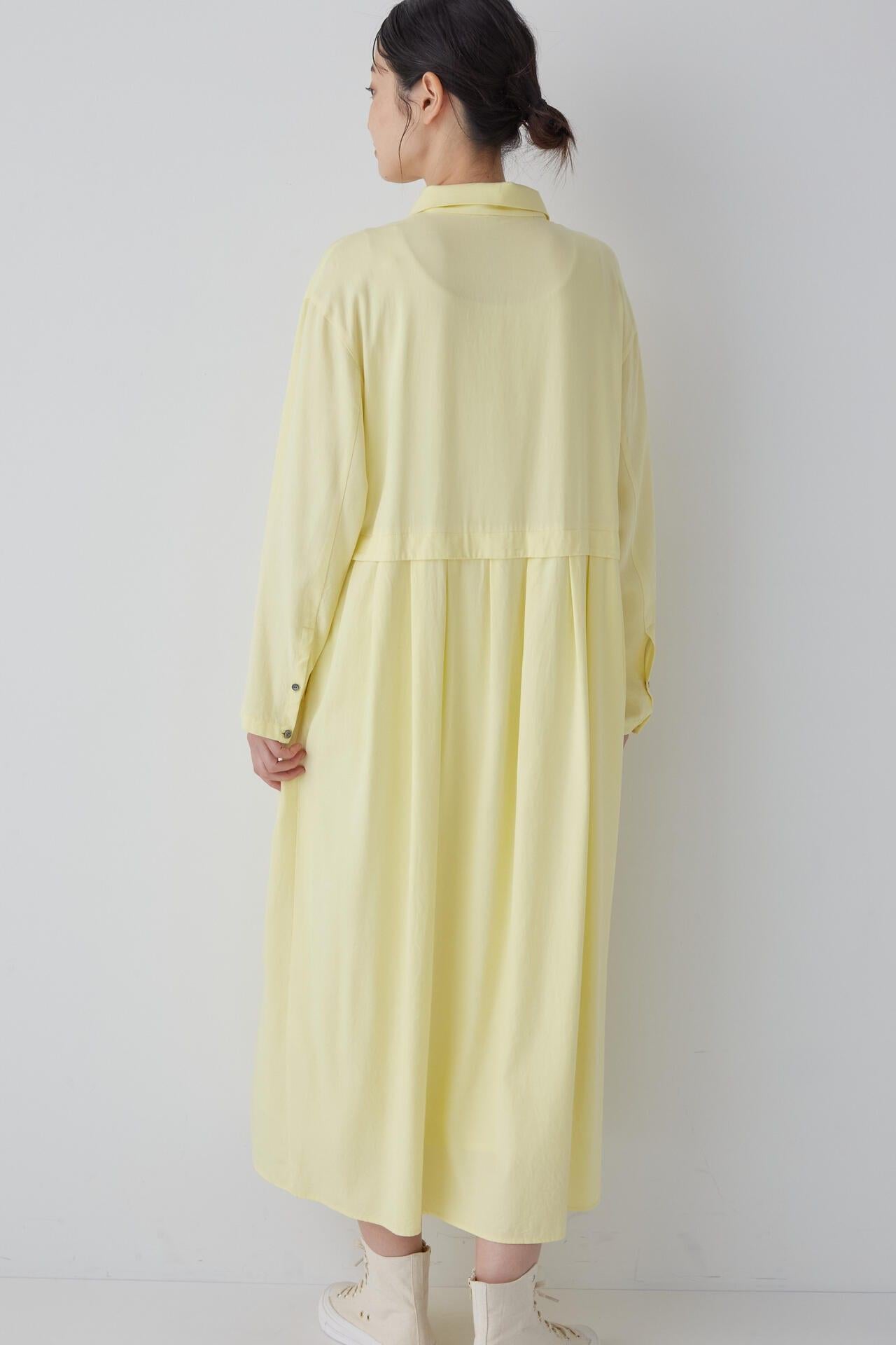 長款換裝連衣裙,通過領口的擺放變換表情 [設計要點] 高領是這款連衣裙的主要特點。您可以打開衣領的一粒紐扣,摺疊領尖,或者打開兩粒紐扣,像衣領一樣露出來,享受表情變化的樂趣。腰部可以調整到更高的位置,以提升您的氣質。柔軟的斜紋面料由有機棉和人造絲製成,染色時使用一份洋甘菊染成黃色,一份原木植物染料染成藏青色。推薦搭配】可單獨穿著,也可搭配長褲和馬甲。