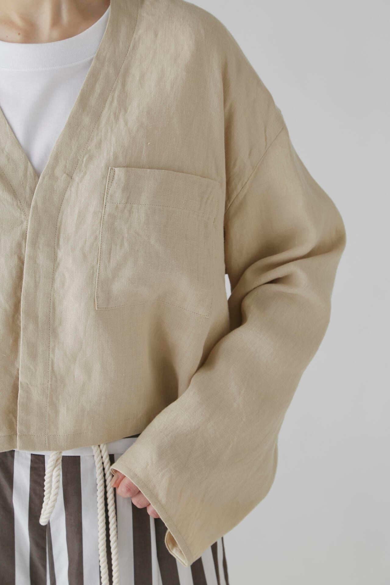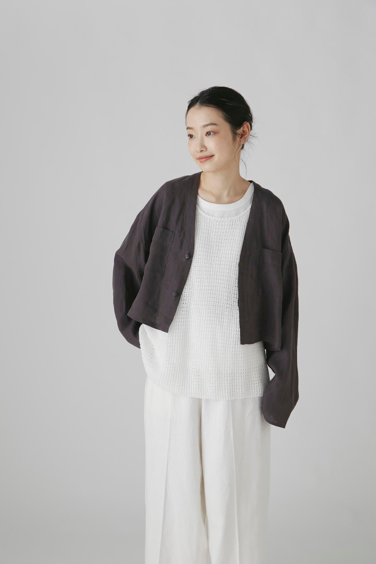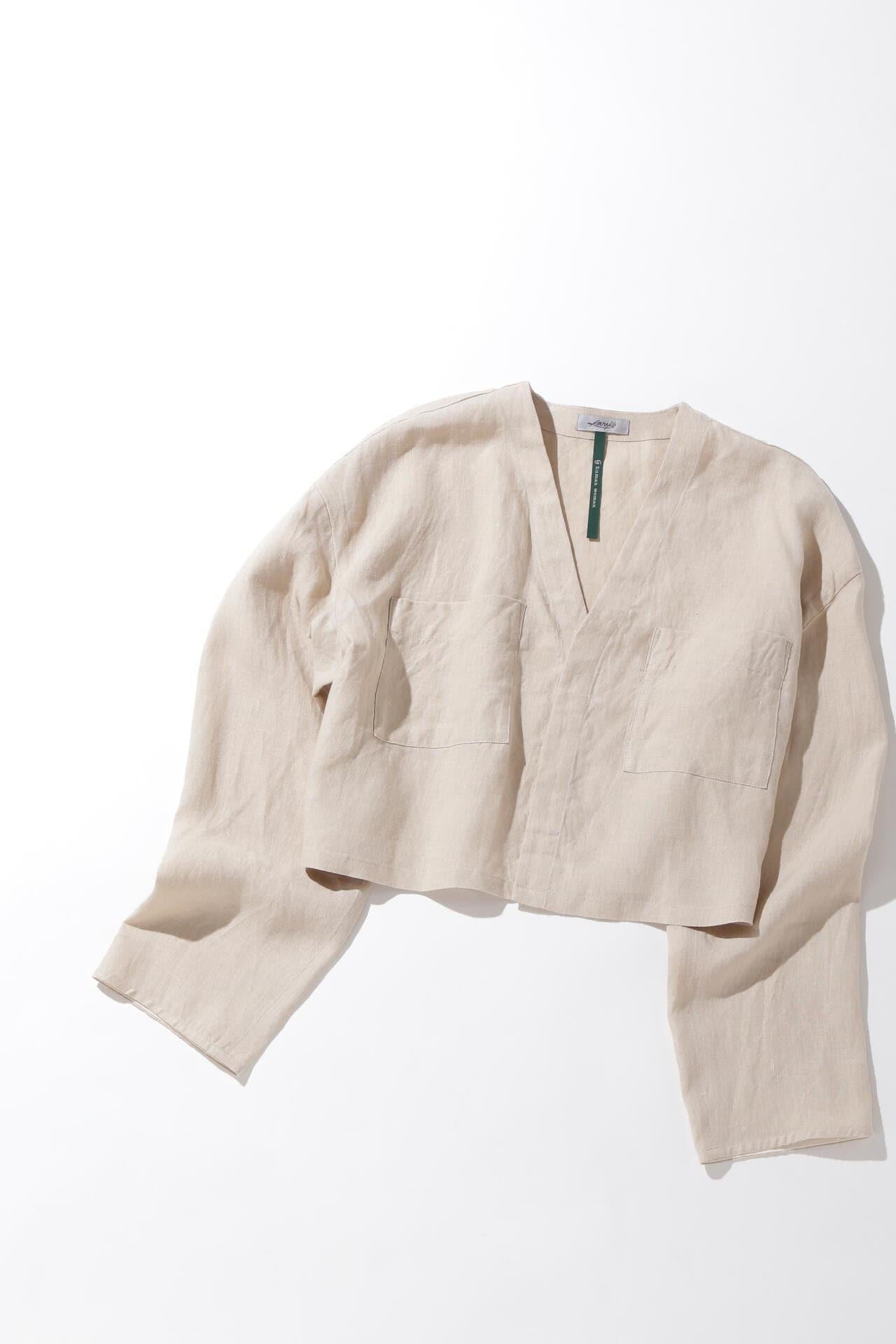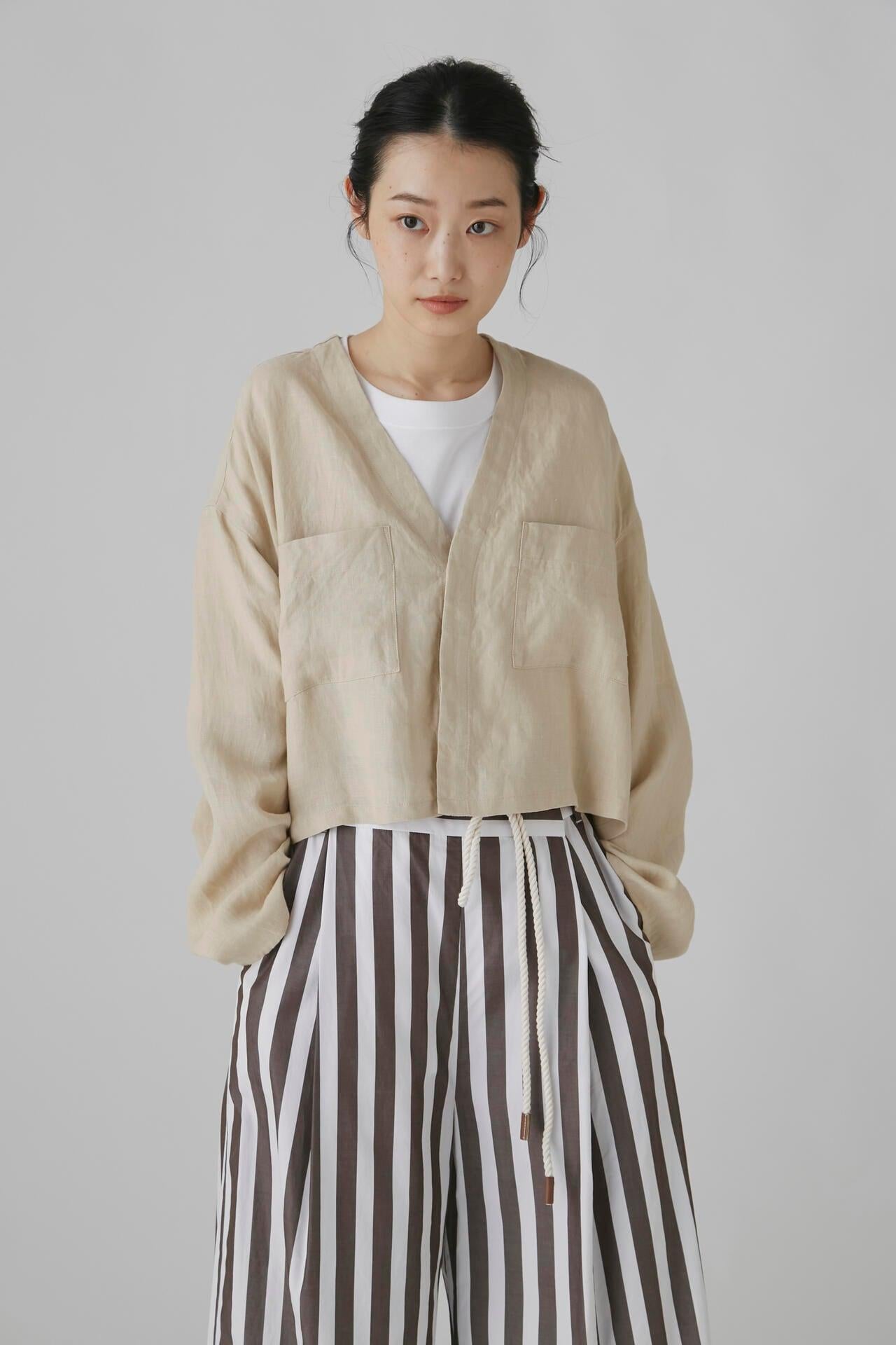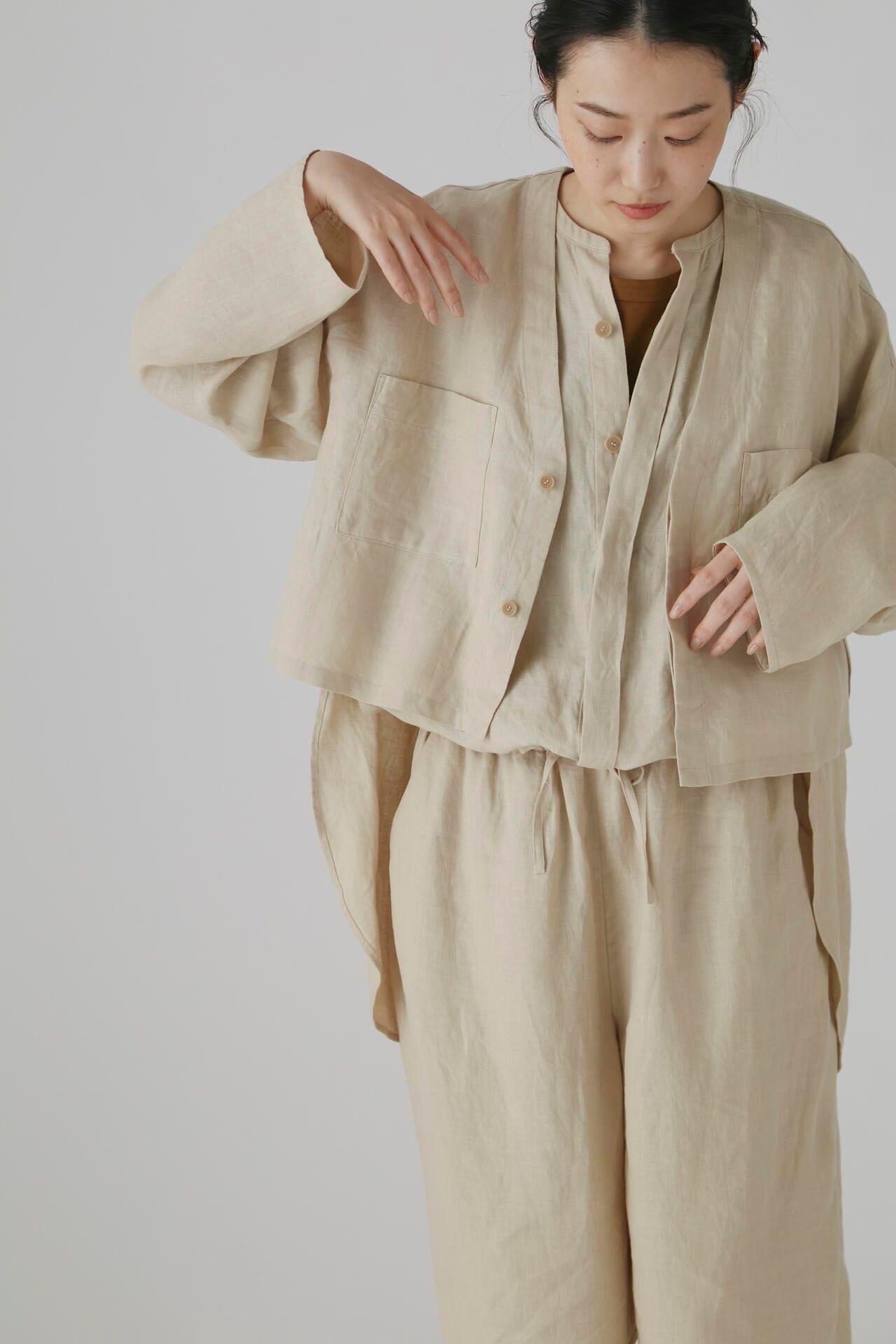 這款開衫式上衣是與模特加奈子合作製作的。寬鬆的版型、今年流行的短款長度以及胸前的口袋都是它的亮點。長袖袖口可以摺疊起來,營造出舒適的感覺,也可以拉長以防曬傷。面料透氣,穿著涼爽。採用大麻坎布製成,給人一種不太休閒的感覺。大麻是一種環保材料,幾乎不需要殺蟲劑或除草劑,這是大麻的特性。建議搭配] 可與同材質的連身褲搭配。