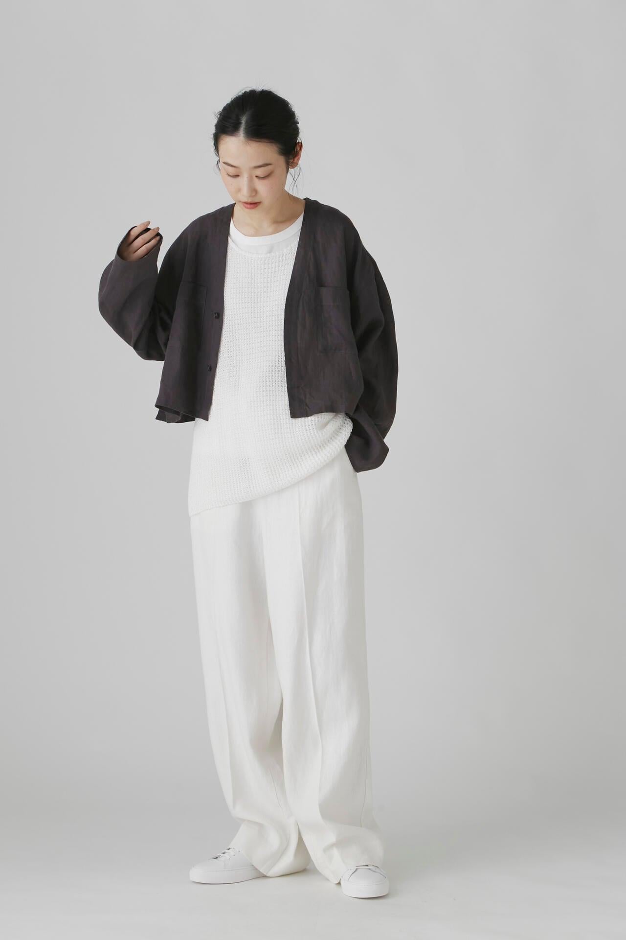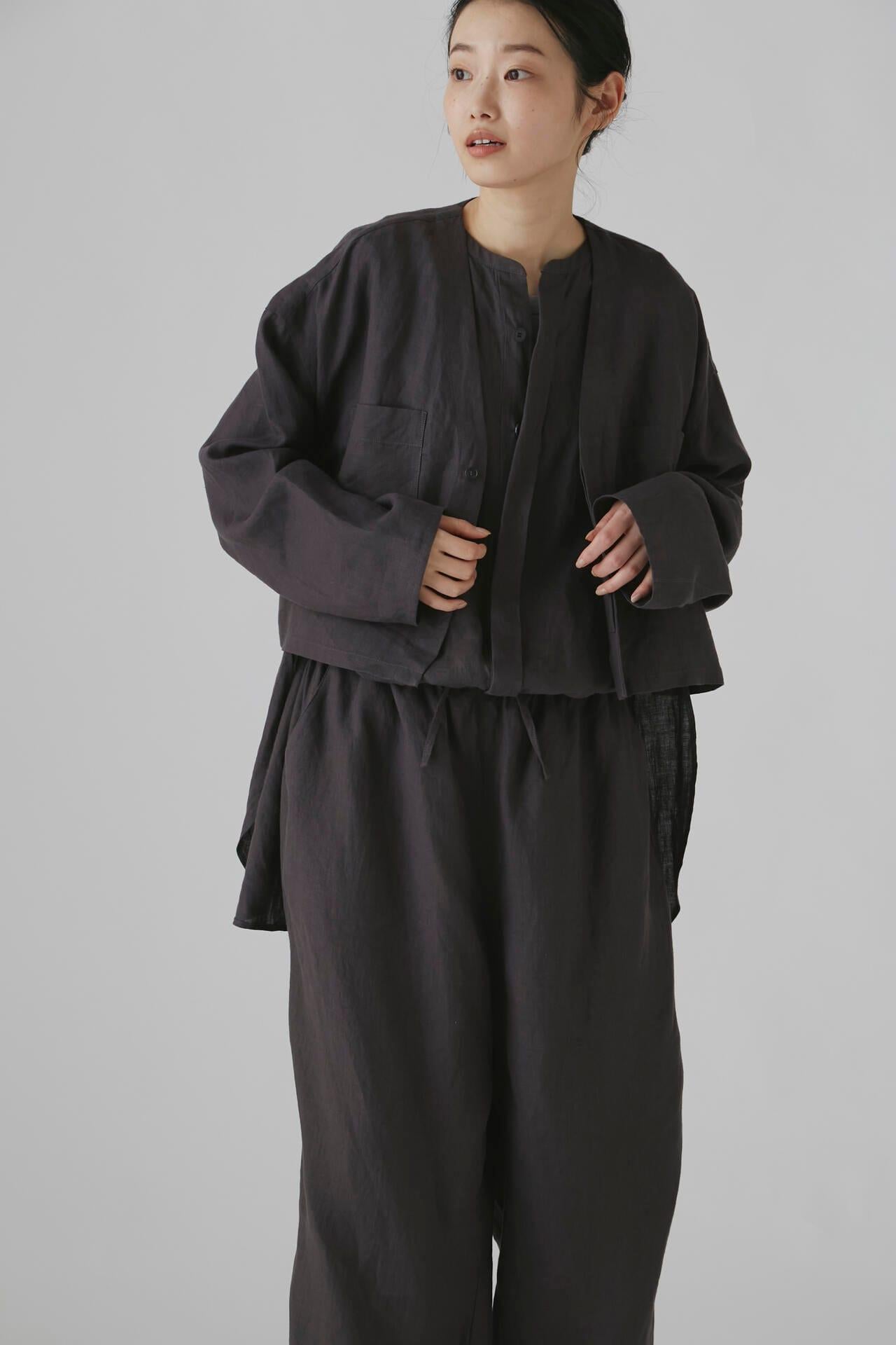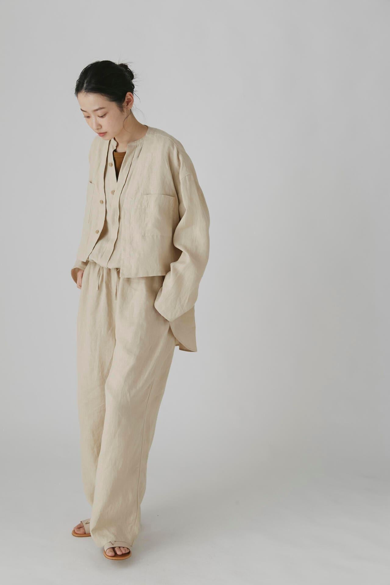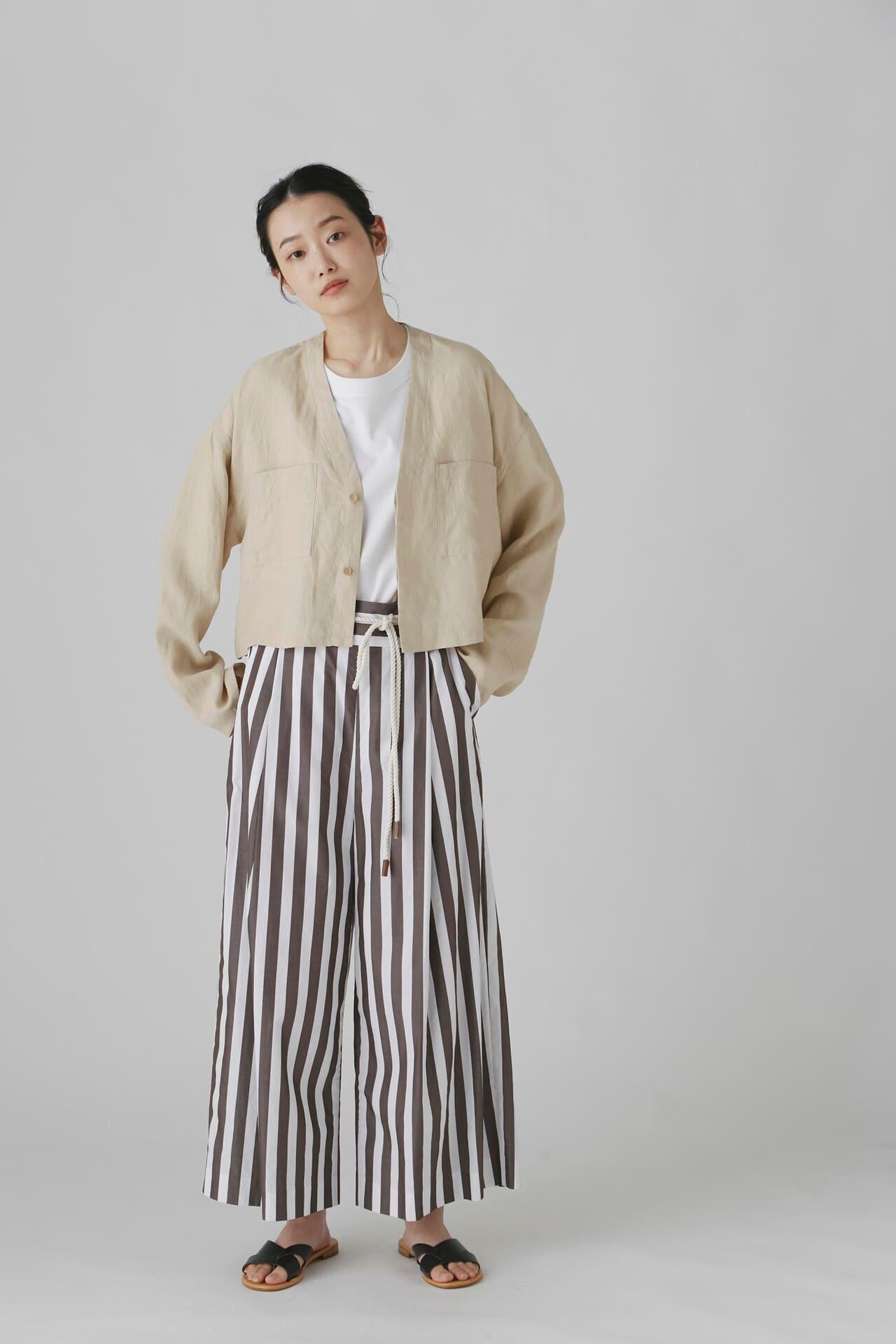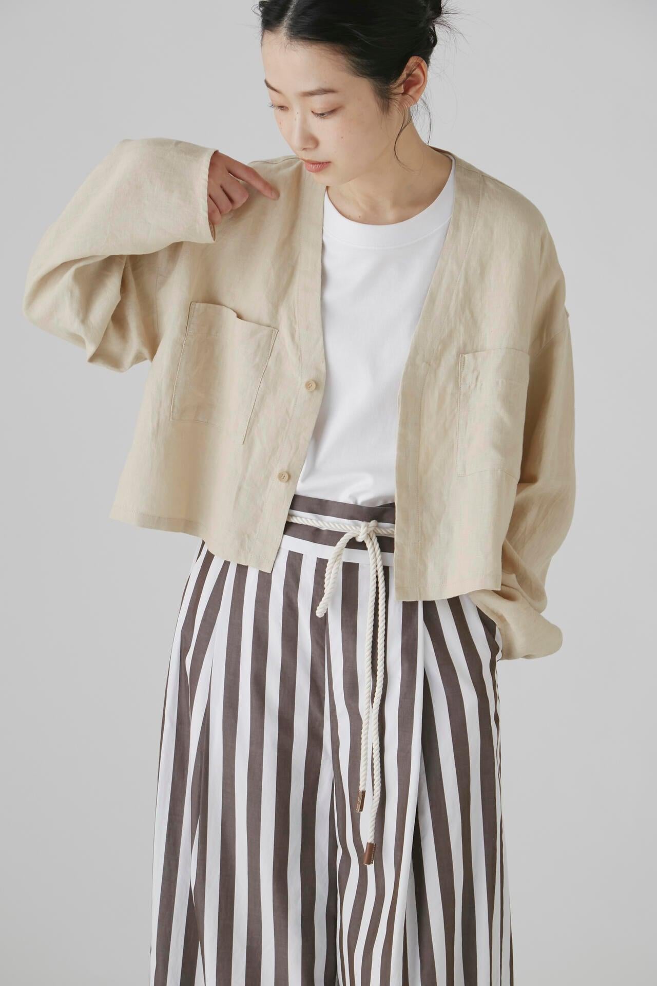 這款開衫式上衣是與模特加奈子合作製作的。寬鬆的版型、今年流行的短款長度以及胸前的口袋都是它的亮點。長袖袖口可以摺疊起來,營造出舒適的感覺,也可以拉長以防曬傷。面料透氣,穿著涼爽。採用大麻坎布製成,給人一種不太休閒的感覺。大麻是一種環保材料,幾乎不需要殺蟲劑或除草劑,這是大麻的特性。建議搭配] 可與同材質的連身褲搭配。