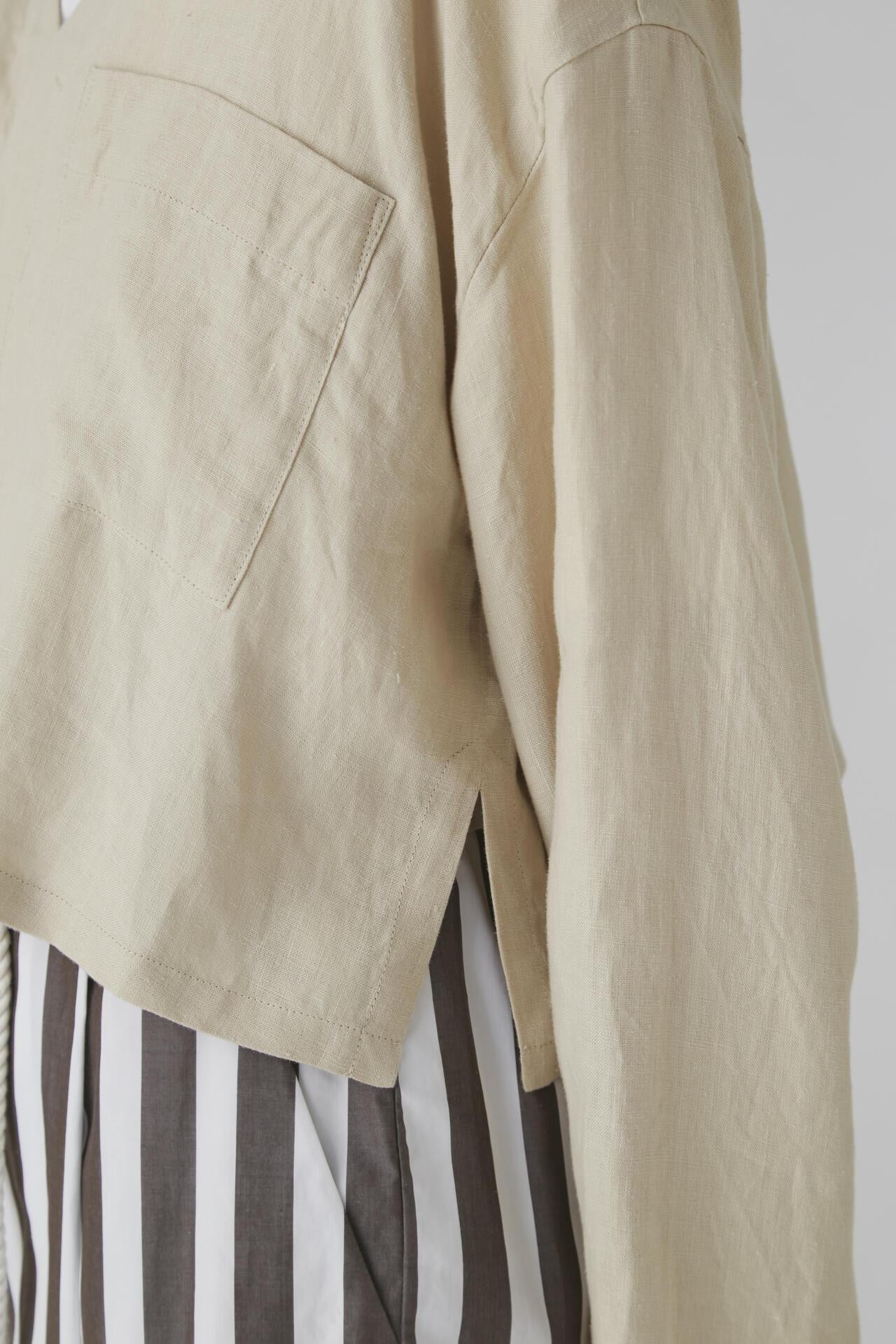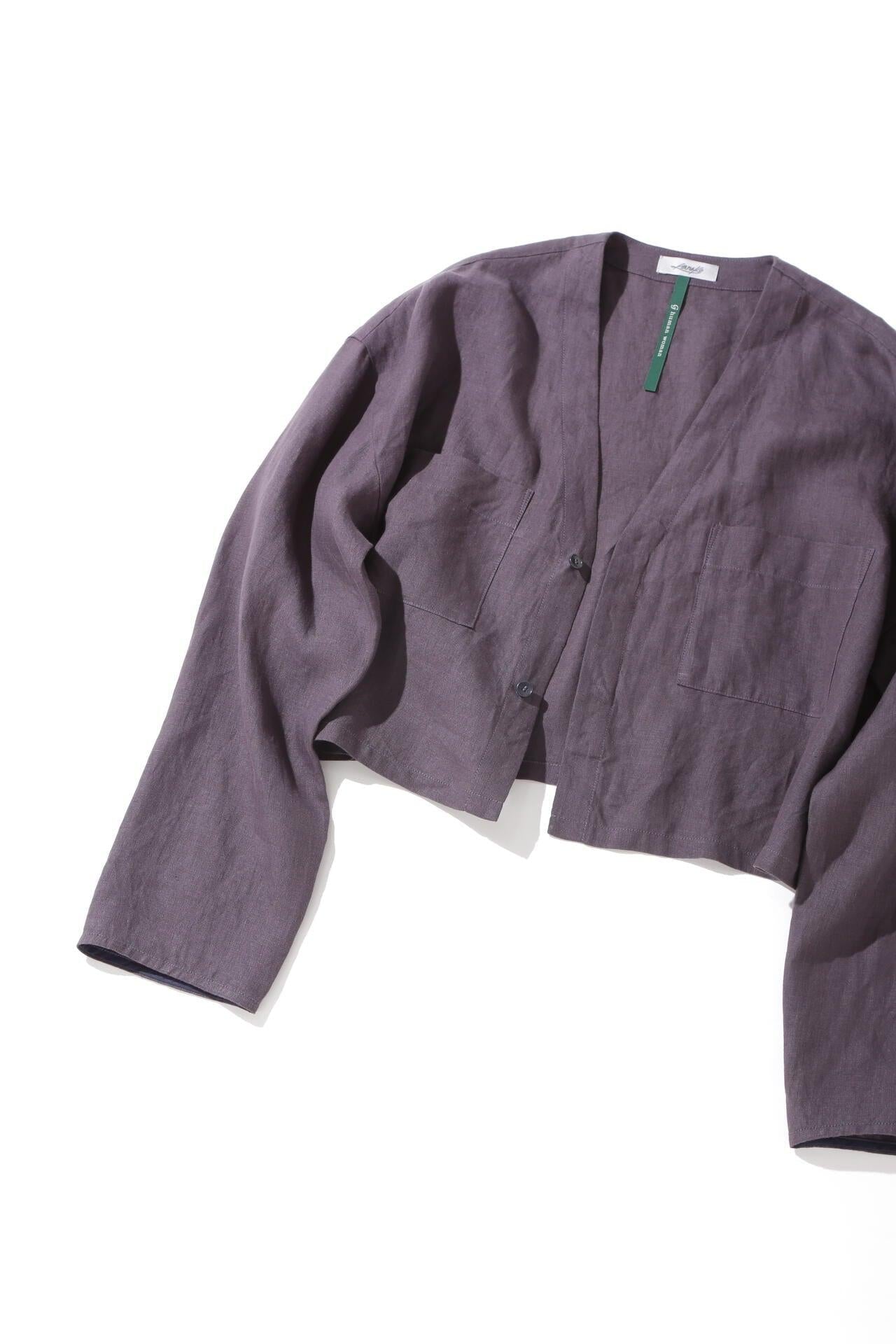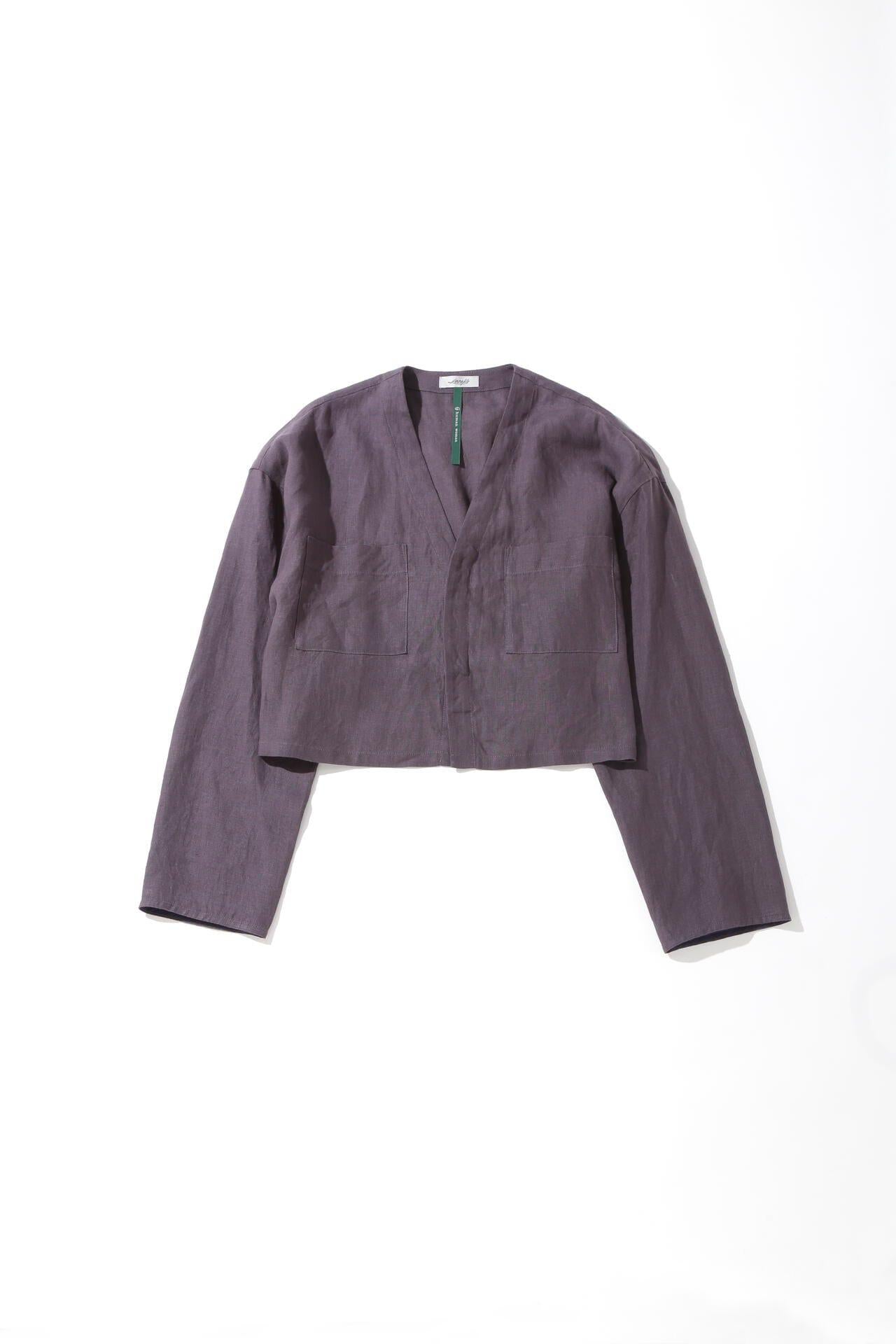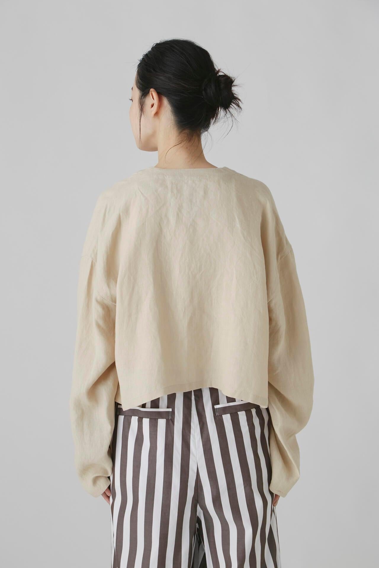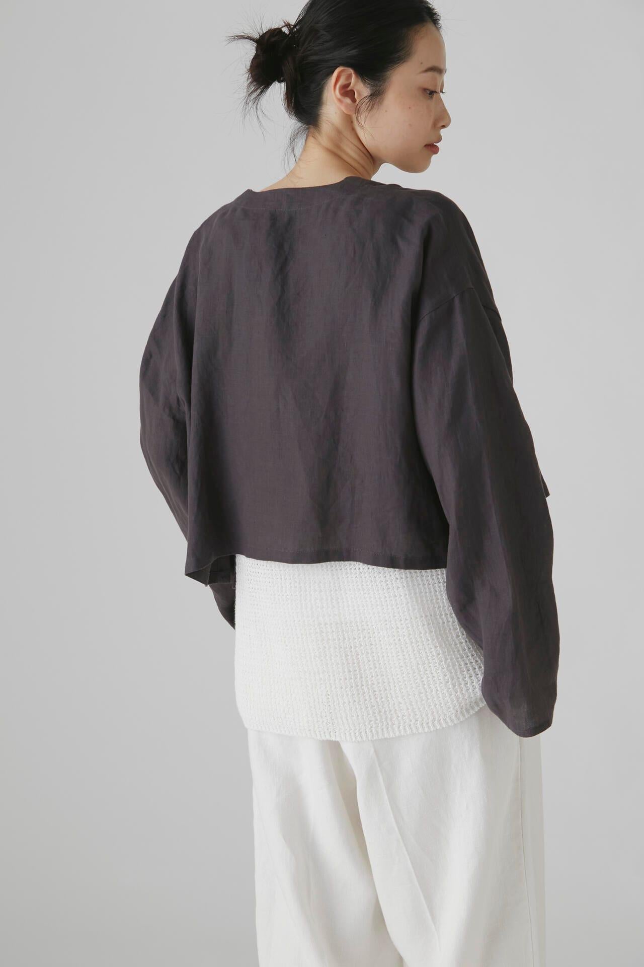 這款開衫式上衣是與模特加奈子合作製作的。寬鬆的版型、今年流行的短款長度以及胸前的口袋都是它的亮點。長袖袖口可以摺疊起來,營造出舒適的感覺,也可以拉長以防曬傷。面料透氣,穿著涼爽。採用大麻坎布製成,給人一種不太休閒的感覺。大麻是一種環保材料,幾乎不需要殺蟲劑或除草劑,這是大麻的特性。建議搭配] 可與同材質的連身褲搭配。