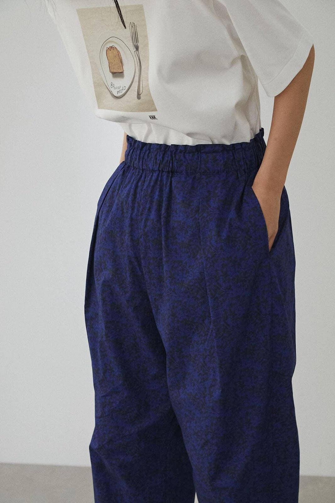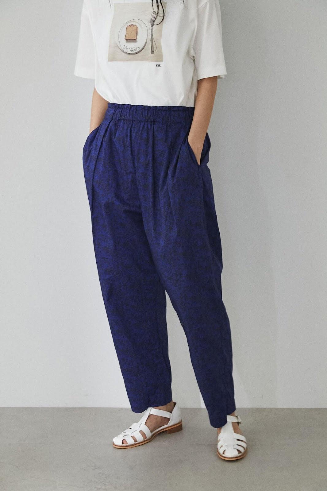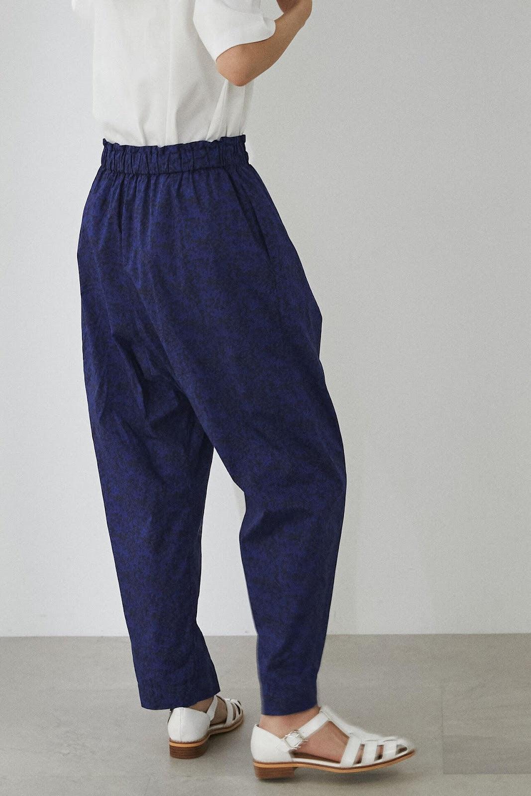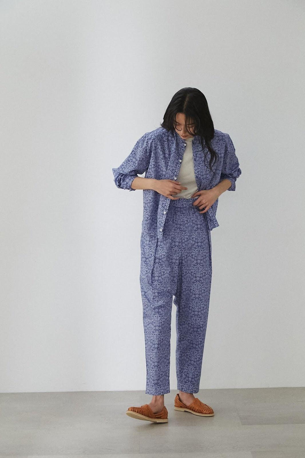 原色自由印花寬鬆長褲 [設計特色] 這款長褲採用自由印花,產品經染色後製成原色。自然的褶皺處理給人一種寬鬆的感覺。尺寸可通過腰部內側的繩子調節。褲子在產品染色過程中使用了部分植物原木染料。藍色的選擇是為了與每個印花相匹配。推薦搭配:與同材質的襯衫搭配時,上衣可加進套裝中,打造出類似連體褲的造型。