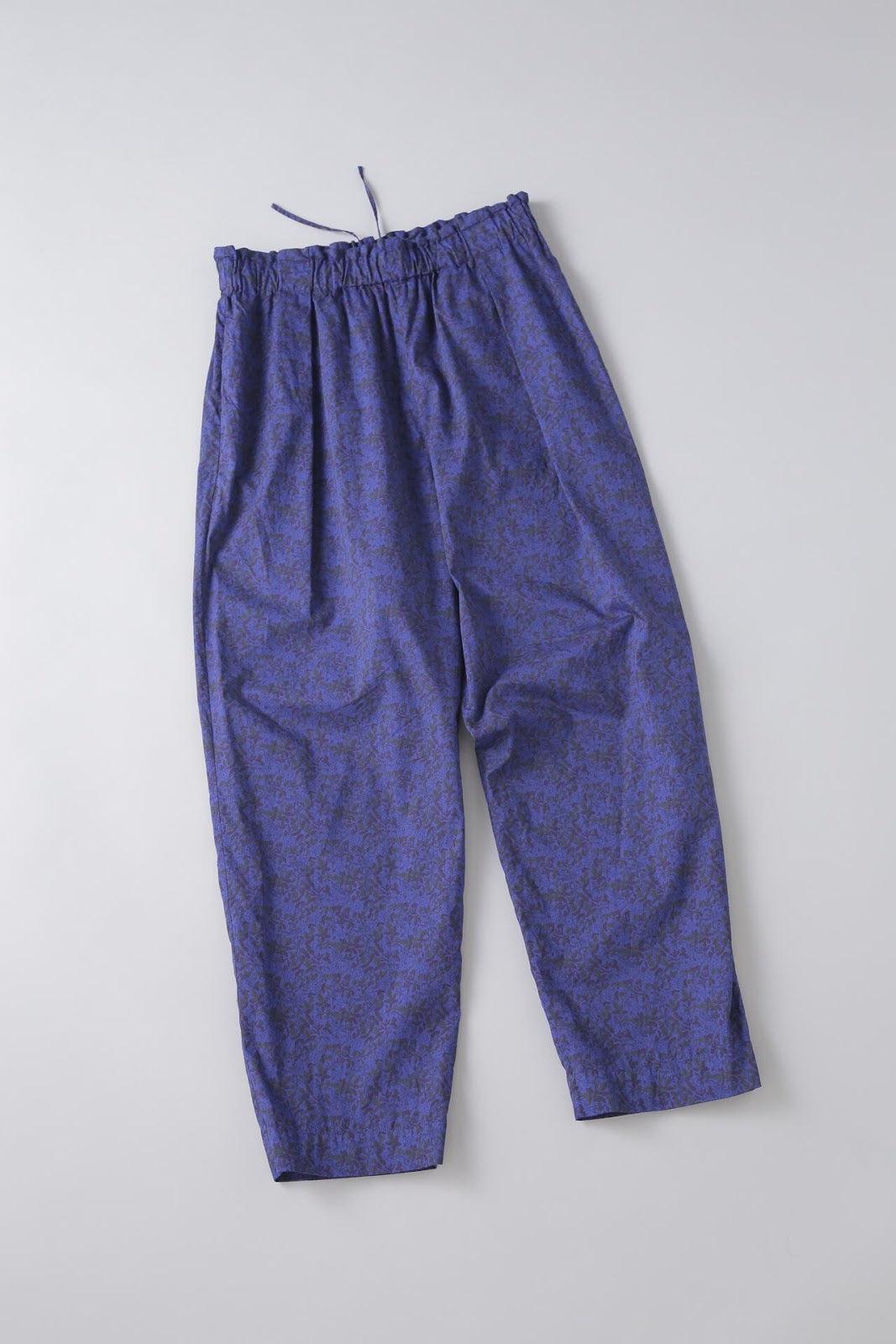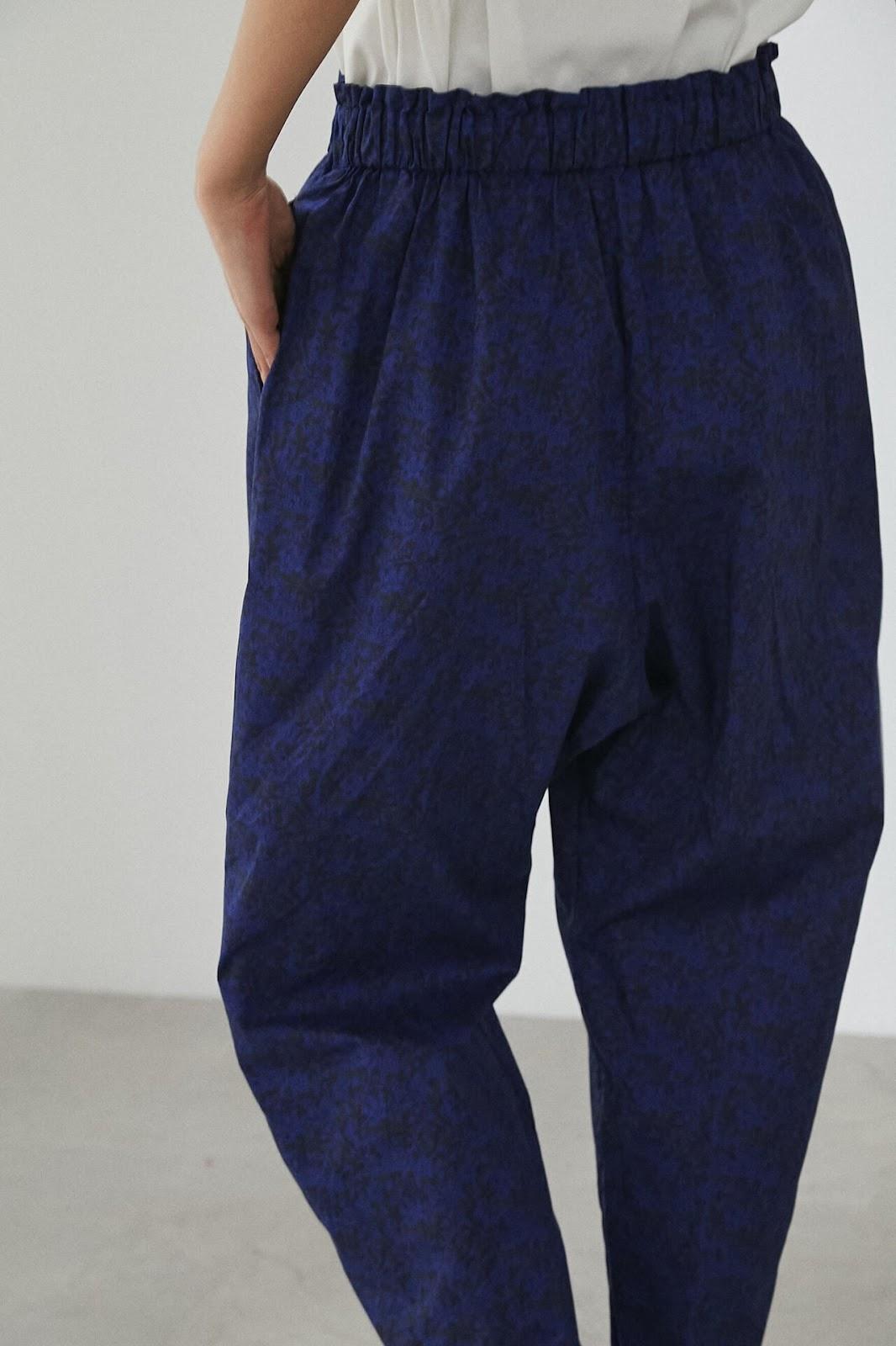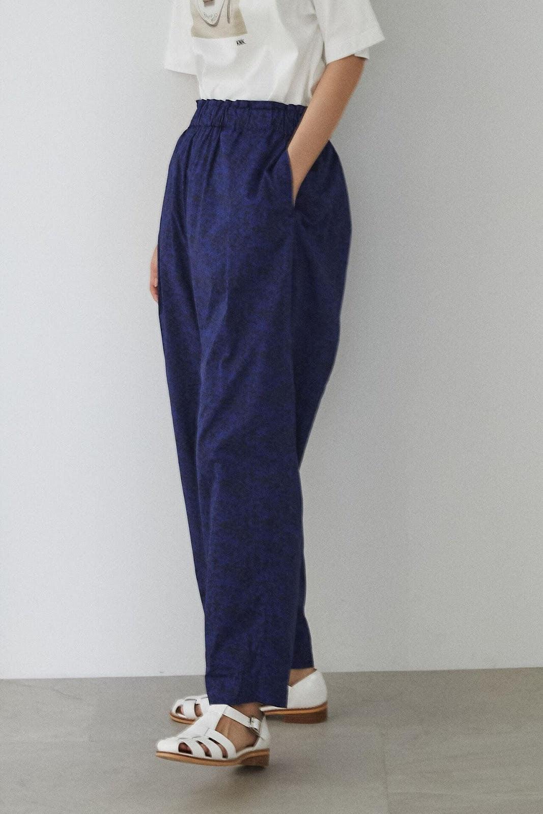 原色自由印花寬鬆長褲 [設計特色] 這款長褲採用自由印花,產品經染色後製成原色。自然的褶皺處理給人一種寬鬆的感覺。尺寸可通過腰部內側的繩子調節。褲子在產品染色過程中使用了部分植物原木染料。藍色的選擇是為了與每個印花相匹配。推薦搭配:與同材質的襯衫搭配時,上衣可加進套裝中,打造出類似連體褲的造型。