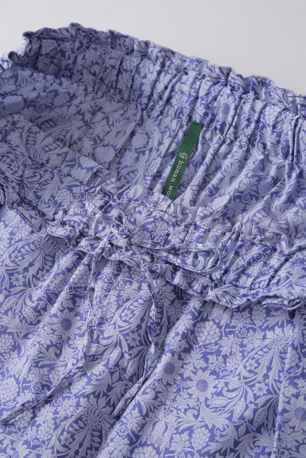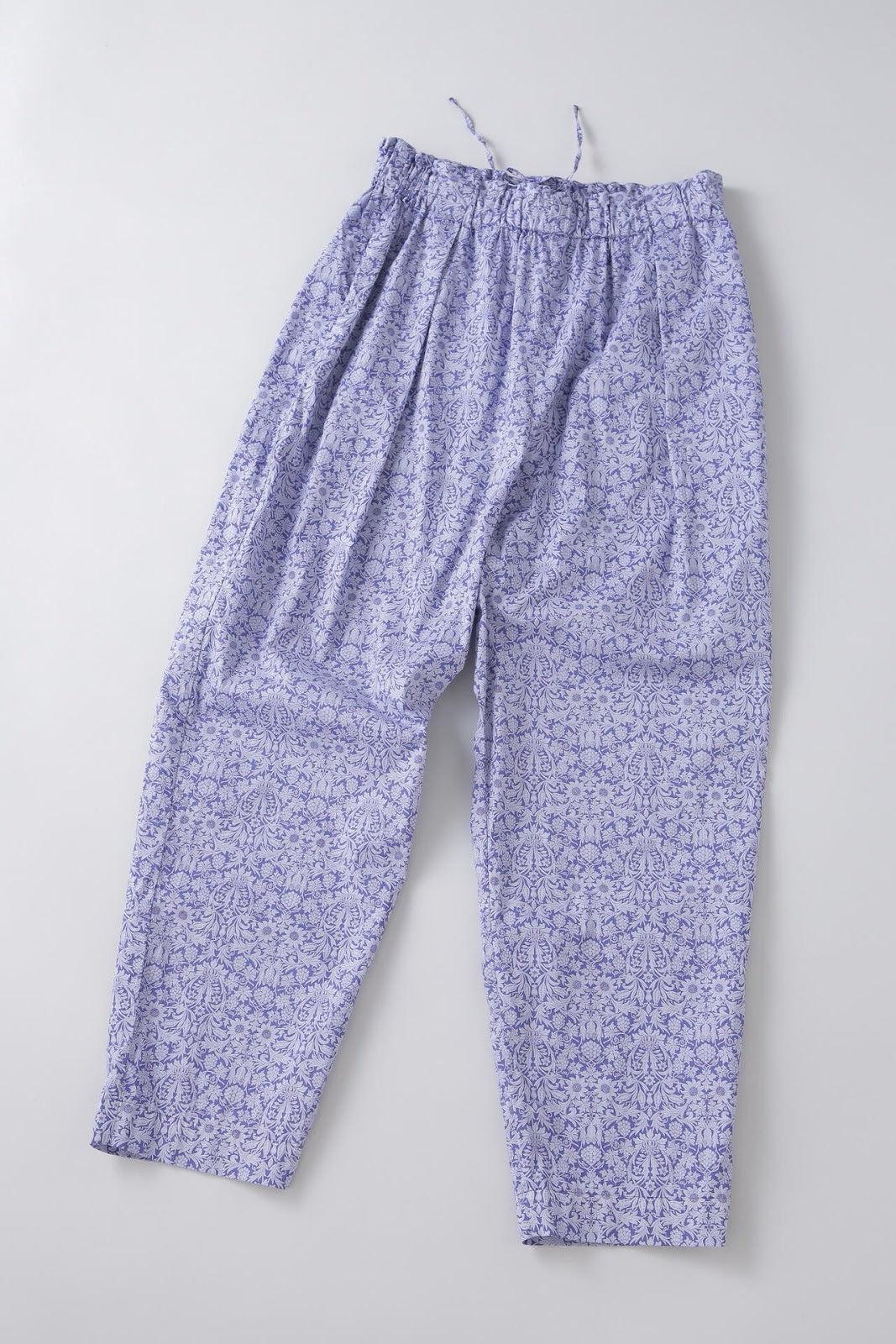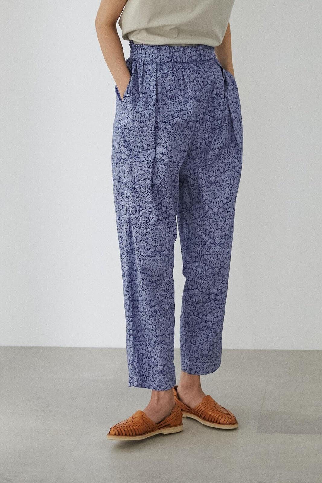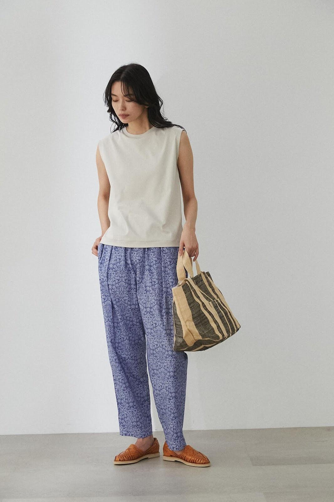 原色自由印花寬鬆長褲 [設計特色] 這款長褲採用自由印花,產品經染色後製成原色。自然的褶皺處理給人一種寬鬆的感覺。尺寸可通過腰部內側的繩子調節。褲子在產品染色過程中使用了部分植物原木染料。藍色的選擇是為了與每個印花相匹配。推薦搭配:與同材質的襯衫搭配時,上衣可加進套裝中,打造出類似連體褲的造型。