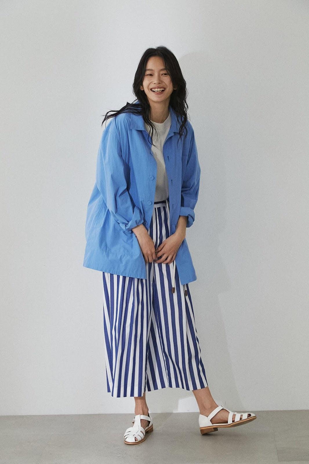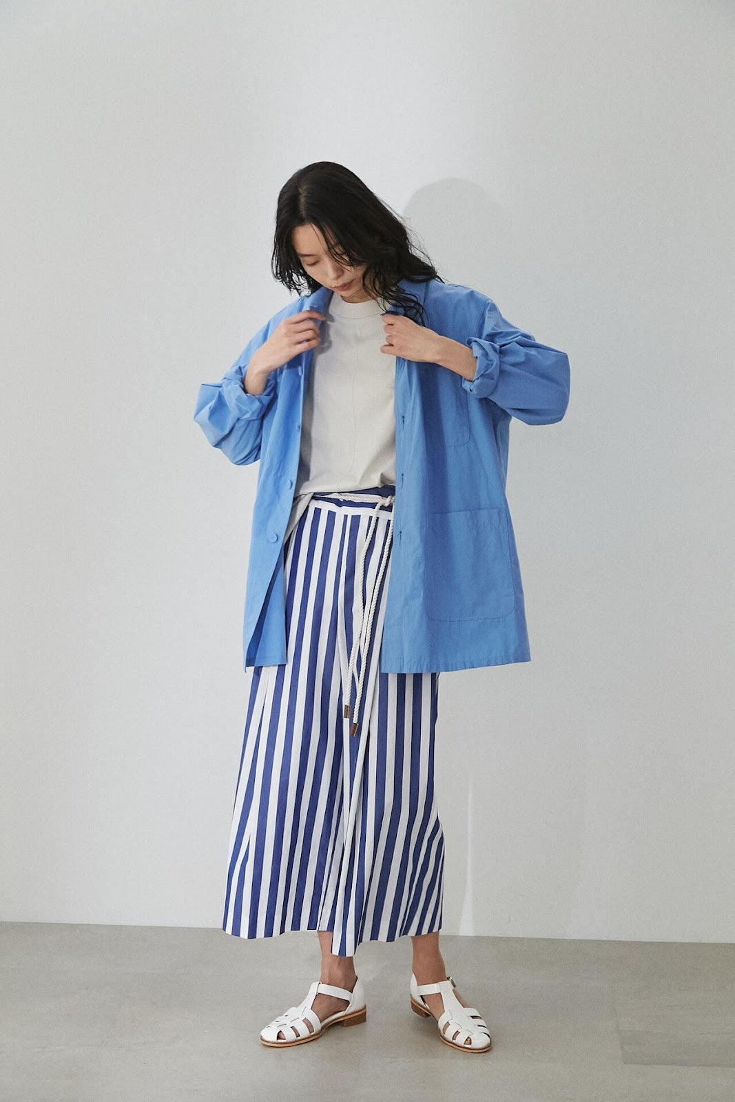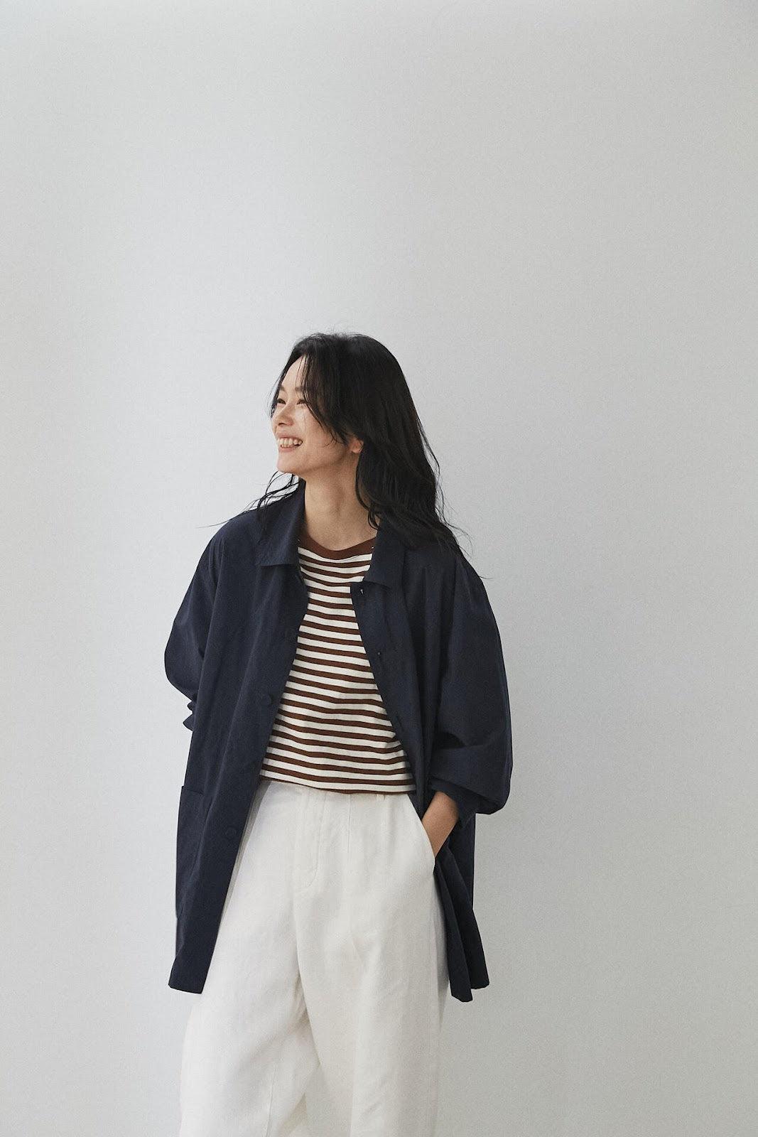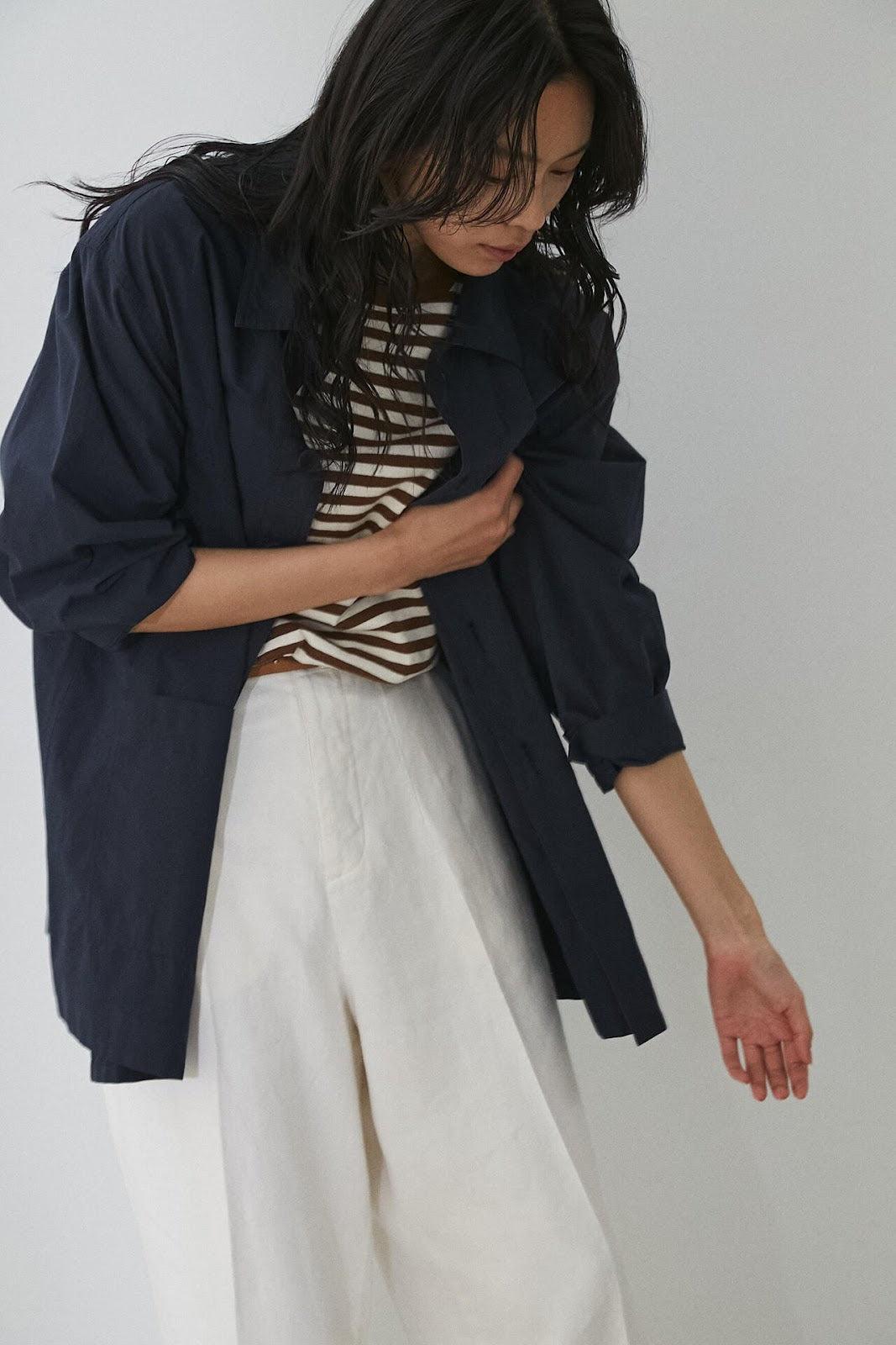 採用富有表現力的面料,打造優雅外觀的打字機夾克 [設計要點] 在輕質面料上採用復古工裝夾克製成的春裝夾克。這款西裝外套採用輕質面料,以復古工作夾克為原型。夾克採用棉質打字機制成,是一種有機材料,並採用傳統的近江染色技術進行加工,可固定褶皺形狀,具有輕鬆的感覺。推薦座標:此款夾克推薦簡潔、休閒的風格。可與同材質的裙子和連衣裙搭配作為套裝穿著。