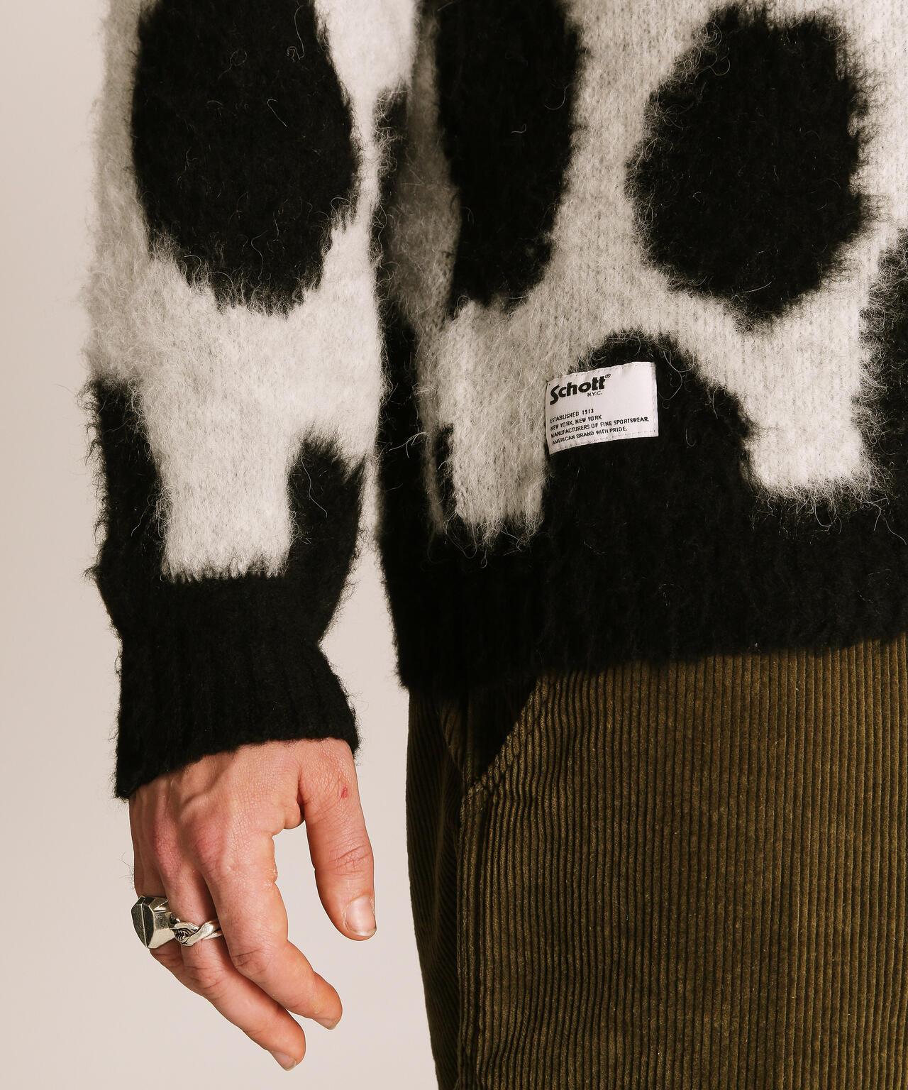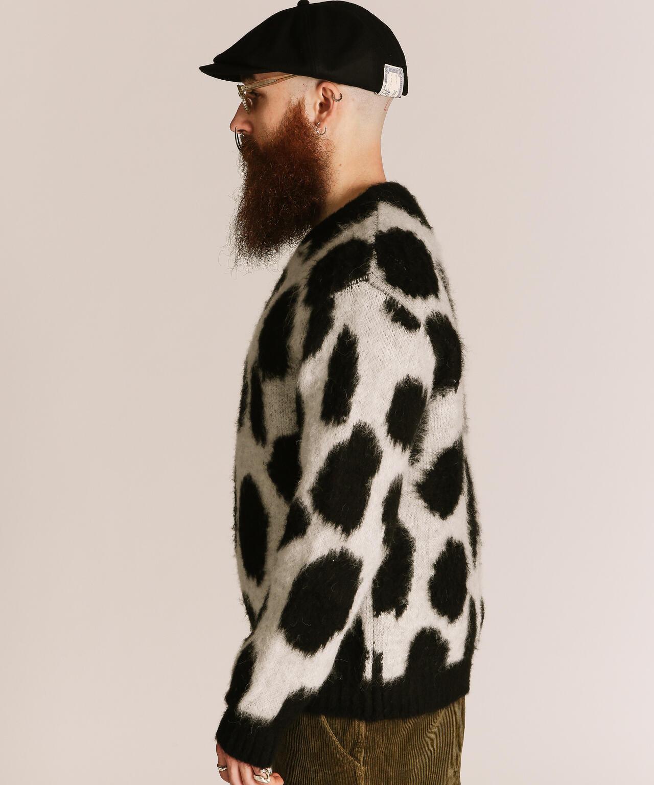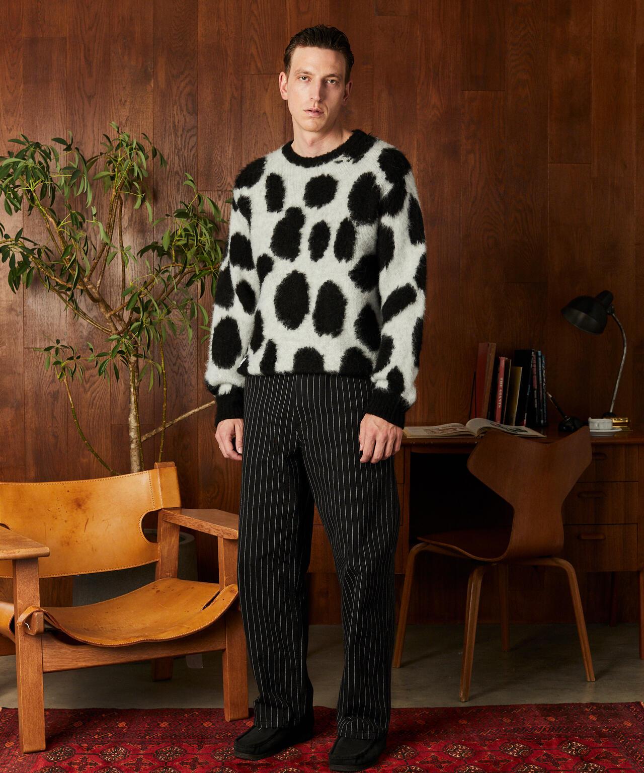 這種腈綸主針織物沒有羊毛針織物的重量,從初秋開始就可以輕便地穿著。復古的絨毛質地使其具有肖特式的粗獷特徵。本季新採用了引人注目的 "長頸鹿圖案"。這種設計將俏皮與存在感融為一體,必將為您的日常造型增添一抹個性色彩。這款針織衫是追求與眾不同的你的必備之選。