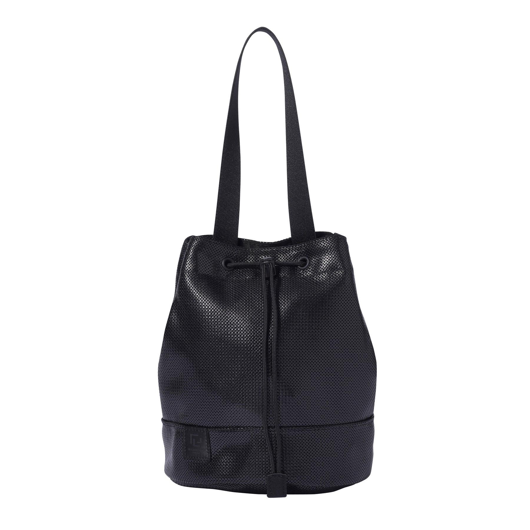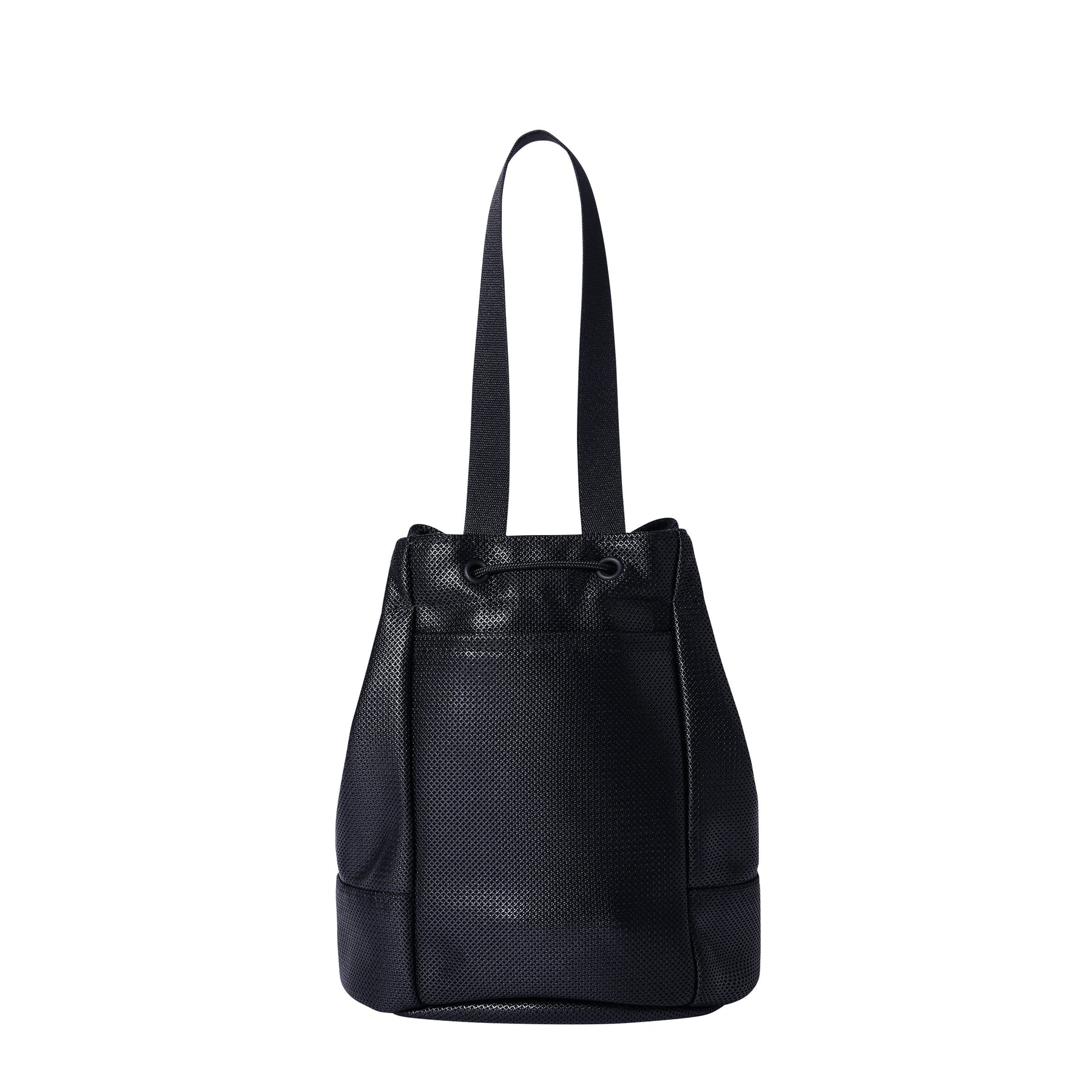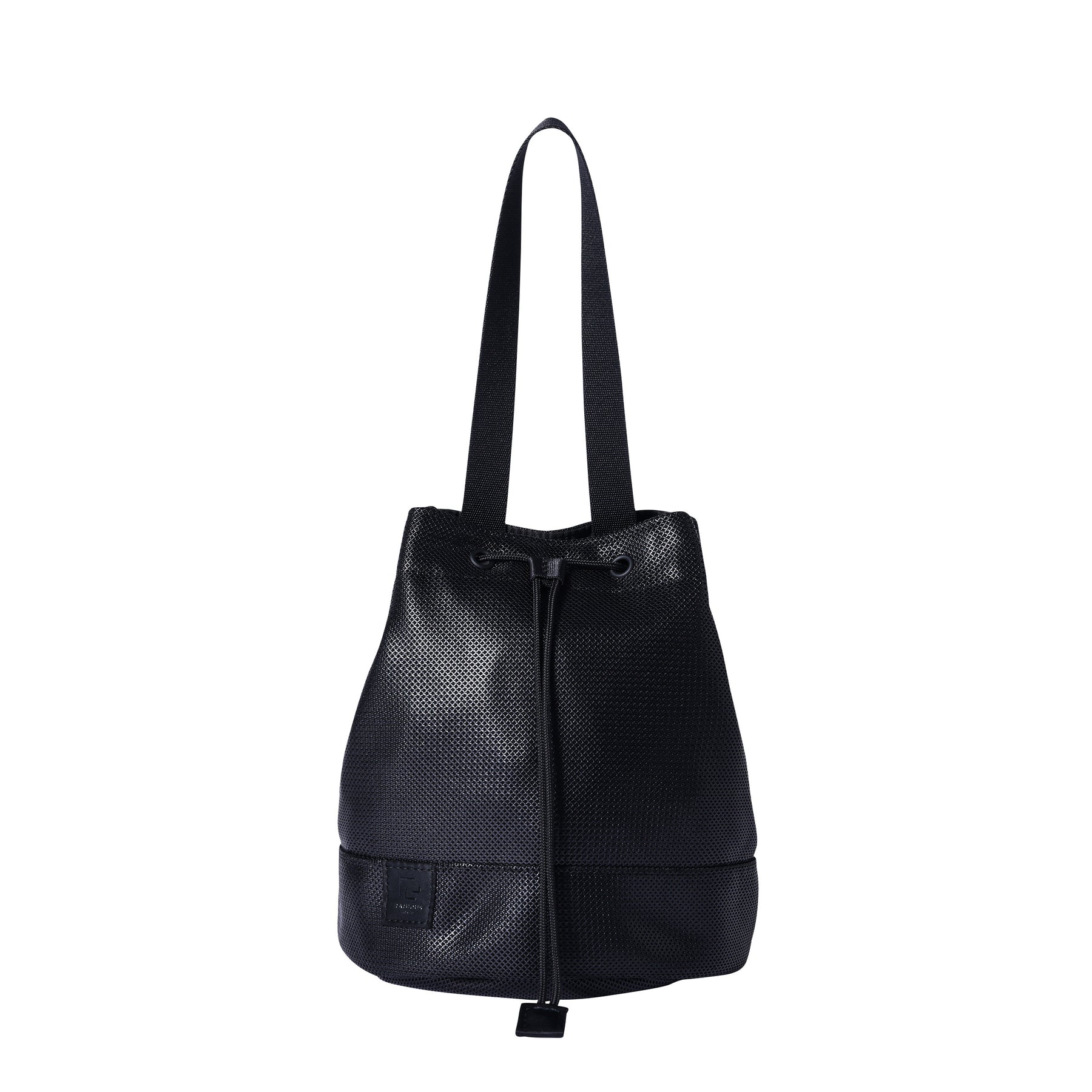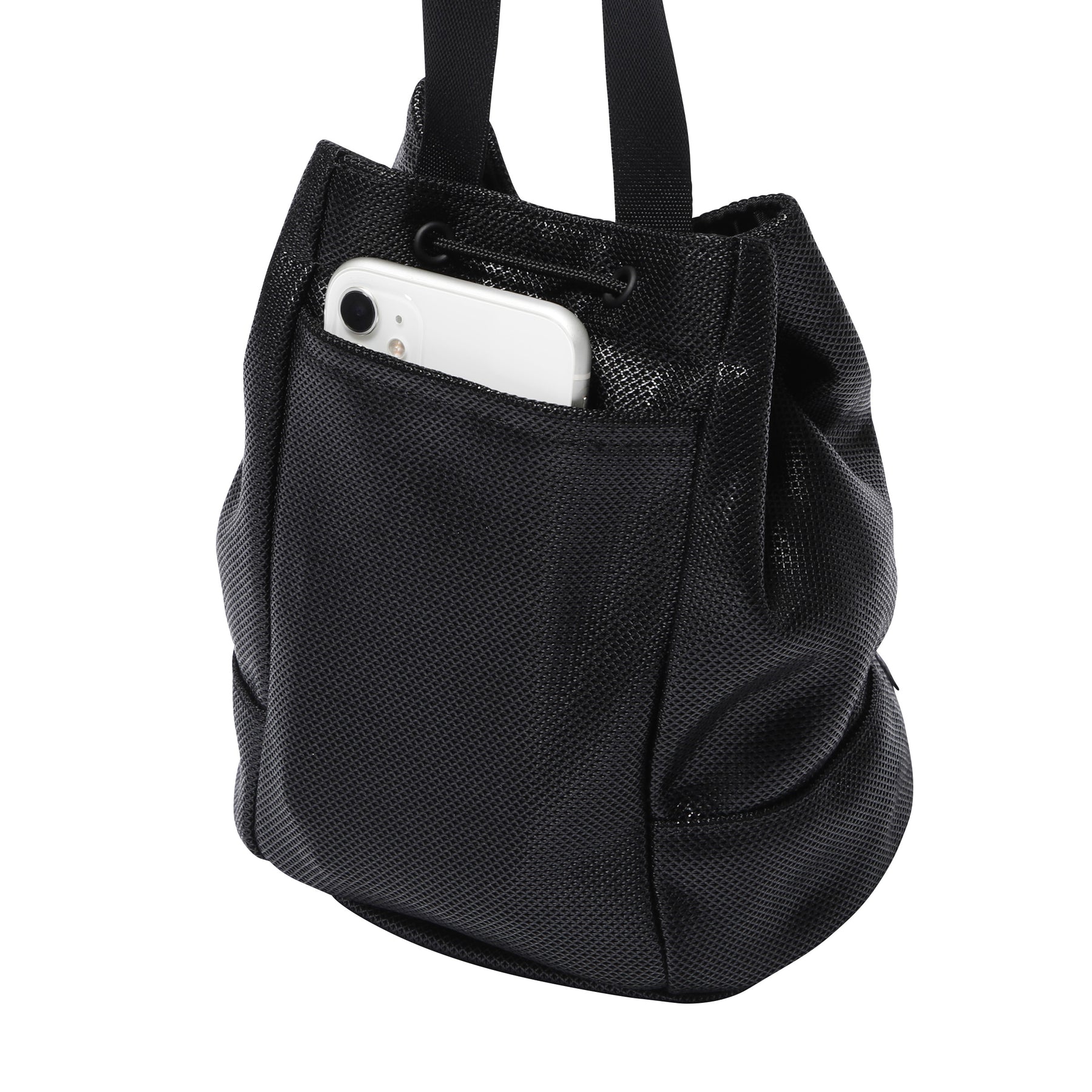 拉繩包的背面和內部均設有手機袋。手柄帶可收納在包內,因此也可用作抽繩袋。內袋足夠大,可容納 iPhone 15 Pro Max。採用閃亮的👍穿孔材料製成,讓人聯想到皮革。