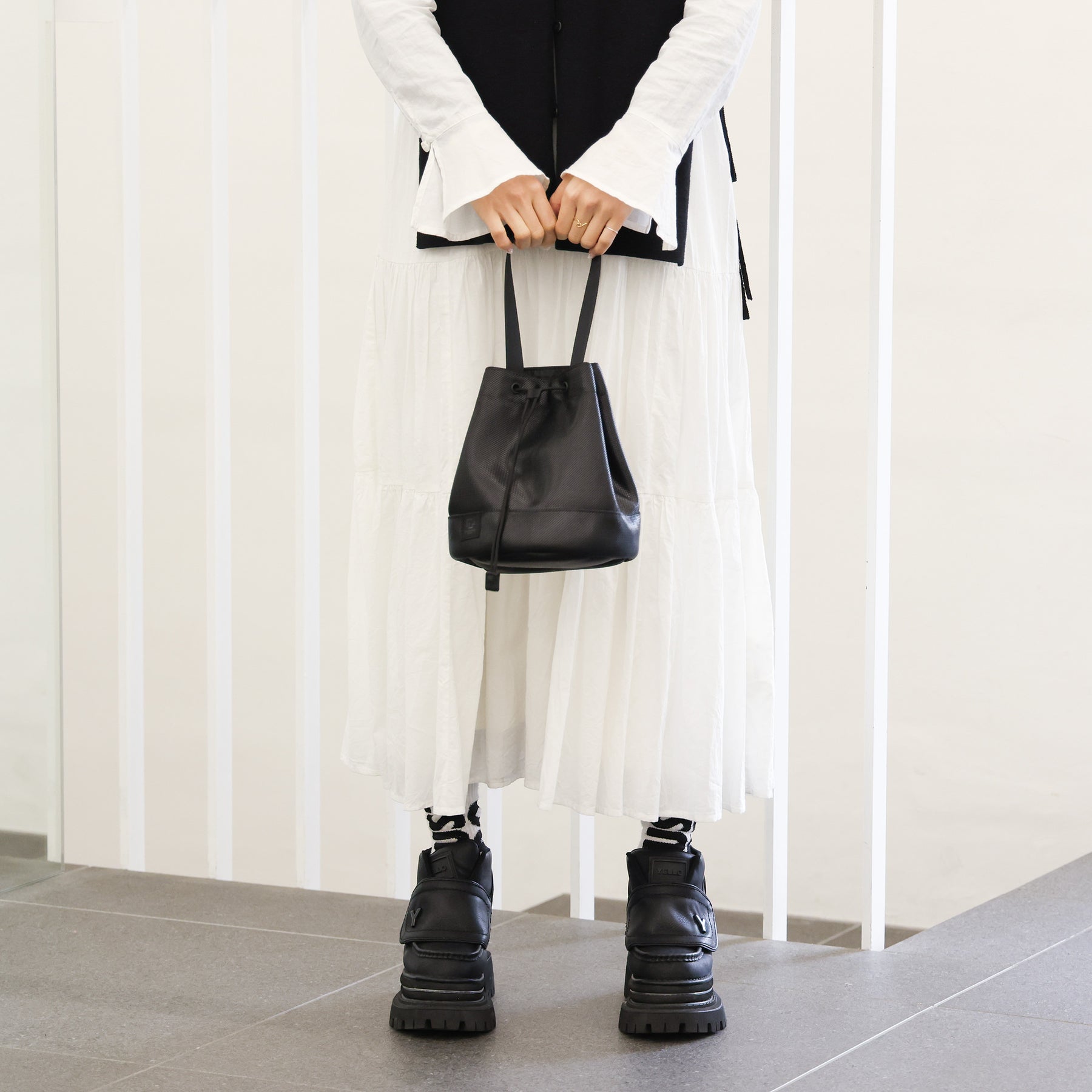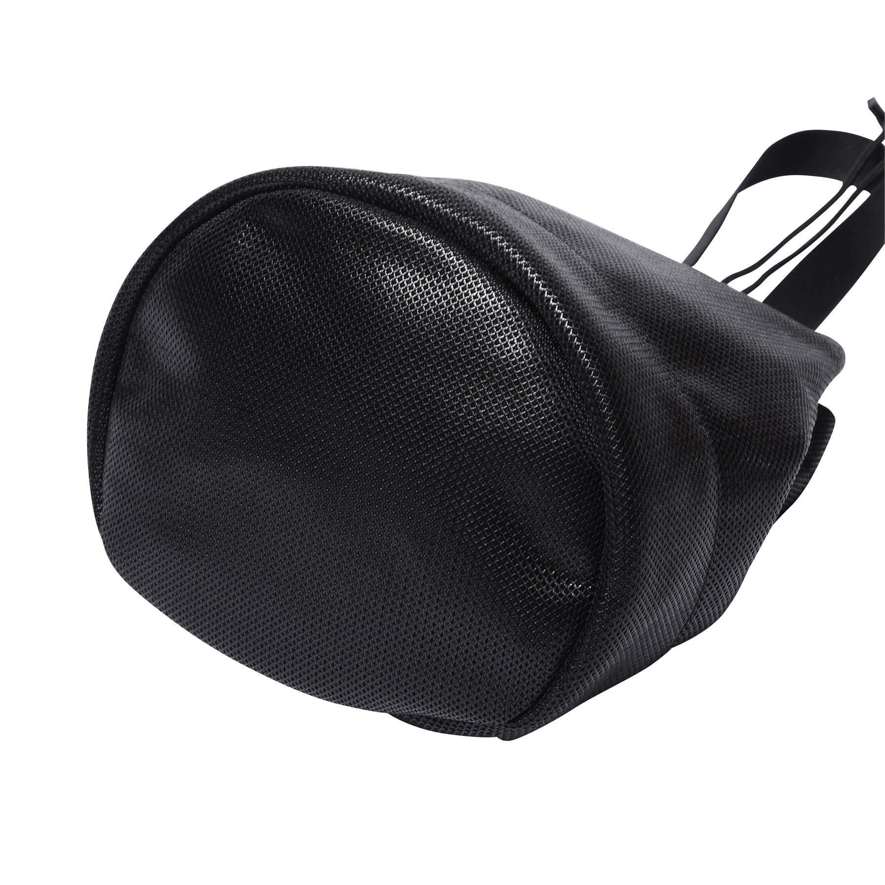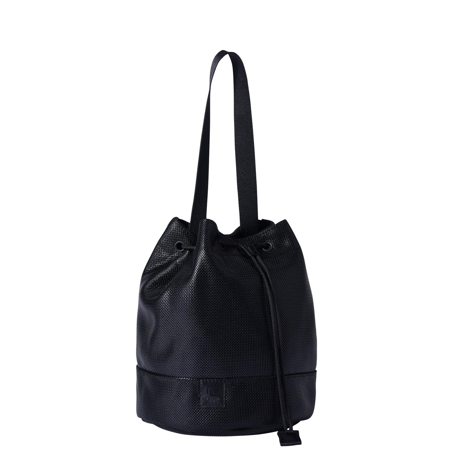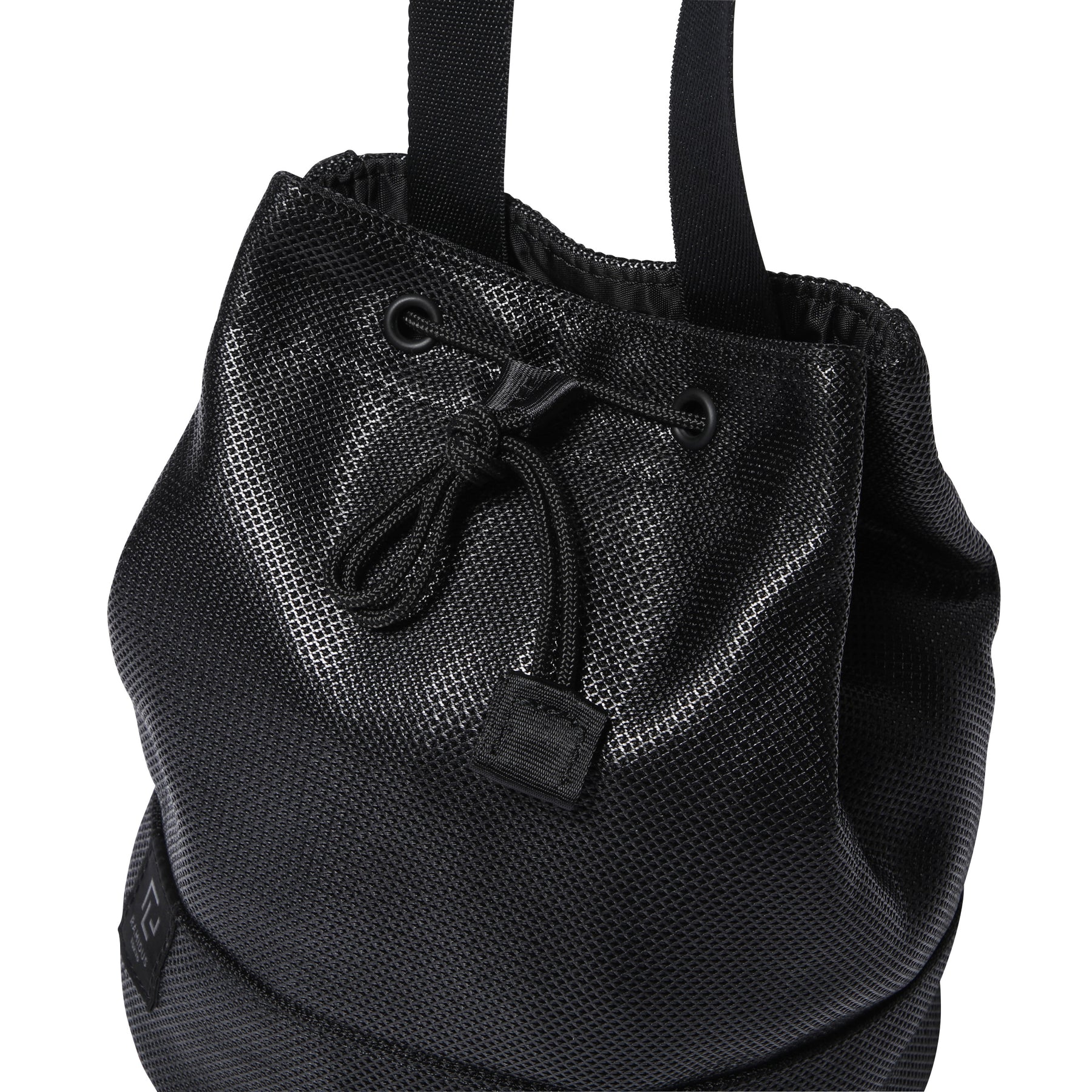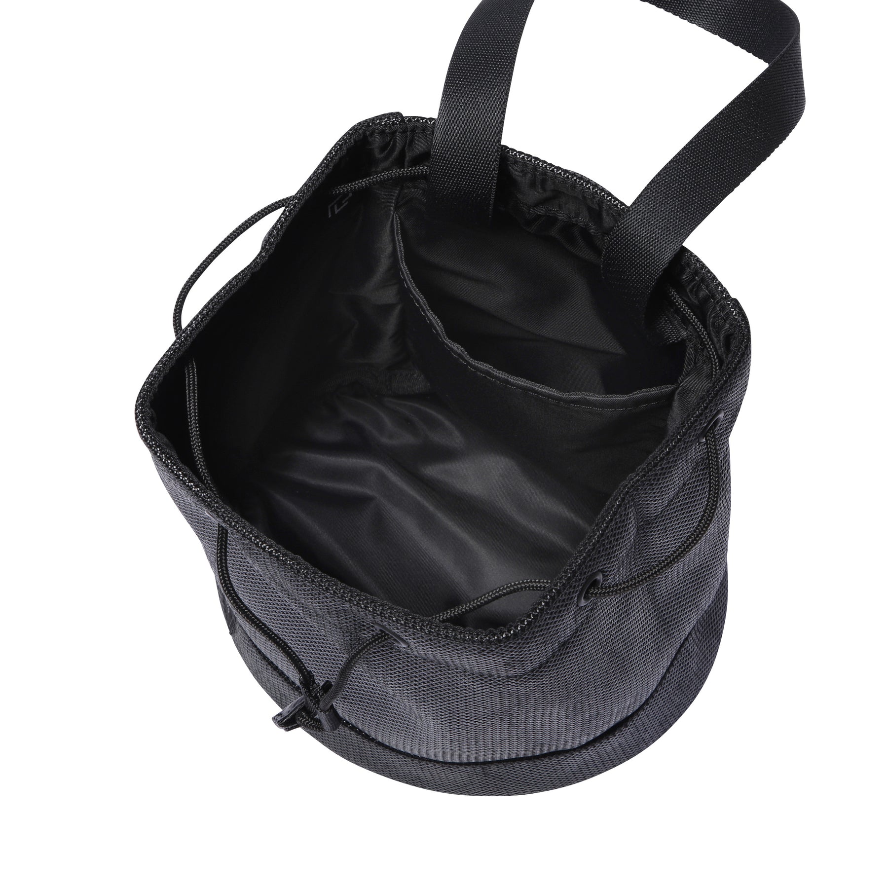 拉繩包的背面和內部均設有手機袋。手柄帶可收納在包內,因此也可用作抽繩袋。內袋足夠大,可容納 iPhone 15 Pro Max。採用閃亮的👍穿孔材料製成,讓人聯想到皮革。