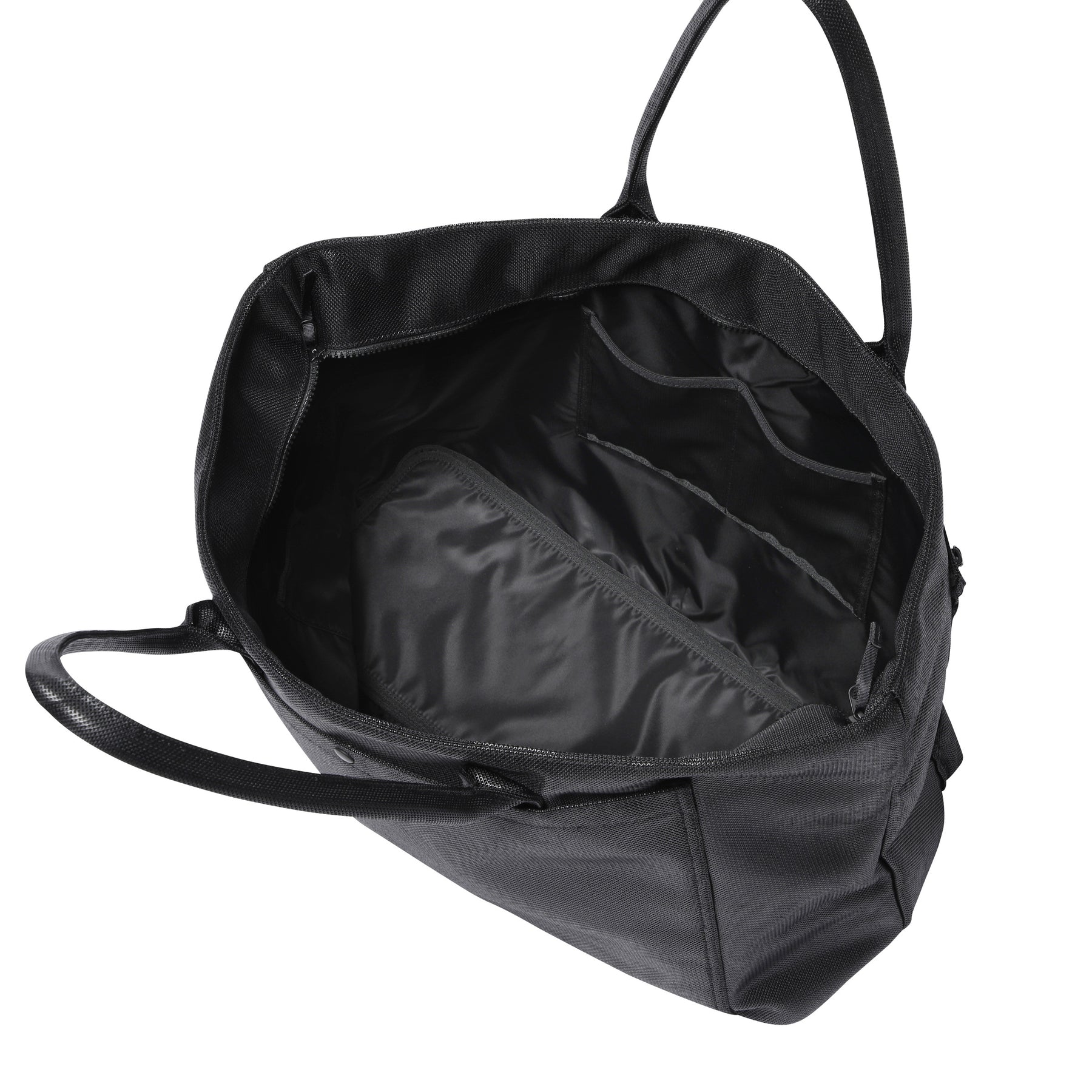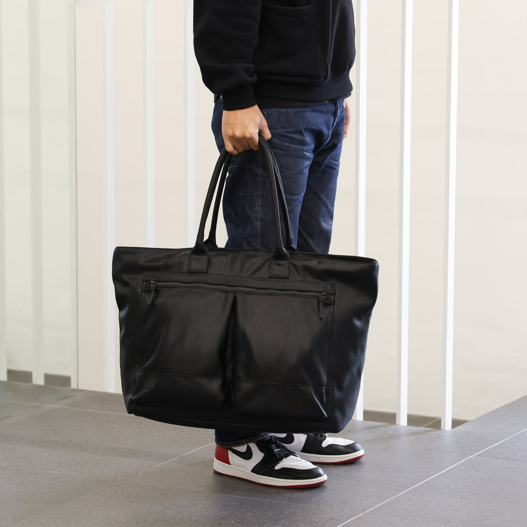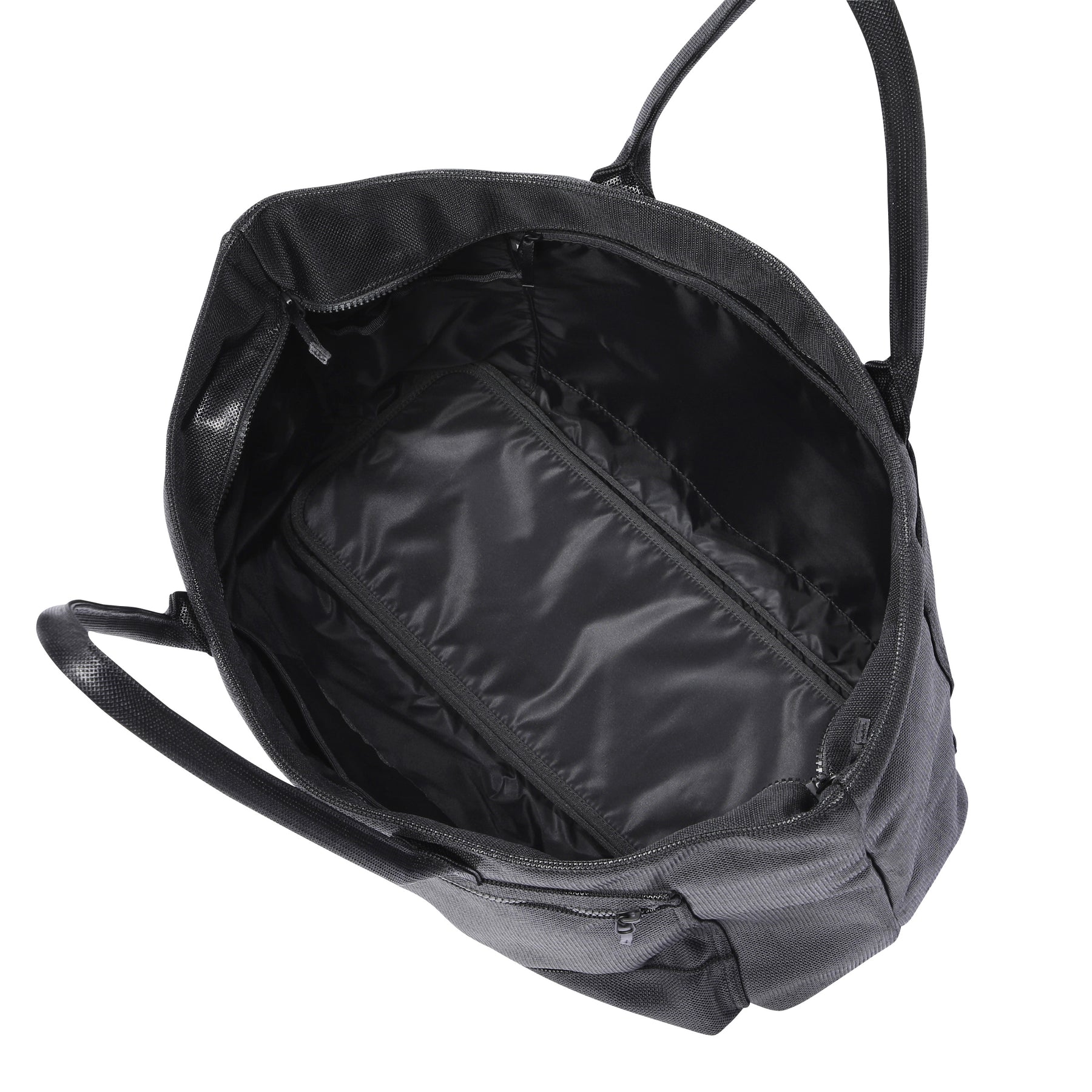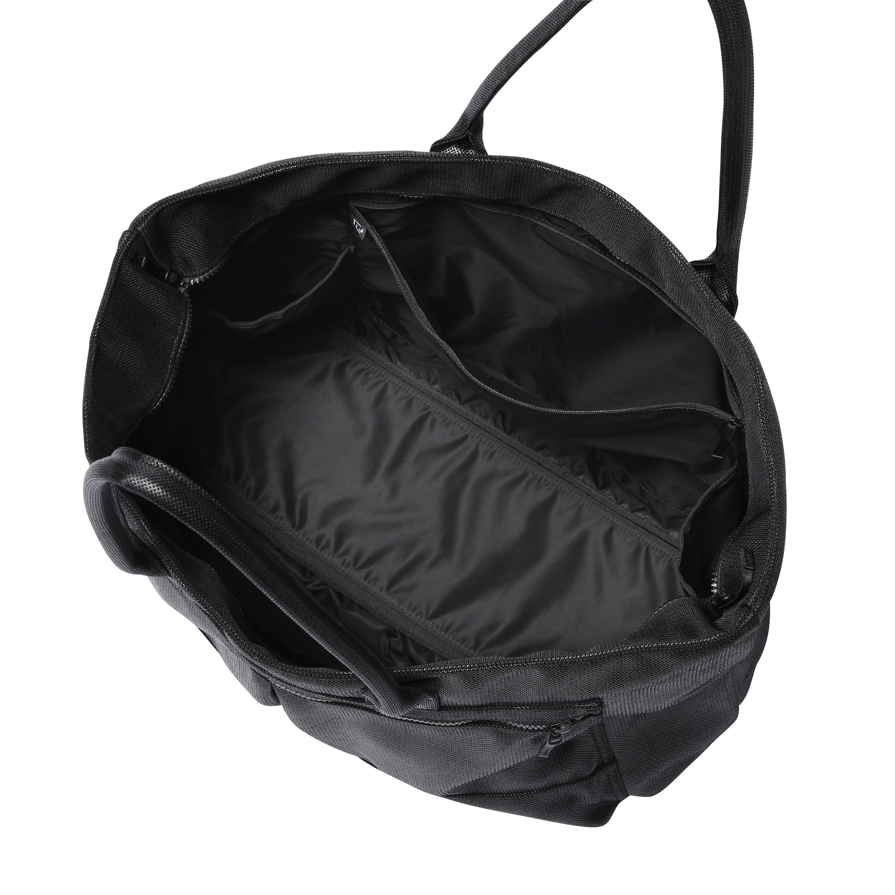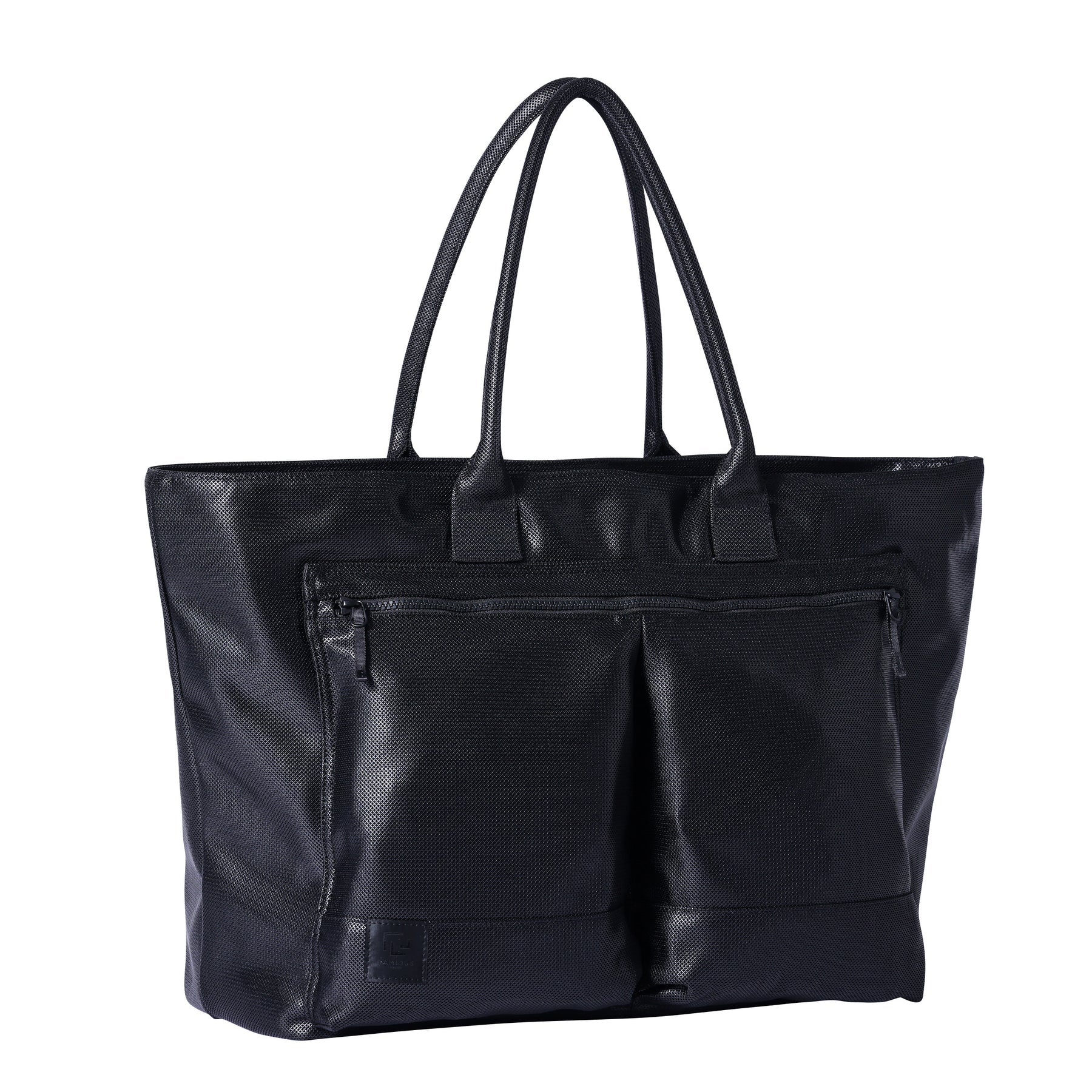 大型手提包,正面寬闊,存儲容量大。內部有一個網兜,可存放小件物品,兩側還有水壺袋,可存放塑料瓶和摺疊傘。與其他系列的同款產品相比,這款手袋的規格更加均衡,減少了手柄的體積。包包採用閃亮的👍穿孔材料製成,讓人聯想到皮革。
