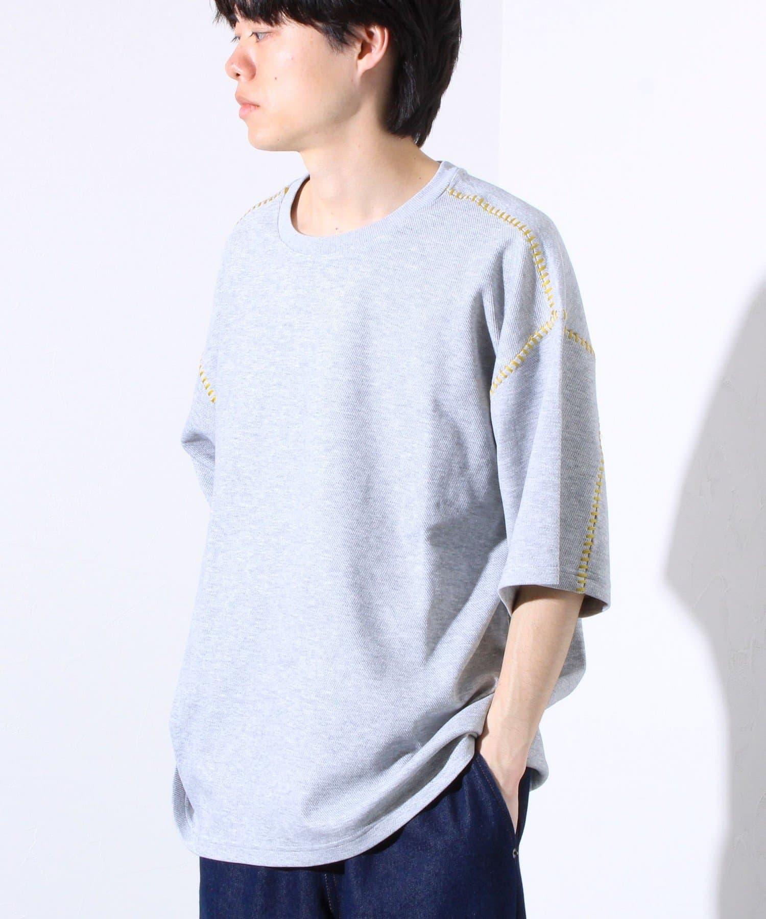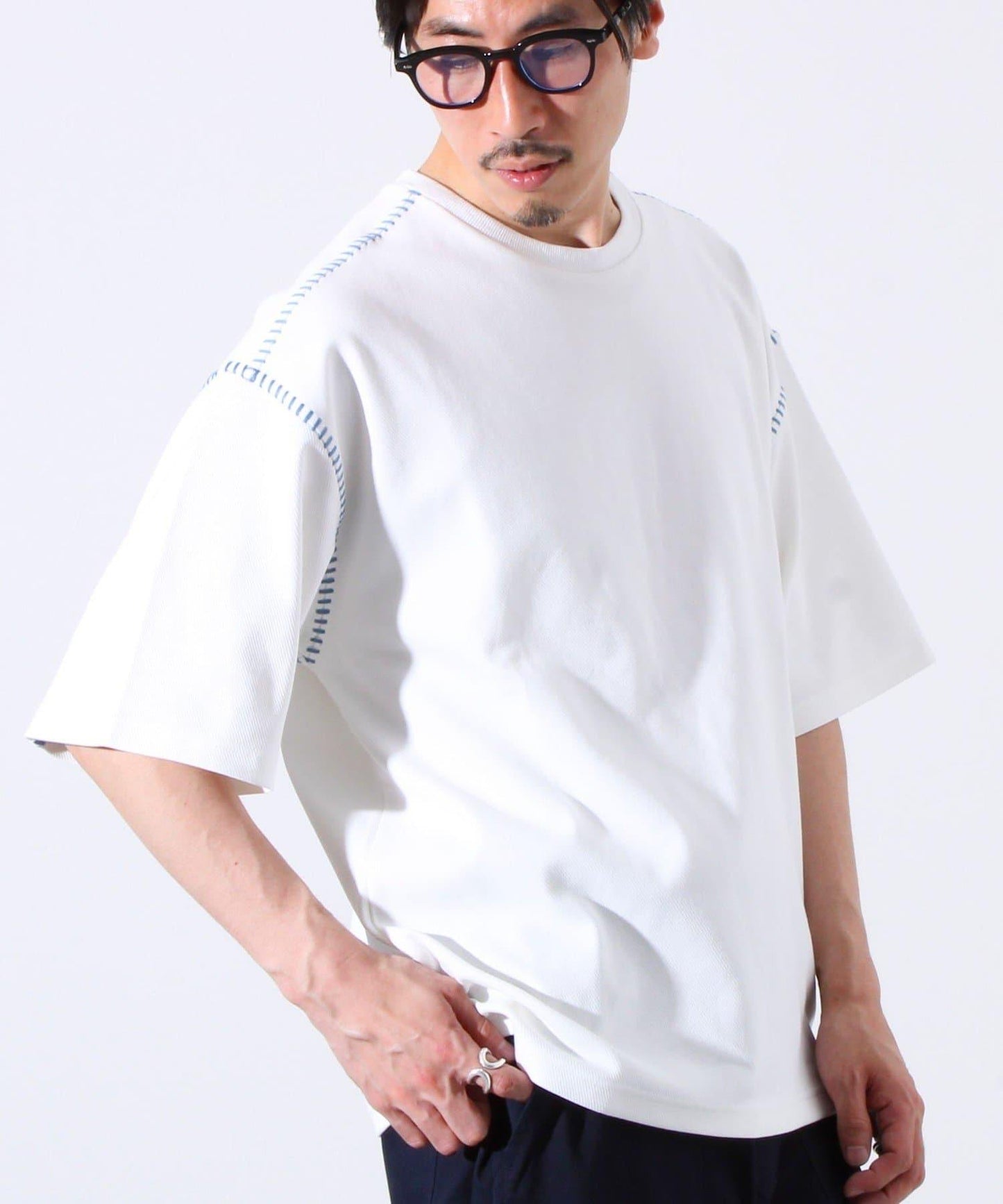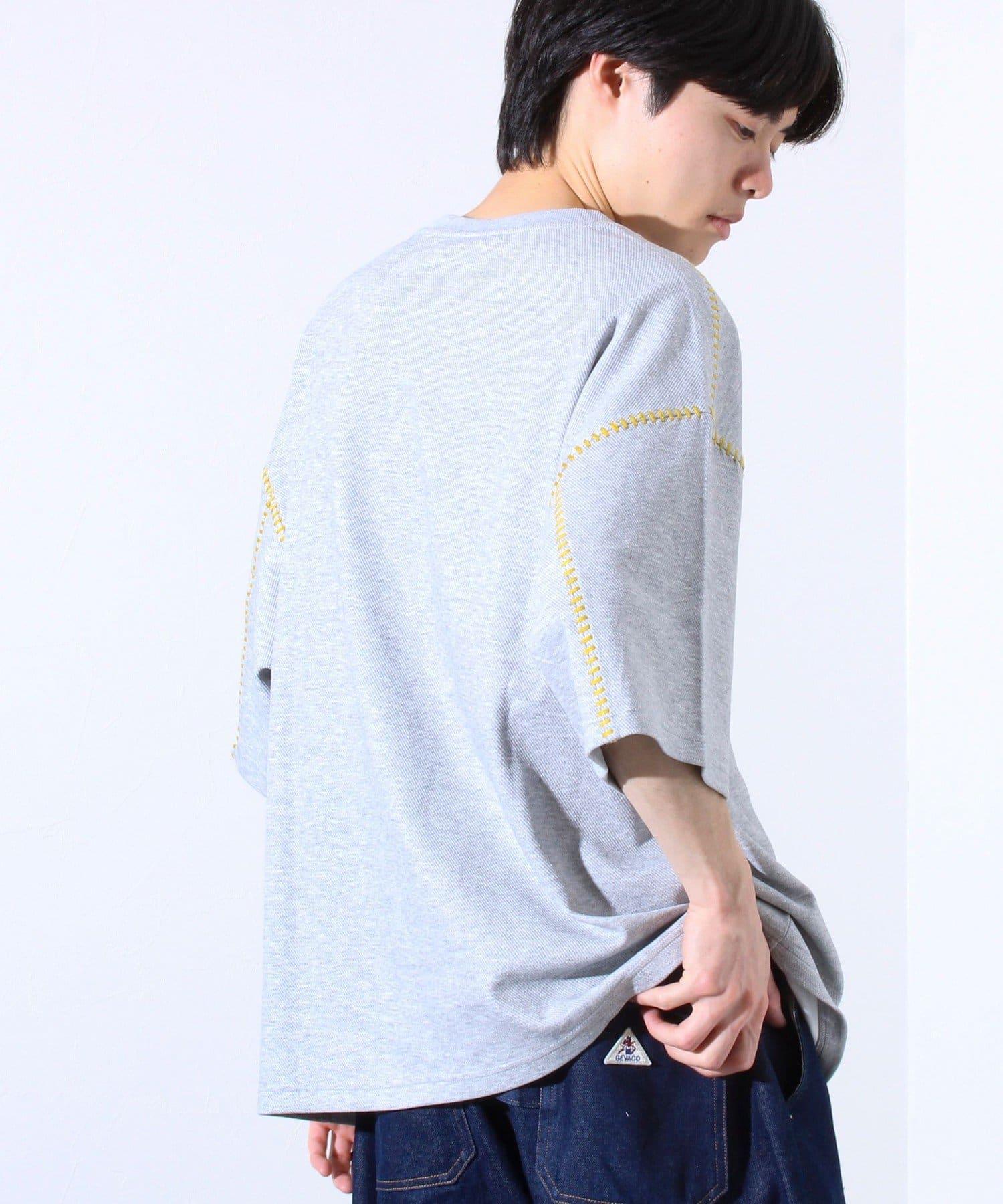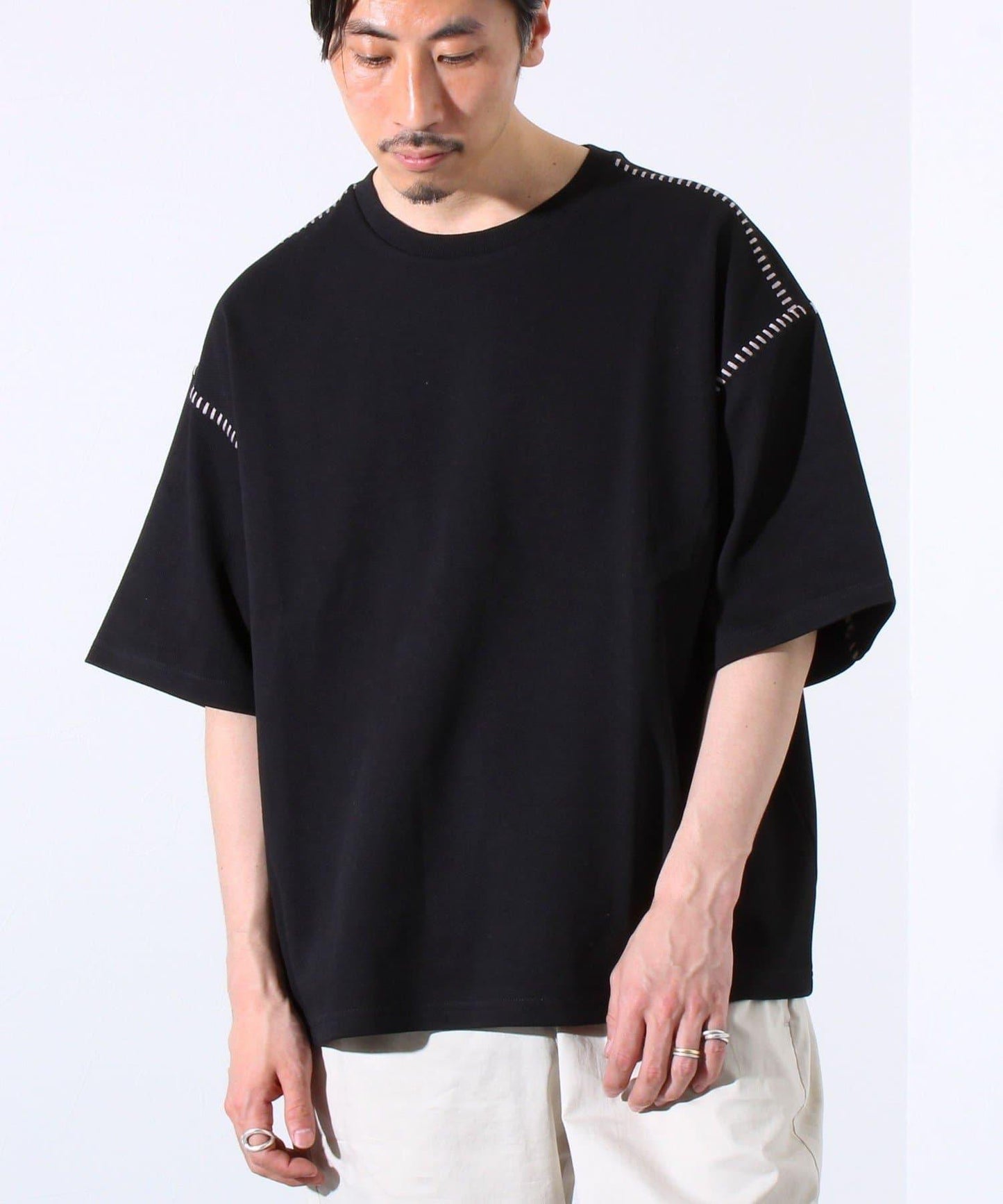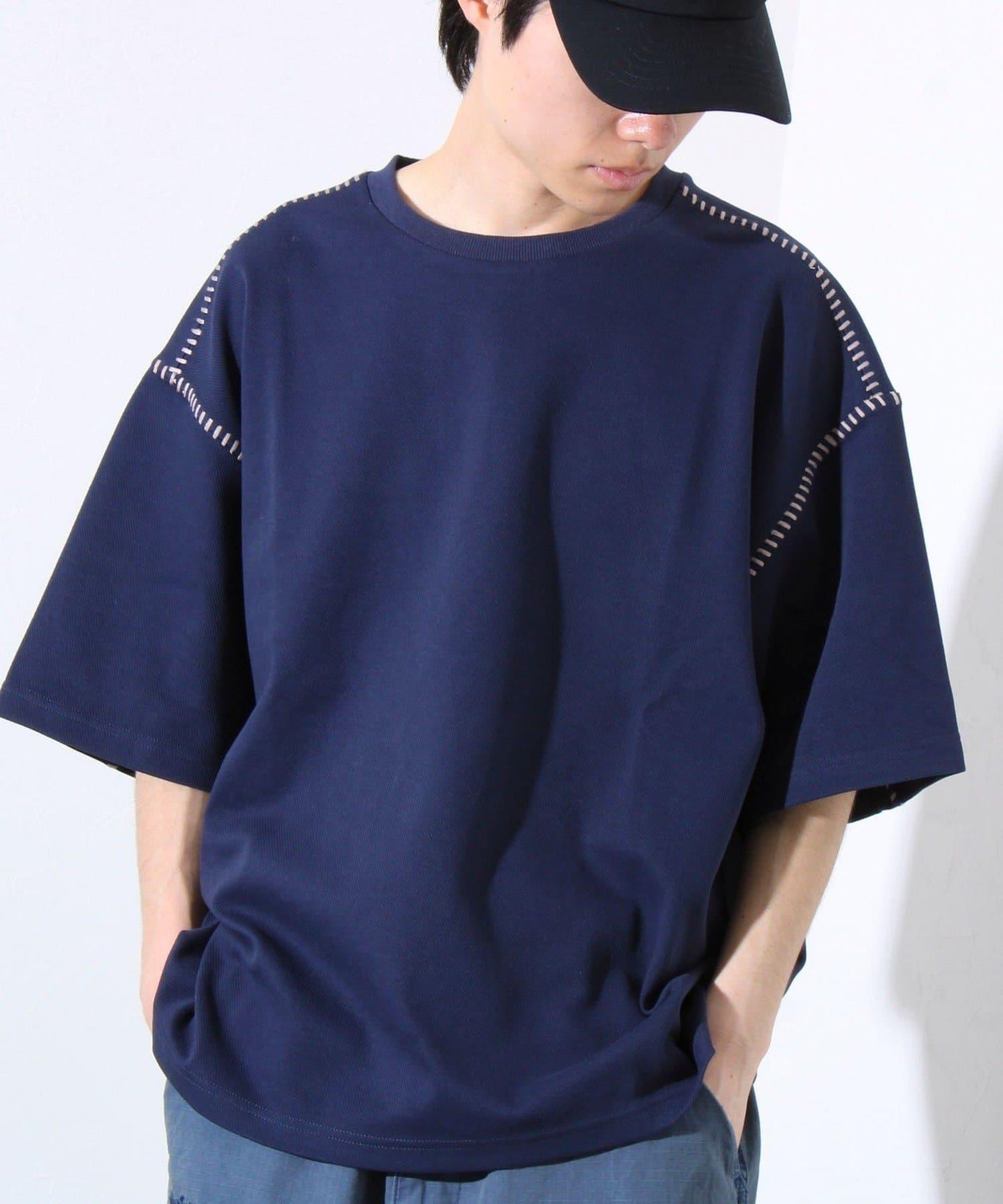 寬鬆 T 恤,肩部和袖子有彩色縫線裝飾。