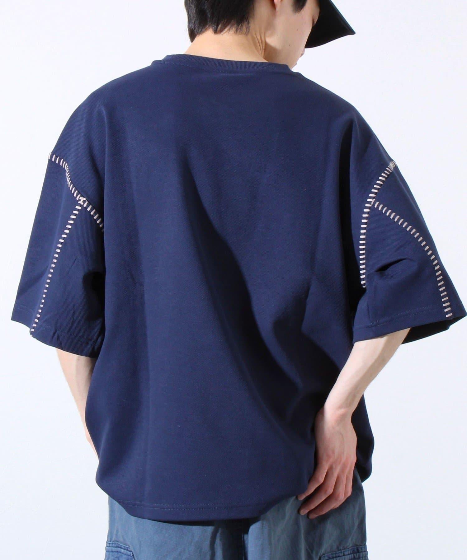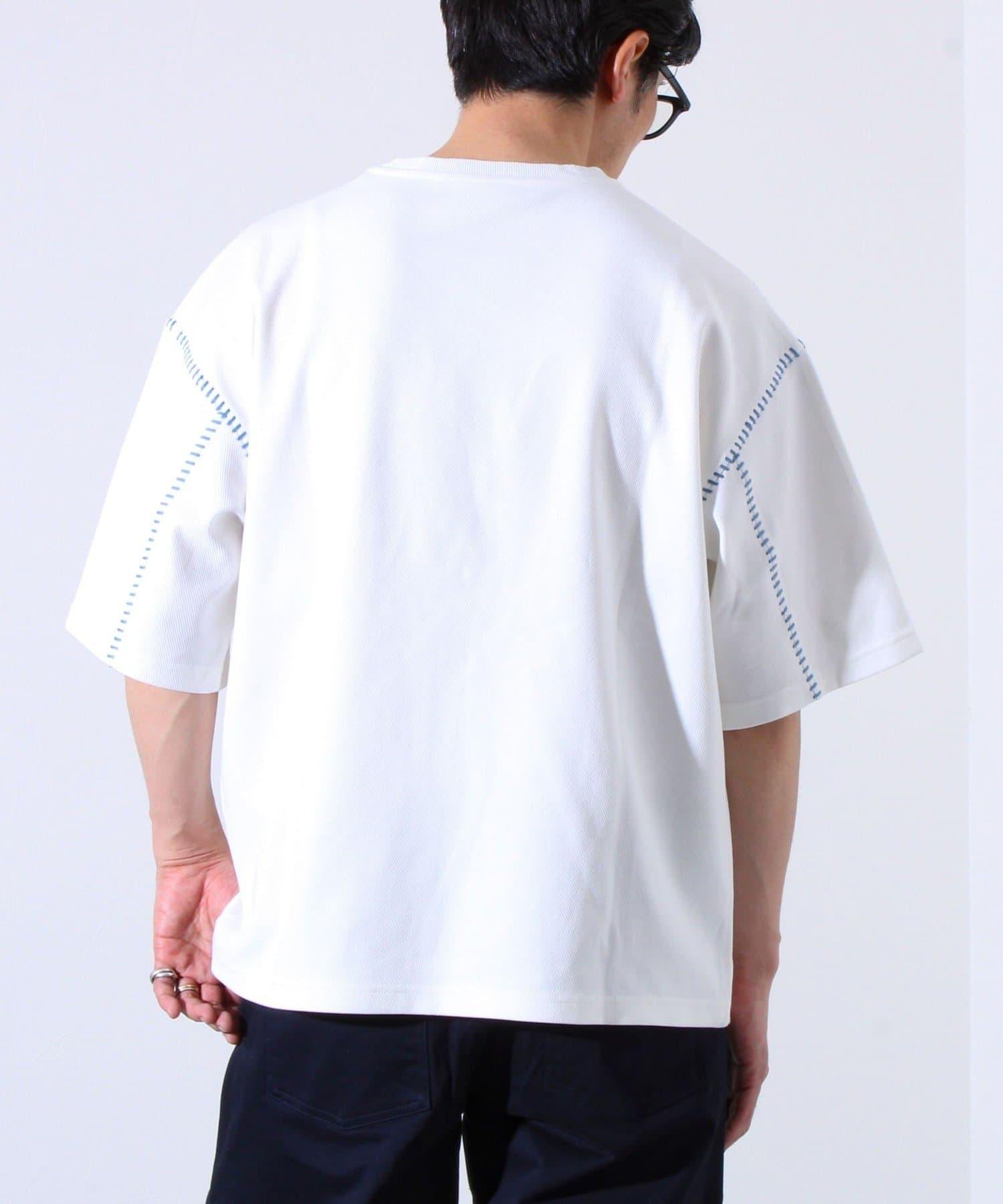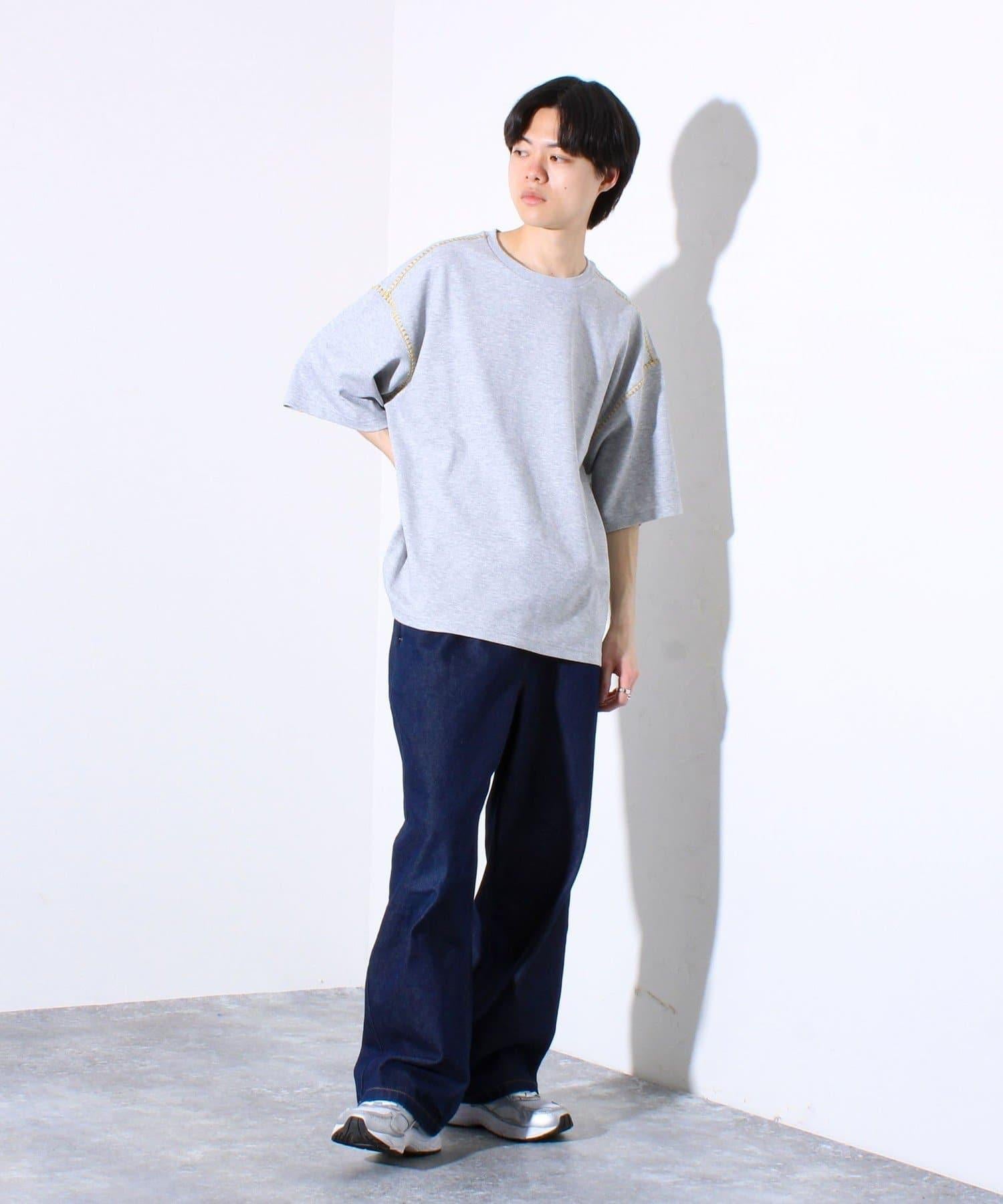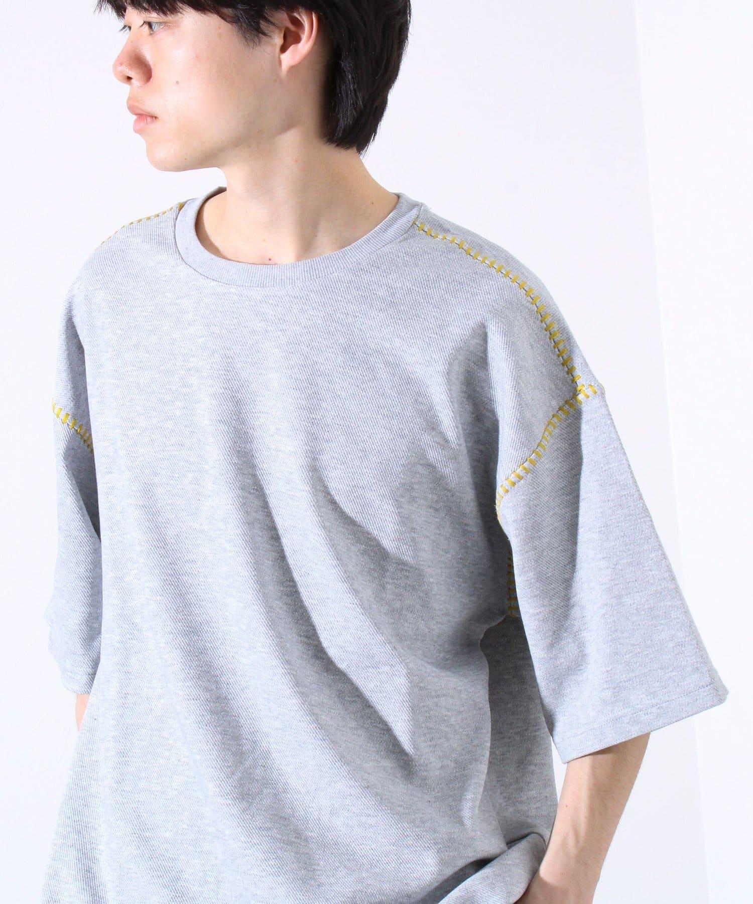 寬鬆 T 恤,肩部和袖子有彩色縫線裝飾。