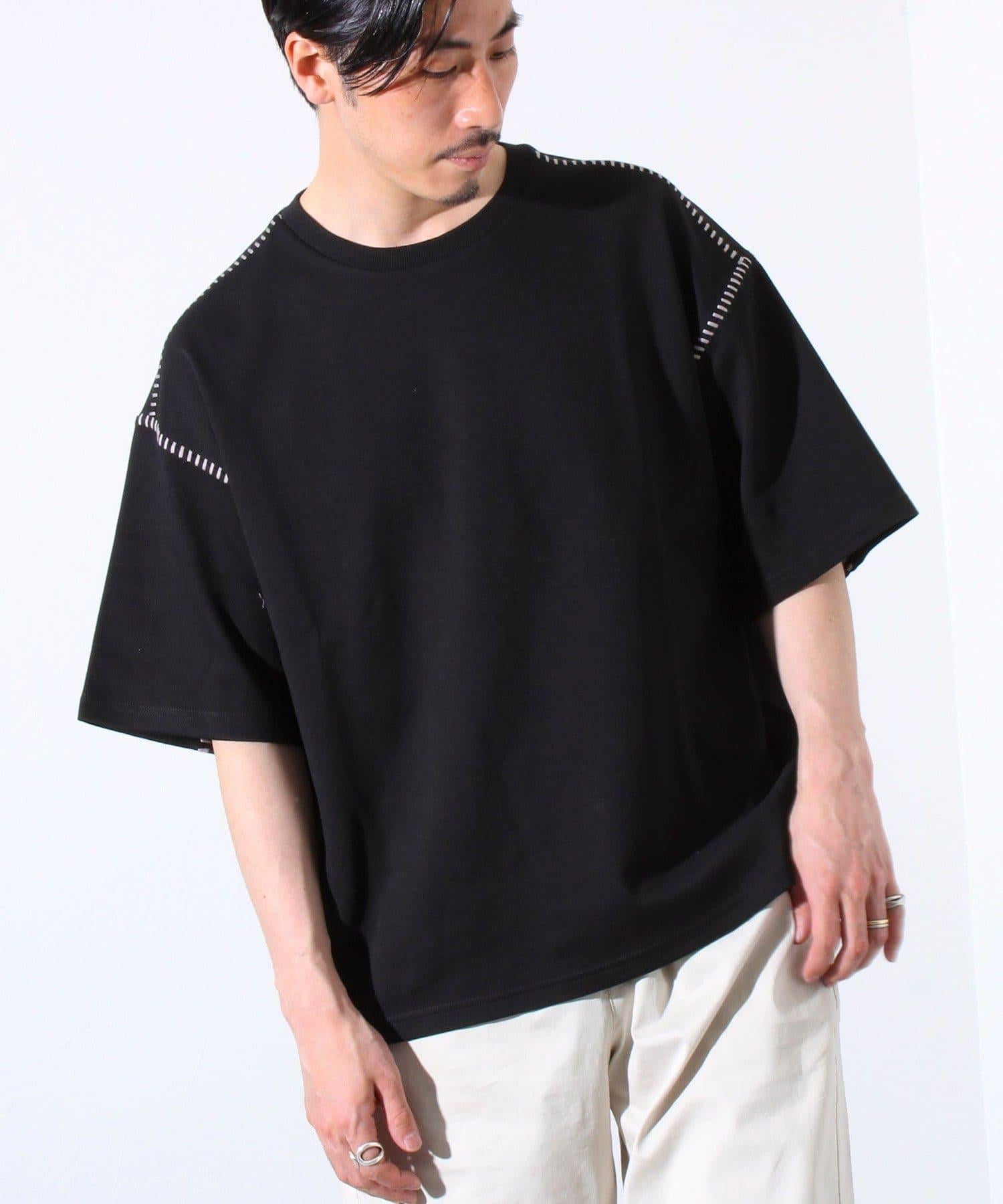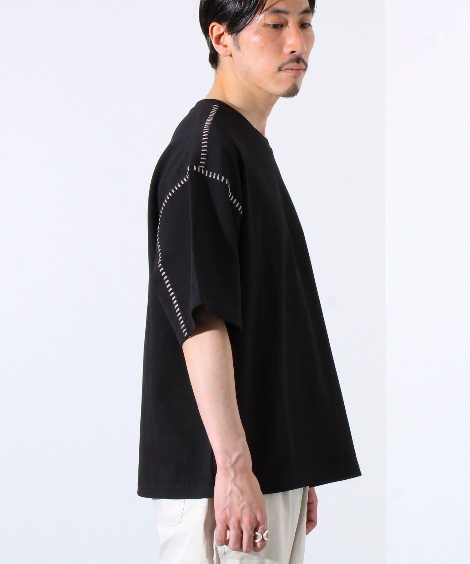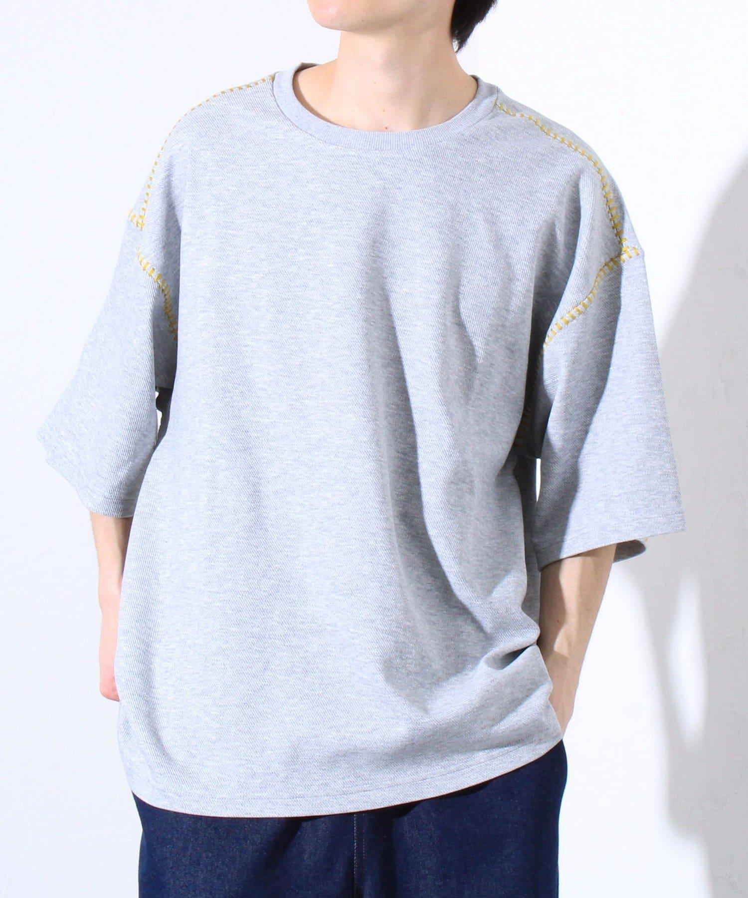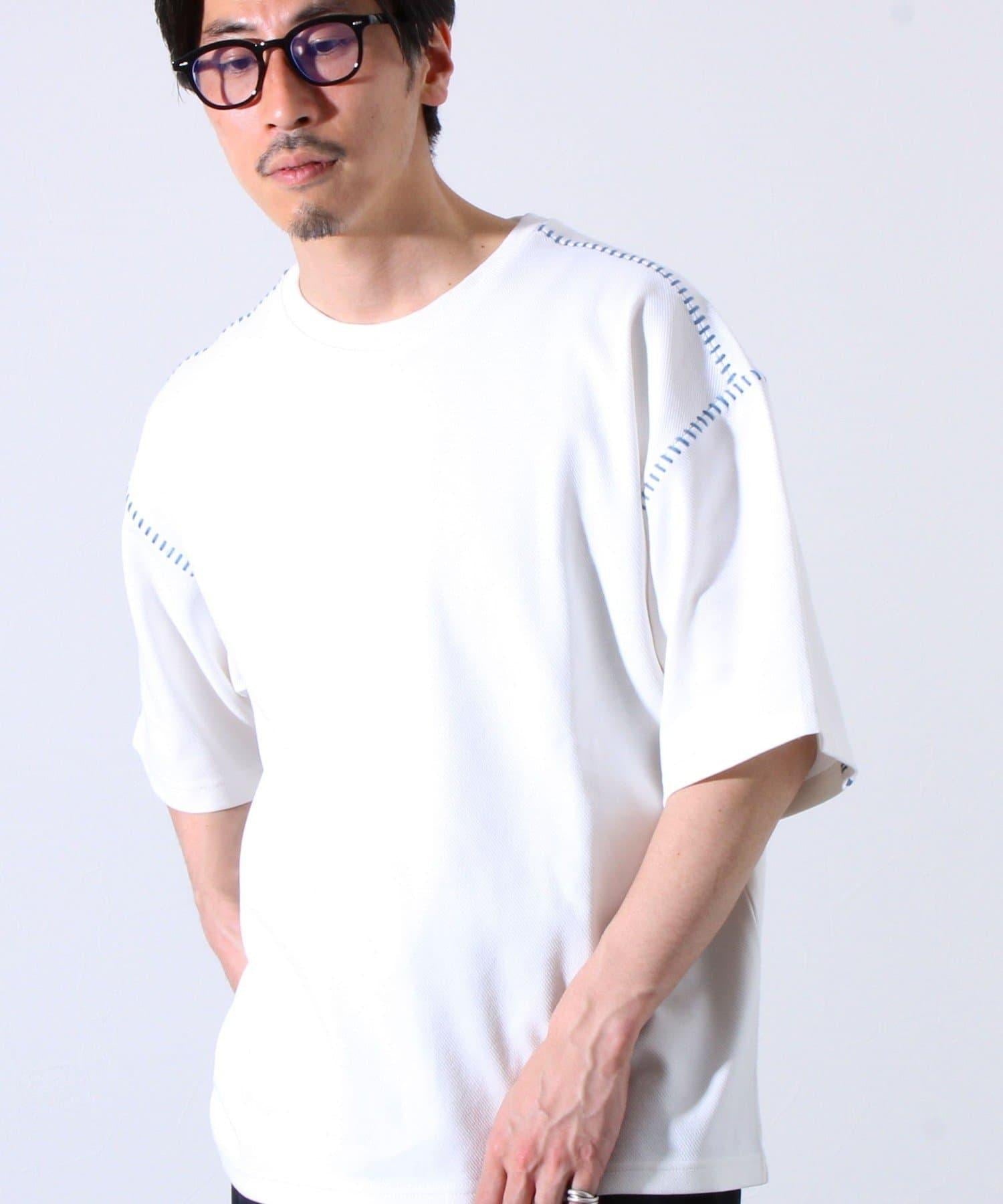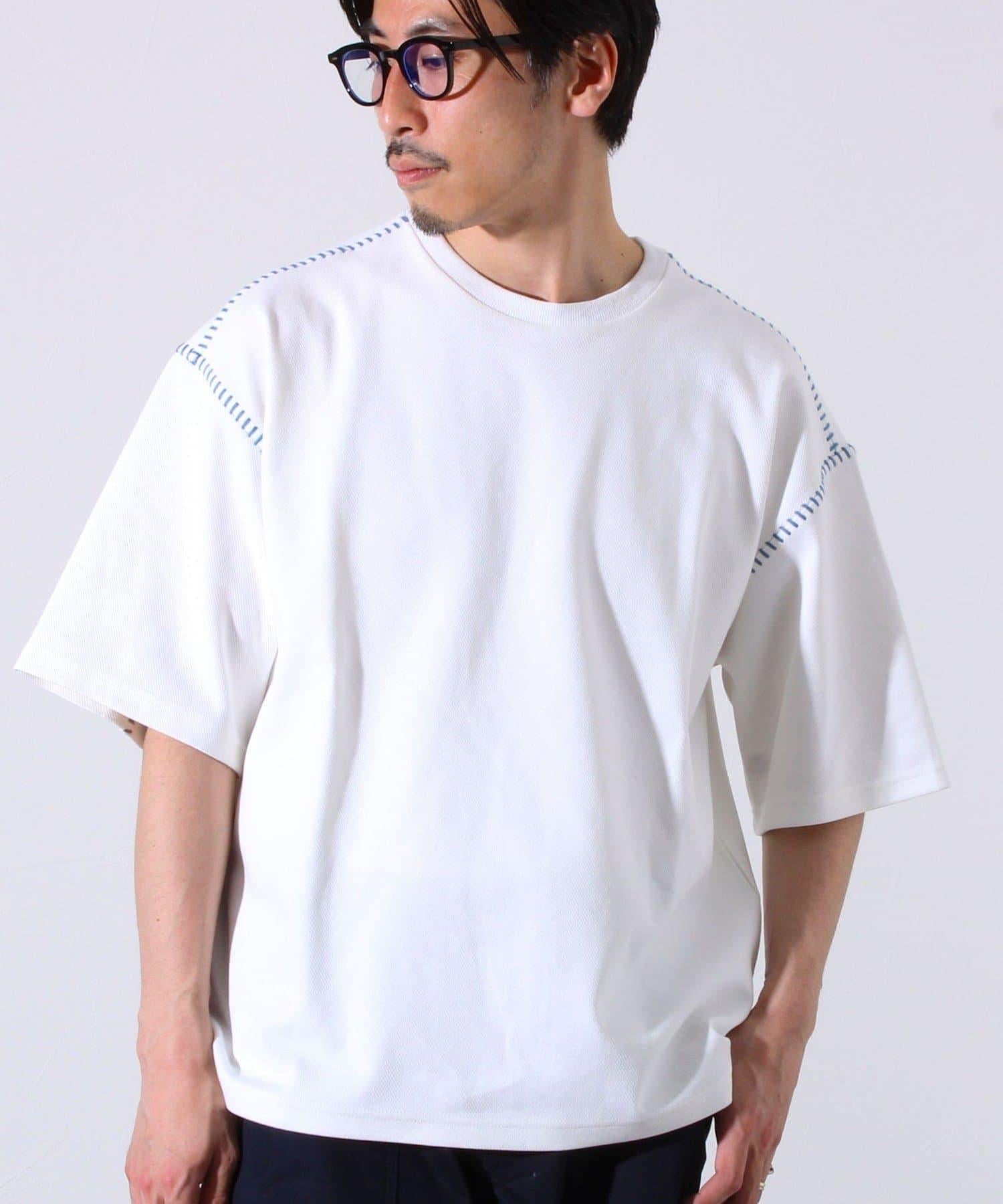 寬鬆 T 恤,肩部和袖子有彩色縫線裝飾。