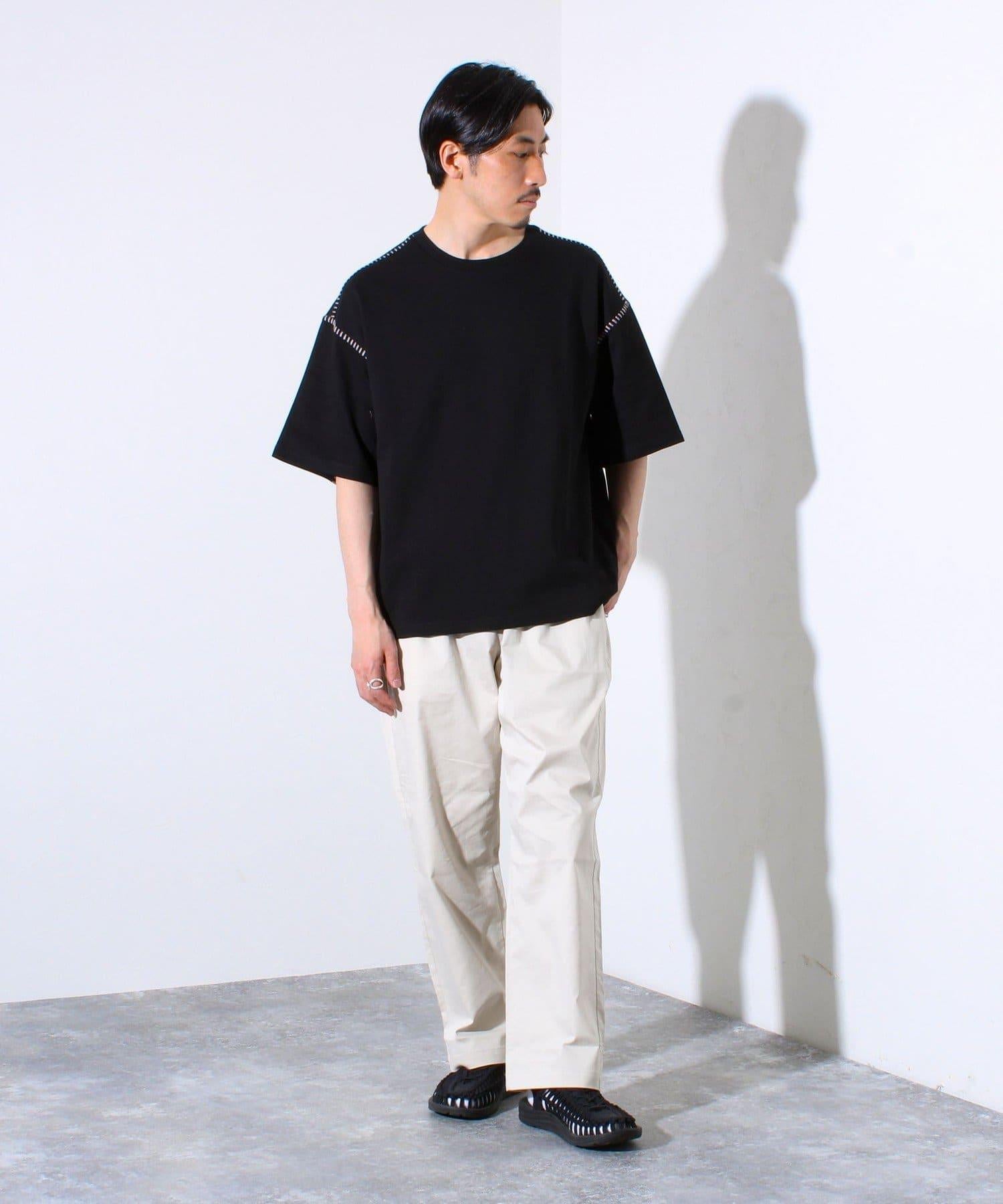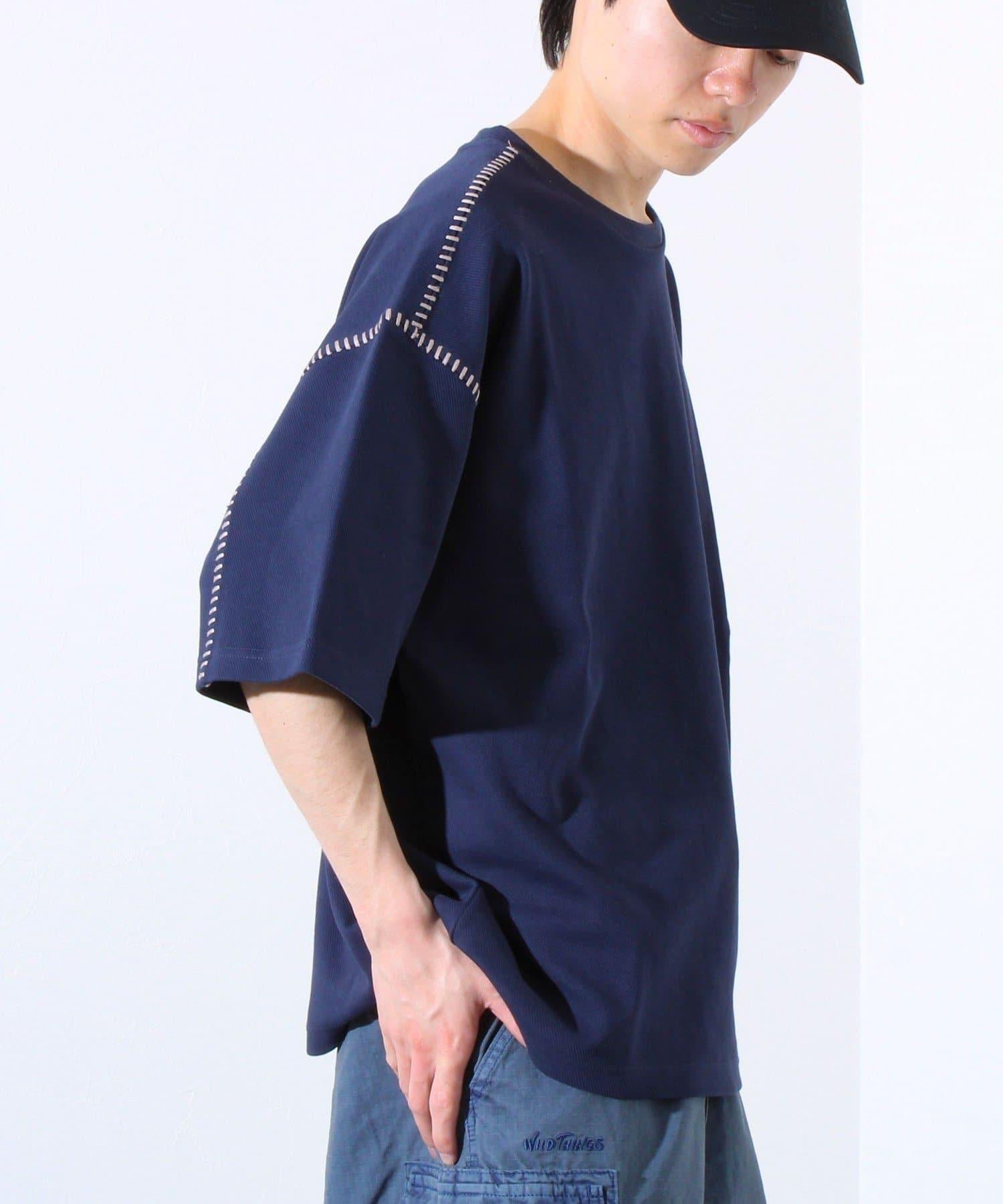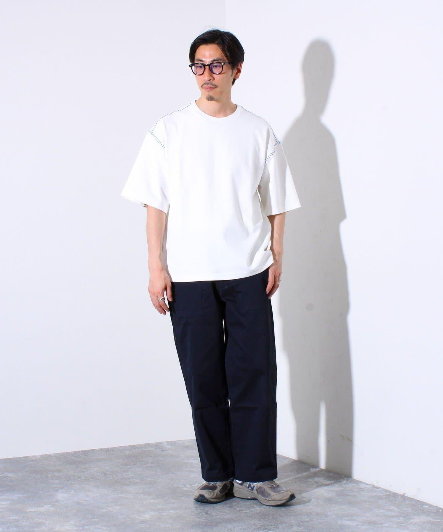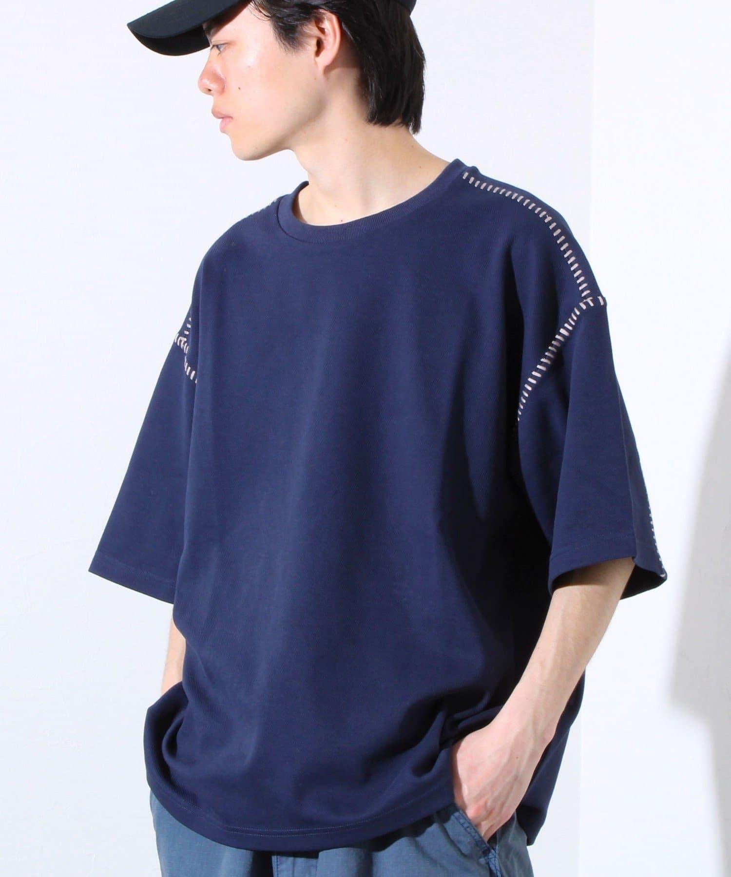 寬鬆 T 恤,肩部和袖子有彩色縫線裝飾。