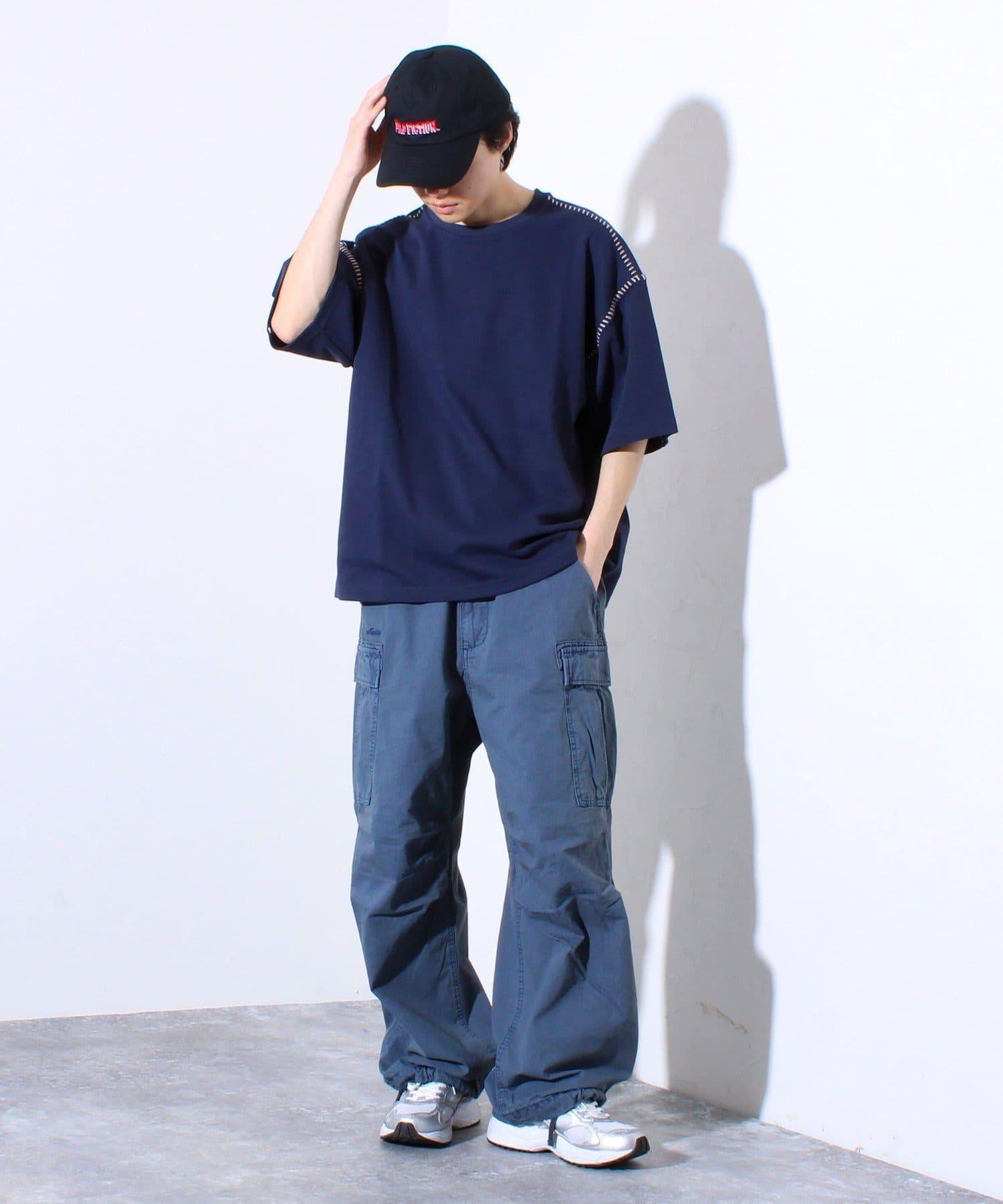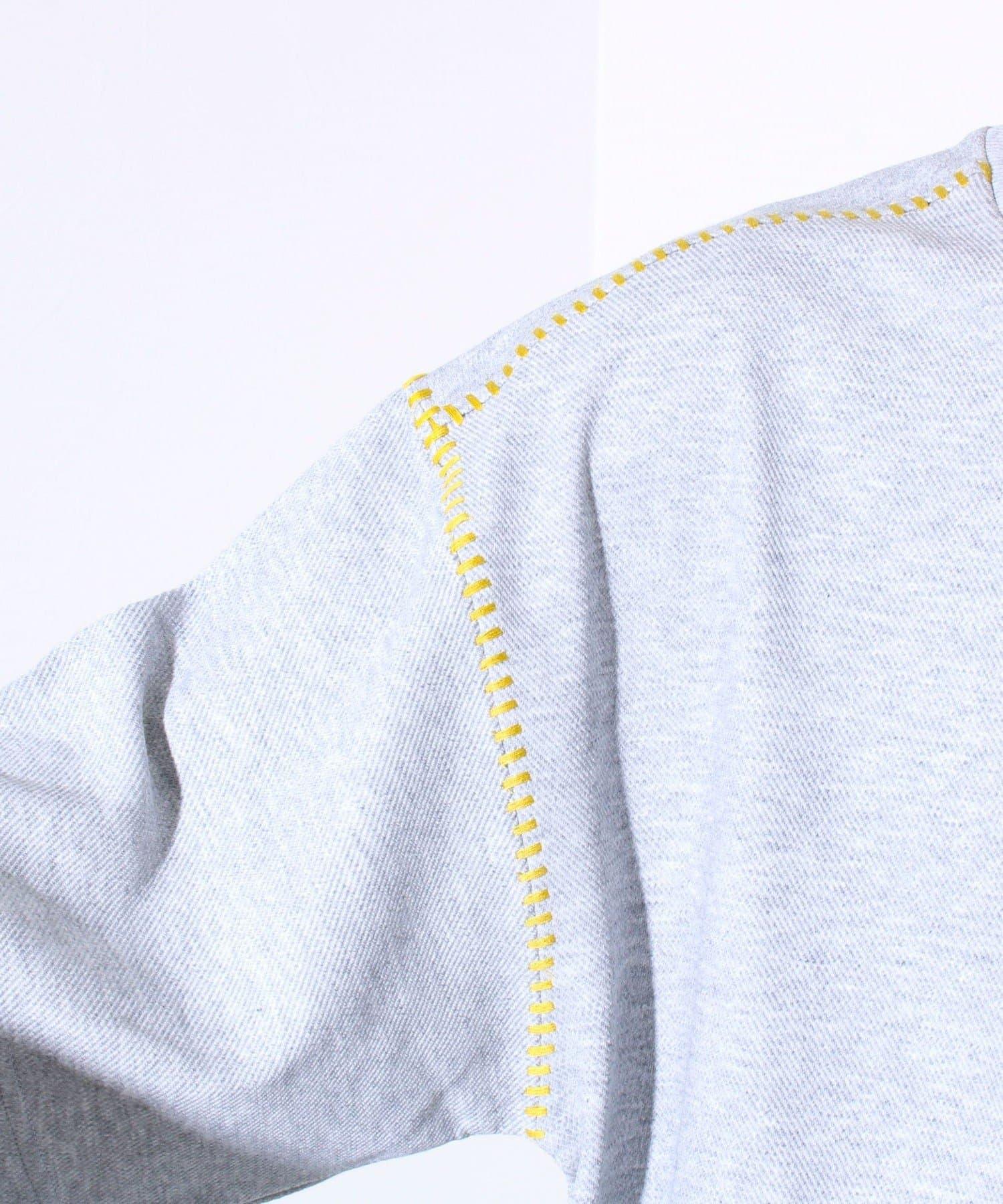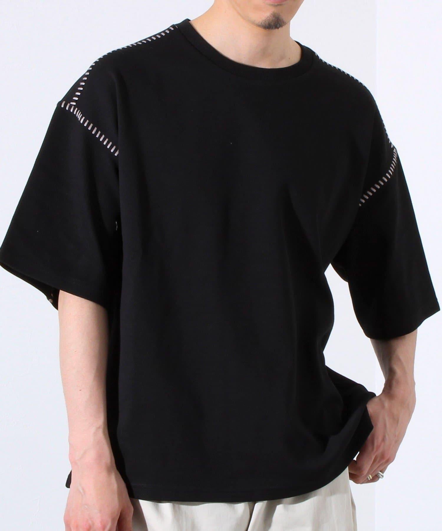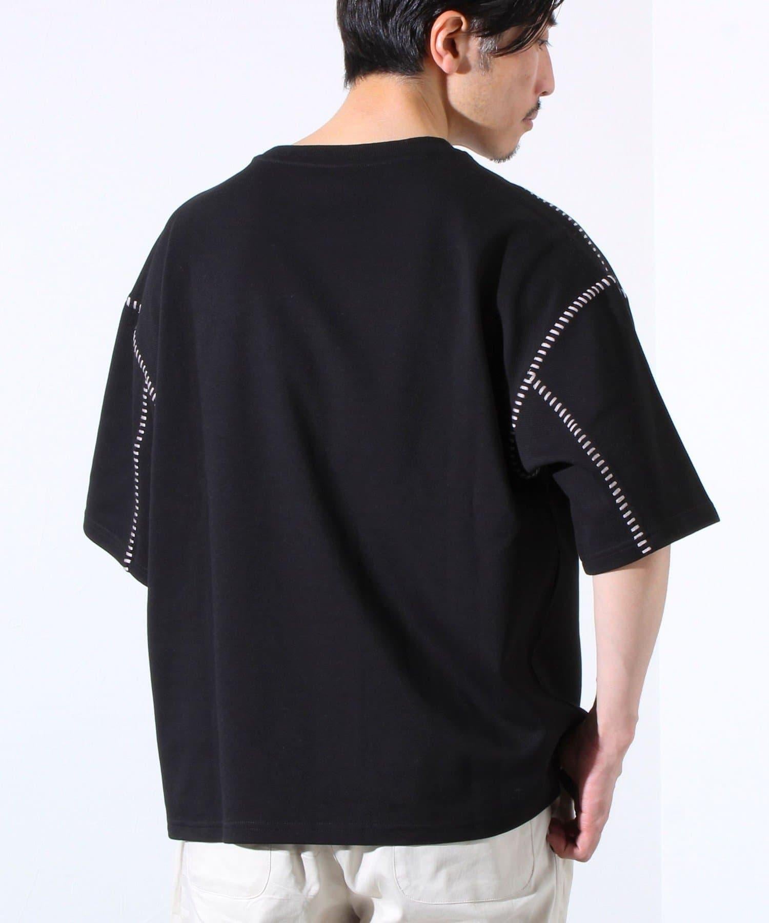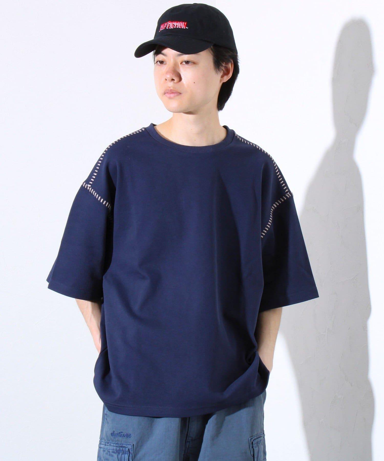 寬鬆 T 恤,肩部和袖子有彩色縫線裝飾。
