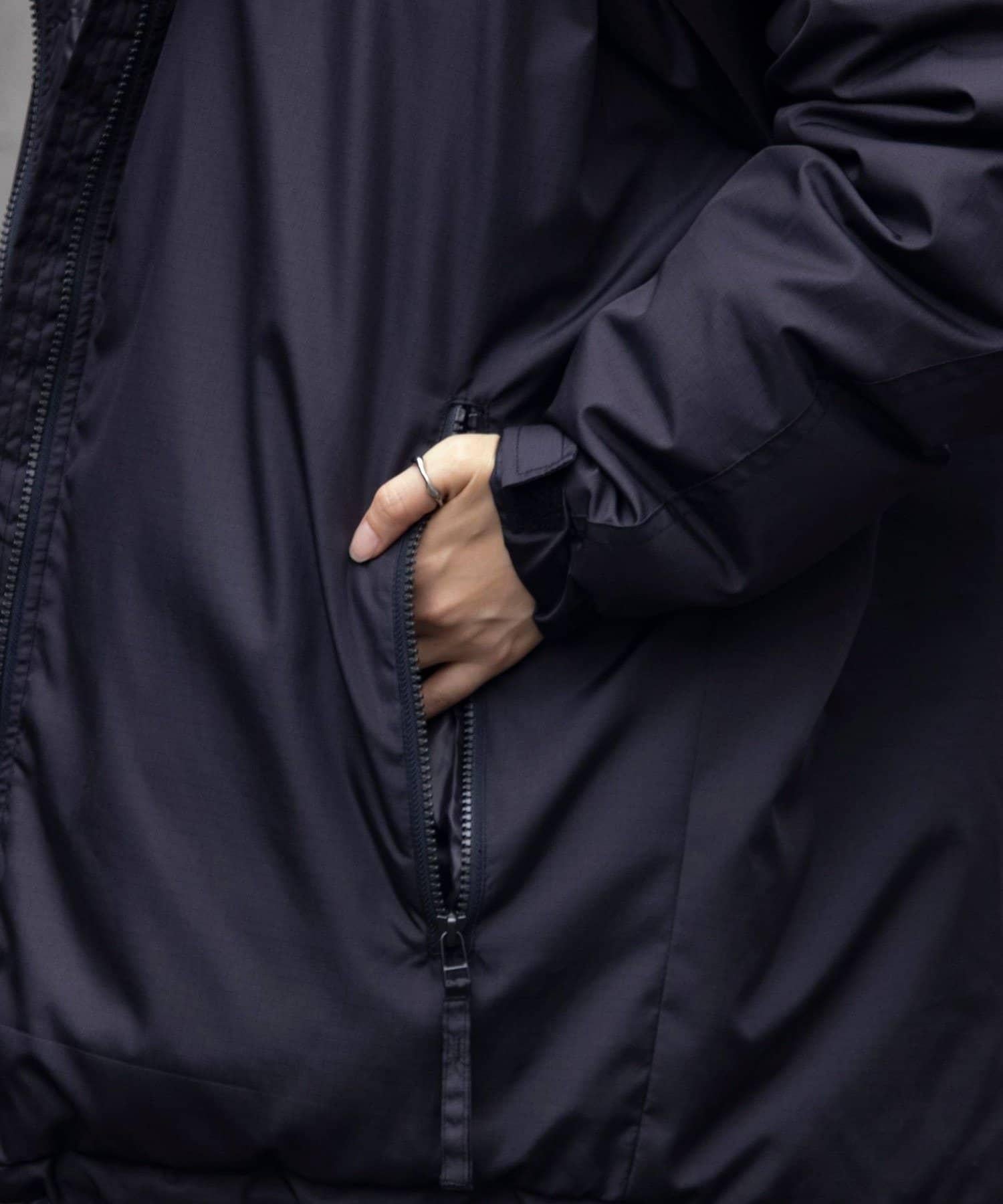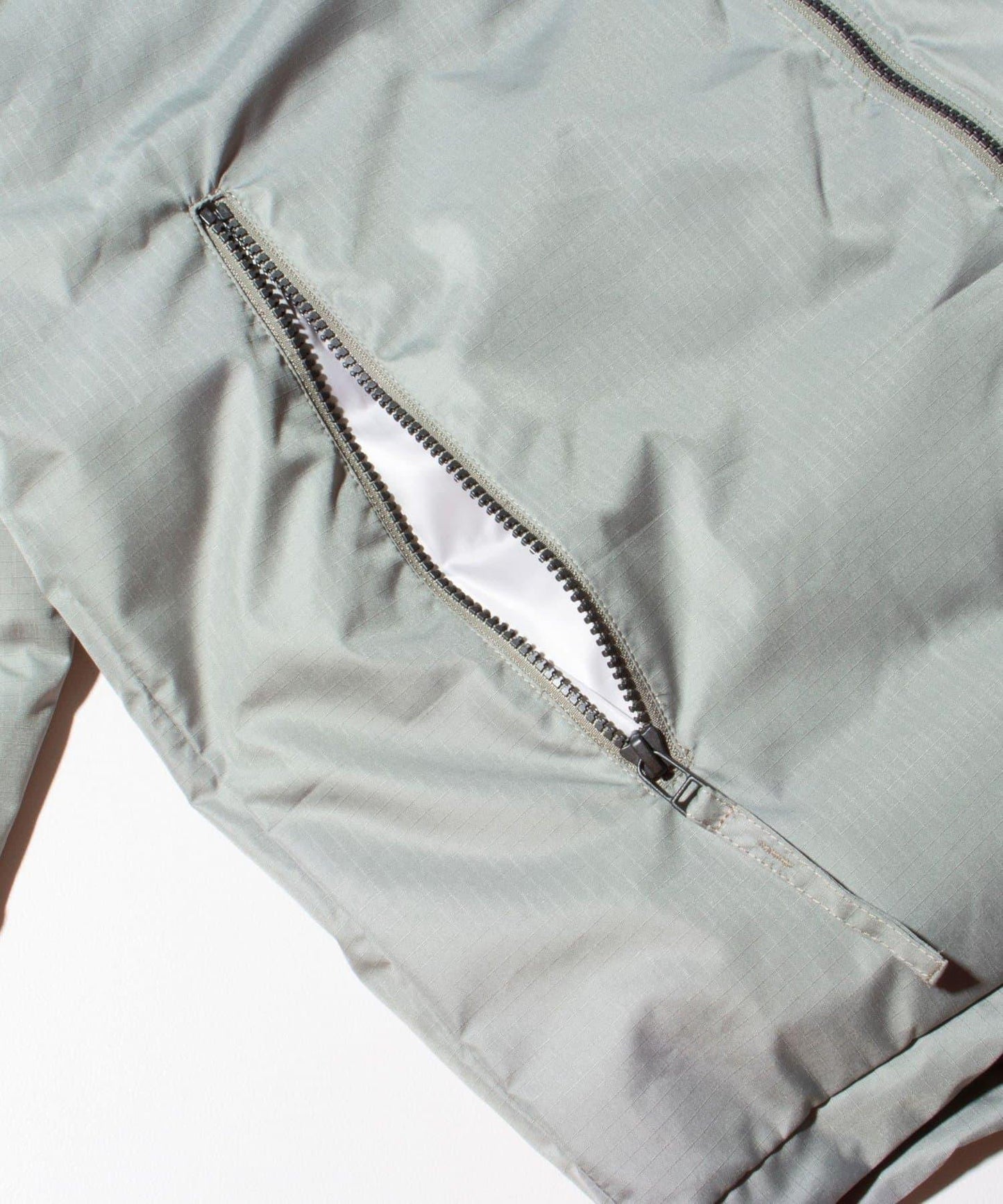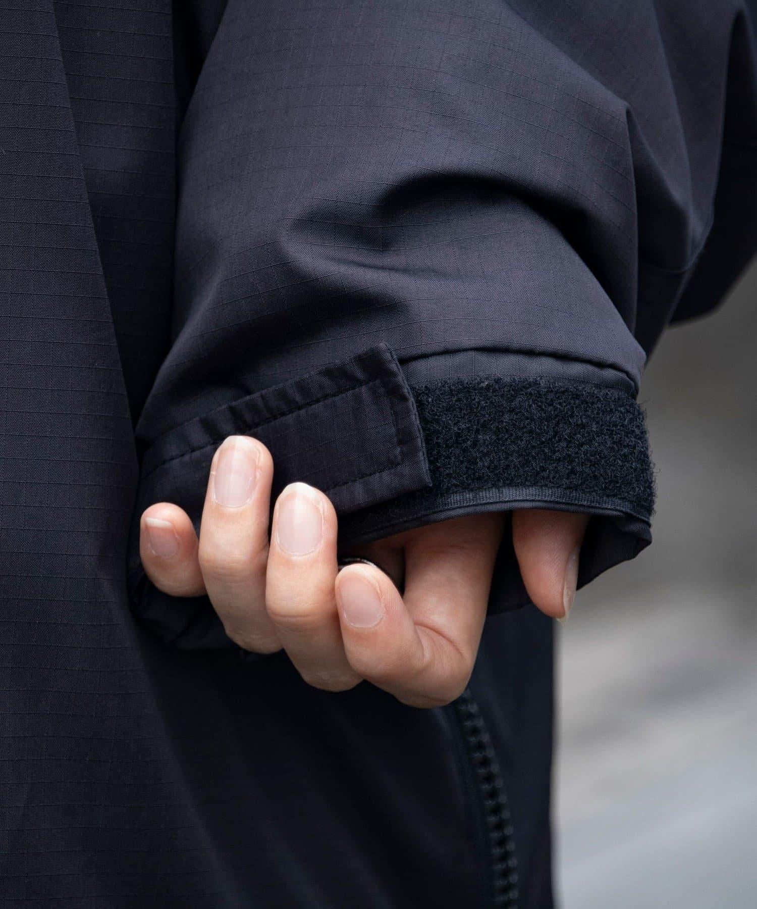 下襬內側兩側使用了抽繩,用於調節的尖端穿過前口袋內側,以防止繩索纏繞或被卡住。