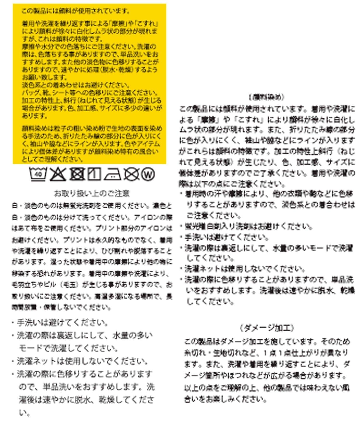 由於染料的特性,請注意以下幾點: - 由於加工特性,請勿穿著或洗滌本產品。