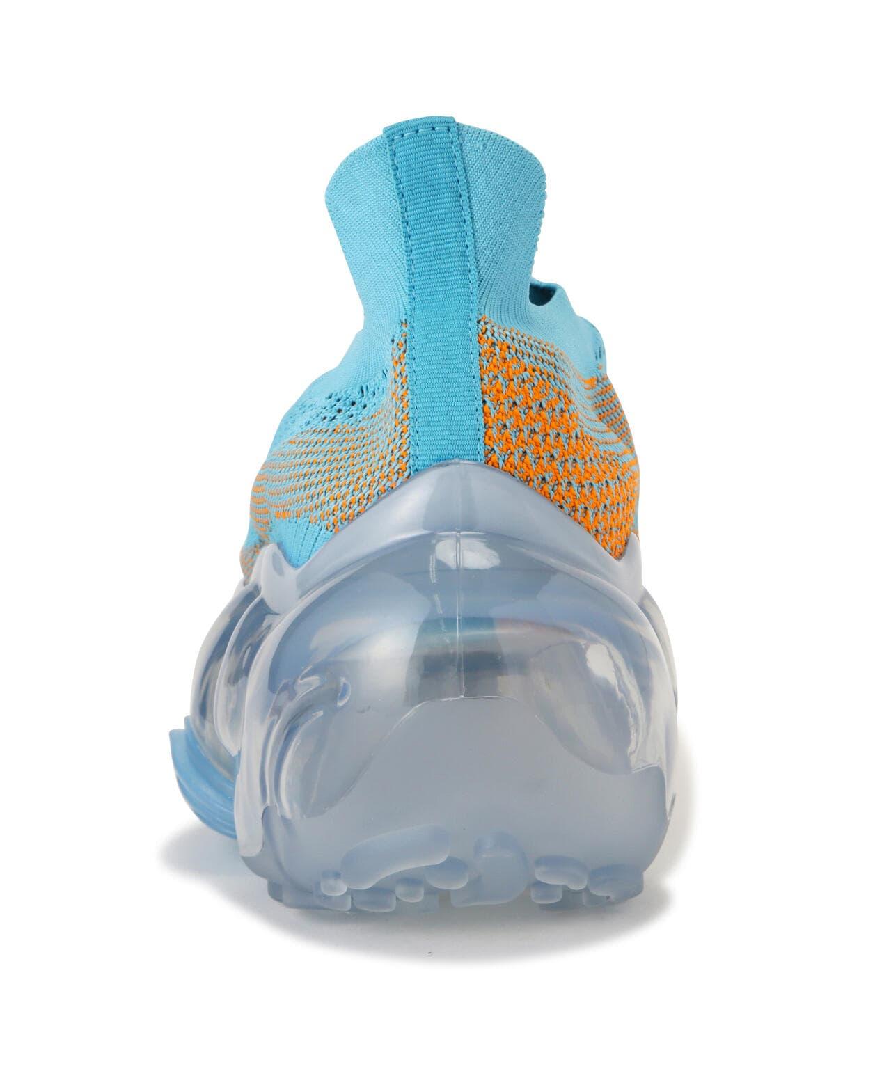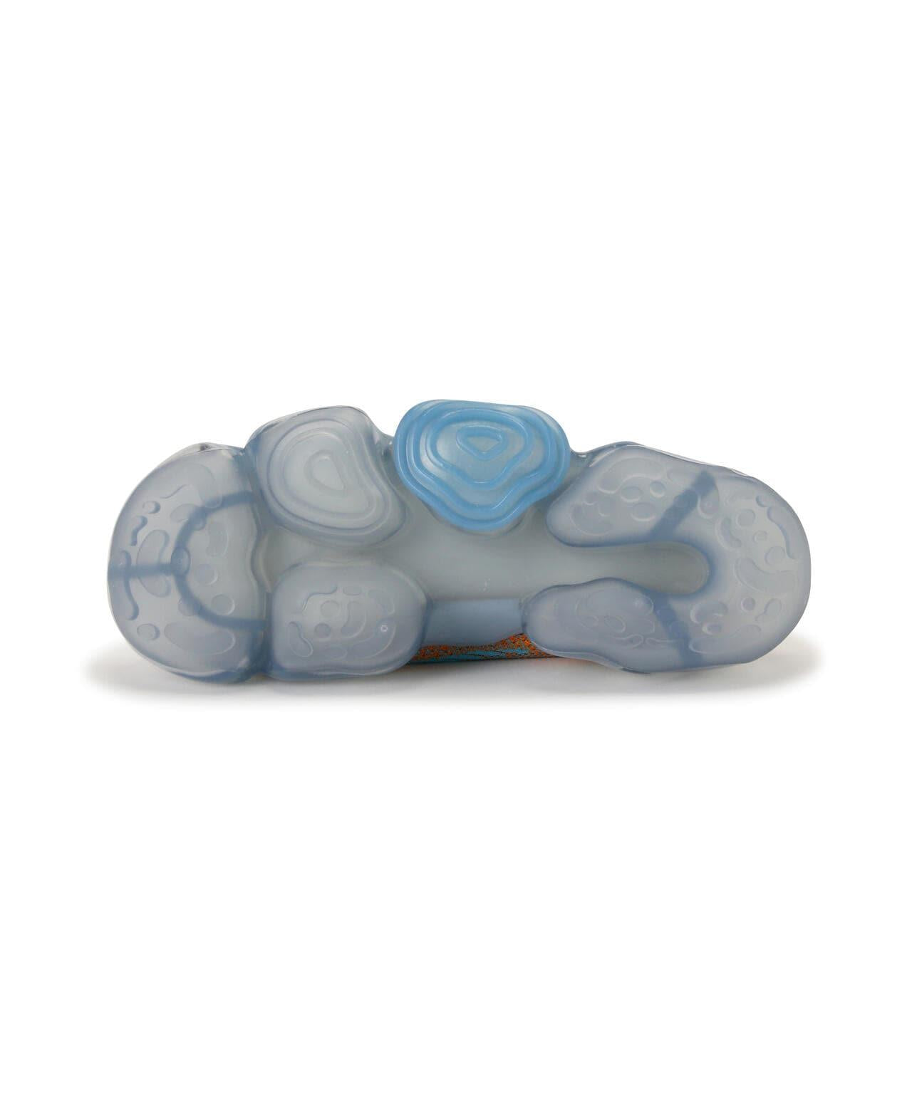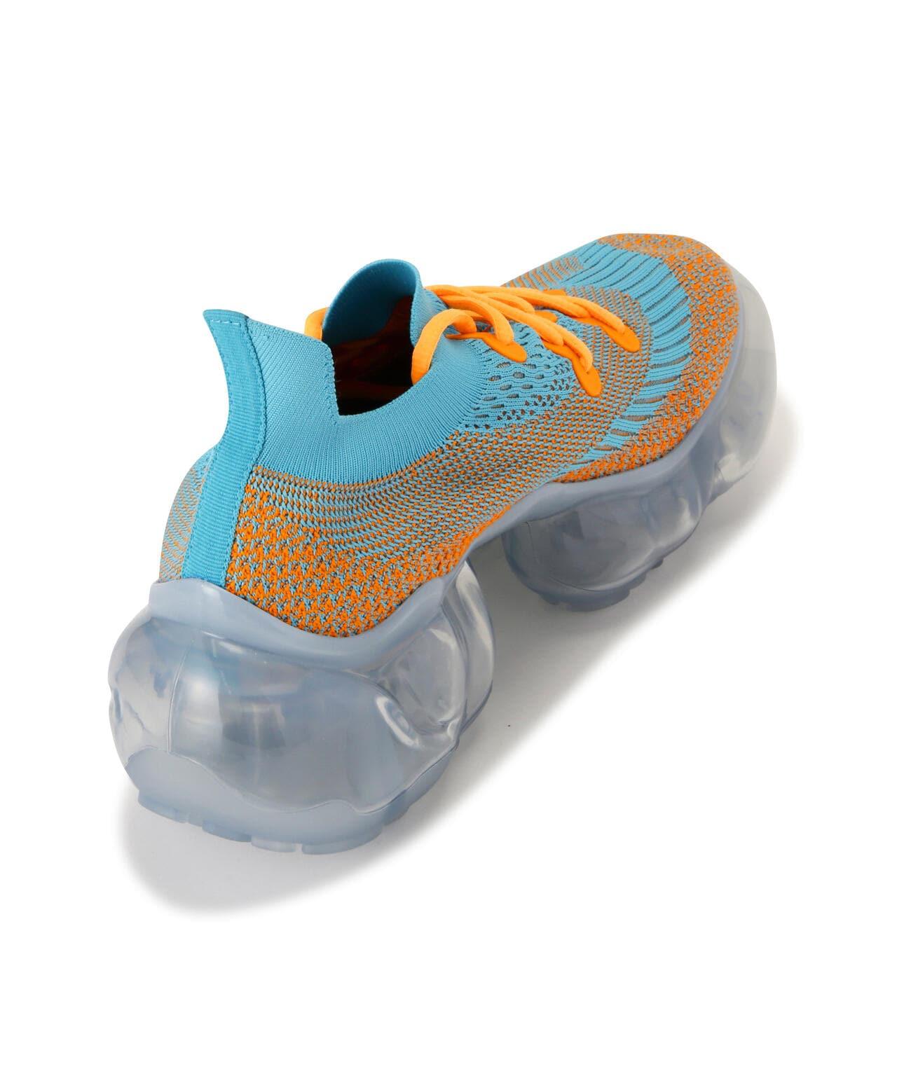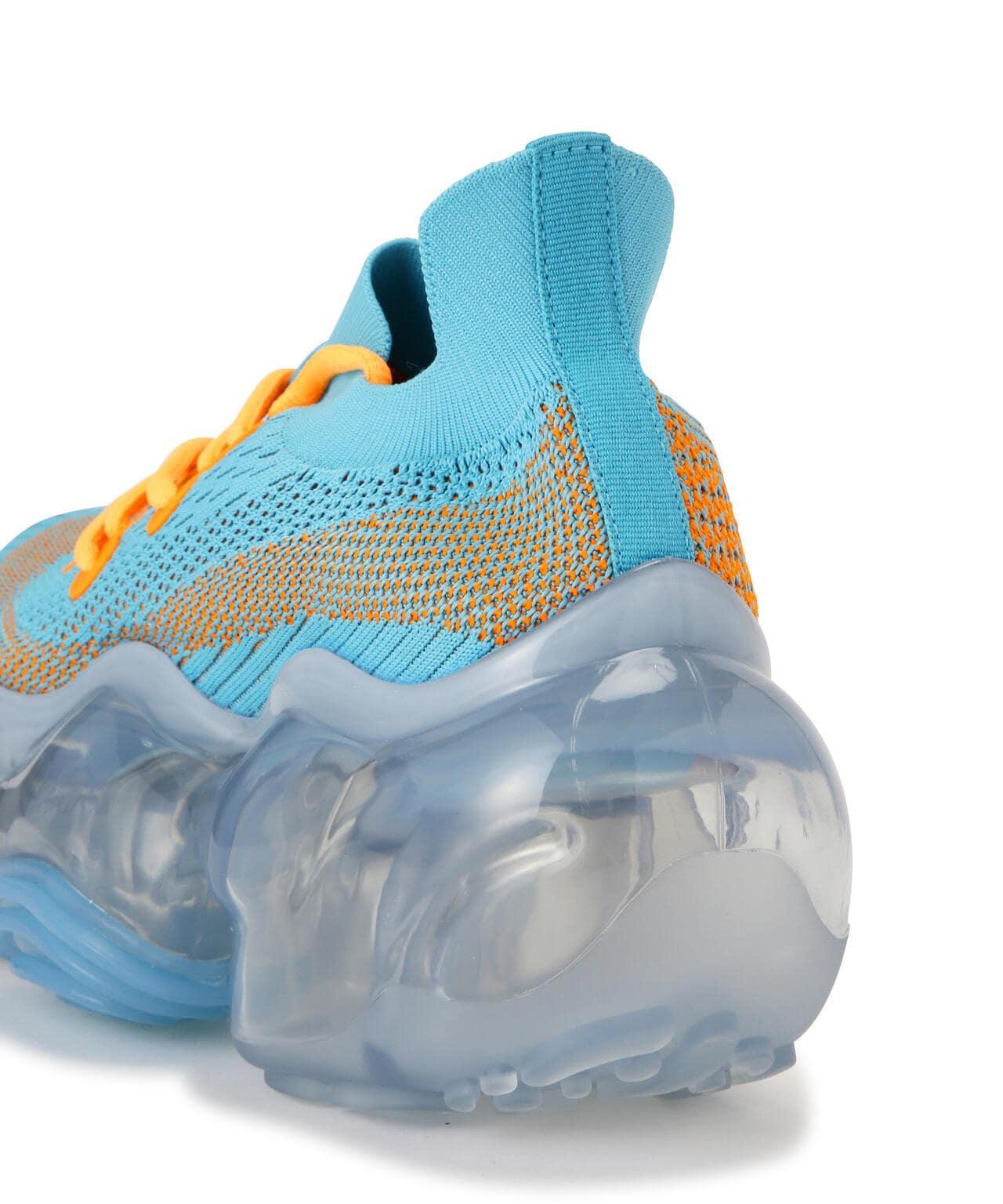 這雙鞋看起來就像踩在一個巨大的凝膠形狀的東西上一樣。 鞋底本應堅固到足以支撐整個身體,但卻被做成了流體和柔軟的樣子,這種設計讓人感到癢癢的。外側的橡膠部件為設計增添了亮點。鞋面纖細,與寬大的鞋底形成鮮明對比。尖銳的外形、腳背和從腳趾到腳跟的平緩坡度給人一種優雅、修長的印象,這是現有運動鞋所沒有的。針織鞋面上不對稱佈局的鞋孔和花紋也採用了抽象的外底設計。鞋眼和 CPU 部件。