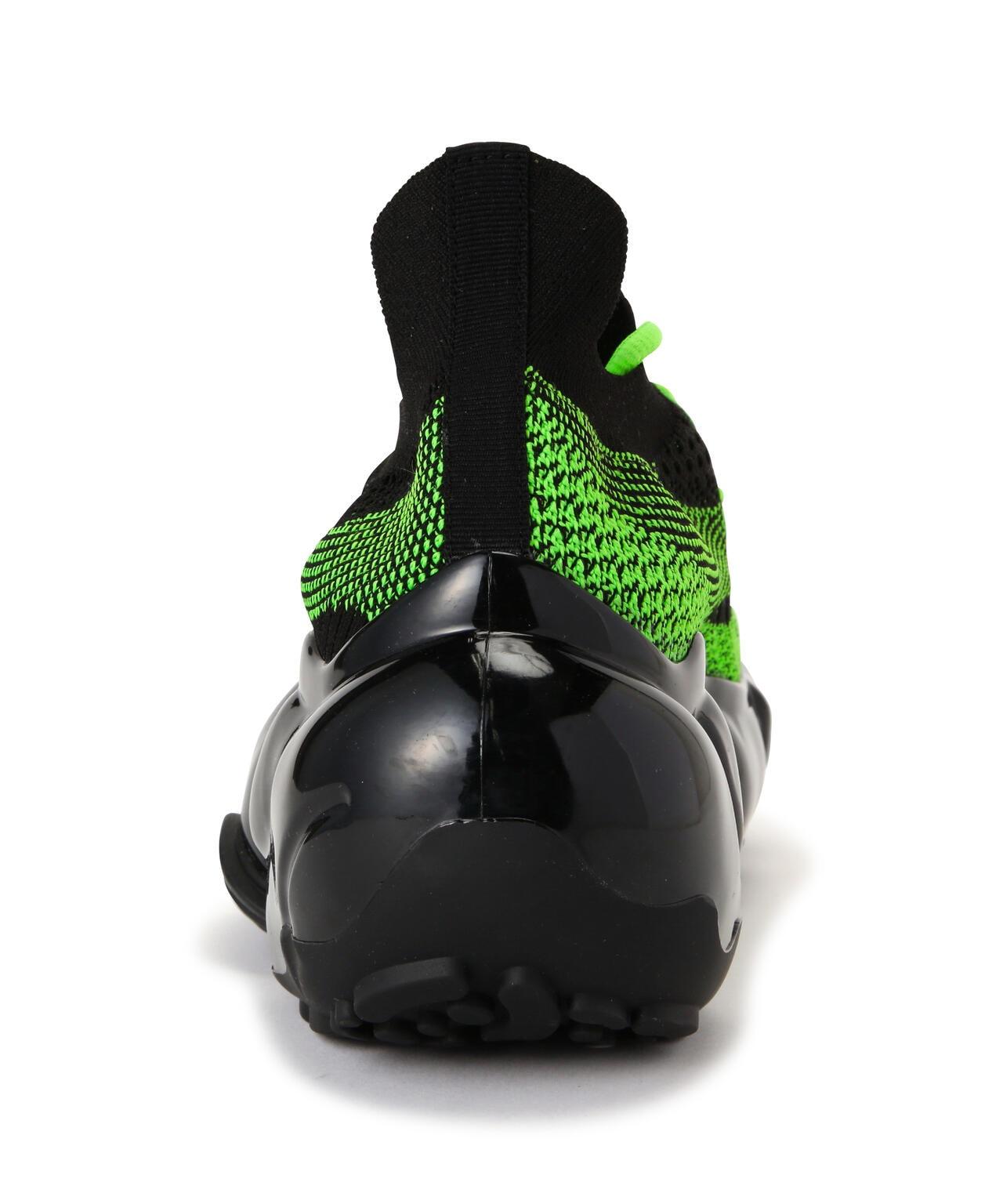 這雙鞋看起來就像踩在一個巨大的凝膠形狀的東西上一樣。 鞋底本應堅固到足以支撐整個身體,但卻被做成了流體和柔軟的樣子,這種設計讓人感到癢癢的。外側的橡膠部件為設計增添了亮點。鞋面纖細,與寬大的鞋底形成鮮明對比。尖銳的外形、腳背和從腳趾到腳跟的平緩坡度給人一種優雅、修長的印象,這是現有運動鞋所沒有的。針織鞋面上不對稱佈局的鞋孔和花紋也採用了抽象的外底設計。鞋眼和 CPU 部件。