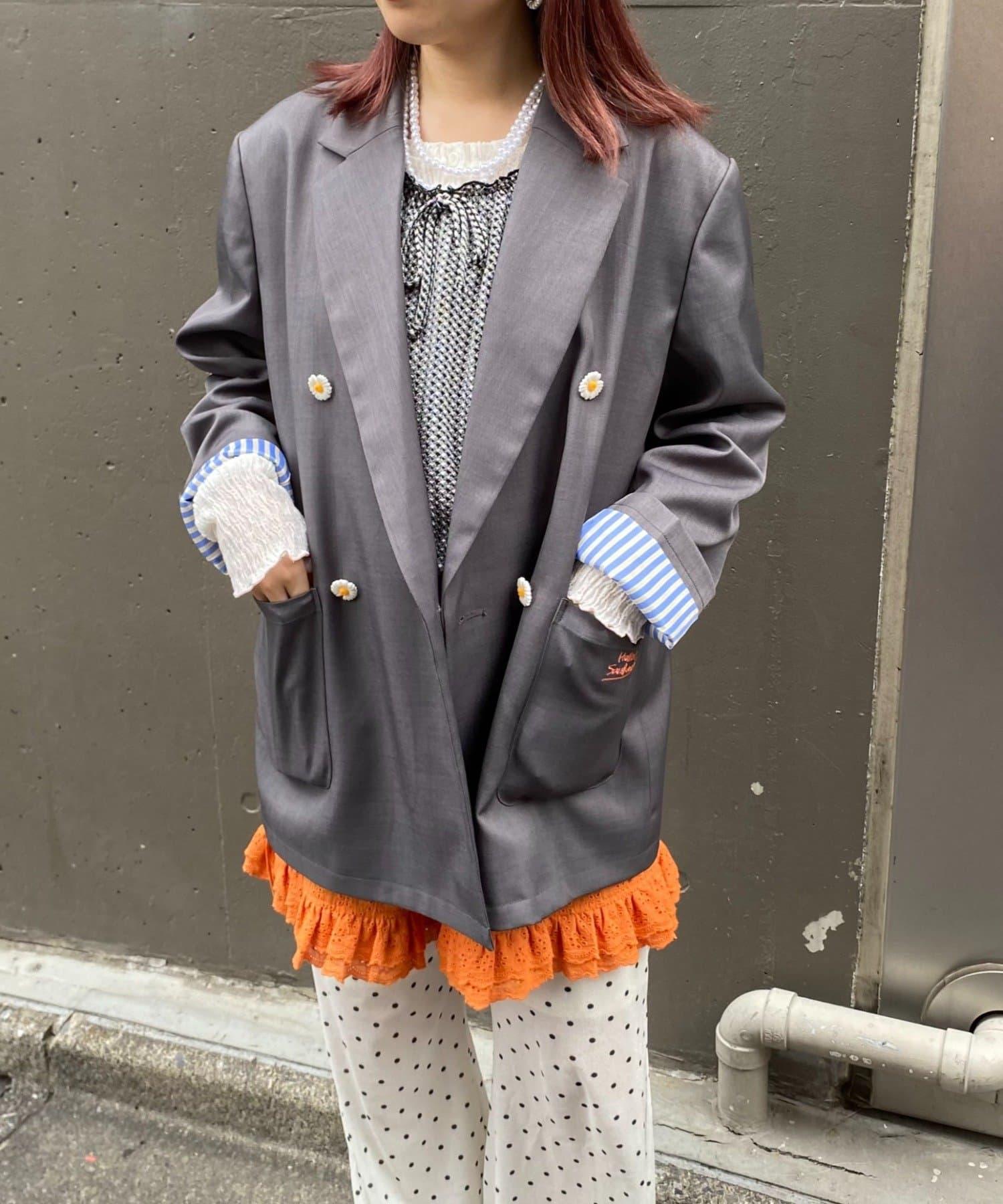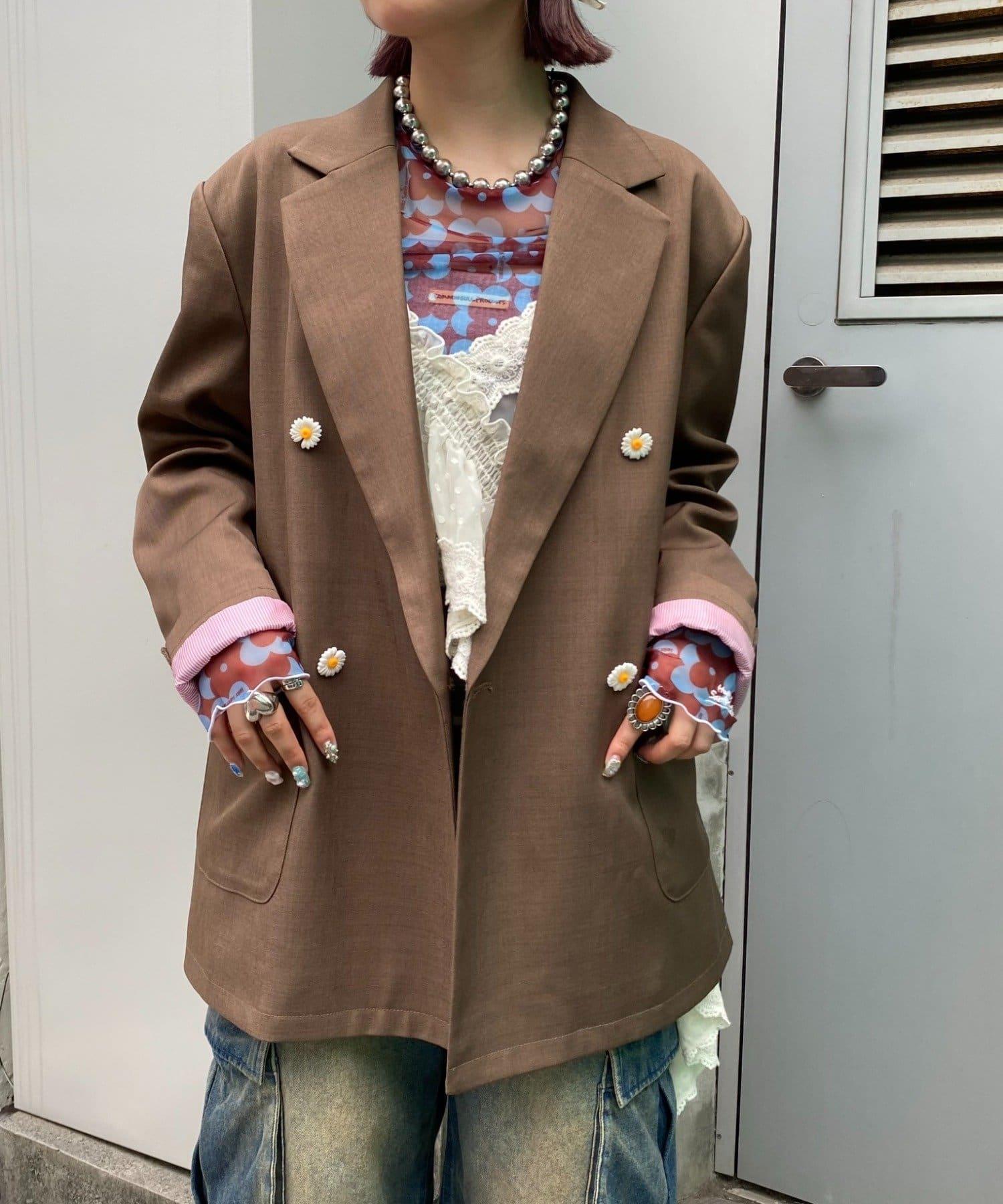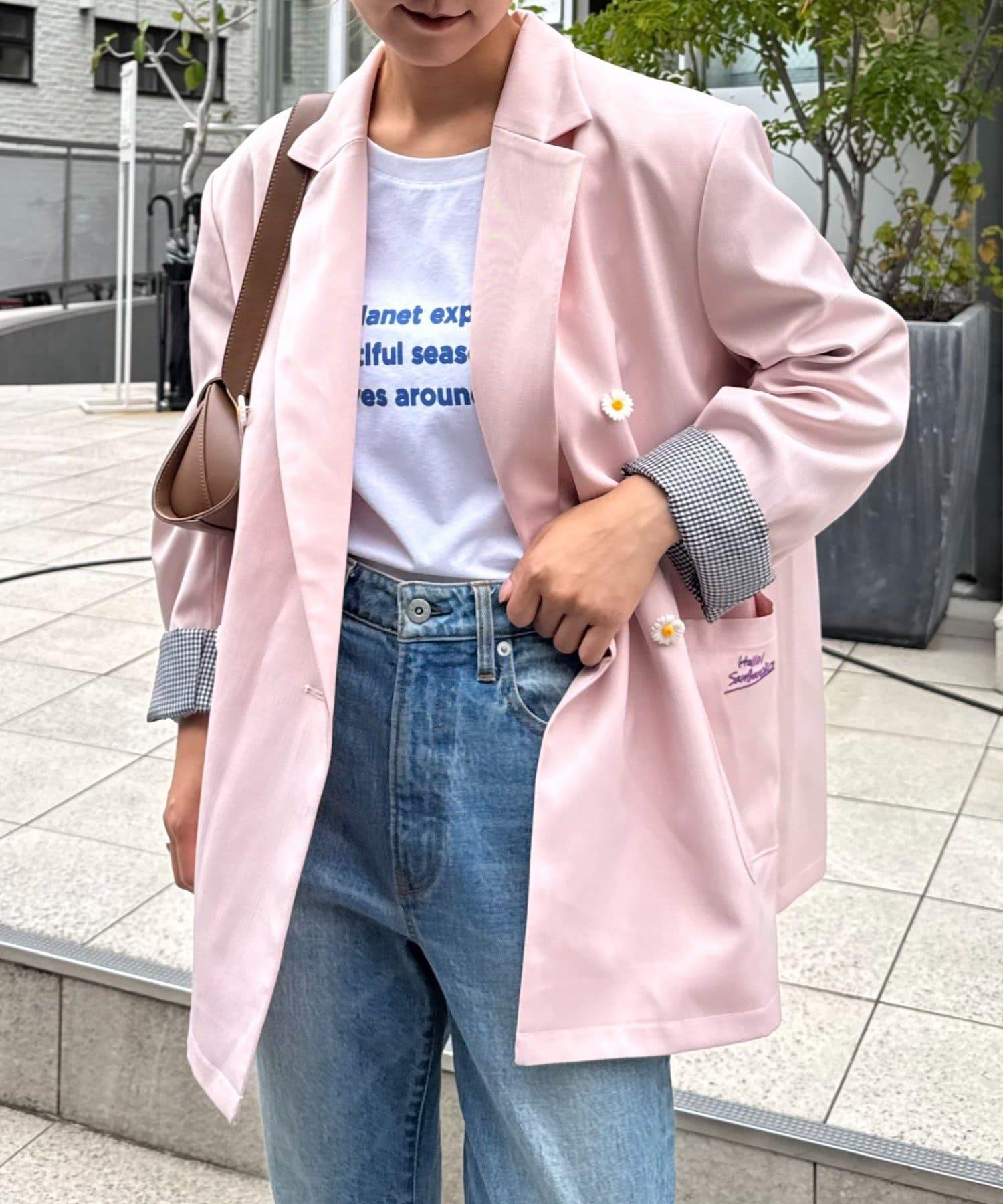 寬大的廓形搭配紐扣上的瑪格麗特圖案,休閒感十足!